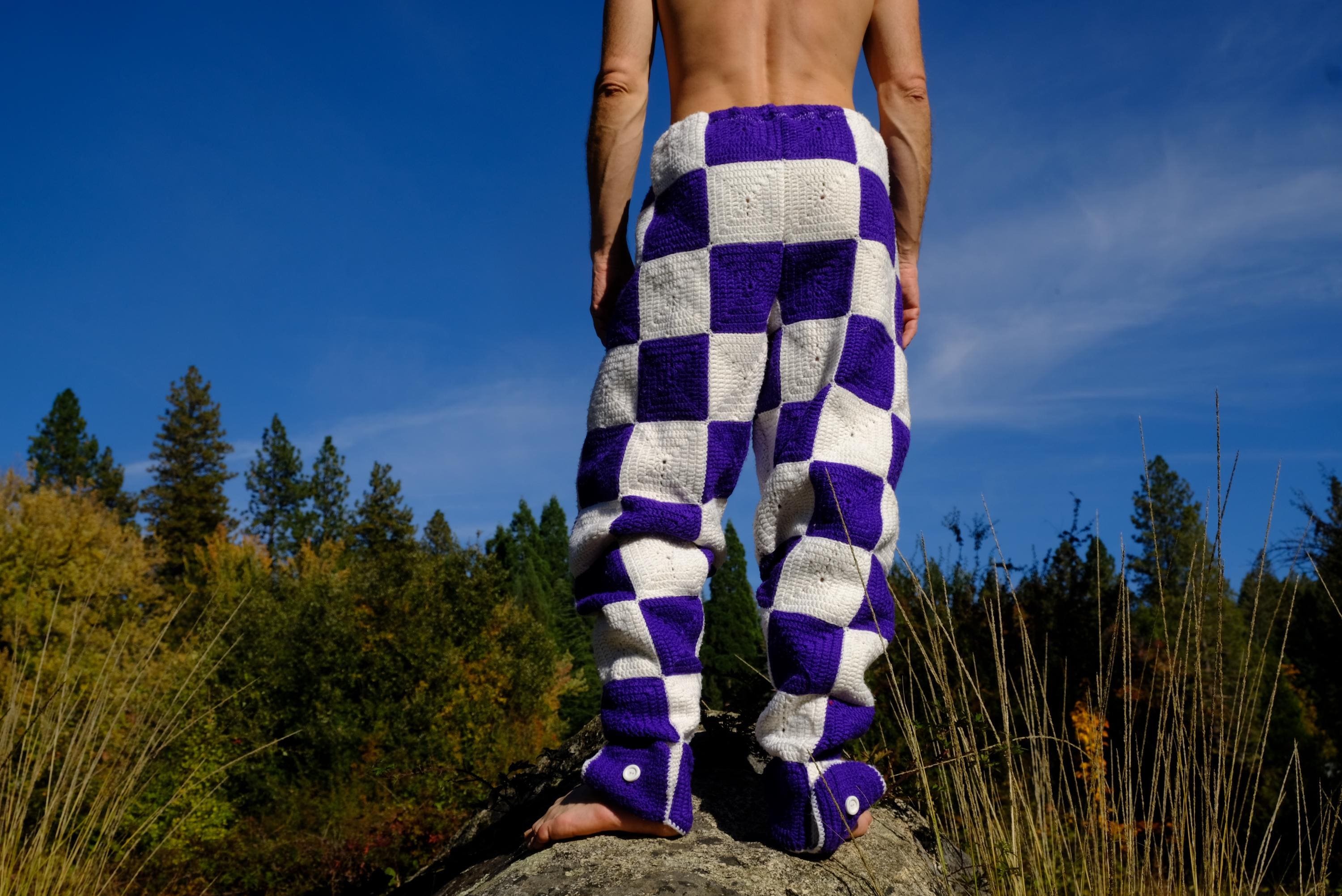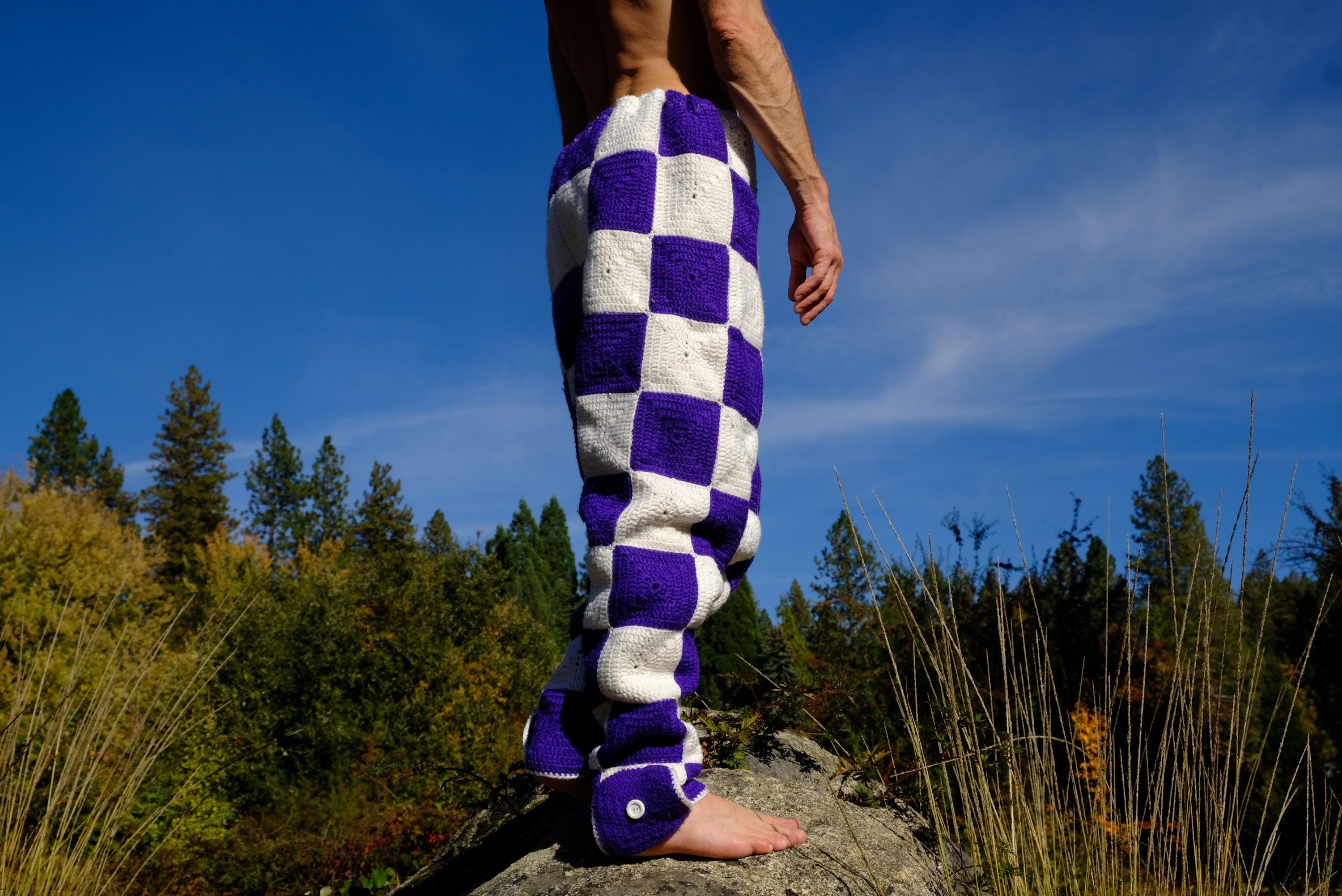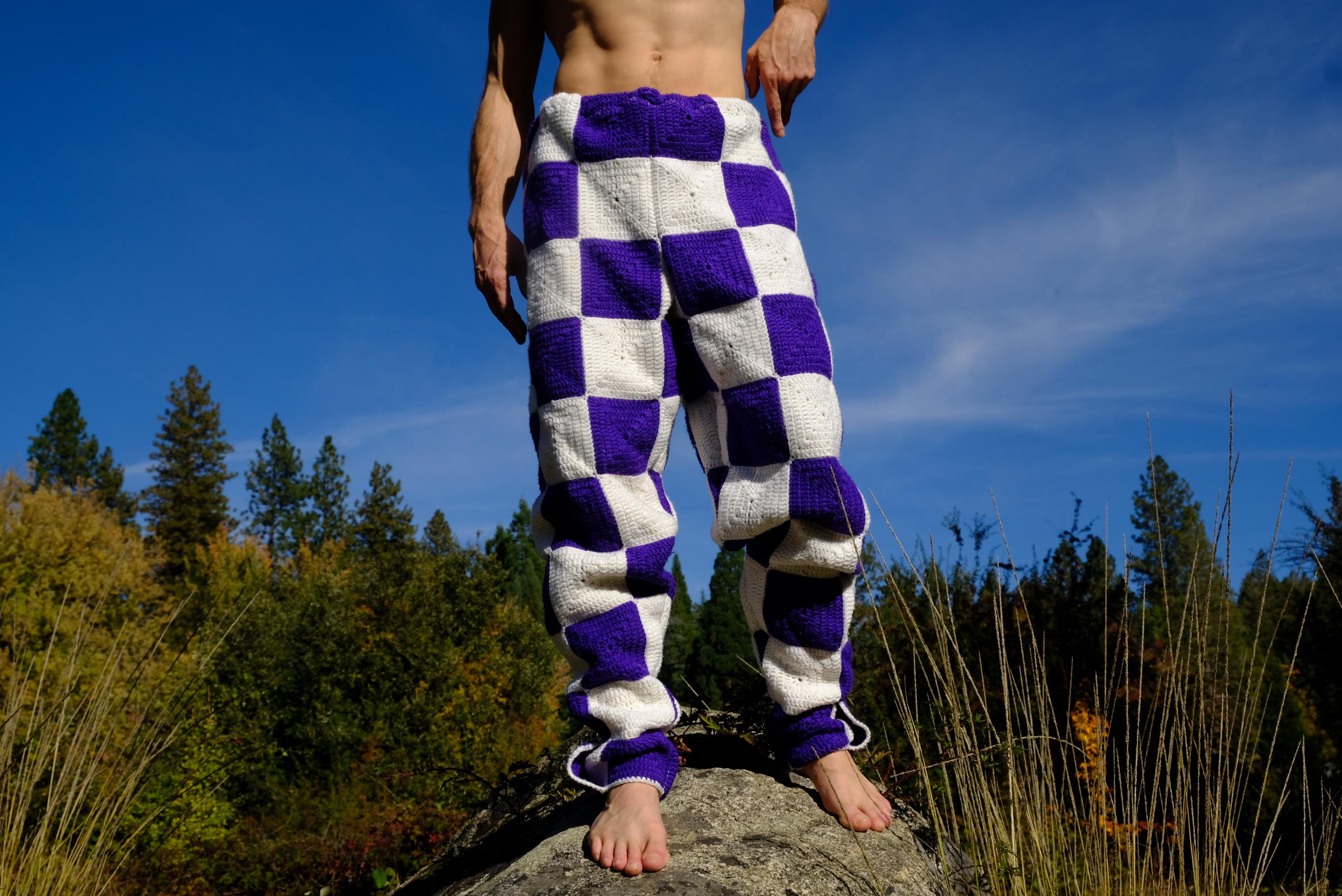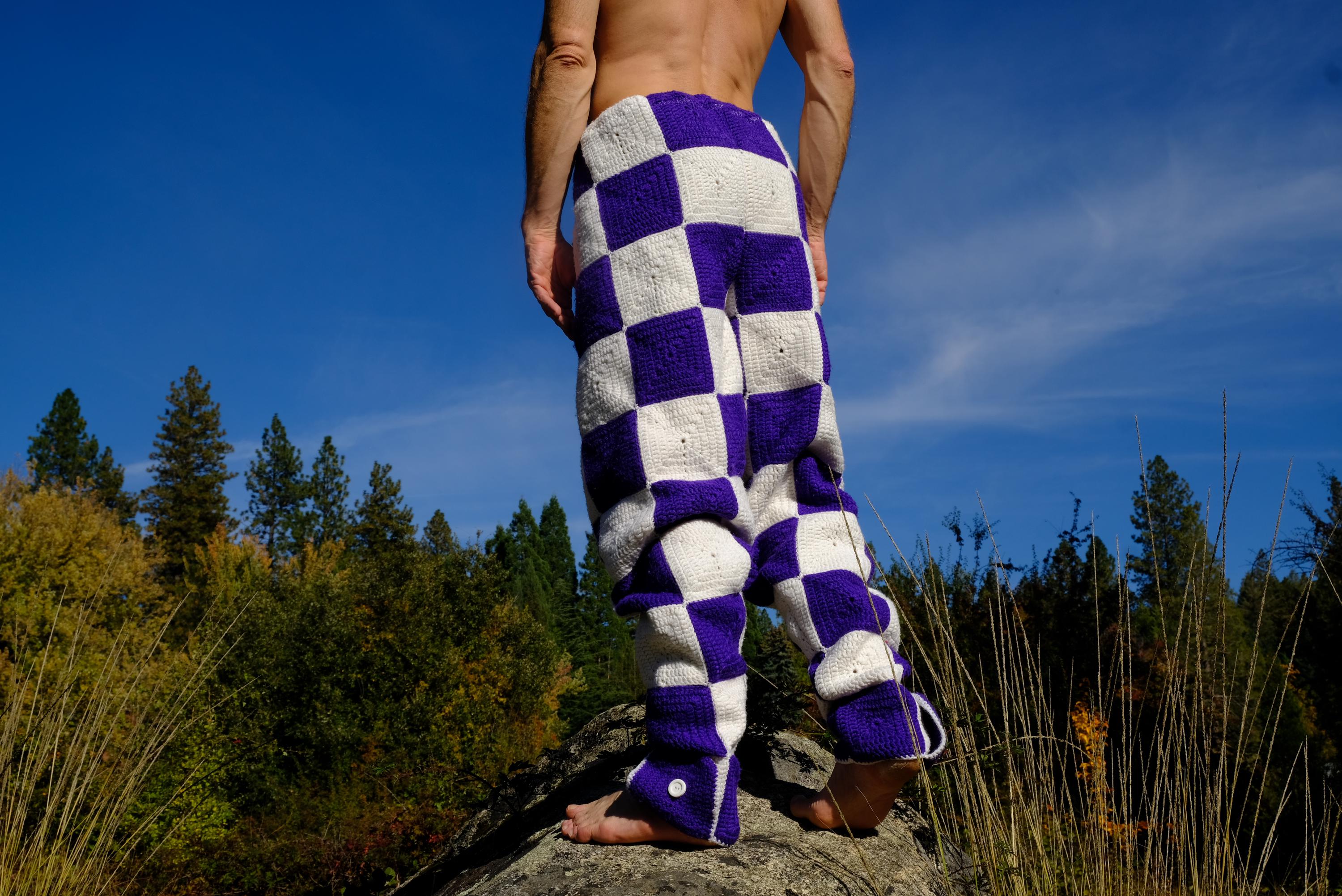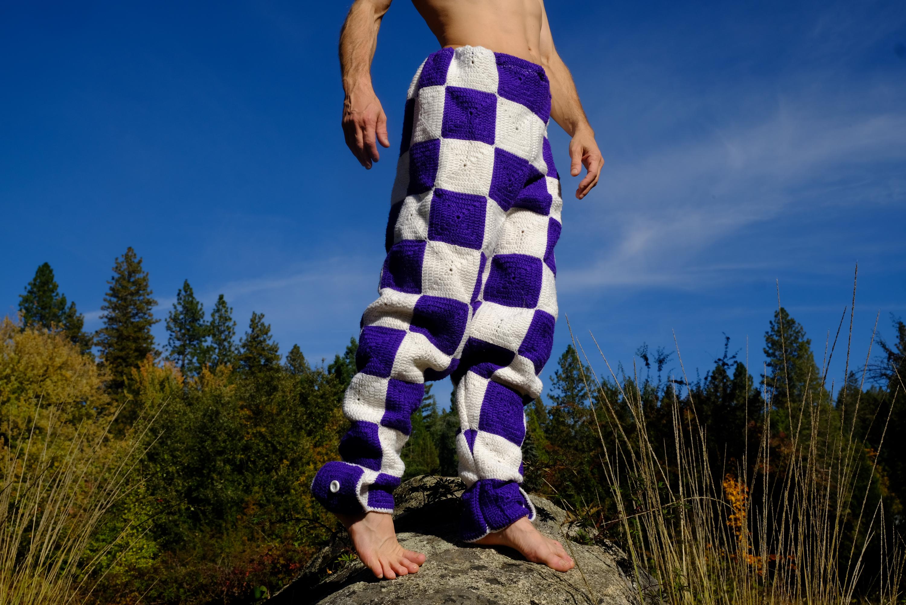 These are crochet pants with purple and white squares in a checkerboard pattern. Fashioned from a vintage afghan blanket crocheted in 100% acrylic yarn.