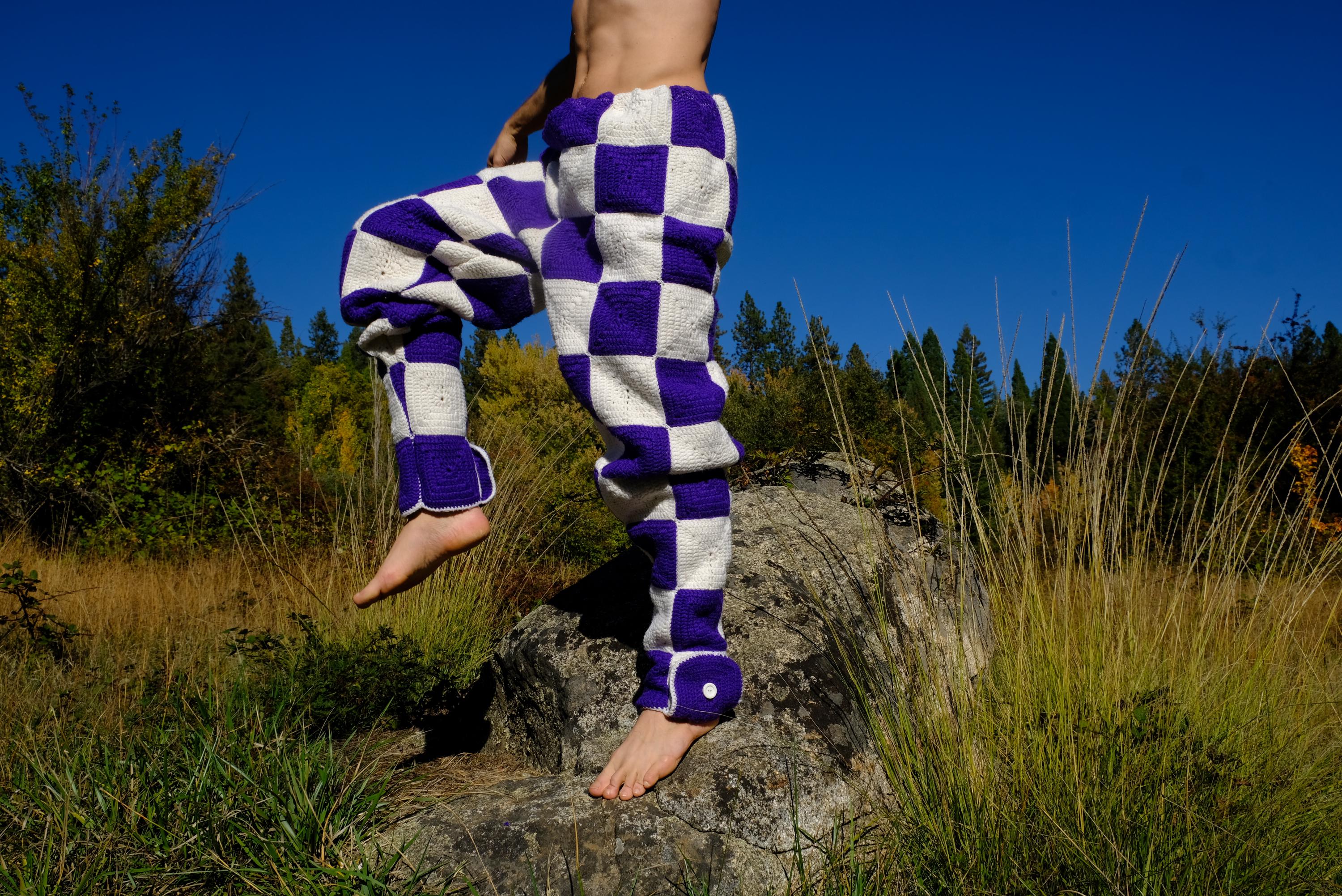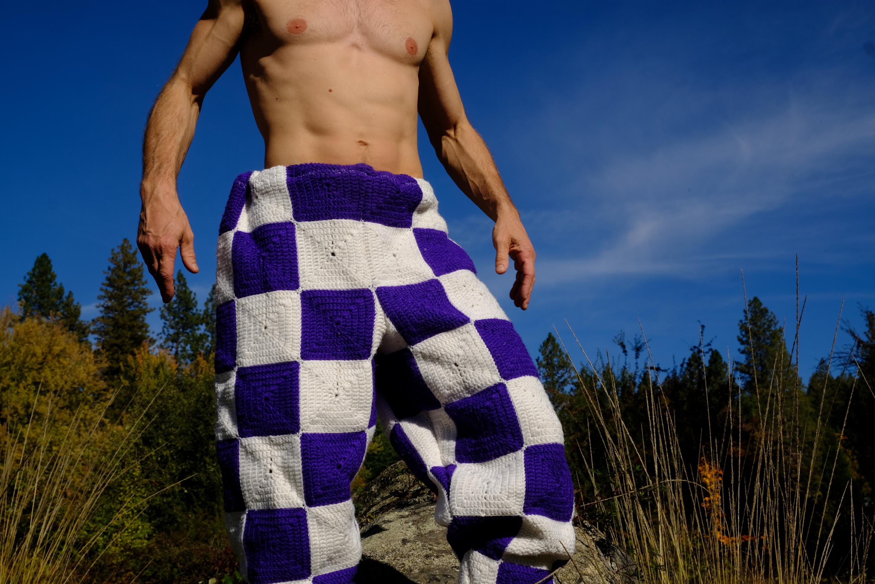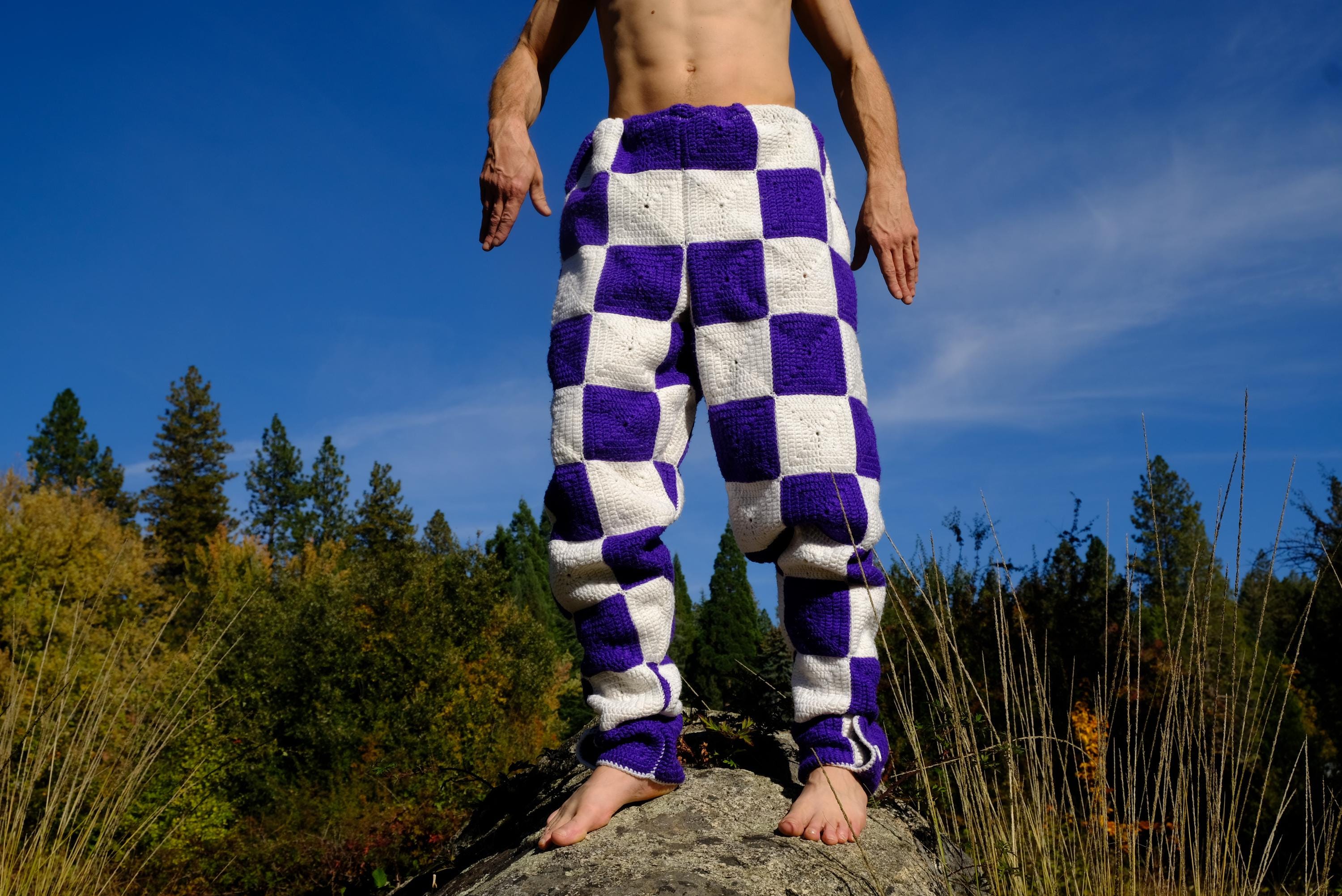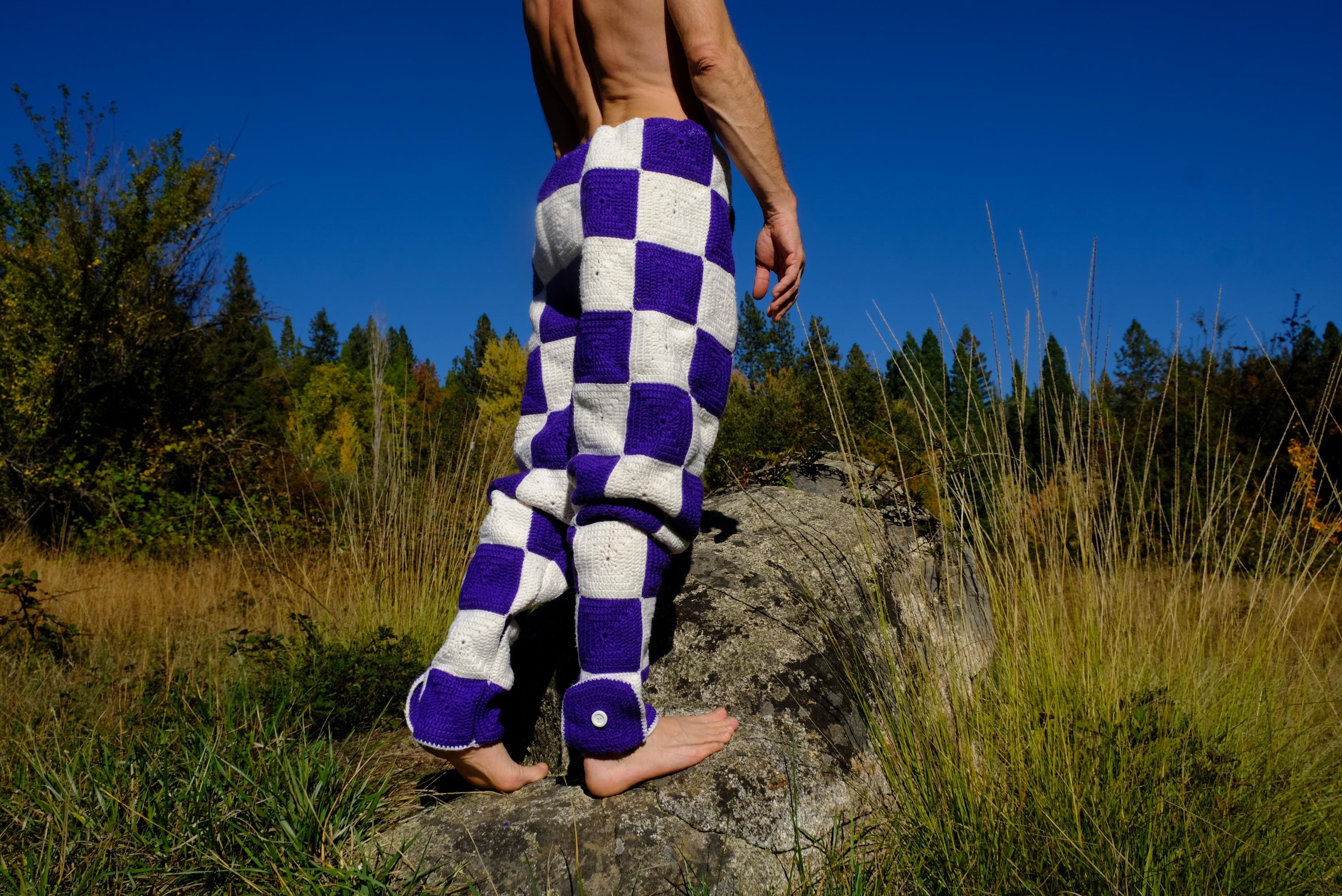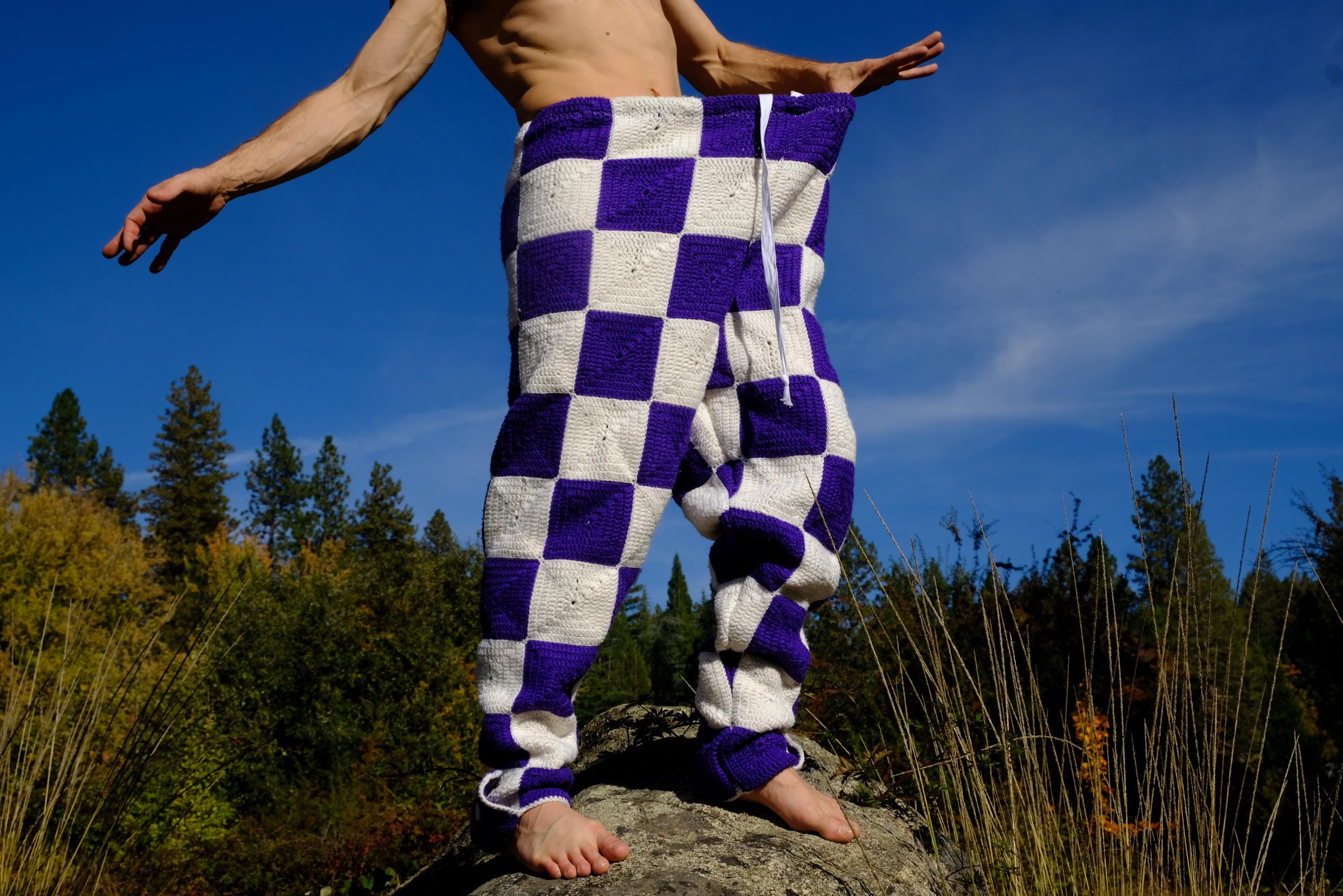 These are crochet pants with purple and white squares in a checkerboard pattern. Fashioned from a vintage afghan blanket crocheted in 100% acrylic yarn.