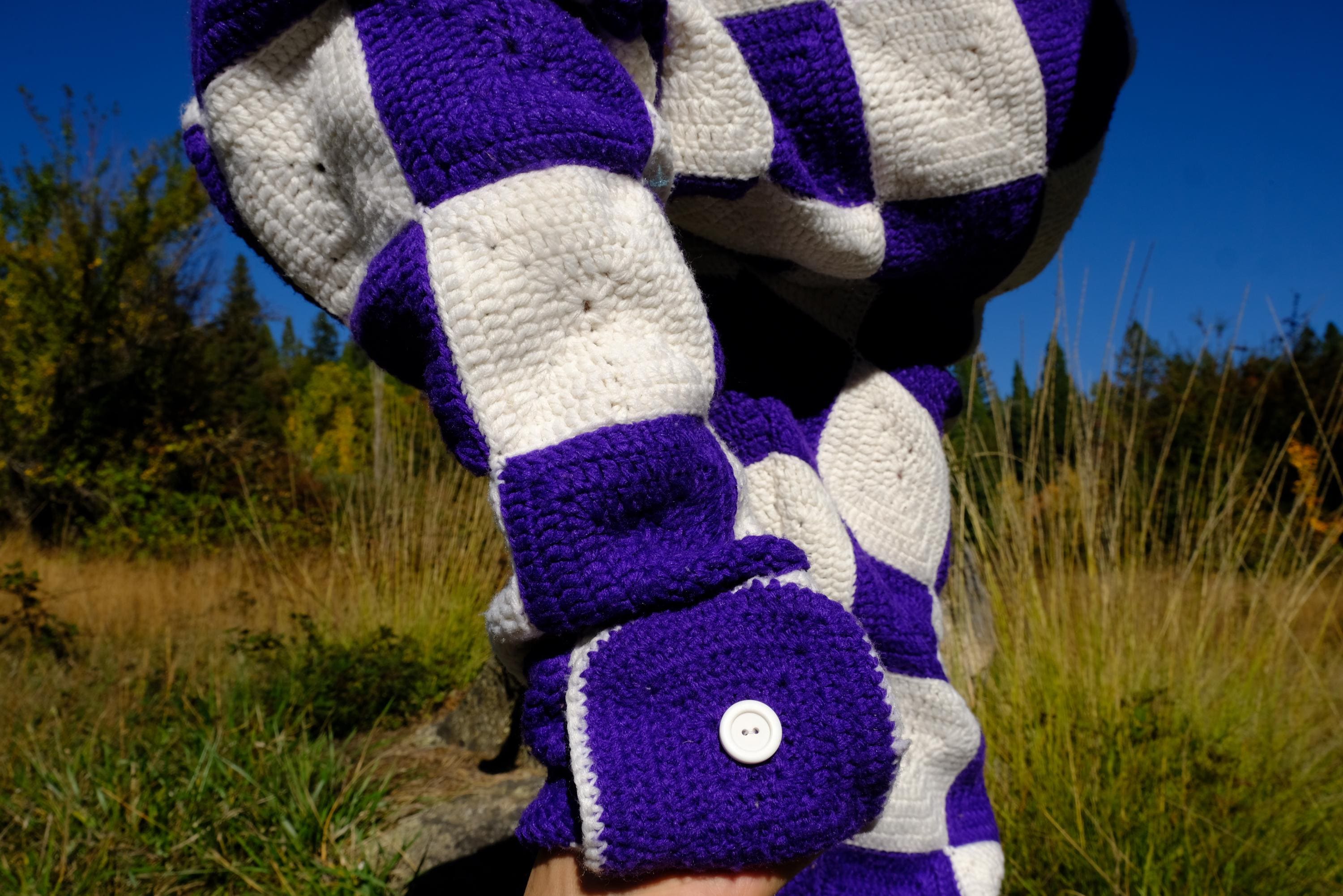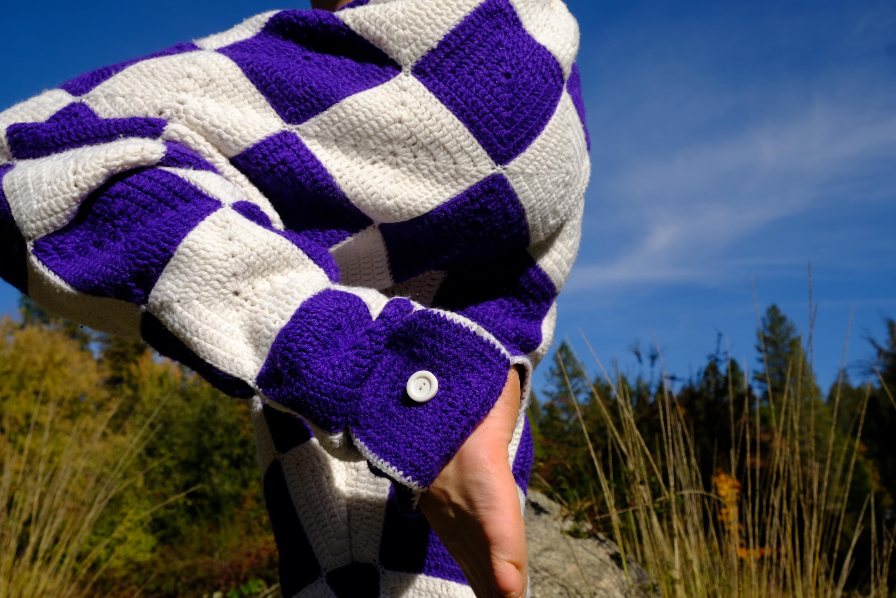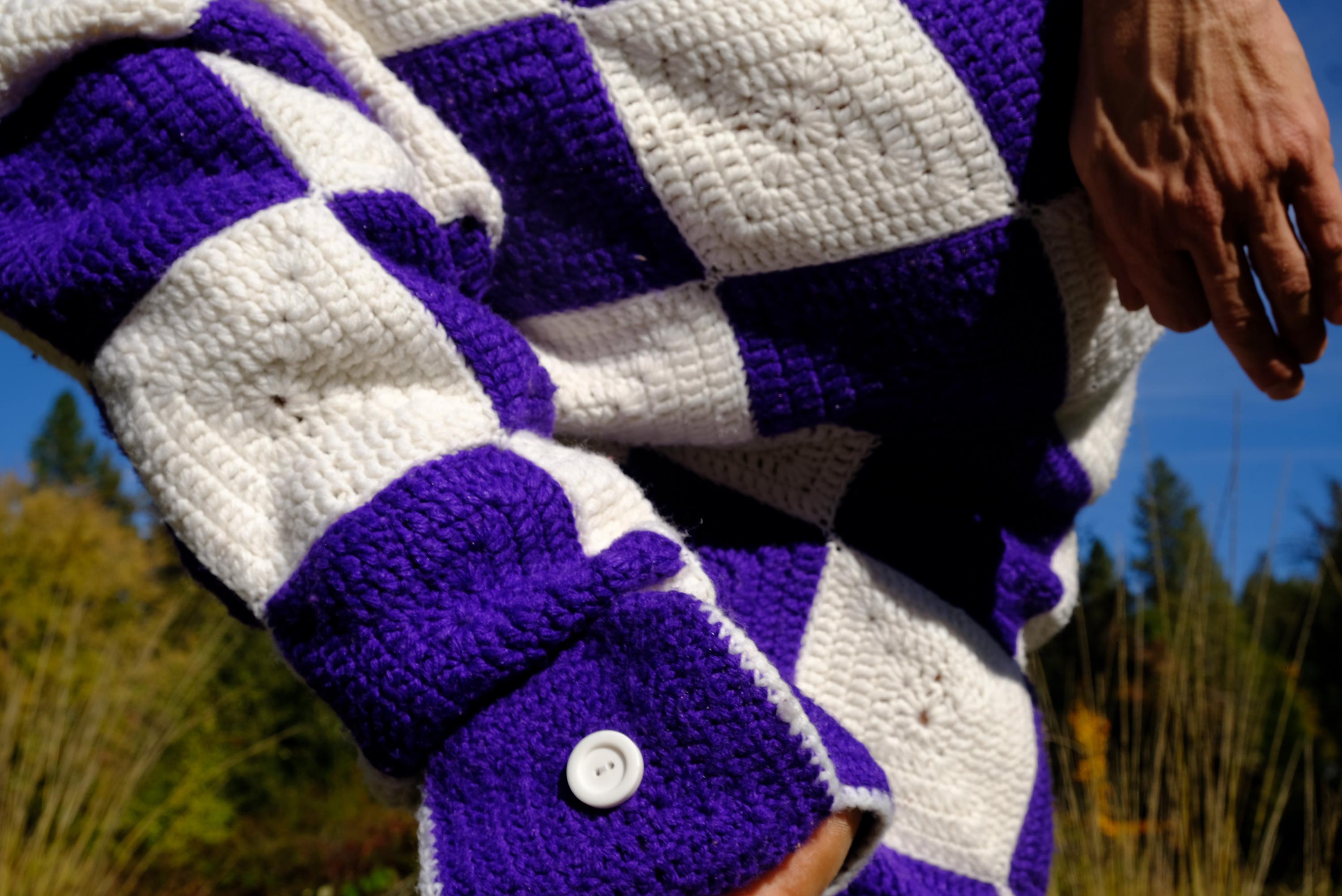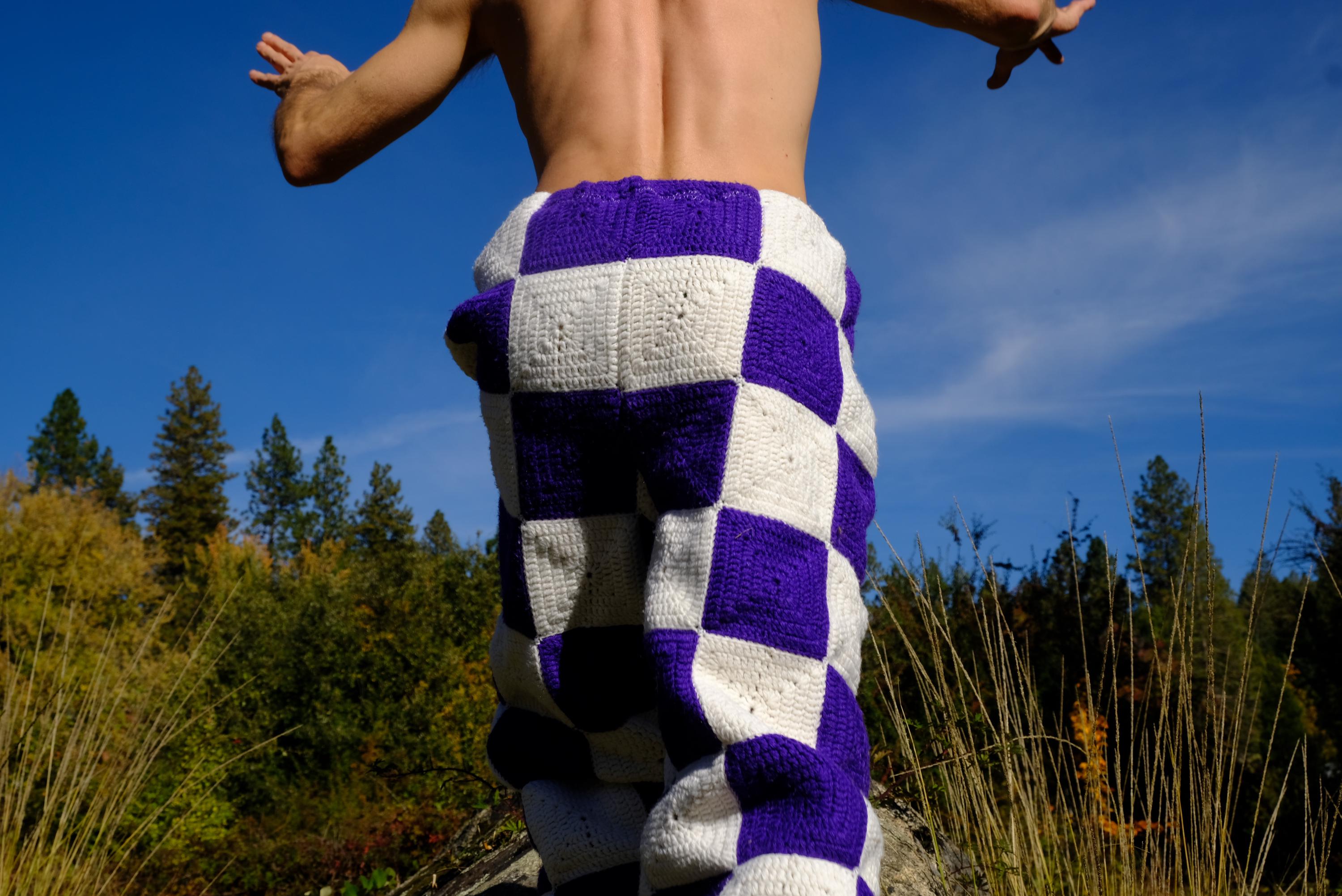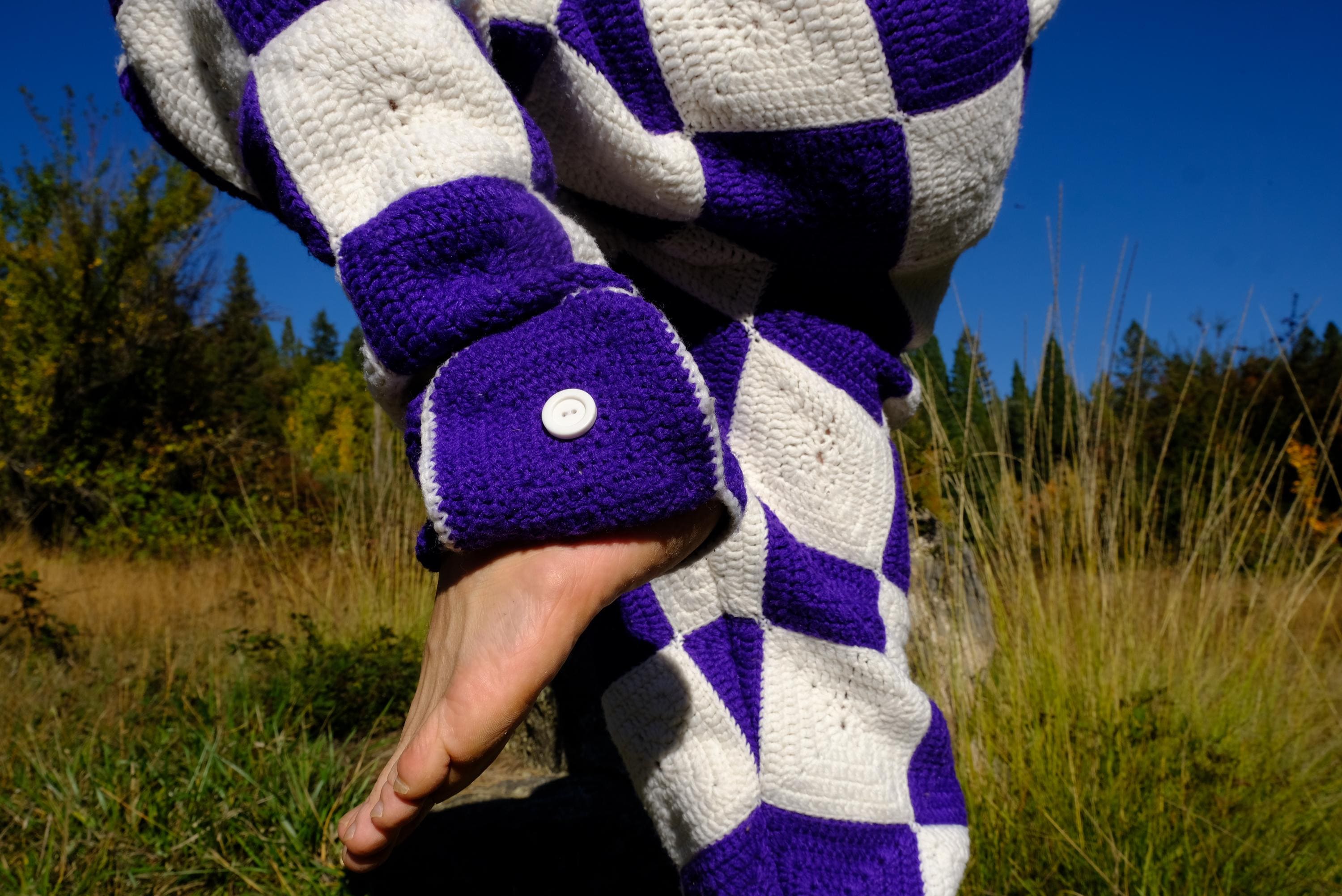 These are crochet pants with purple and white squares in a checkerboard pattern. Fashioned from a vintage afghan blanket crocheted in 100% acrylic yarn.