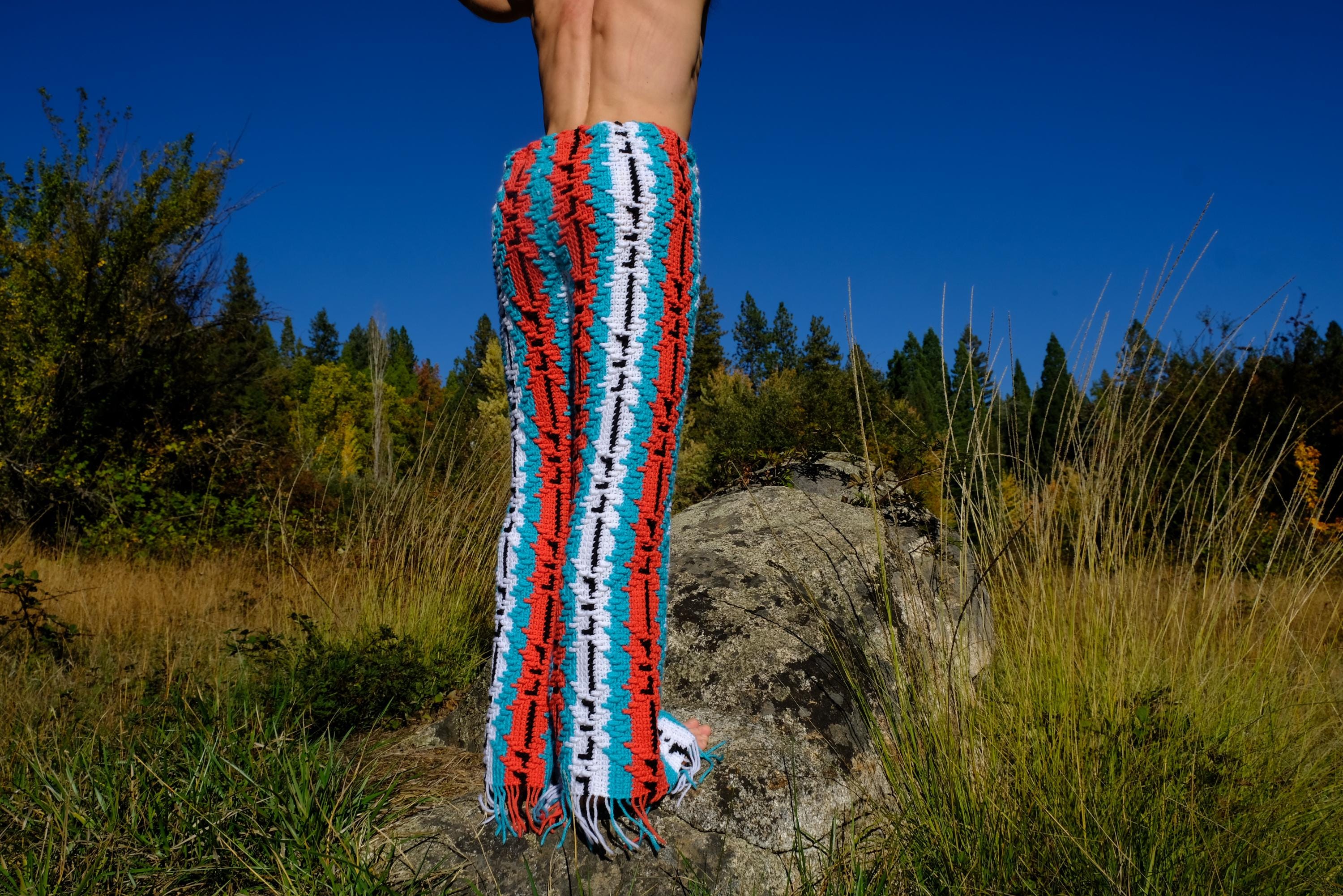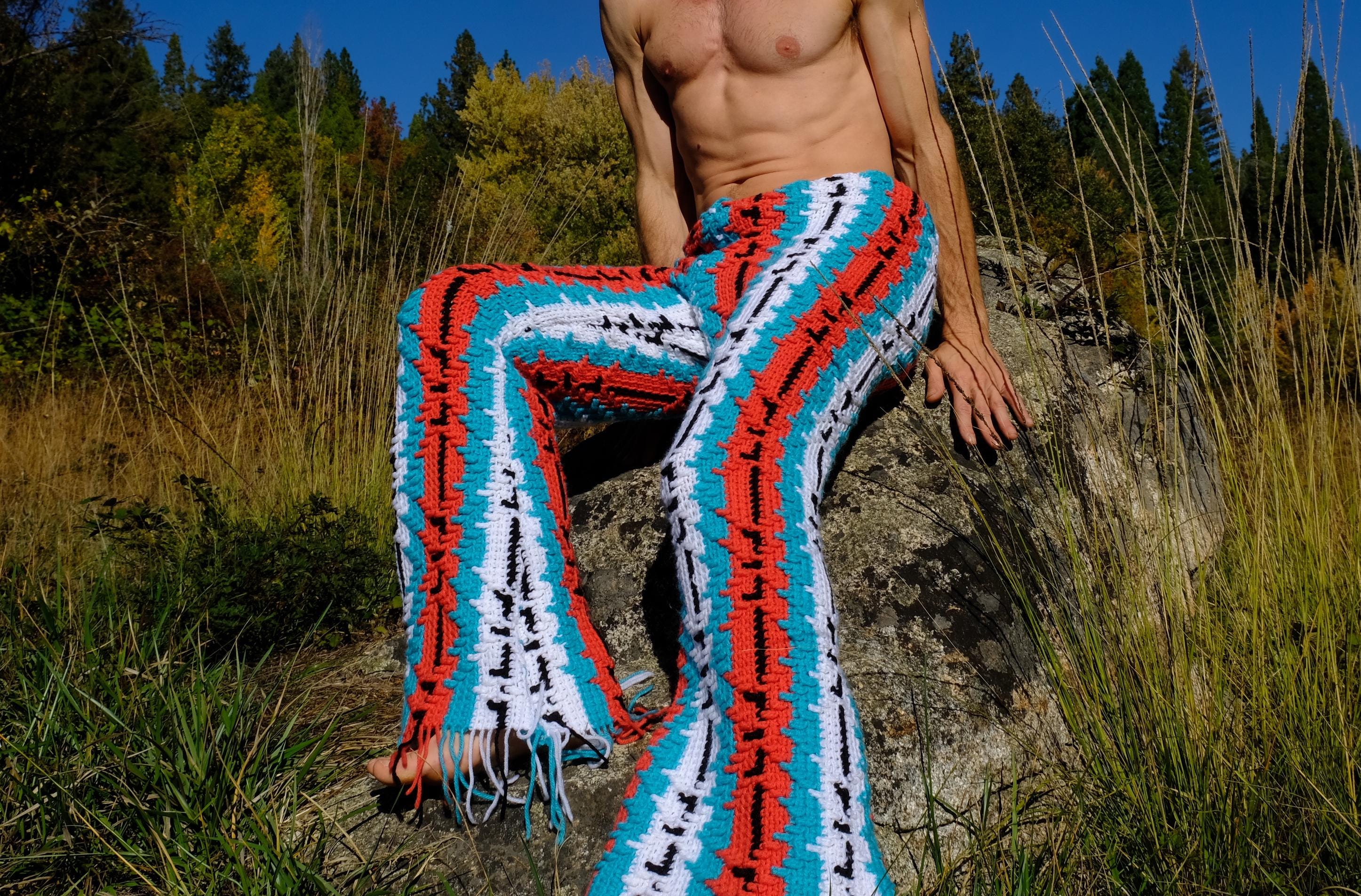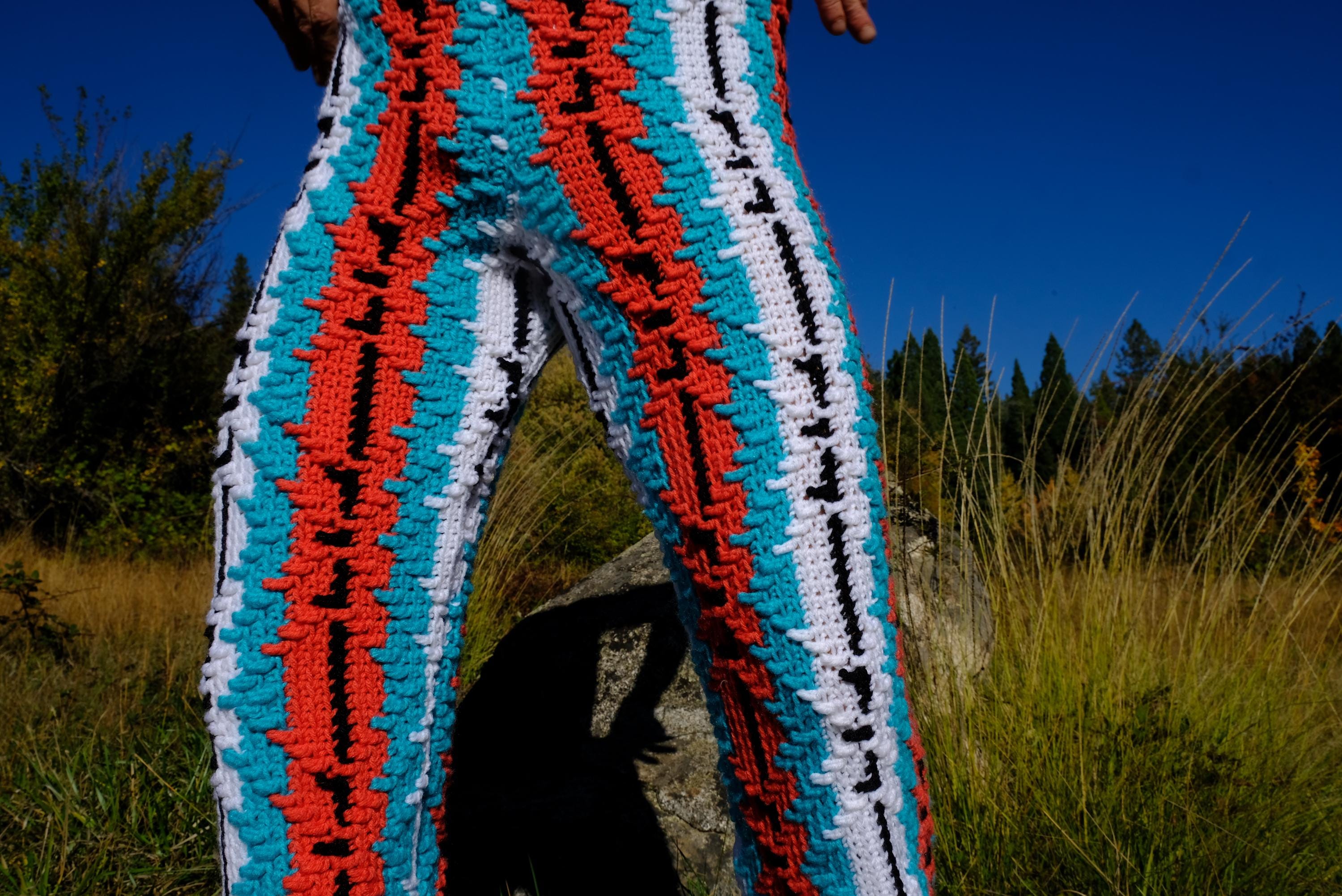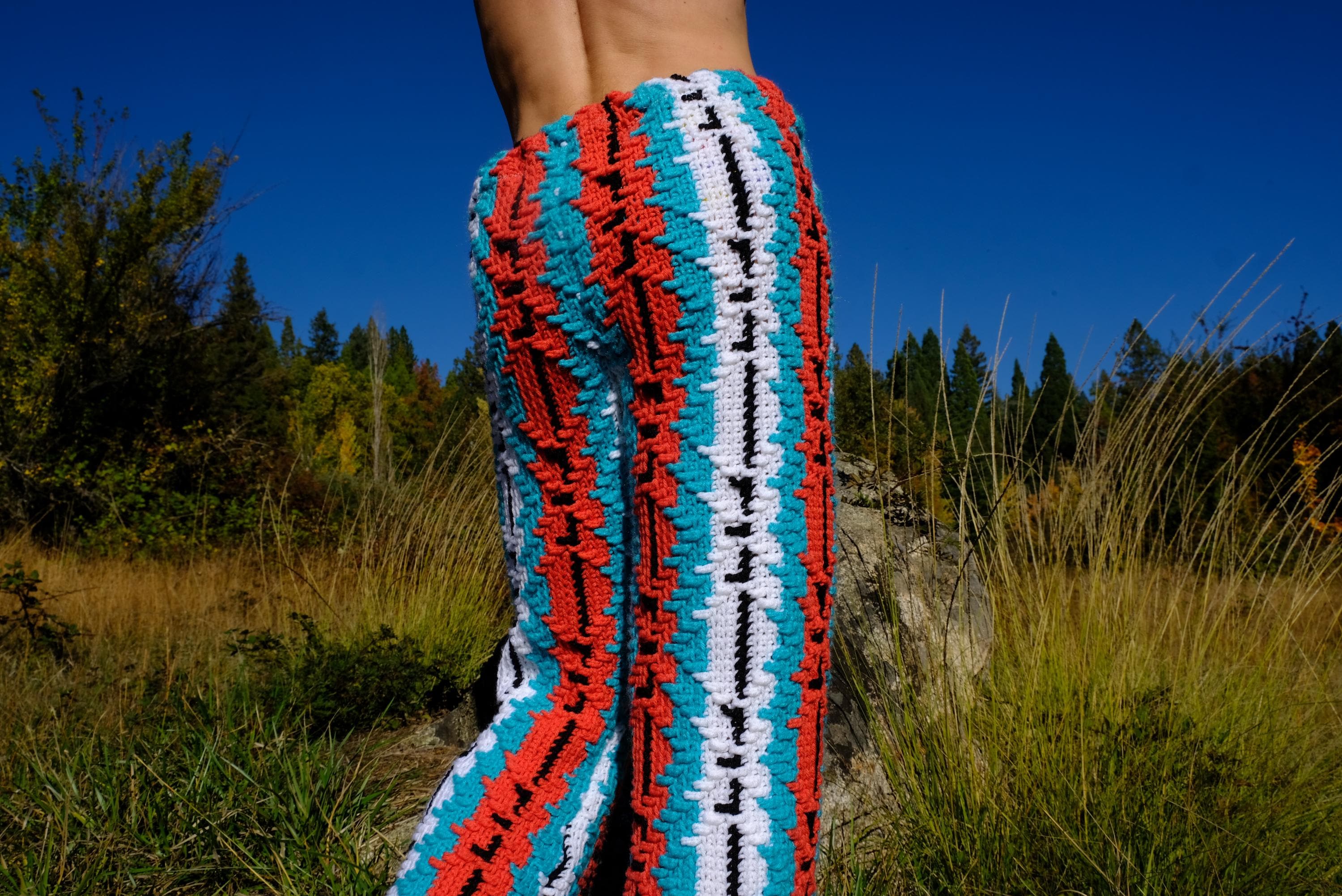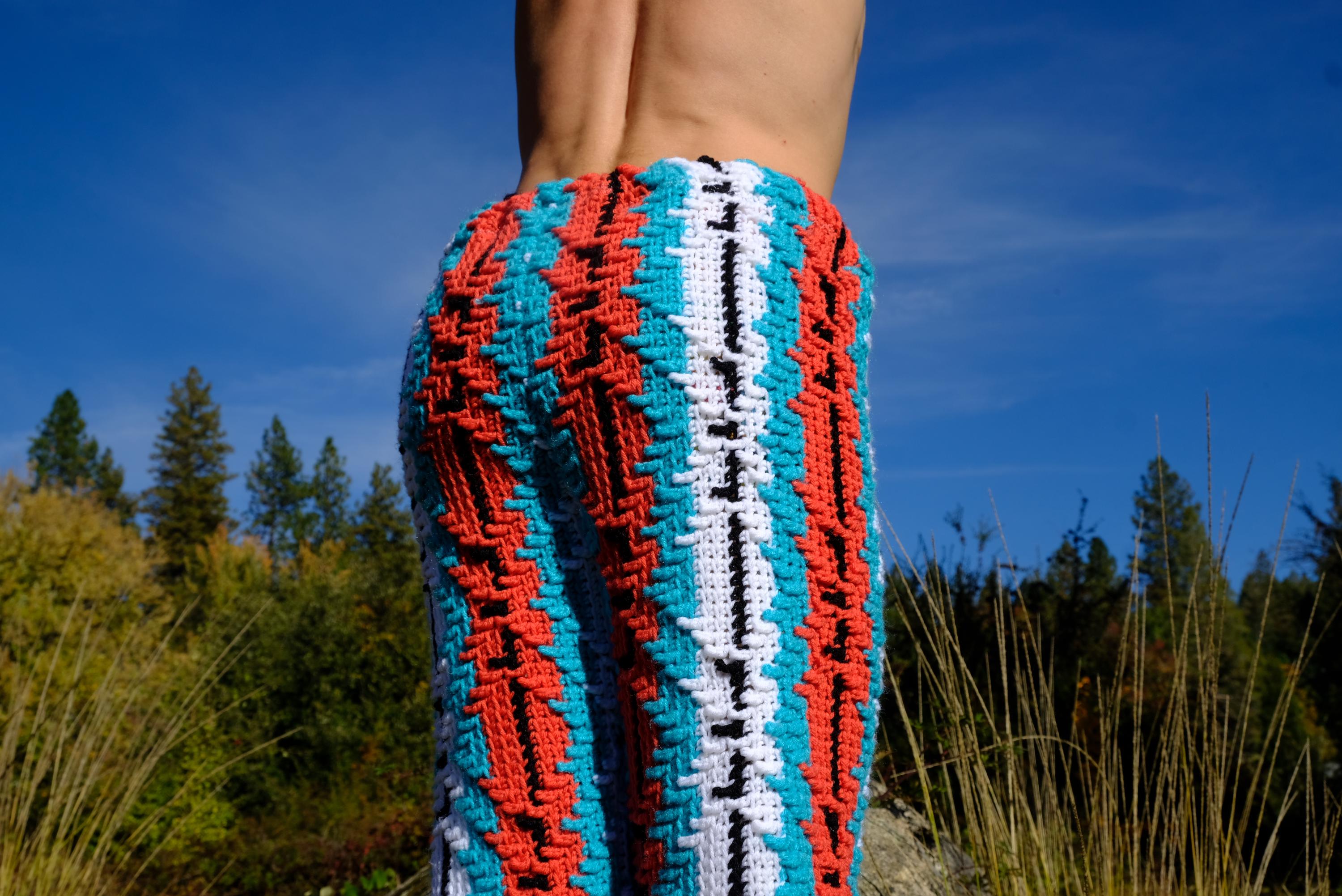 These are crochet pants with turquoise black and red stripes and a 3-D raised pattern. Fashioned from a vintage afghan blanket crocheted in 100% acrylic yarn.
