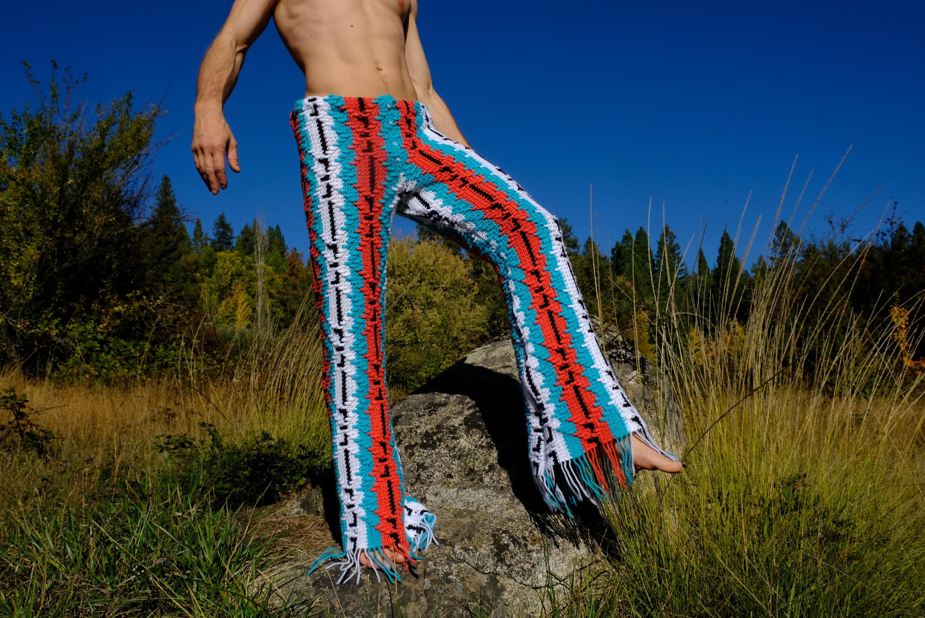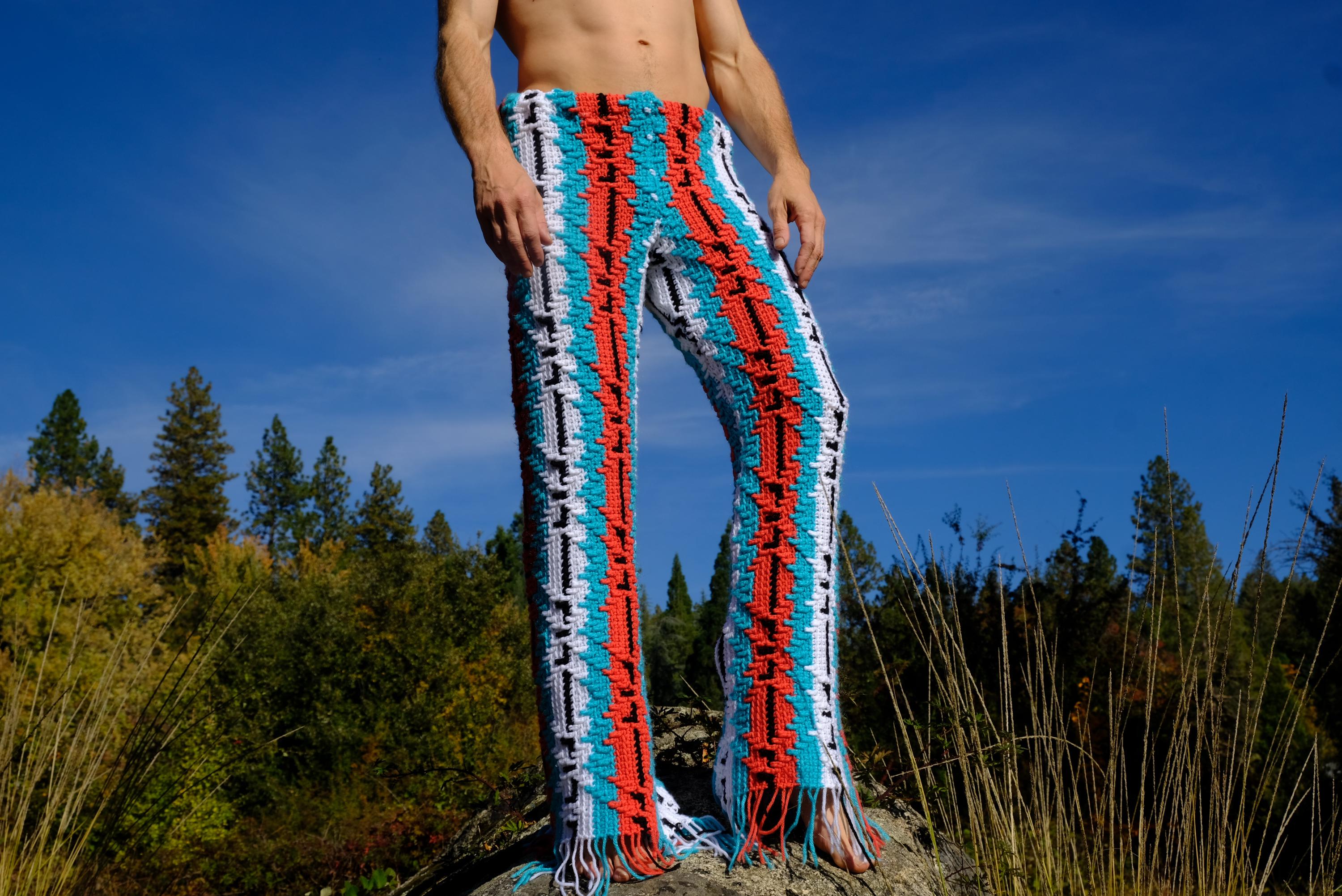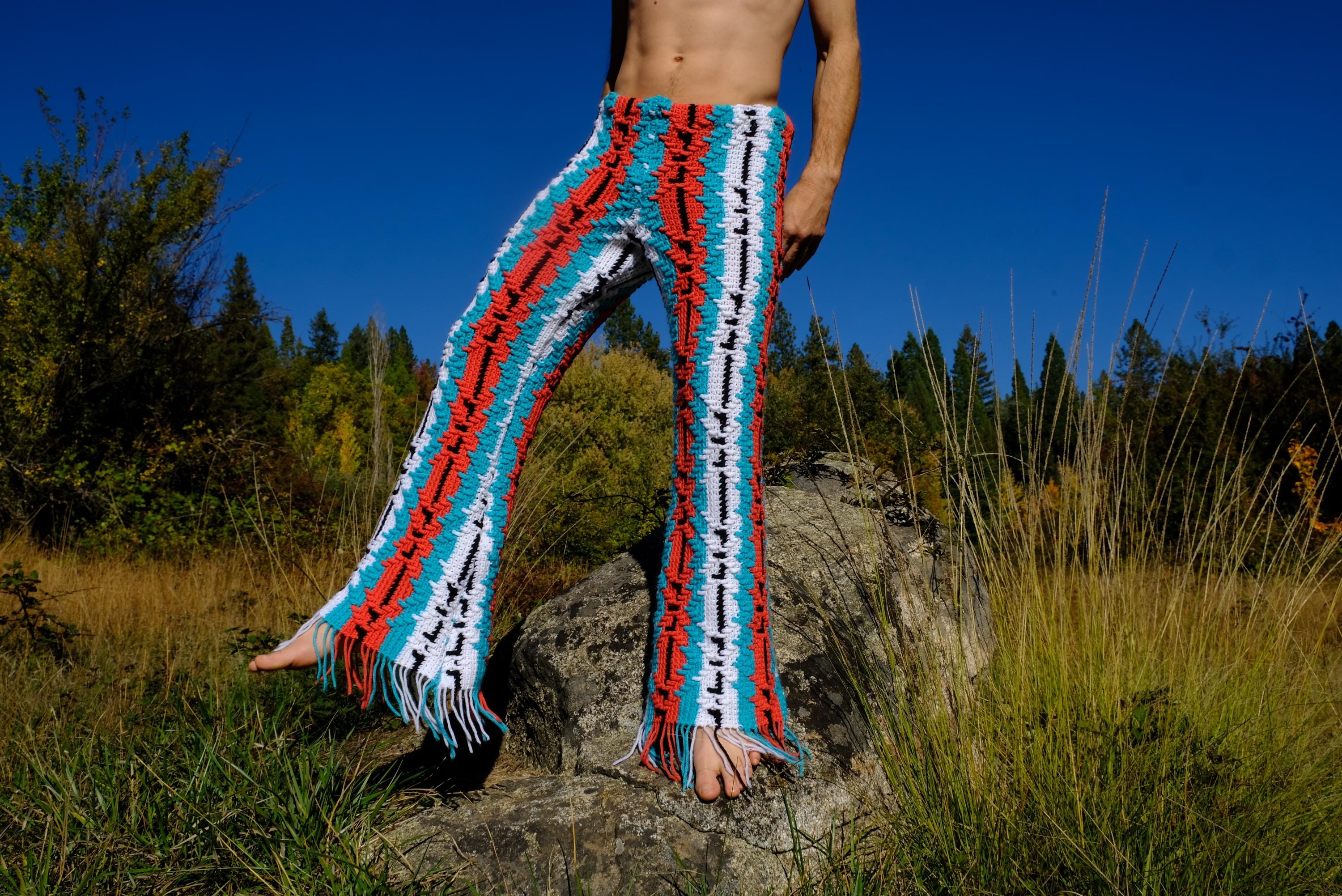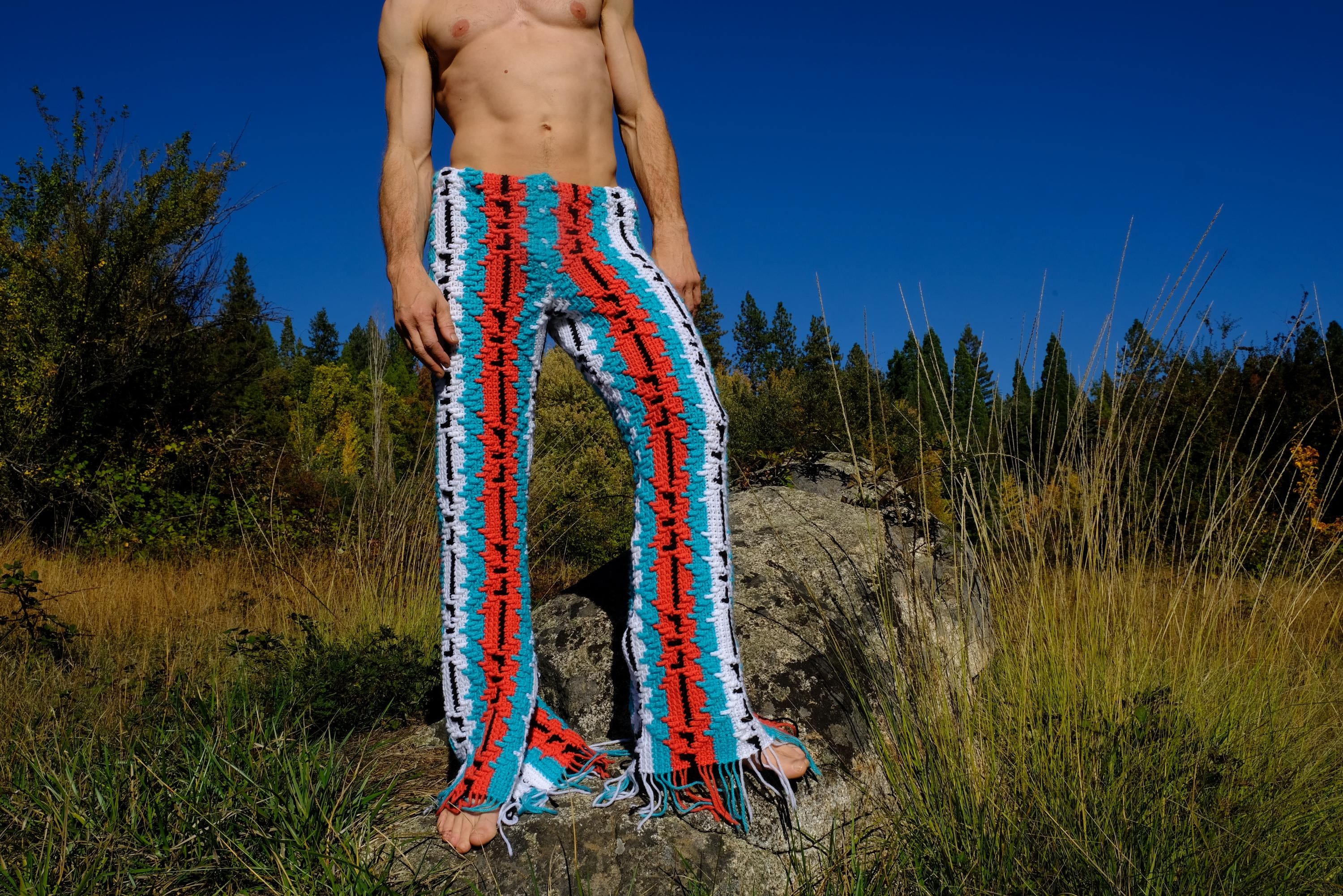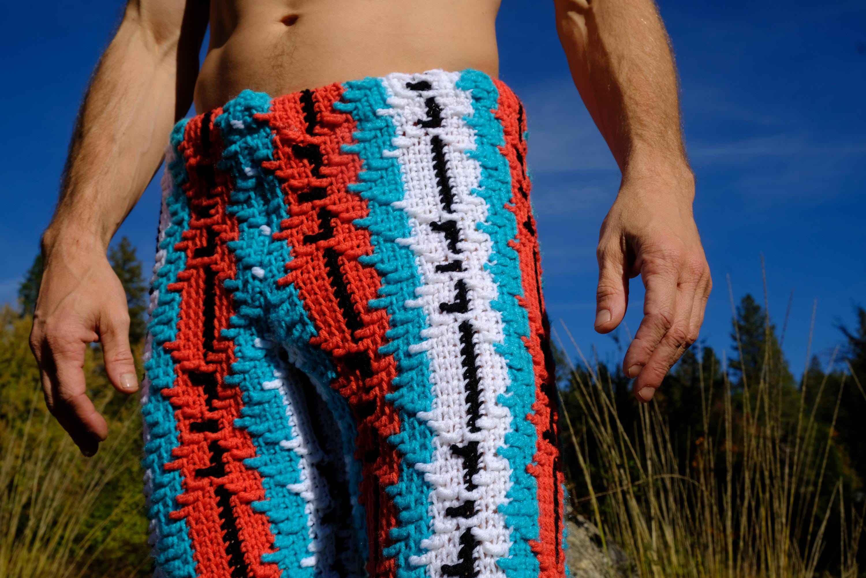 These are crochet pants with turquoise black and red stripes and a 3-D raised pattern. Fashioned from a vintage afghan blanket crocheted in 100% acrylic yarn.