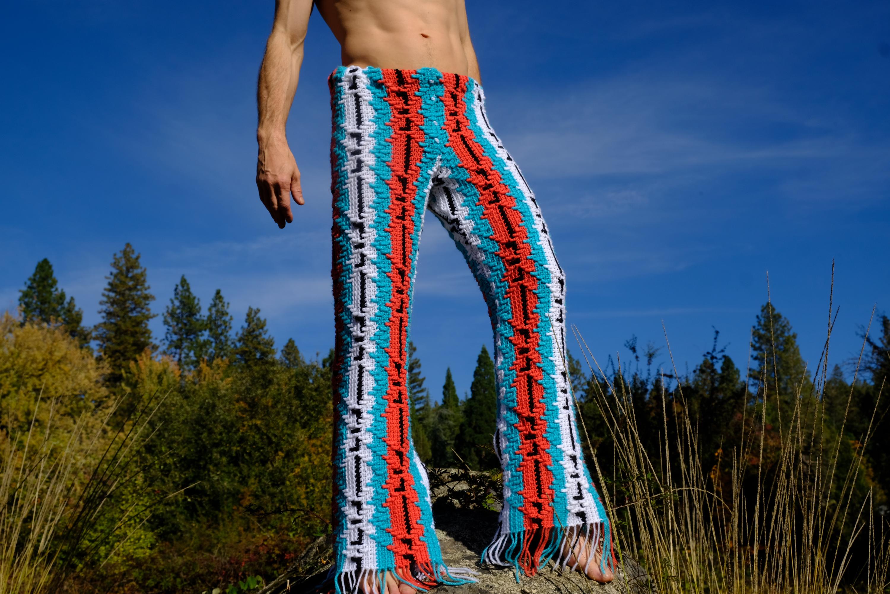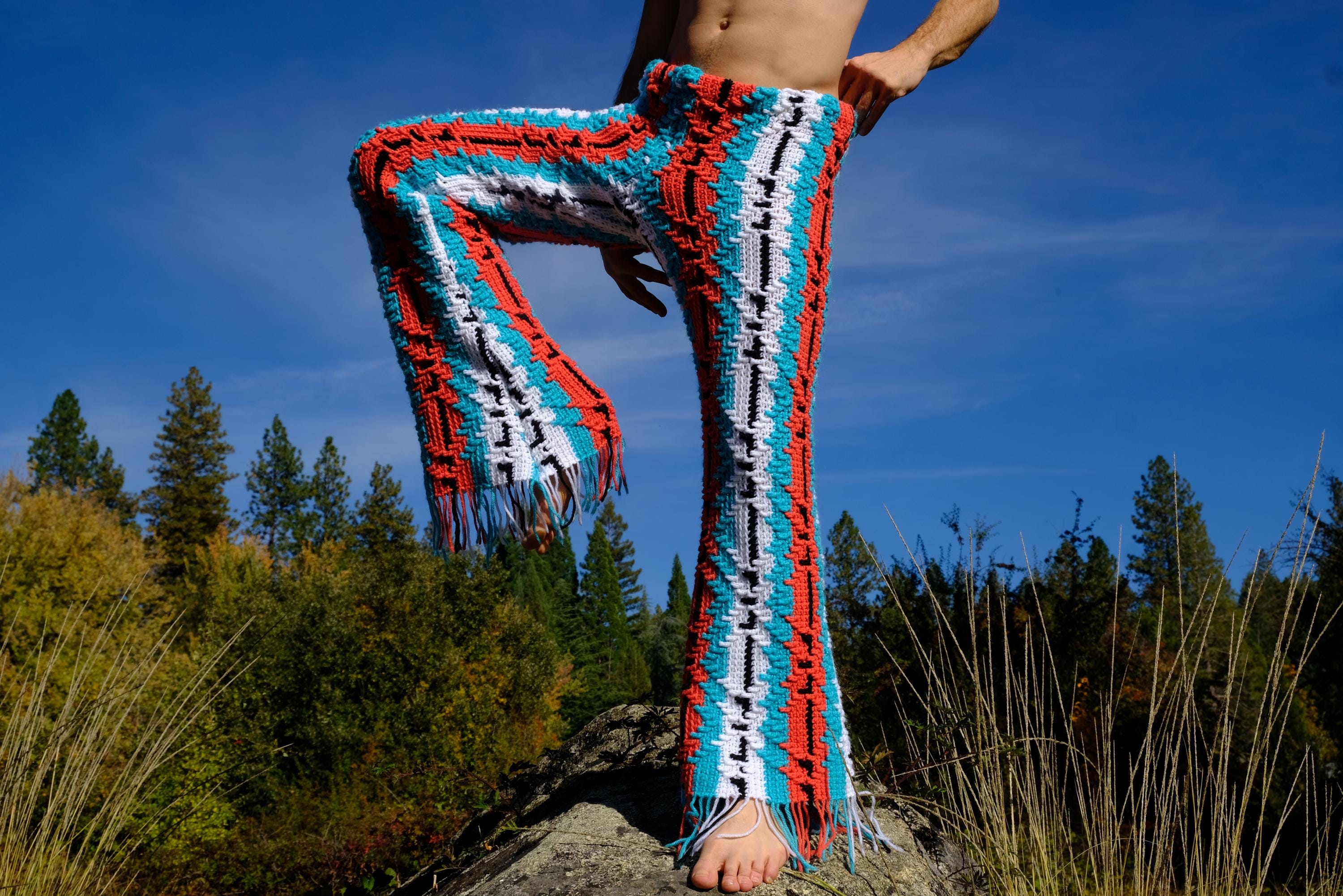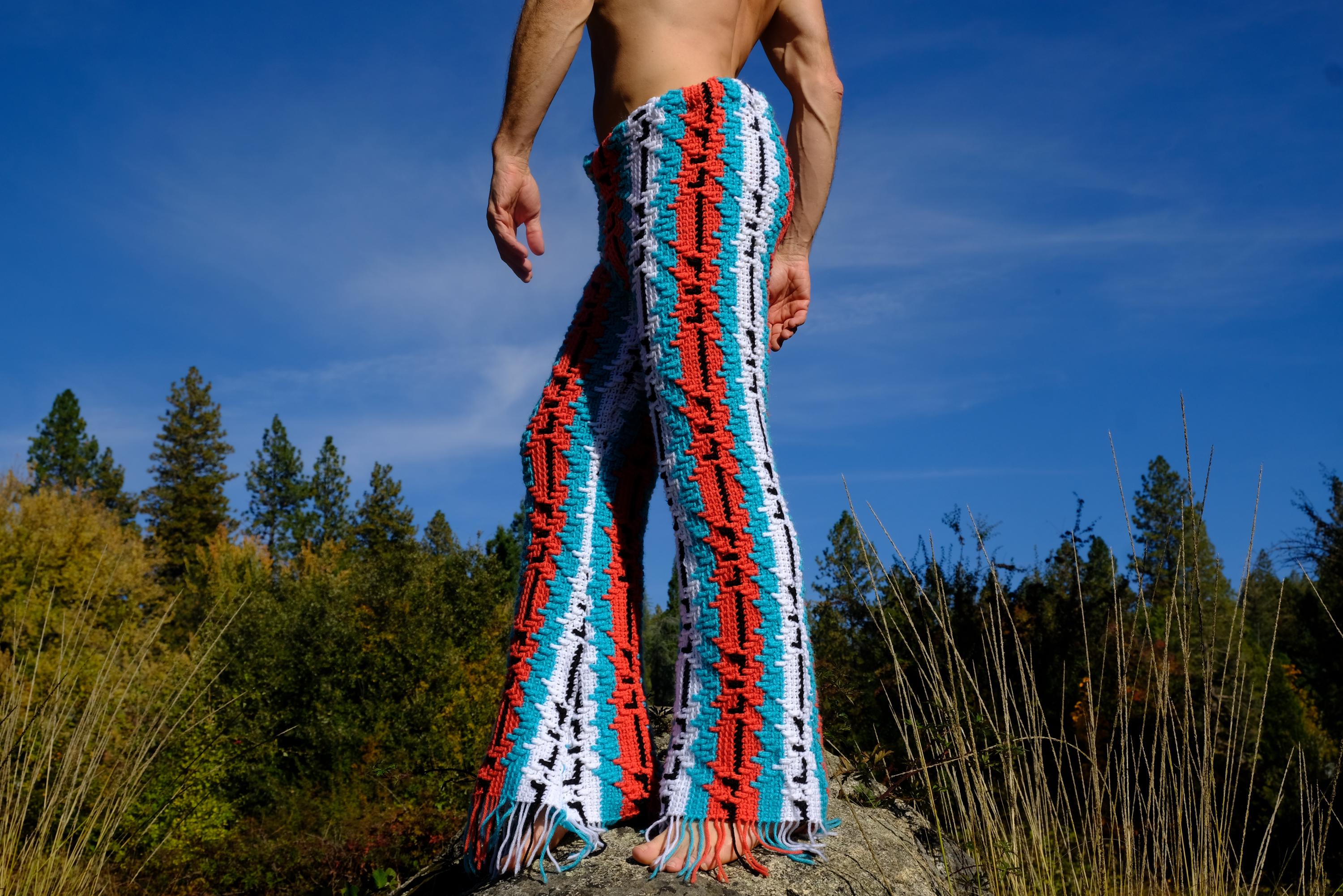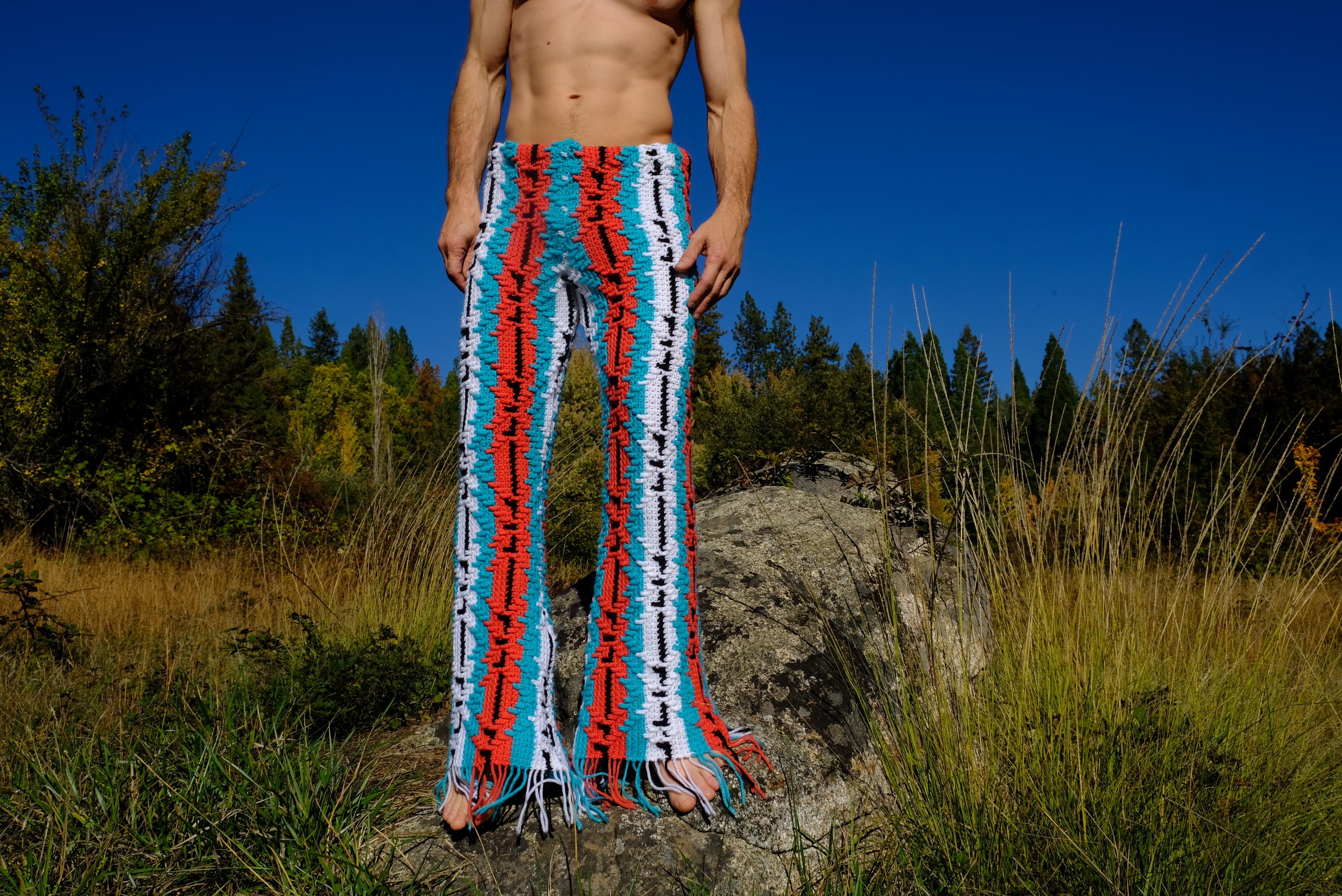 These are crochet pants with turquoise black and red stripes and a 3-D raised pattern. Fashioned from a vintage afghan blanket crocheted in 100% acrylic yarn.