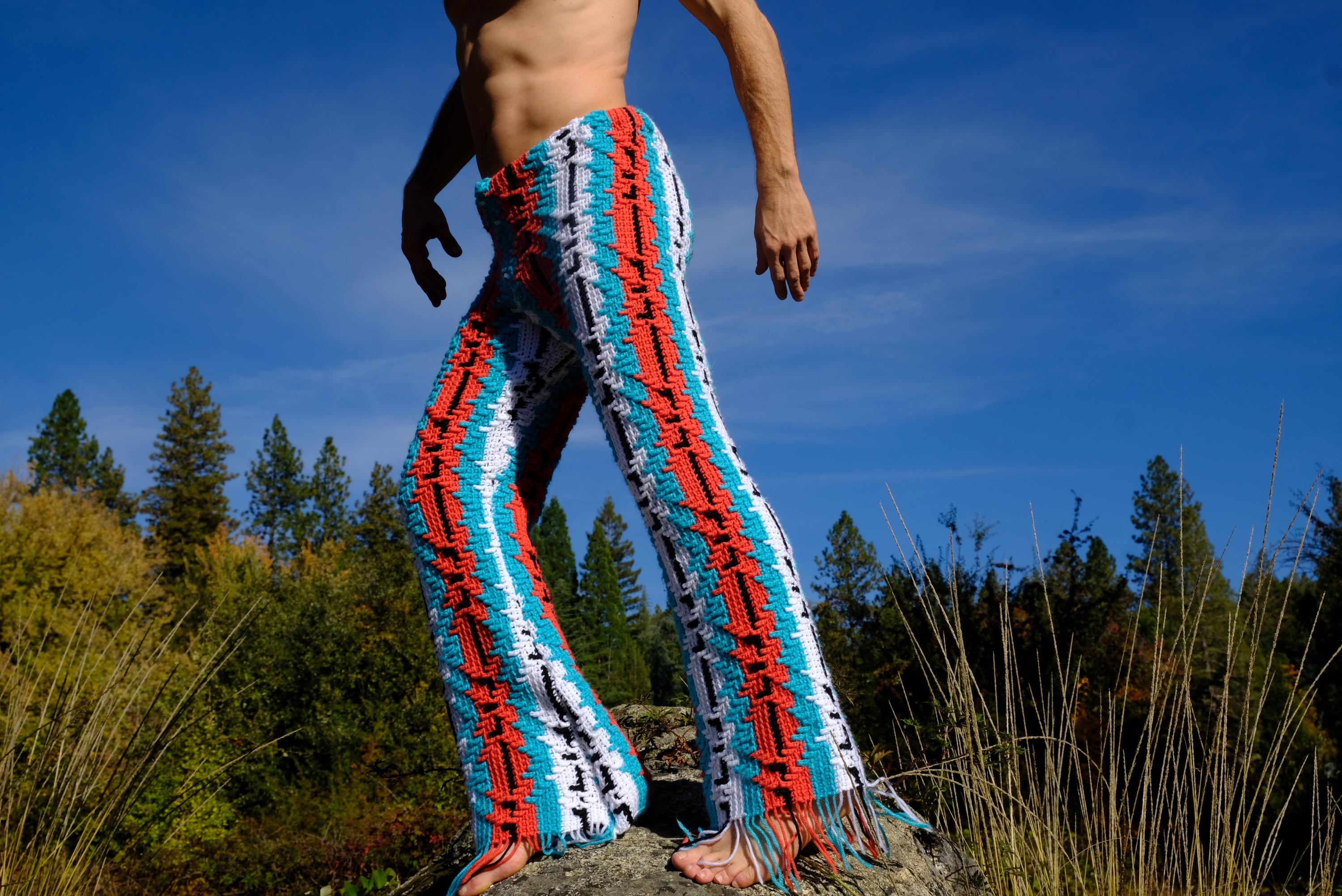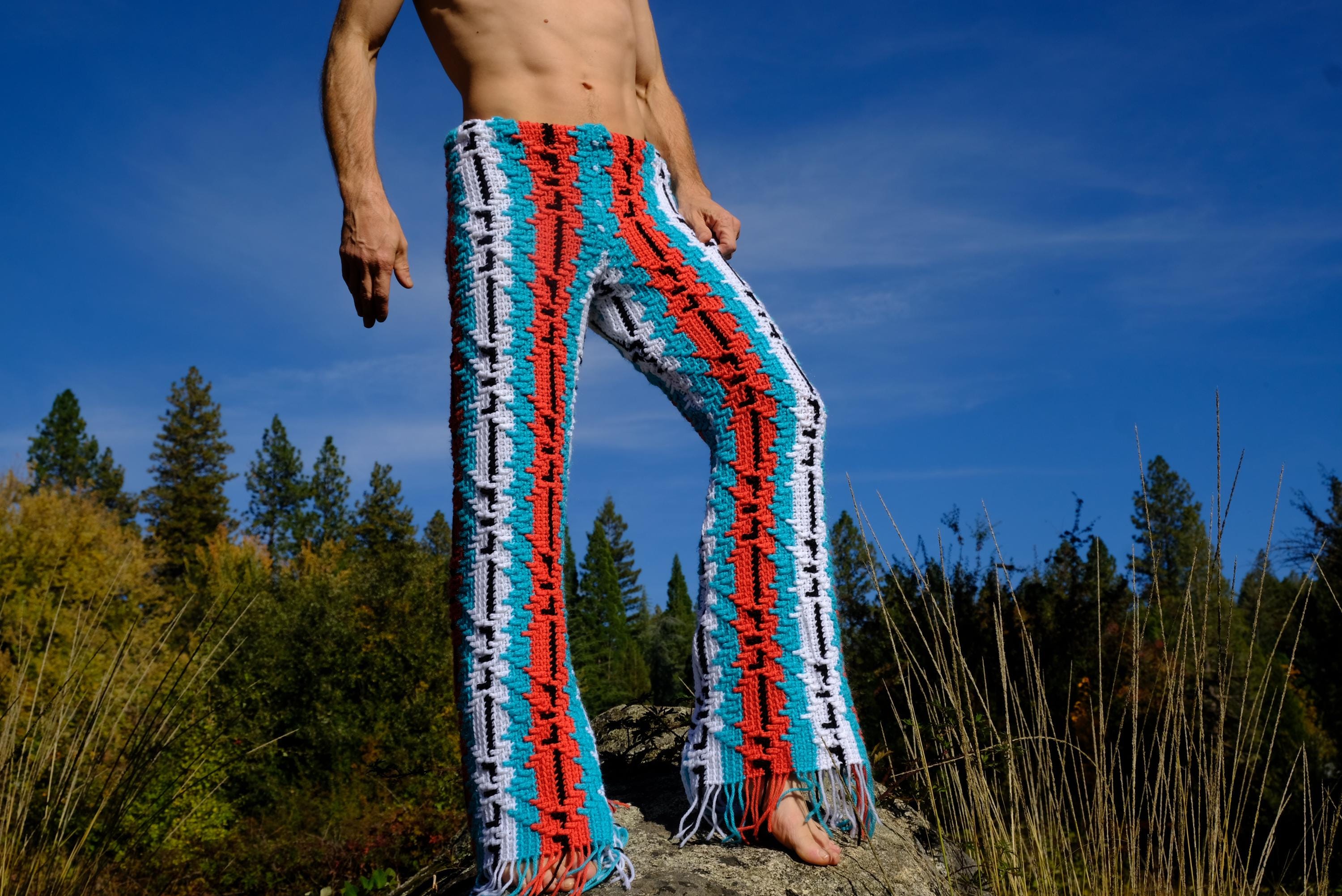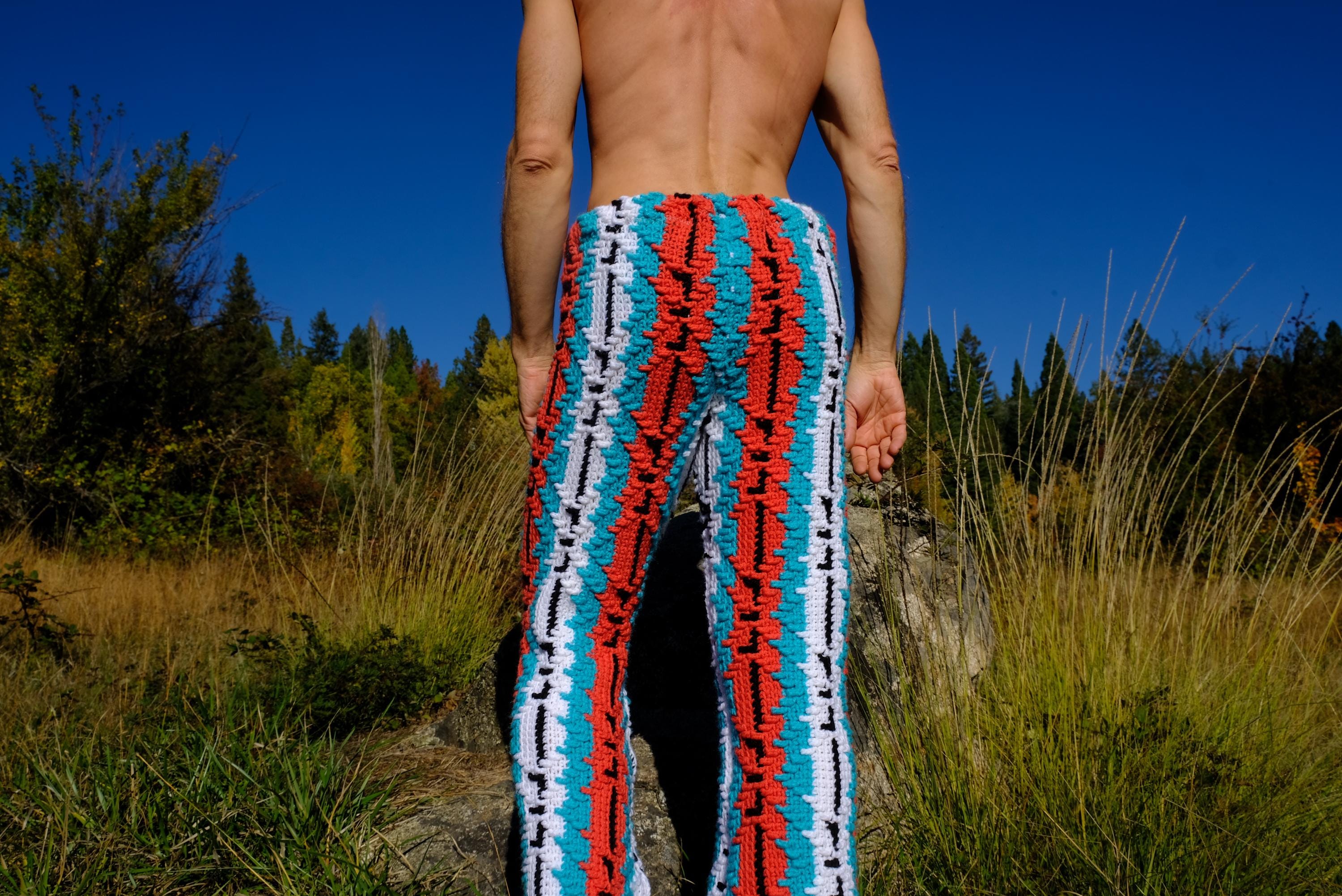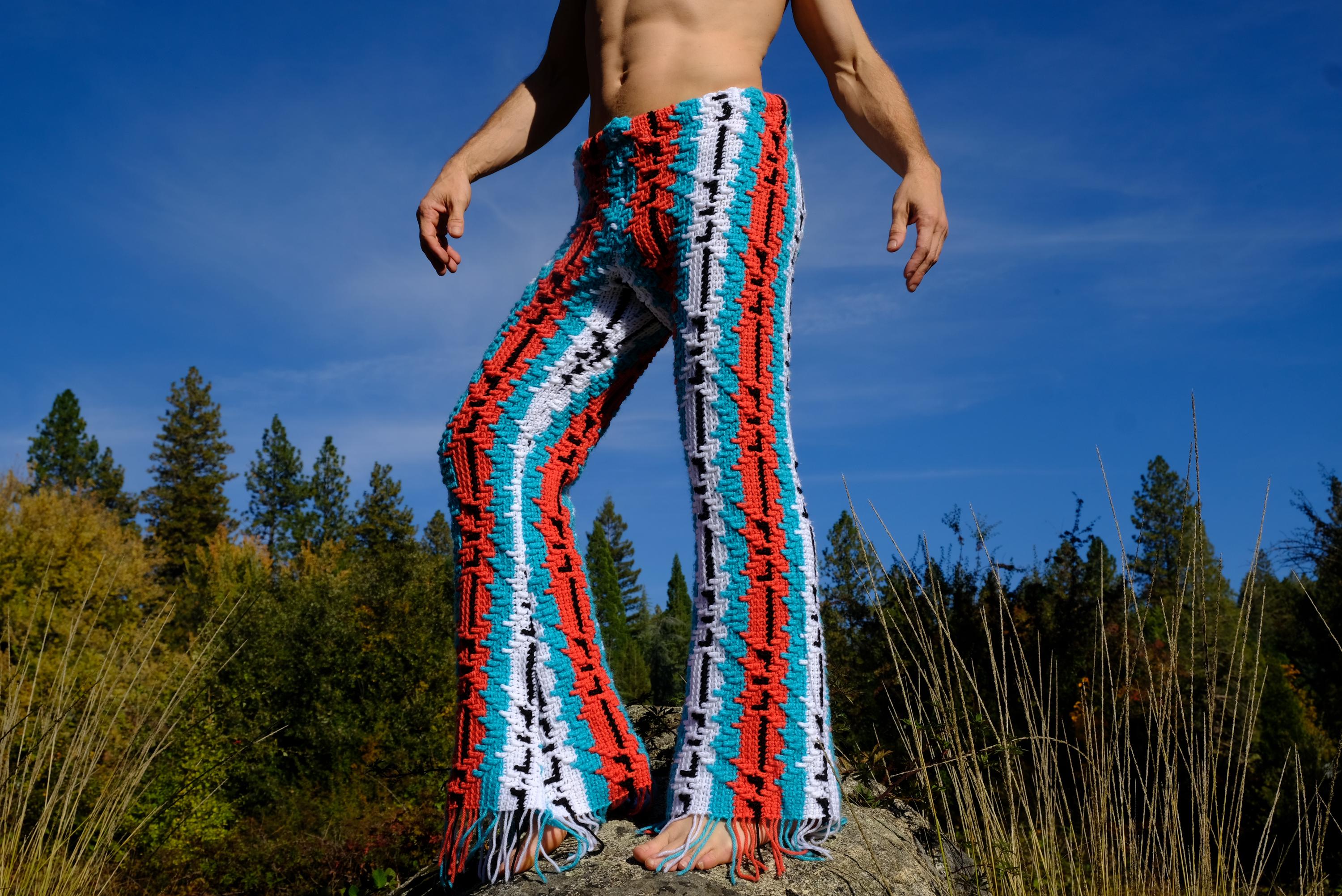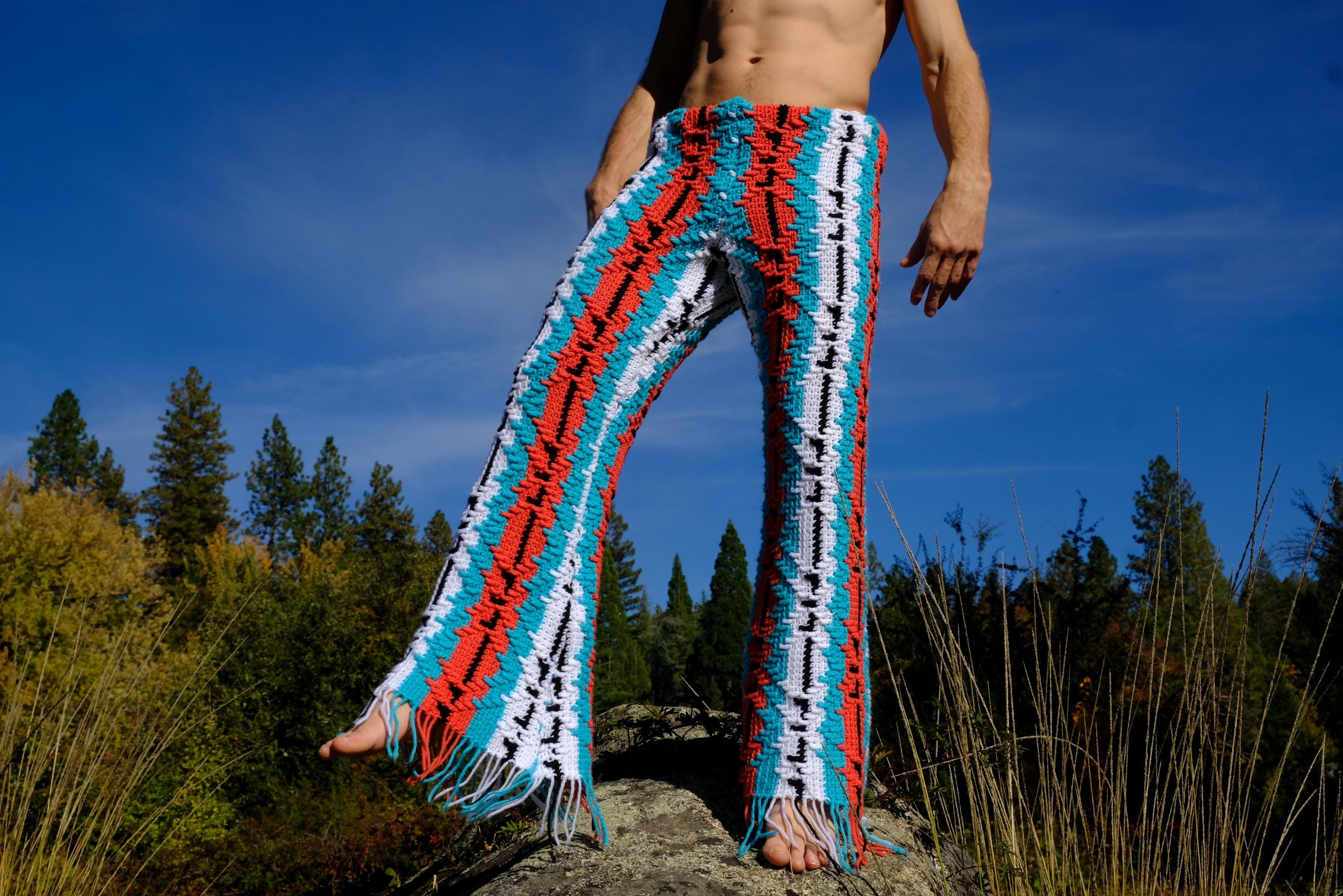 These are crochet pants with turquoise black and red stripes and a 3-D raised pattern. Fashioned from a vintage afghan blanket crocheted in 100% acrylic yarn.