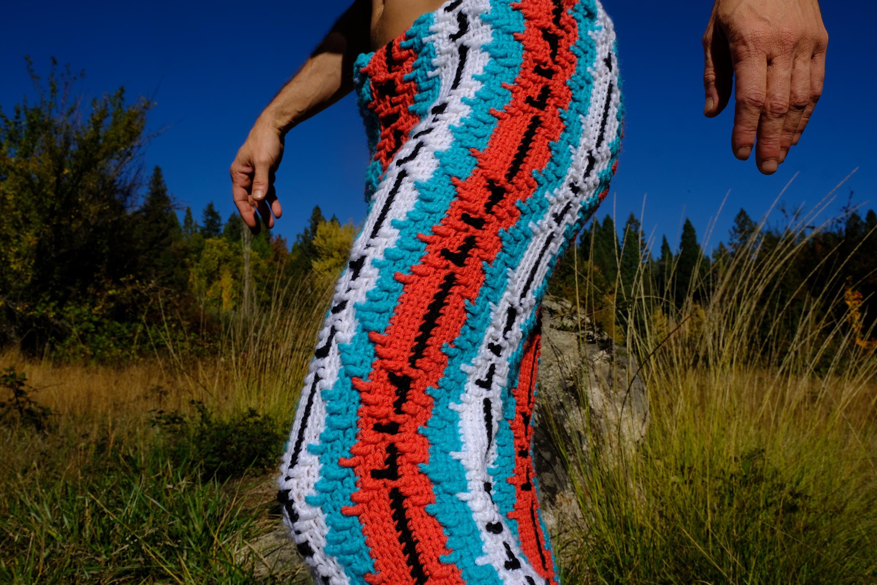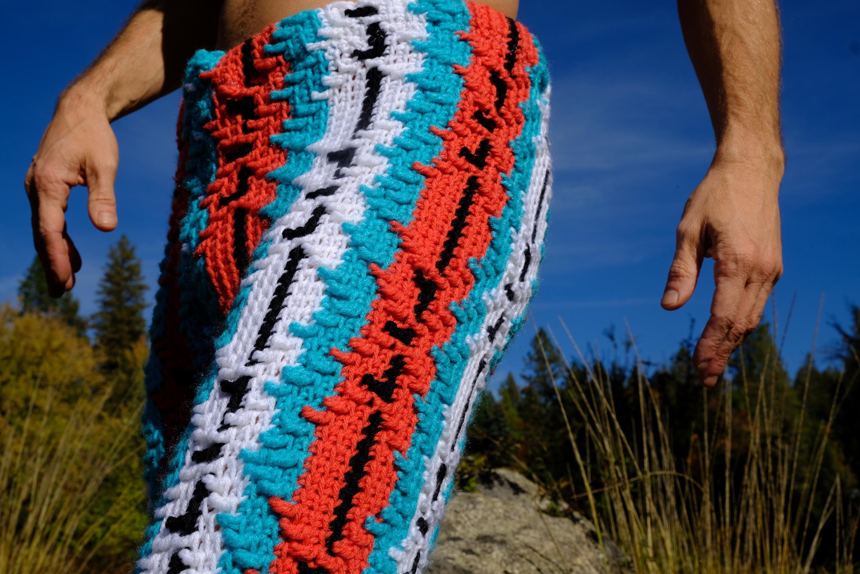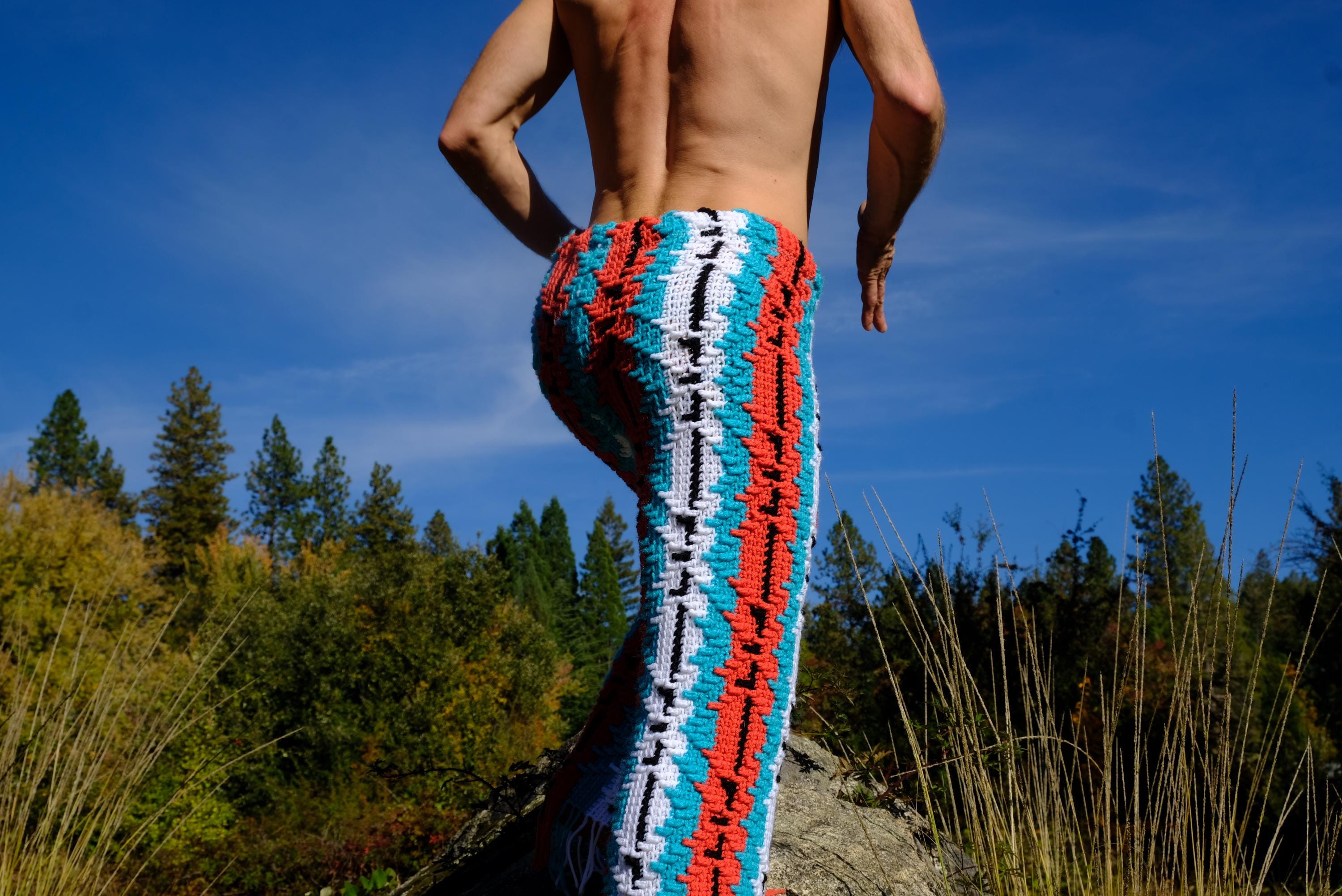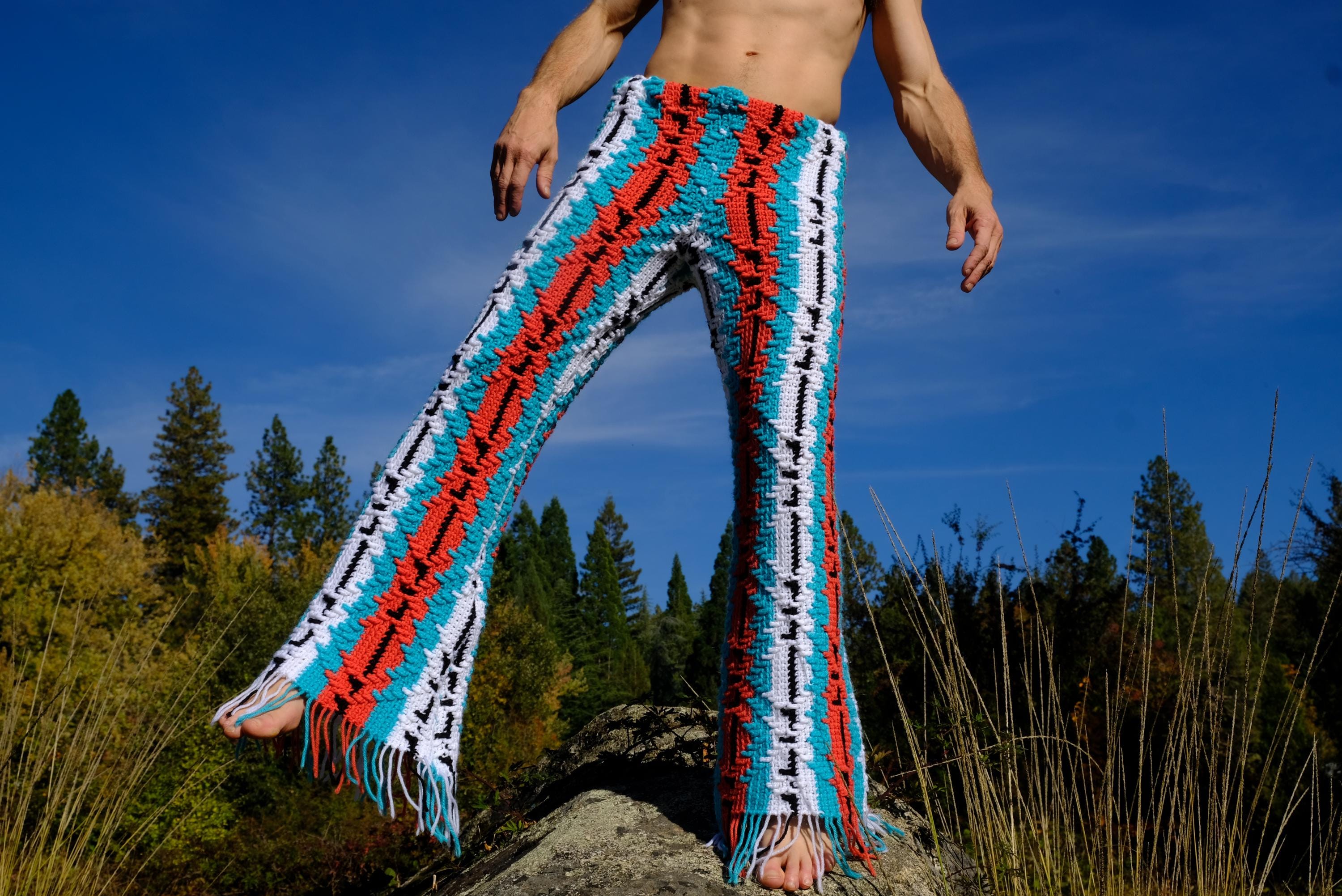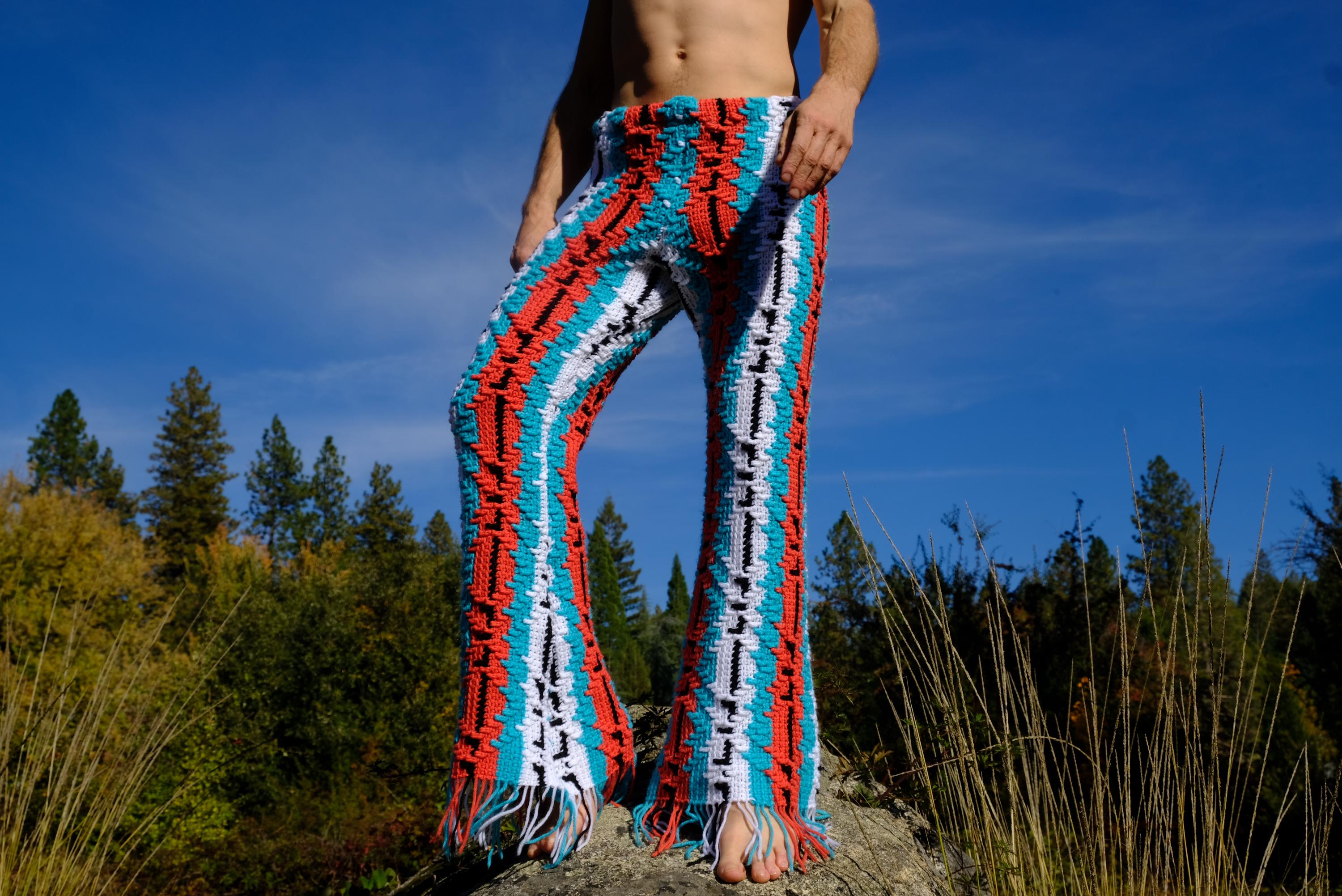 These are crochet pants with turquoise black and red stripes and a 3-D raised pattern. Fashioned from a vintage afghan blanket crocheted in 100% acrylic yarn.