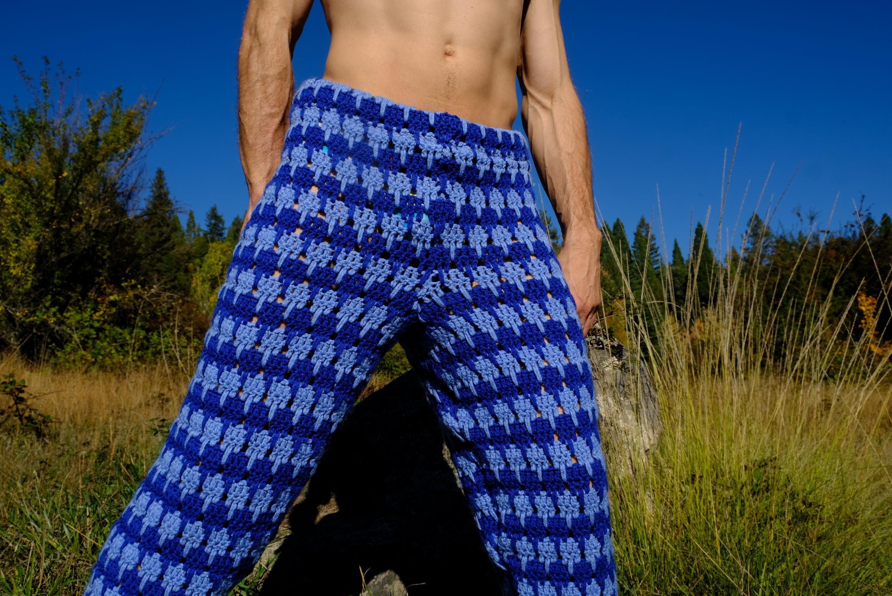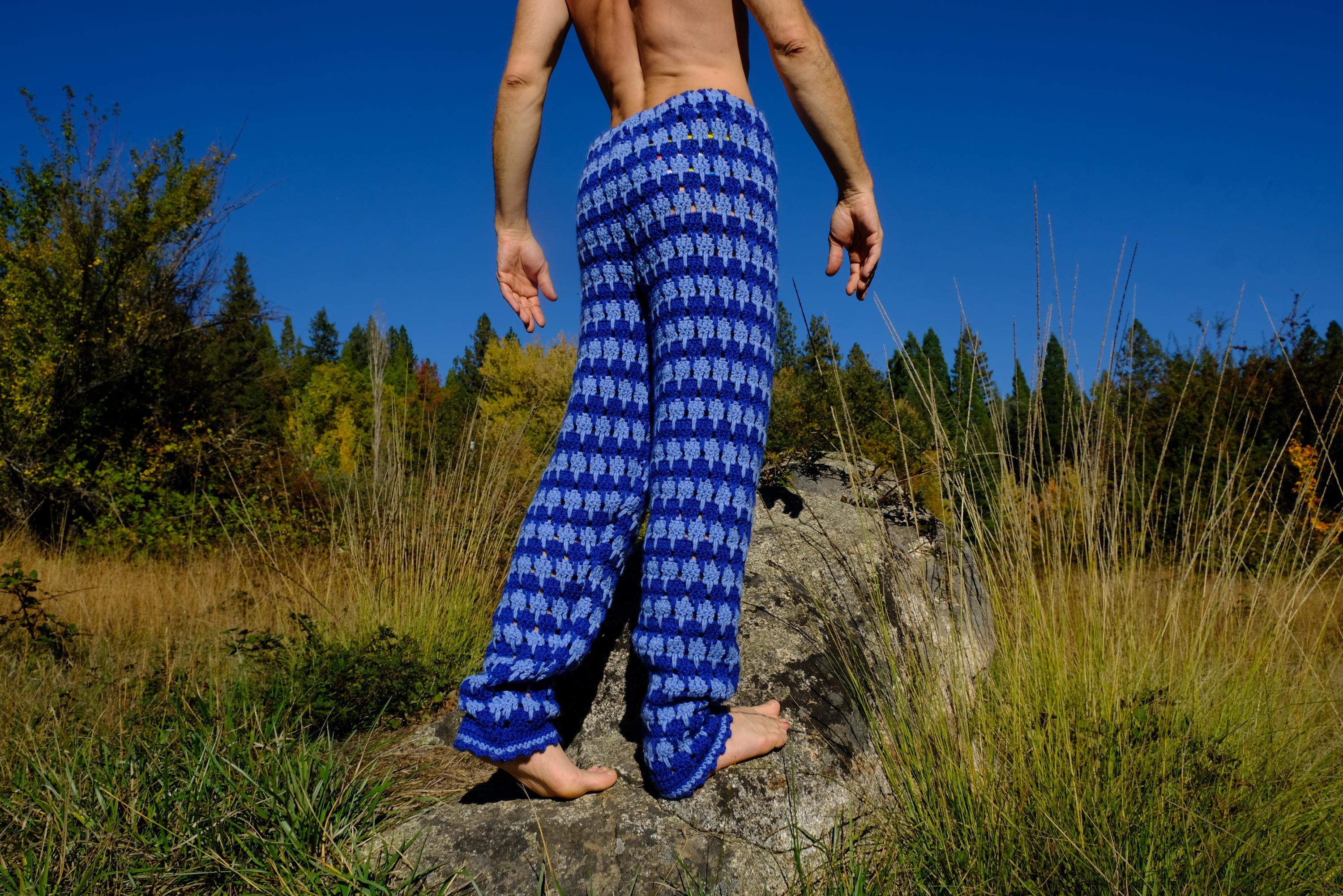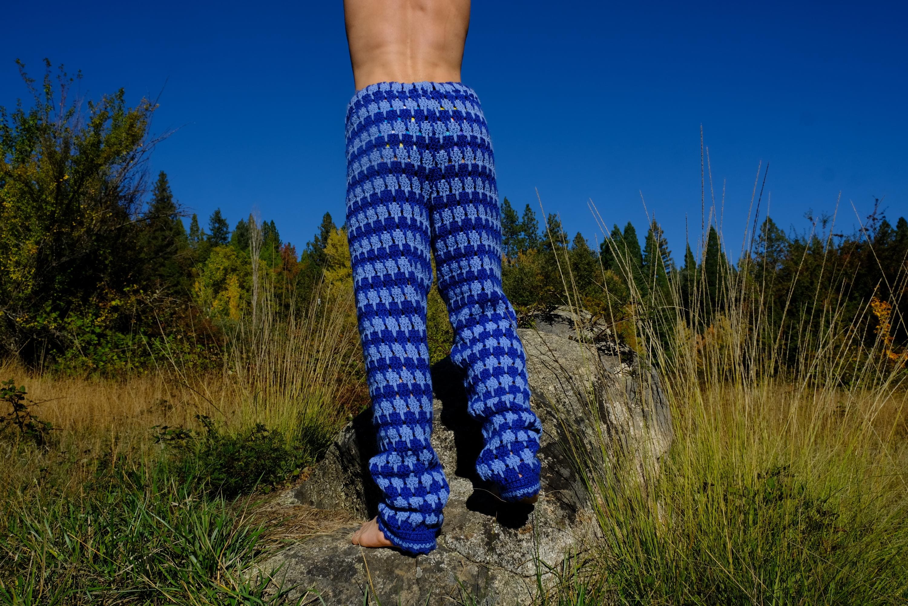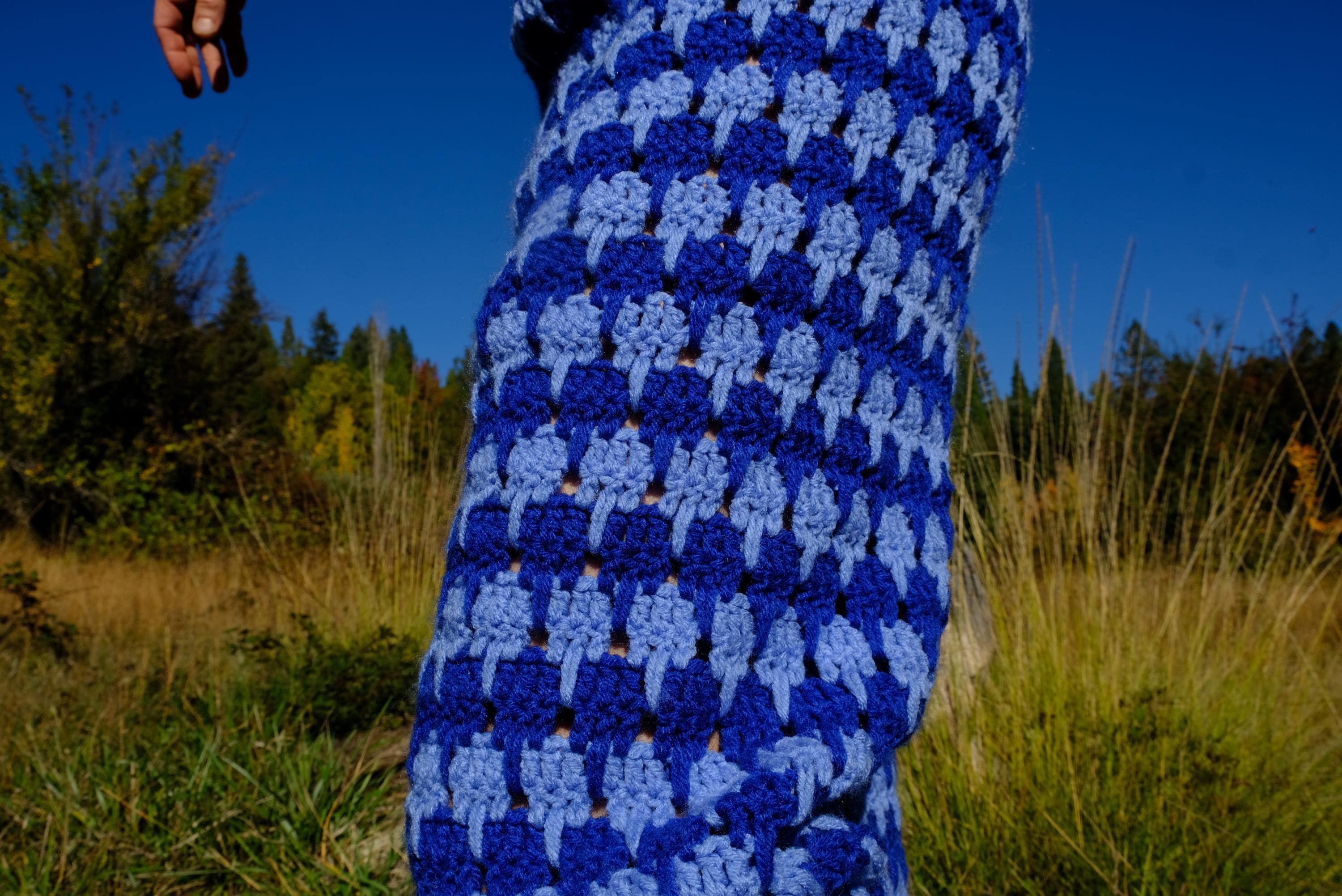 These are crochet pants in 2 tone light and navy blue. Fashioned from a vintage afghan blanket crocheted in 100% acrylic yarn.
