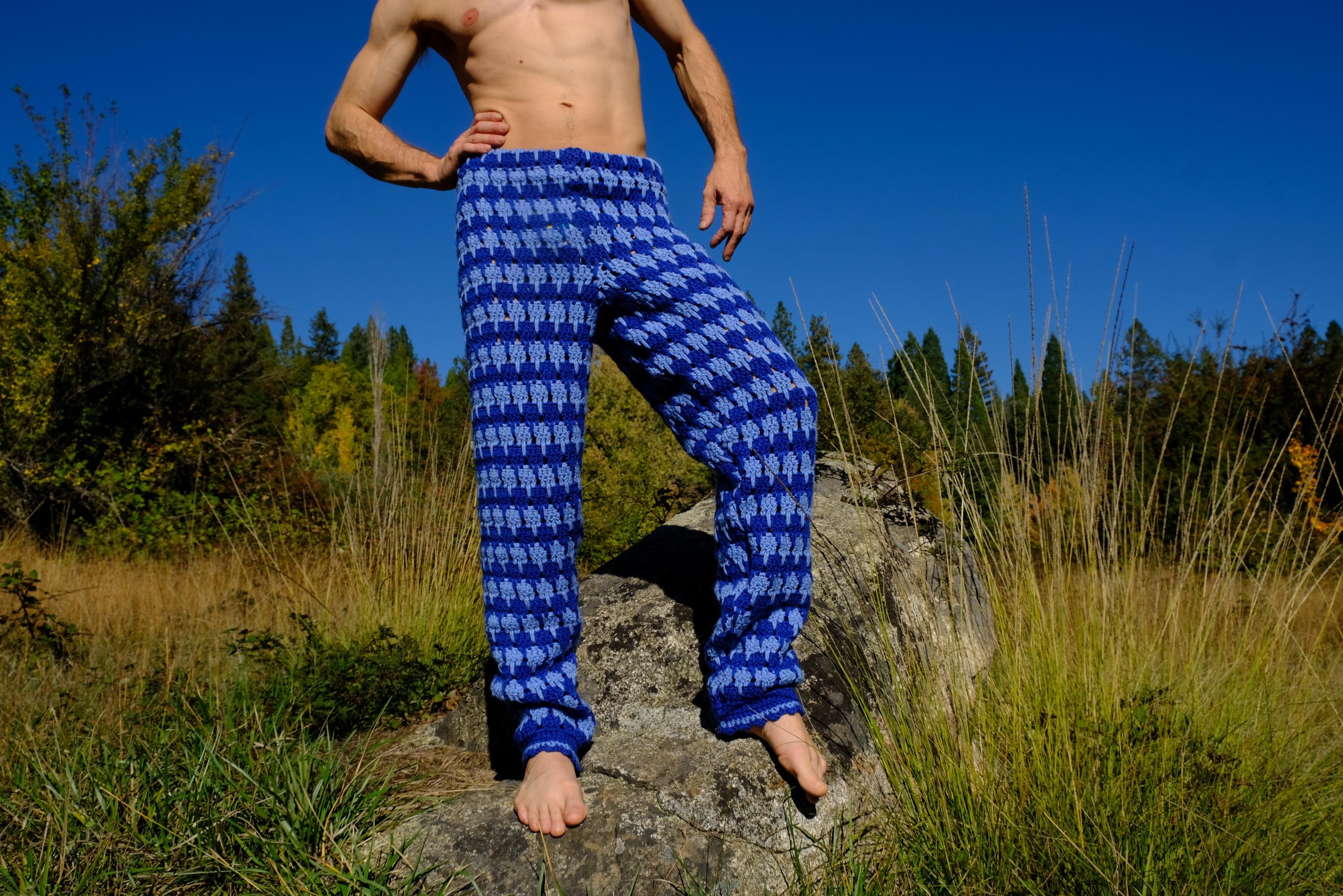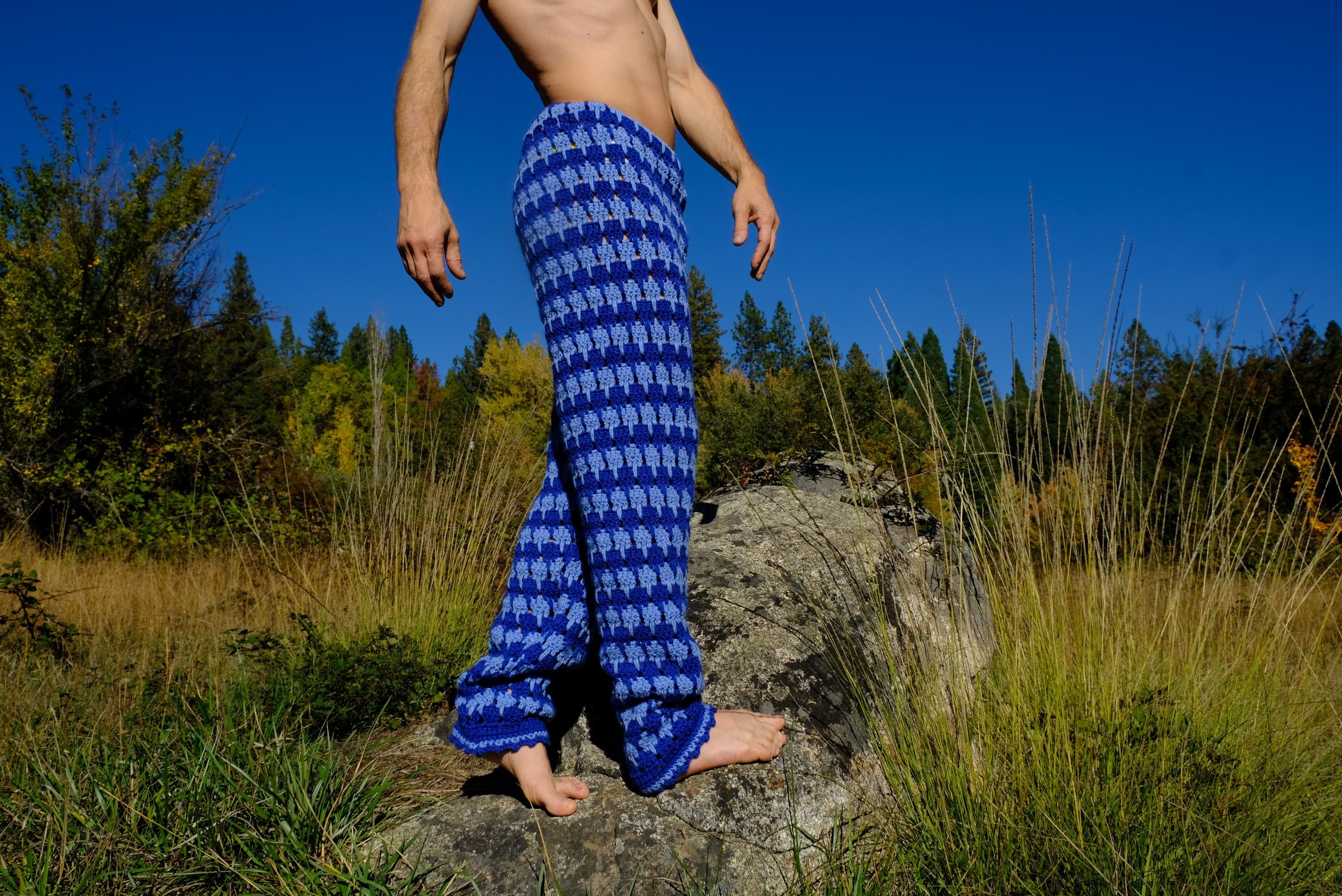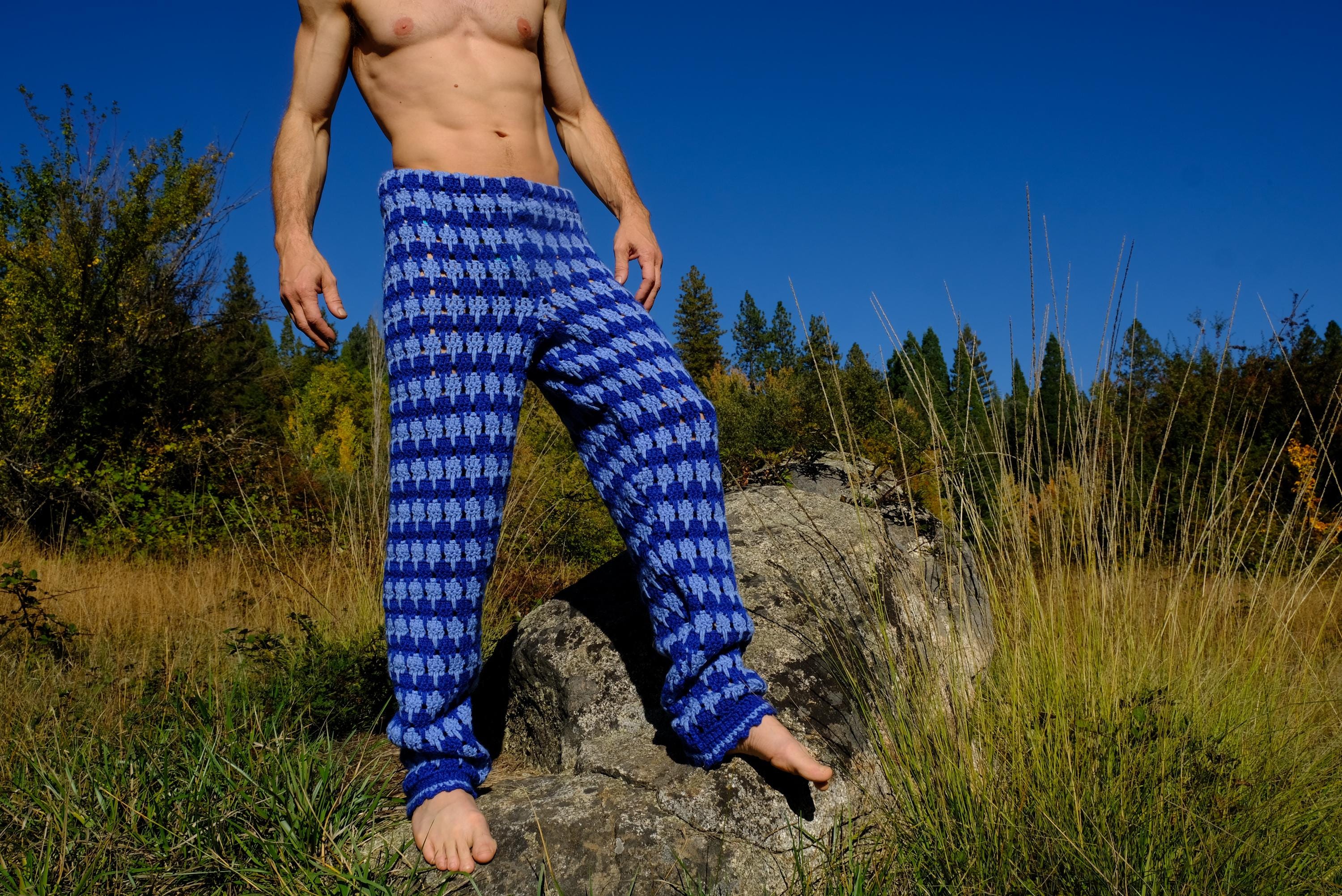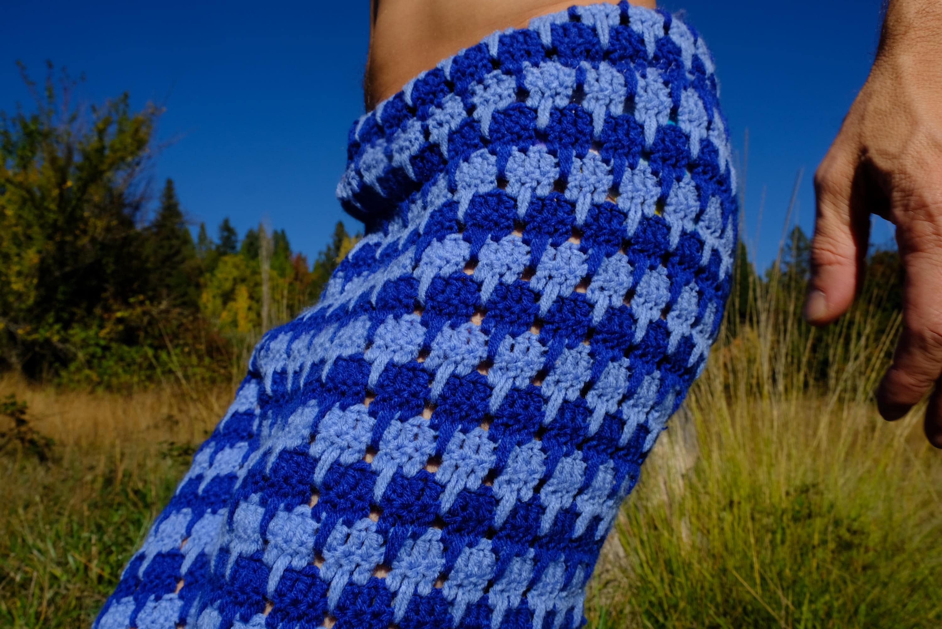 These are crochet pants in 2 tone light and navy blue. Fashioned from a vintage afghan blanket crocheted in 100% acrylic yarn.
