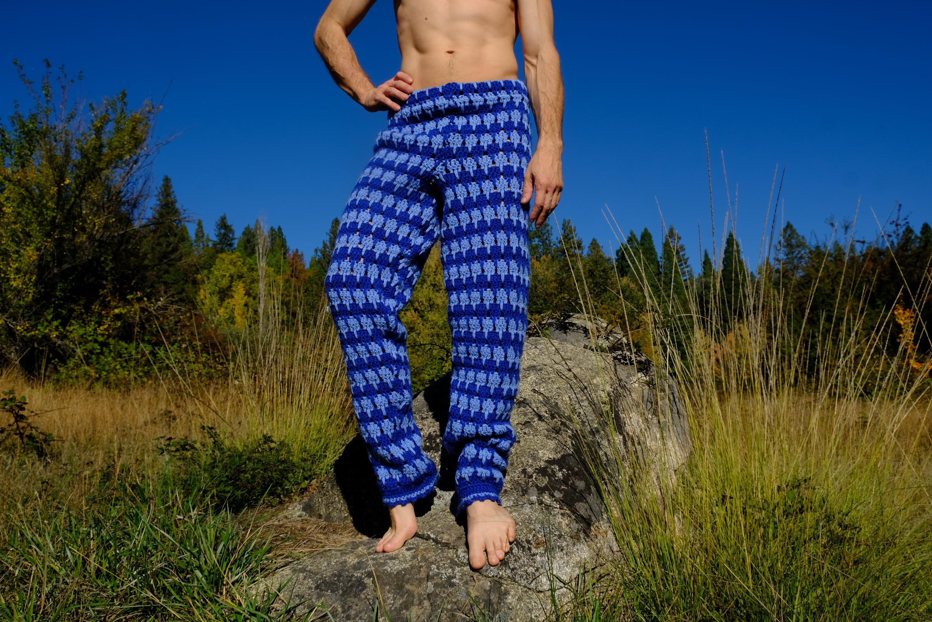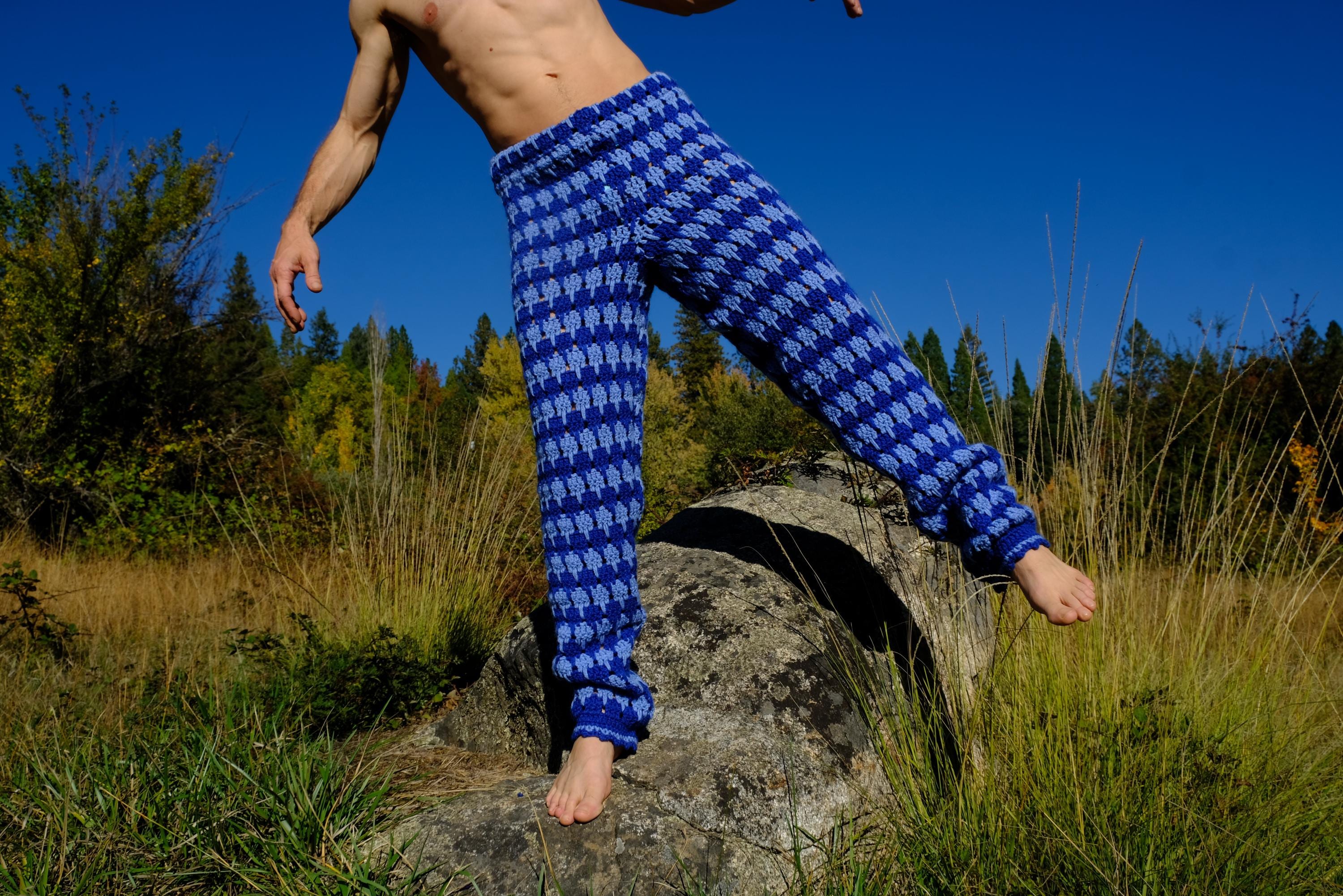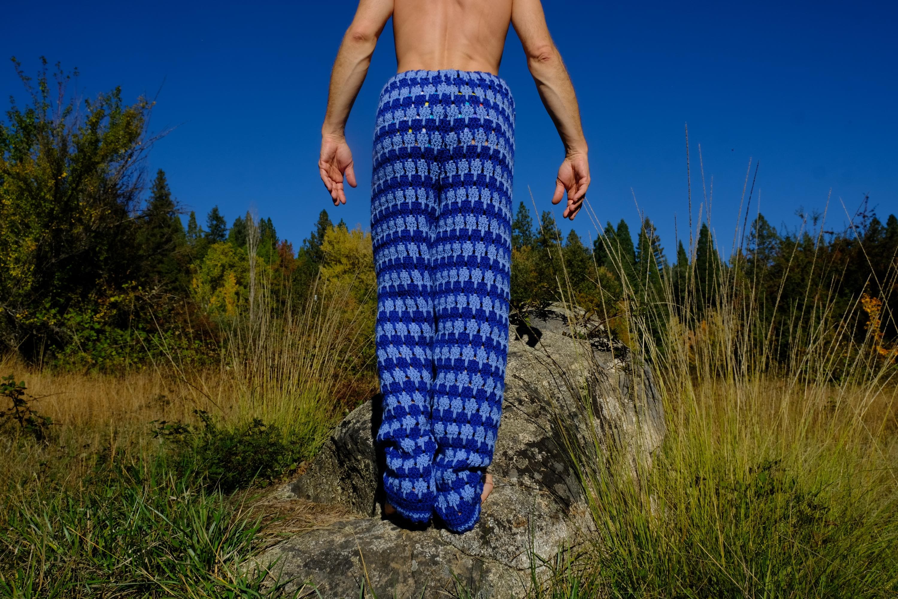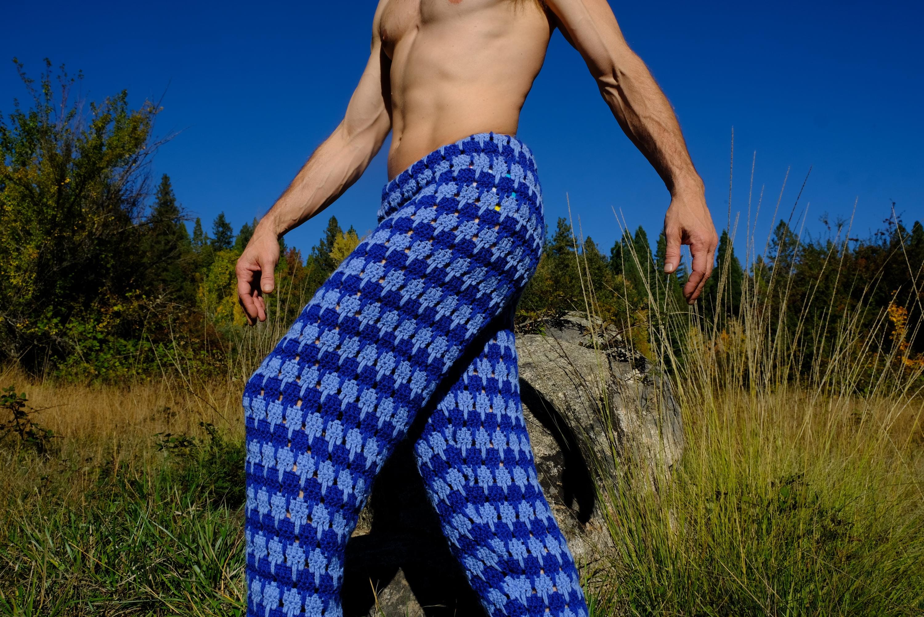 These are crochet pants in 2 tone light and navy blue. Fashioned from a vintage afghan blanket crocheted in 100% acrylic yarn.