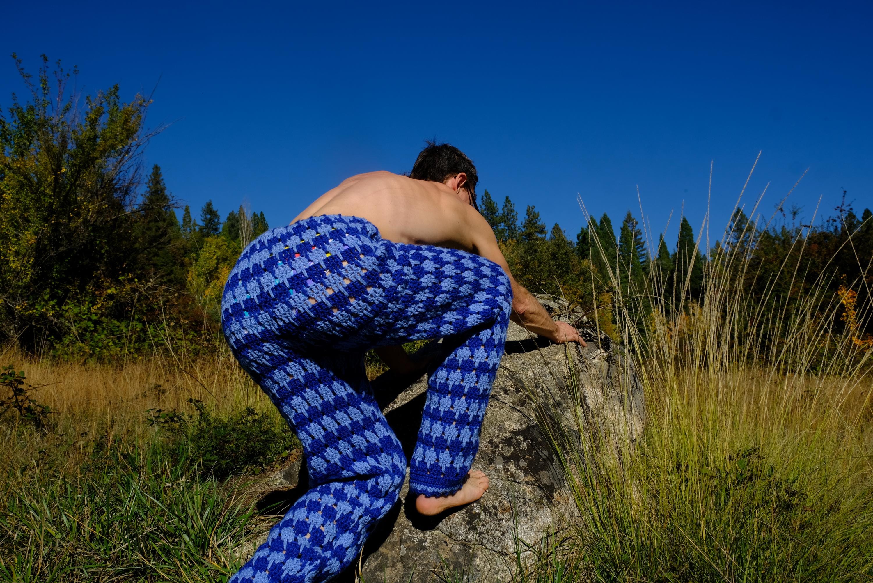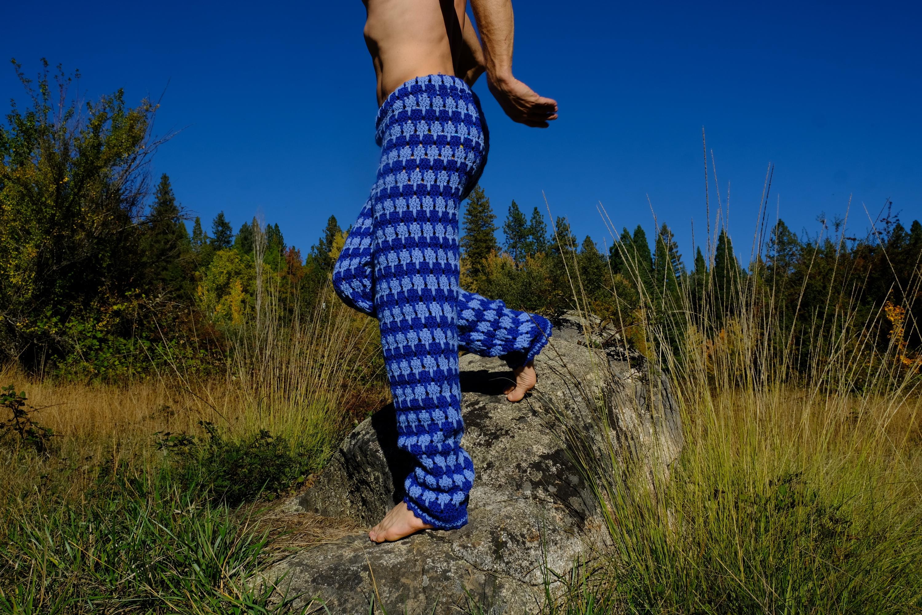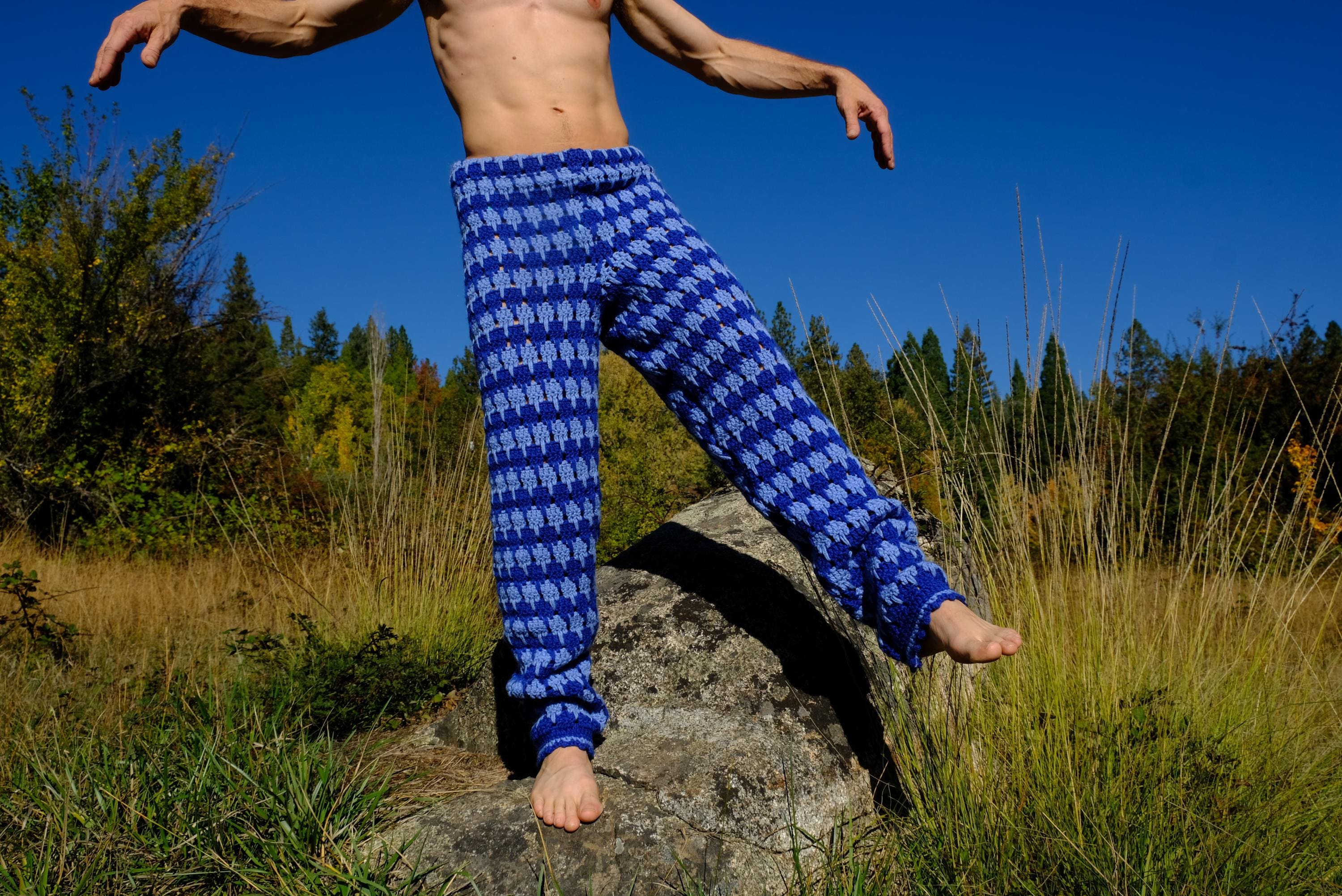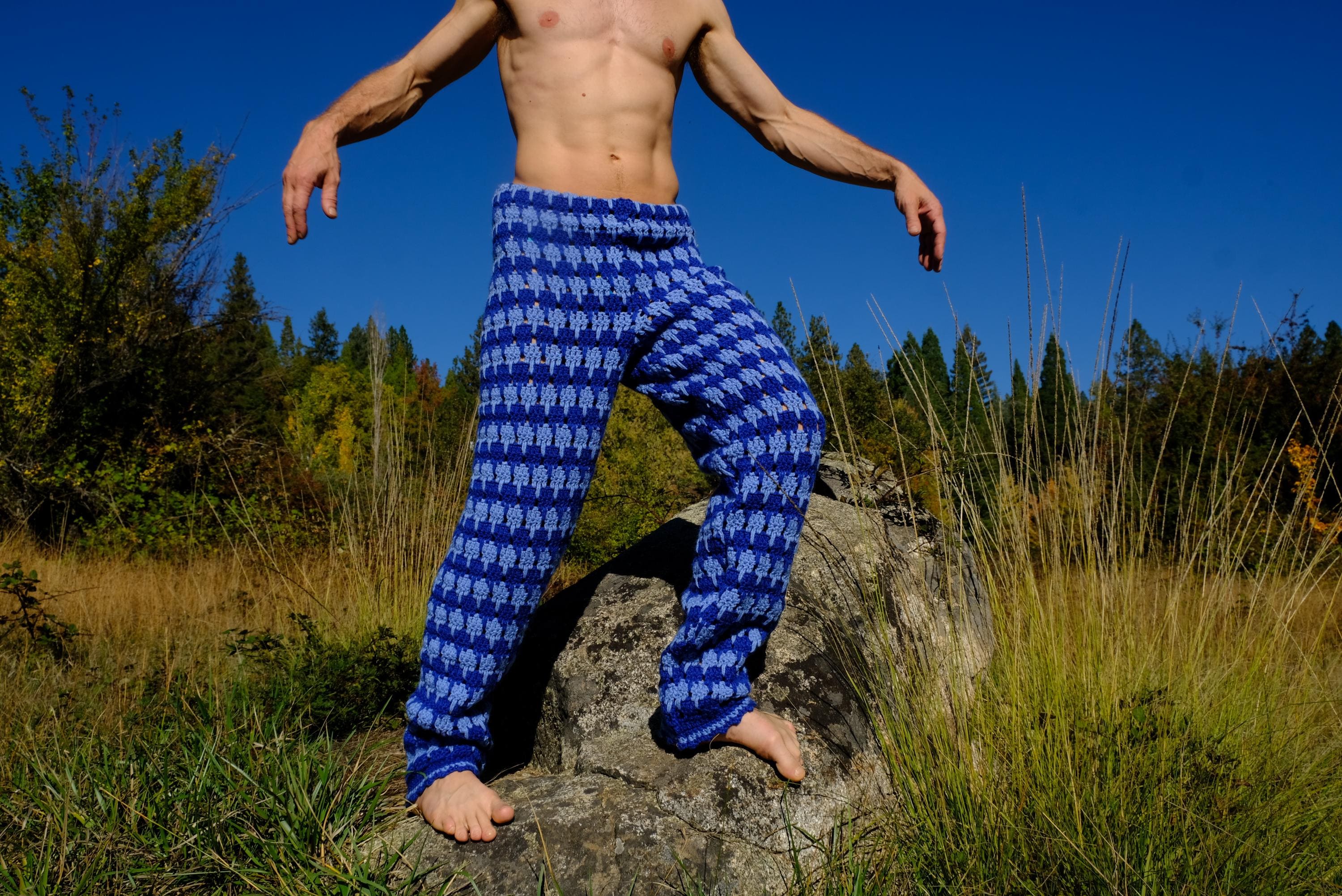 These are crochet pants in 2 tone light and navy blue. Fashioned from a vintage afghan blanket crocheted in 100% acrylic yarn.