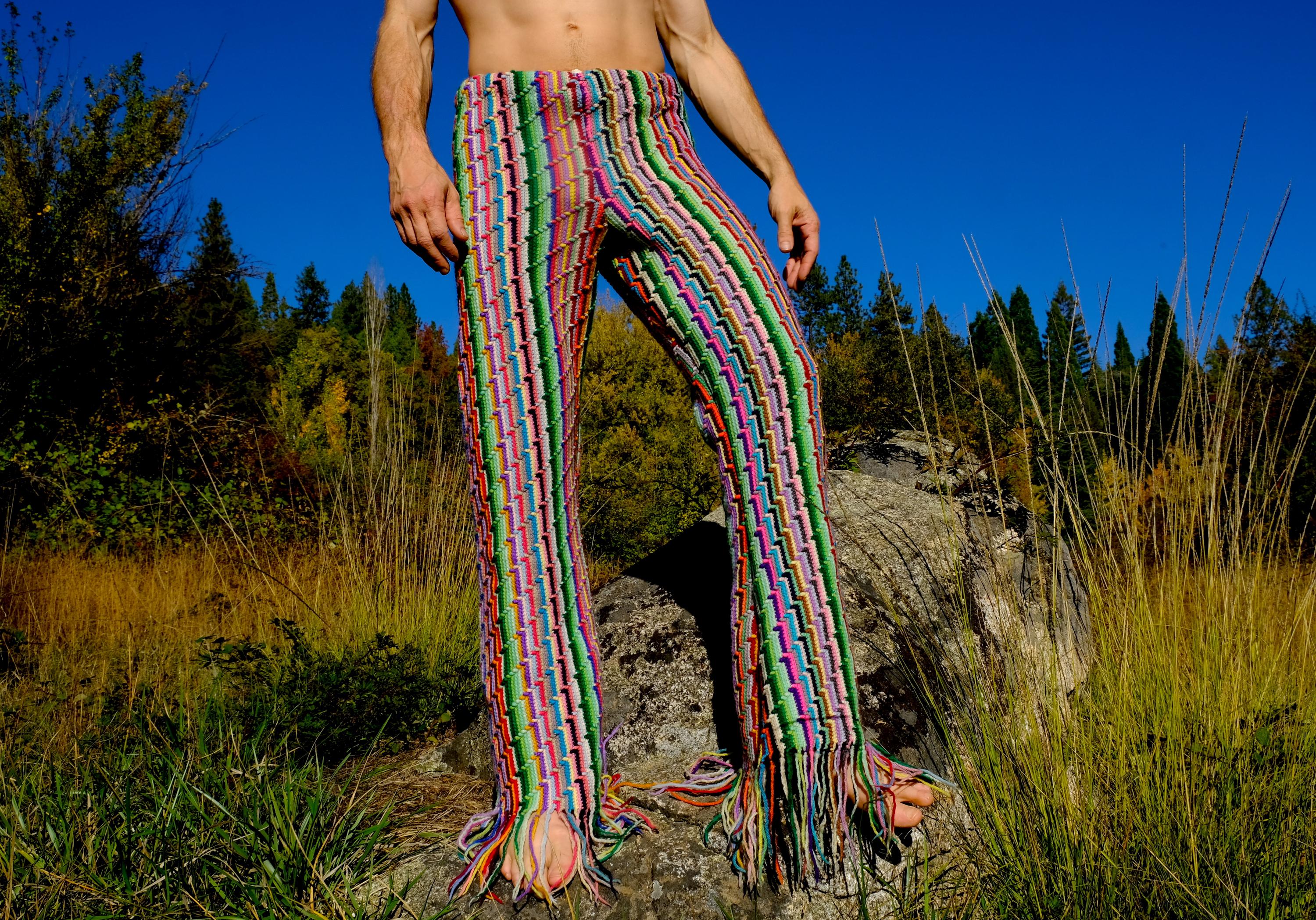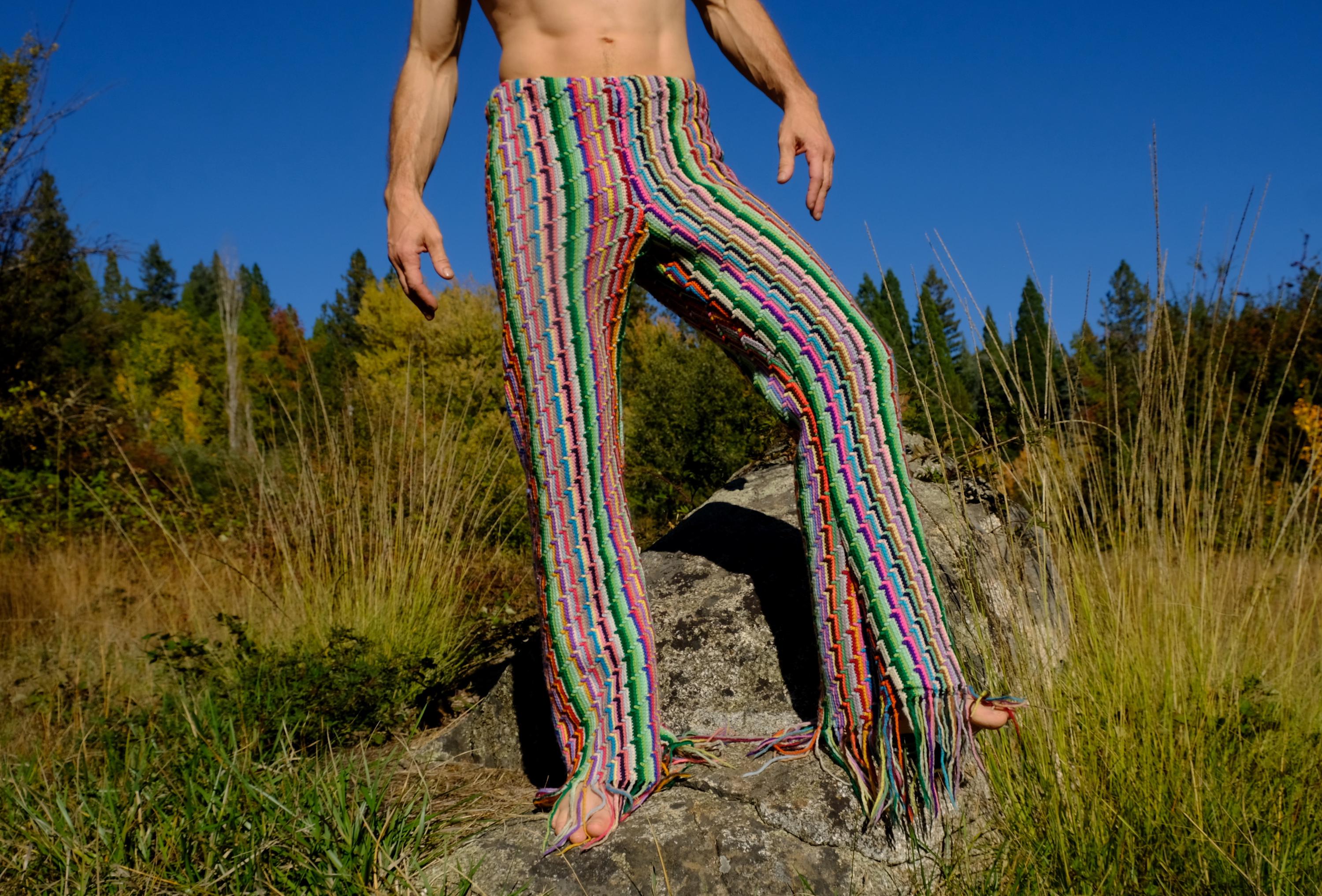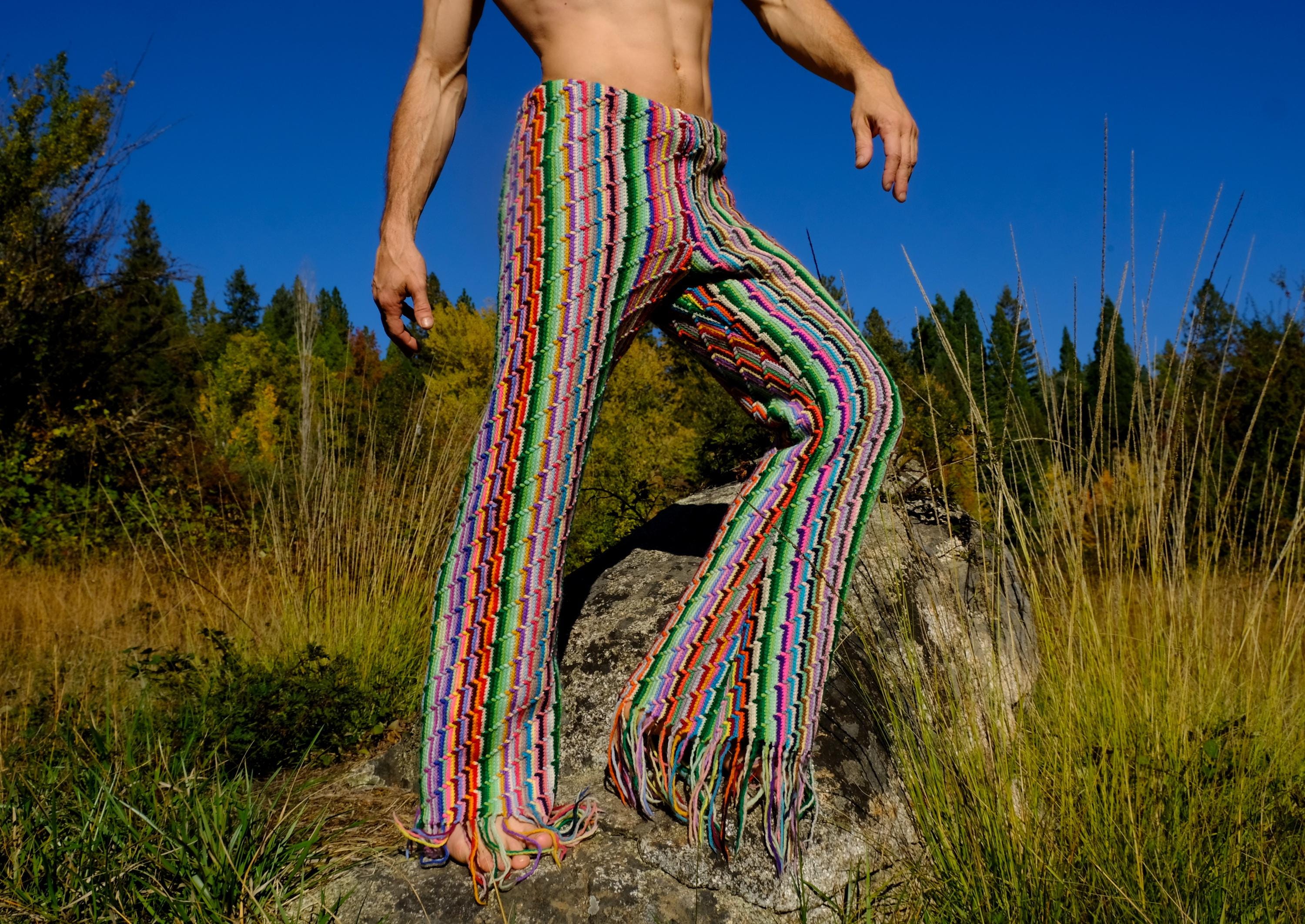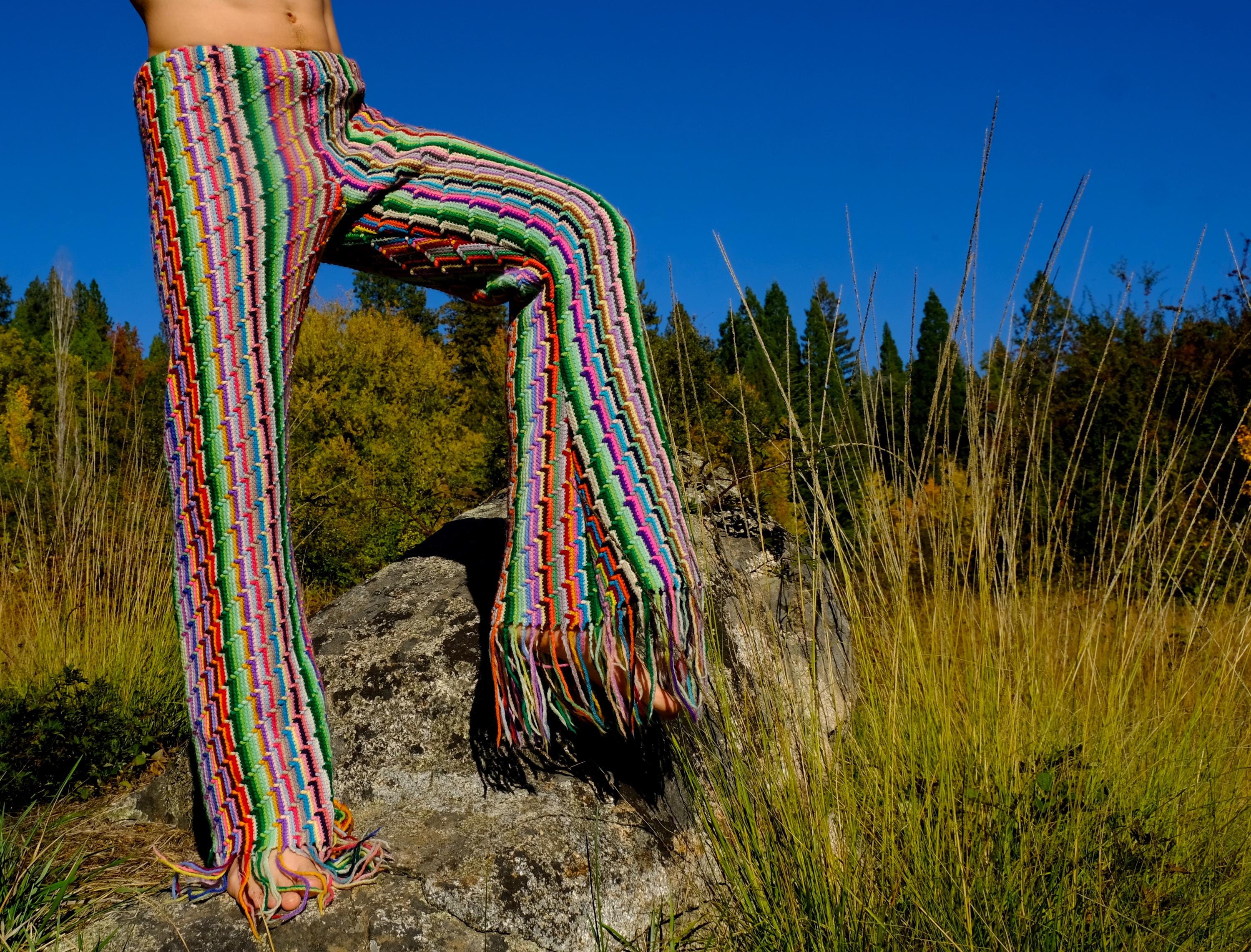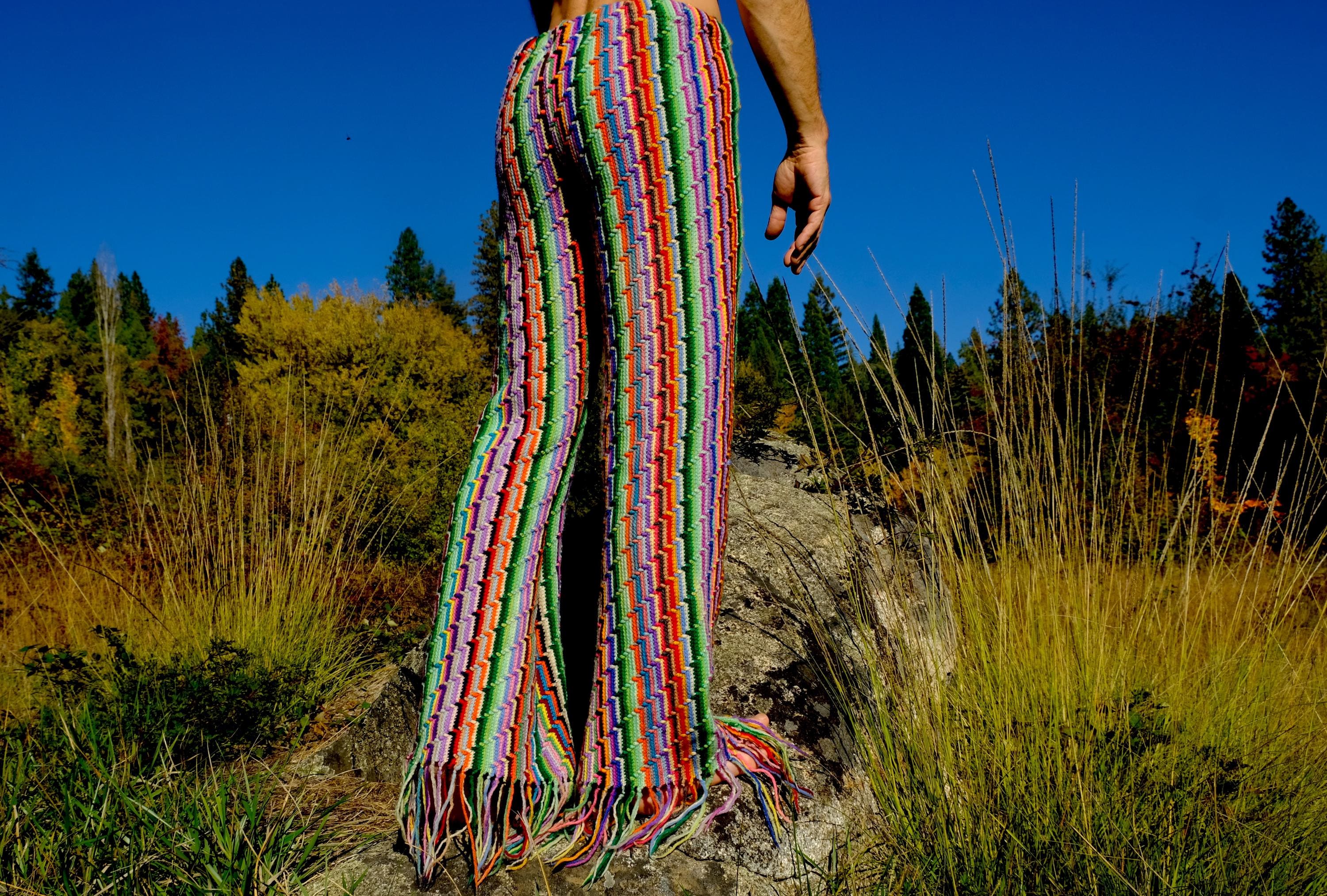 These are crochet pants with multicolor stripes and fringe at the ankles. Fashioned from a vintage afghan blanket crocheted in 100% wool.