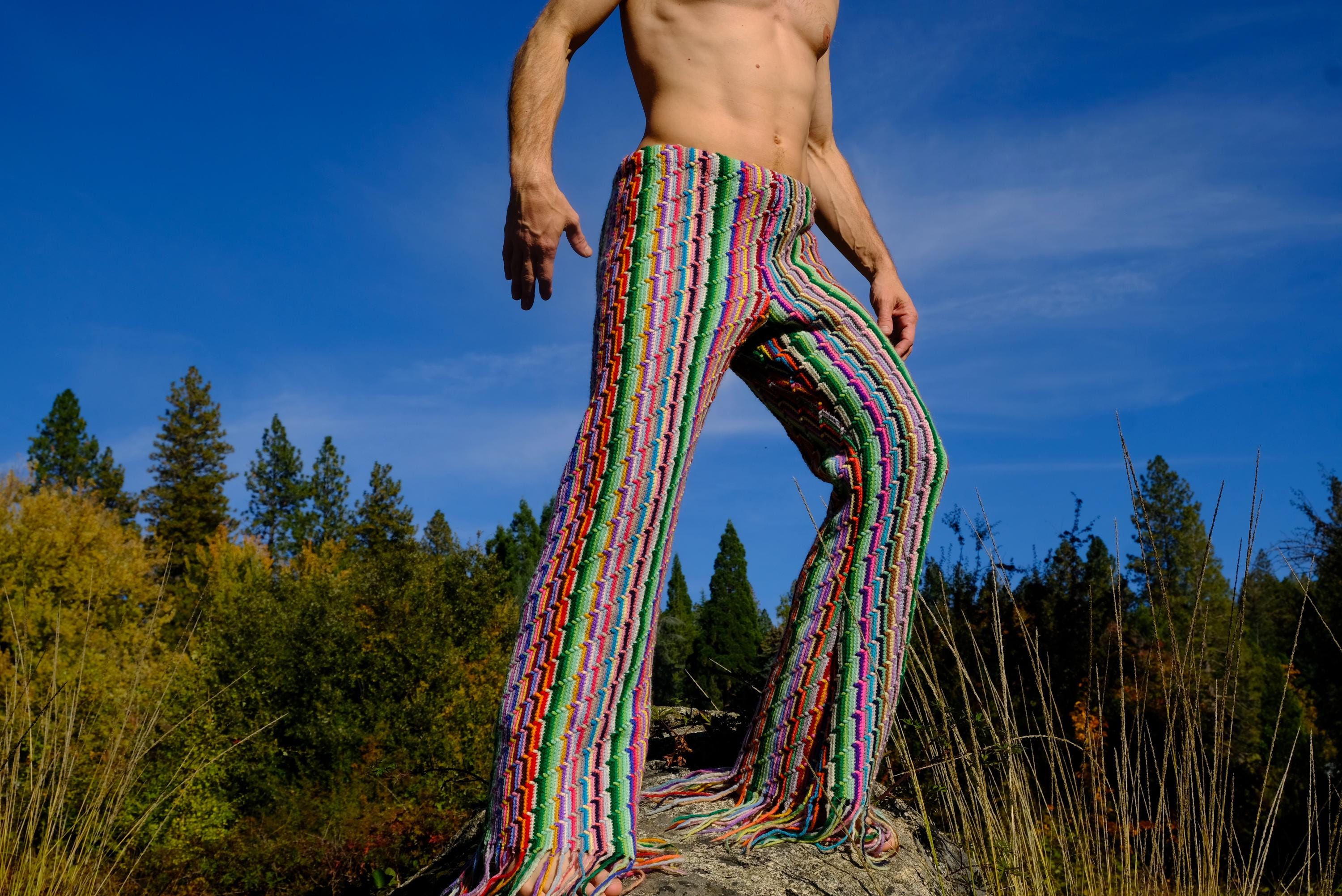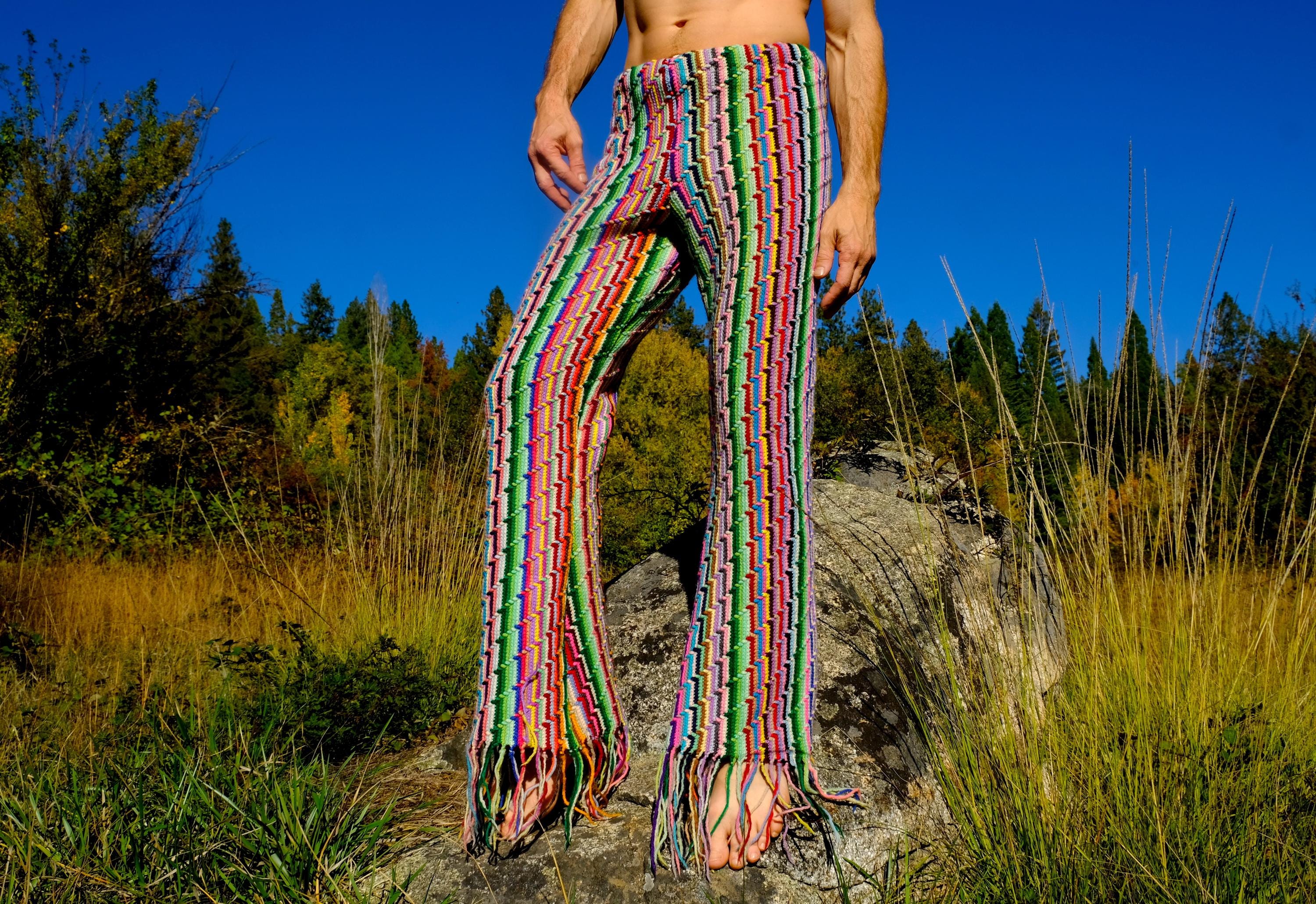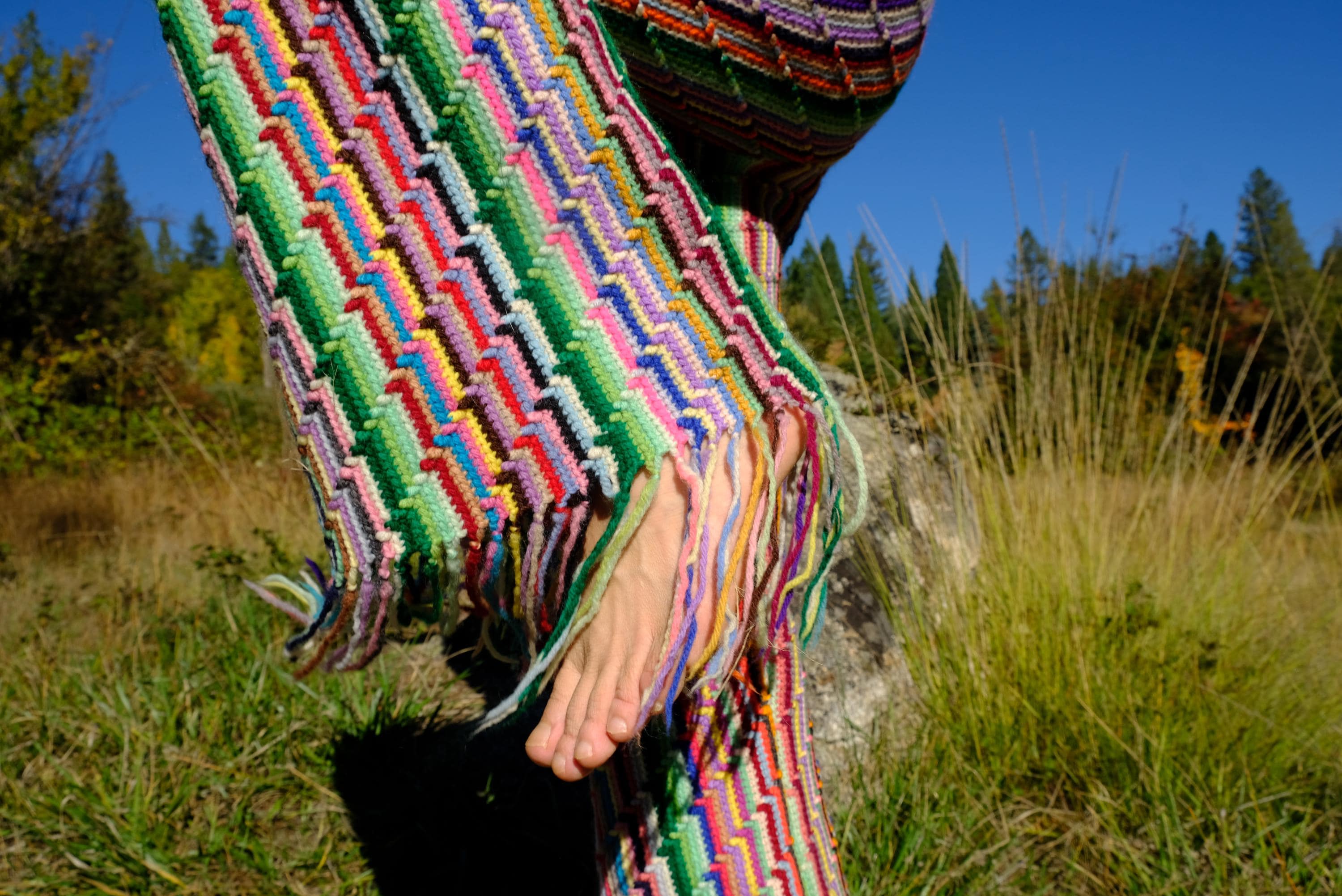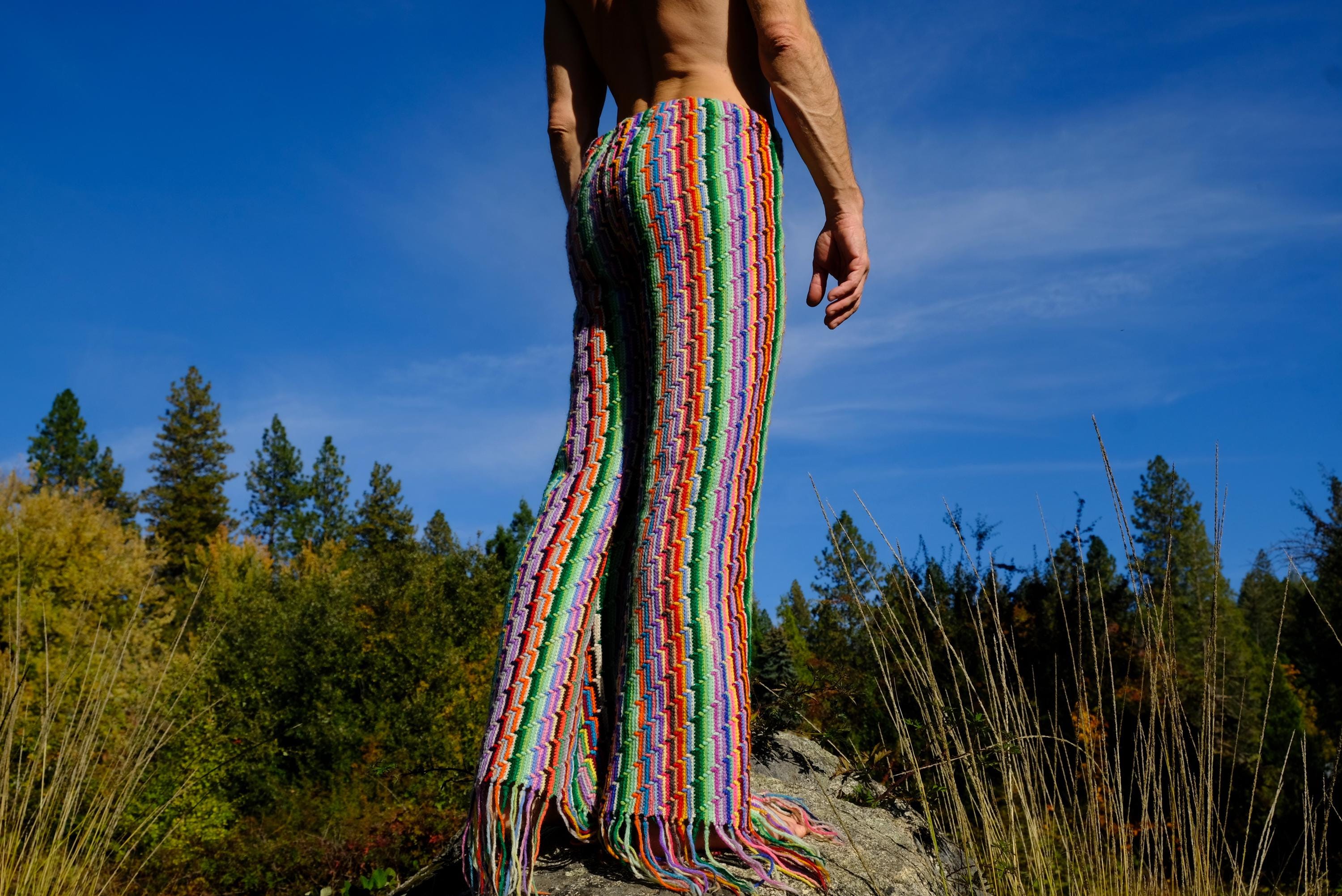 These are crochet pants with multicolor stripes and fringe at the ankles. Fashioned from a vintage afghan blanket crocheted in 100% wool.