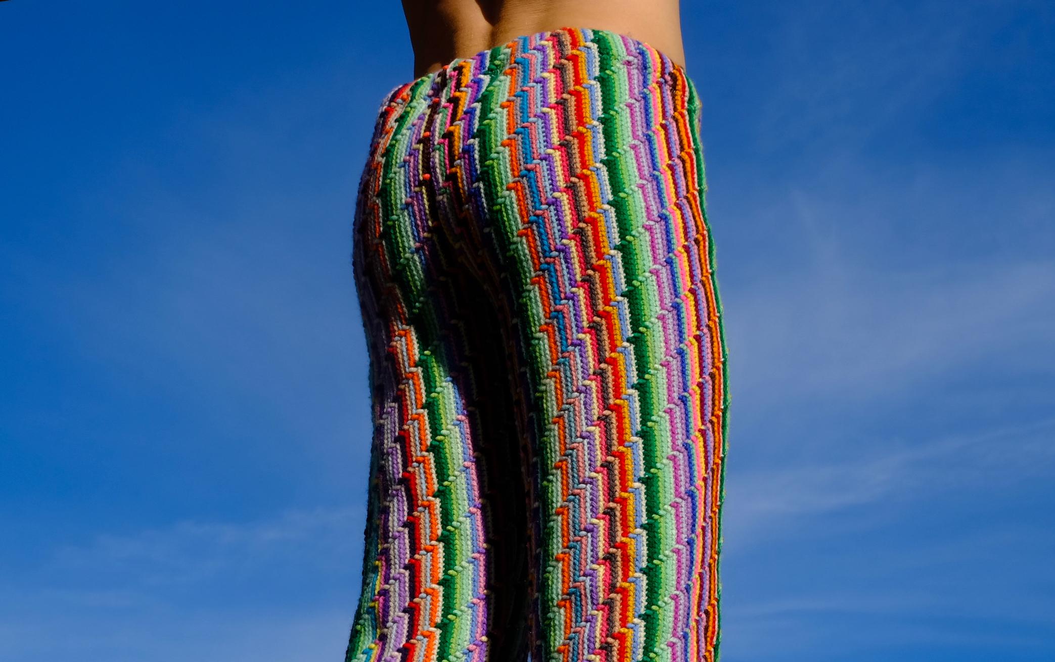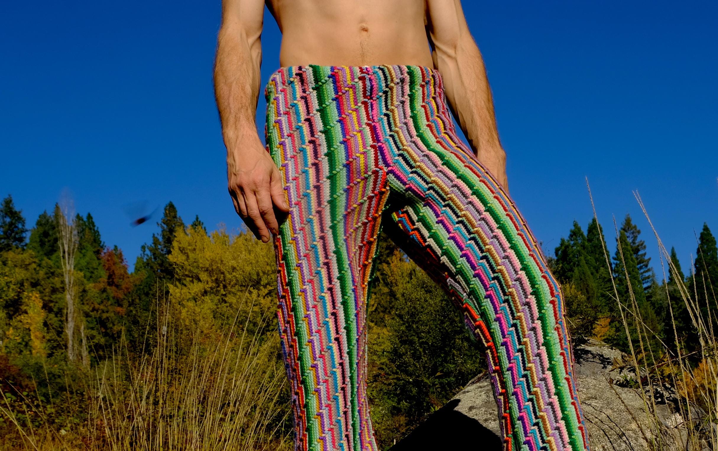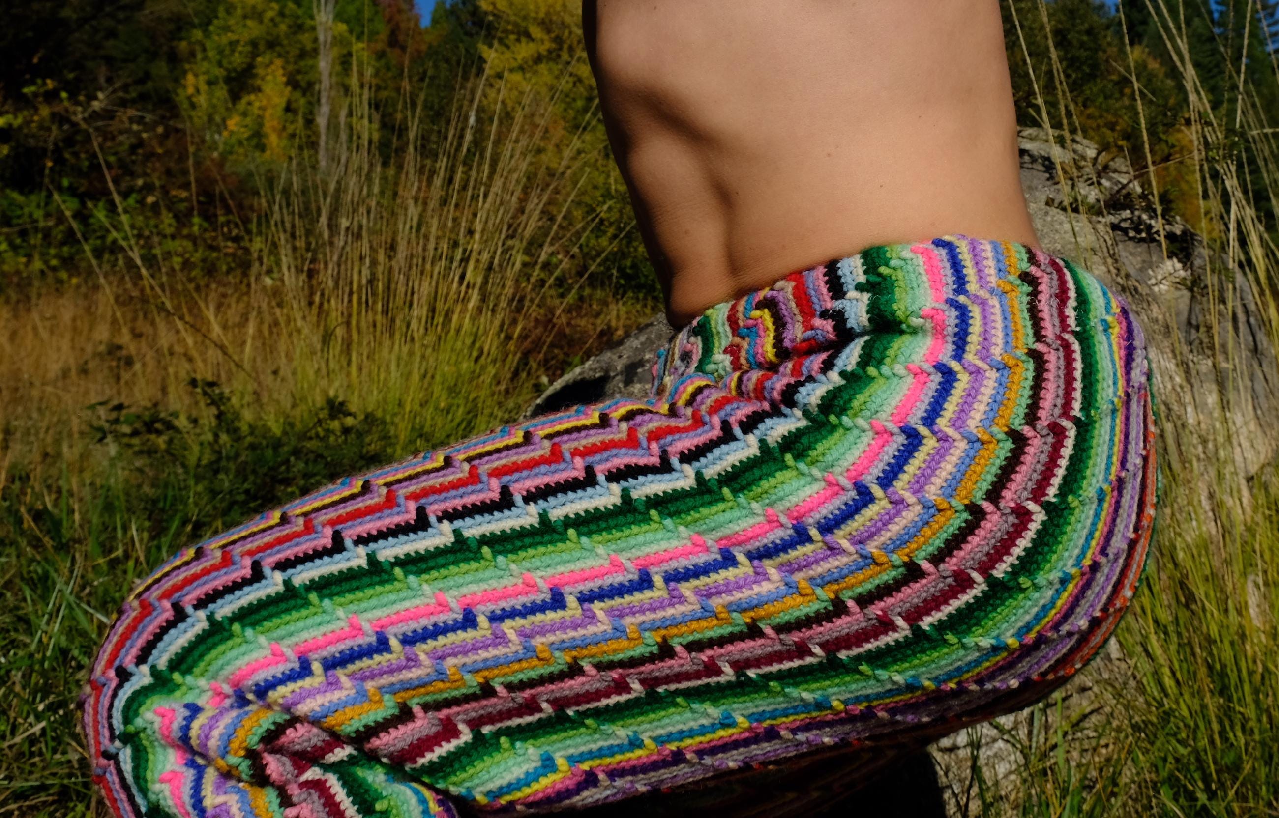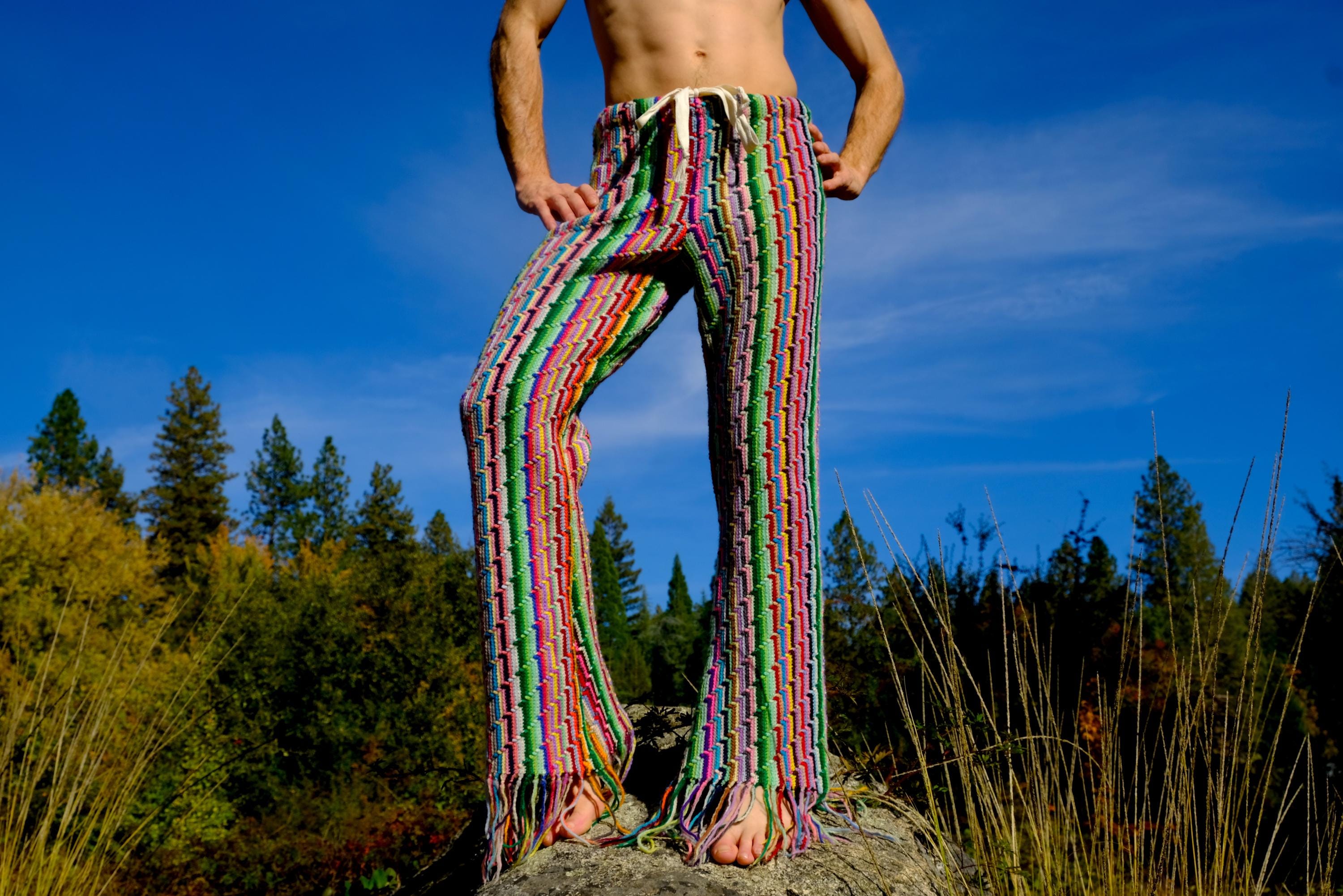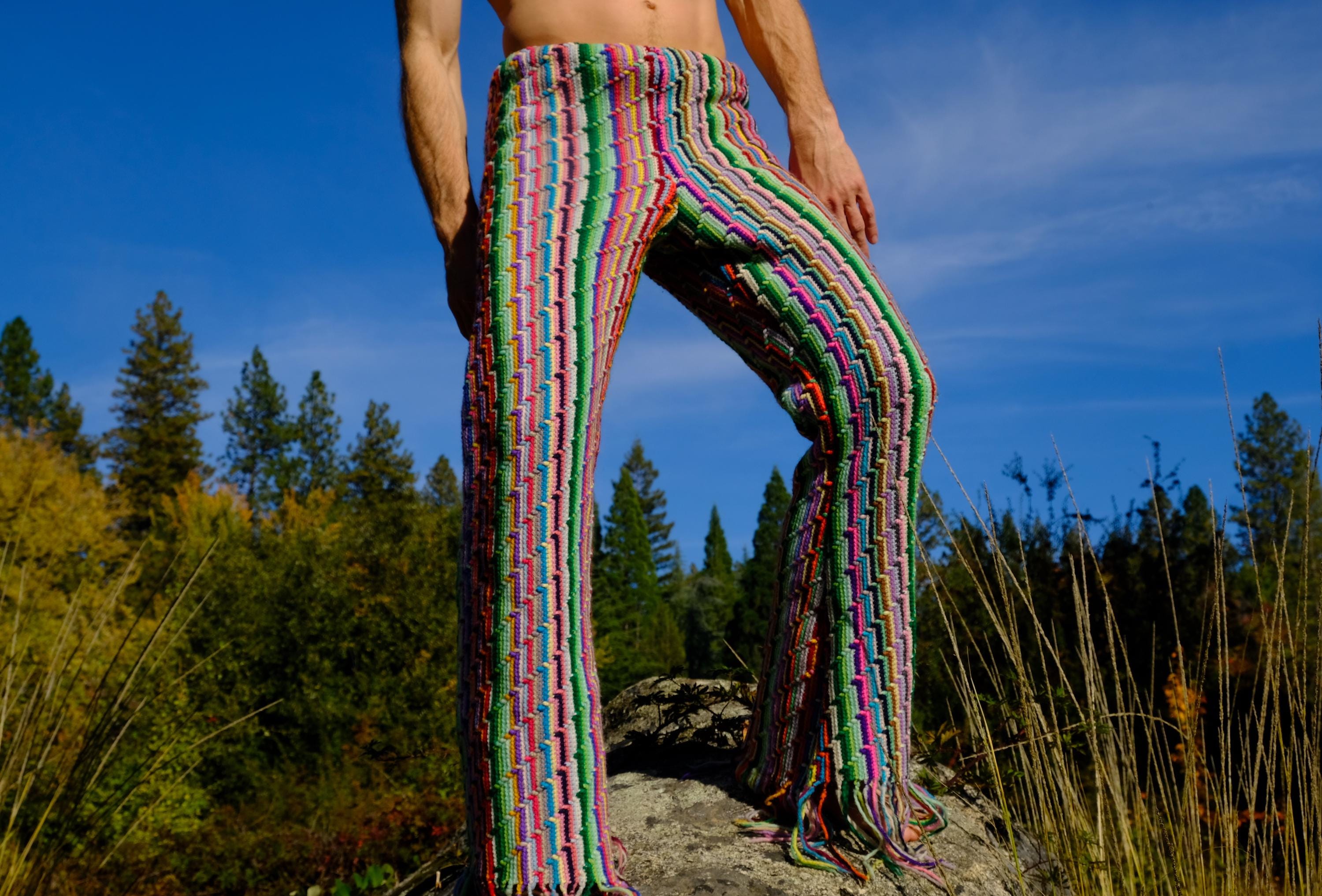 These are crochet pants with multicolor stripes and fringe at the ankles. Fashioned from a vintage afghan blanket crocheted in 100% wool.