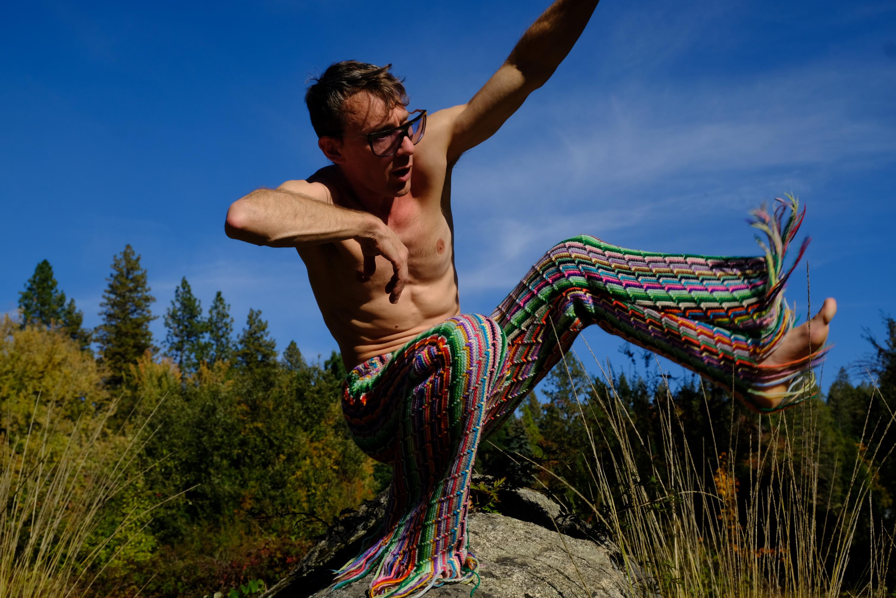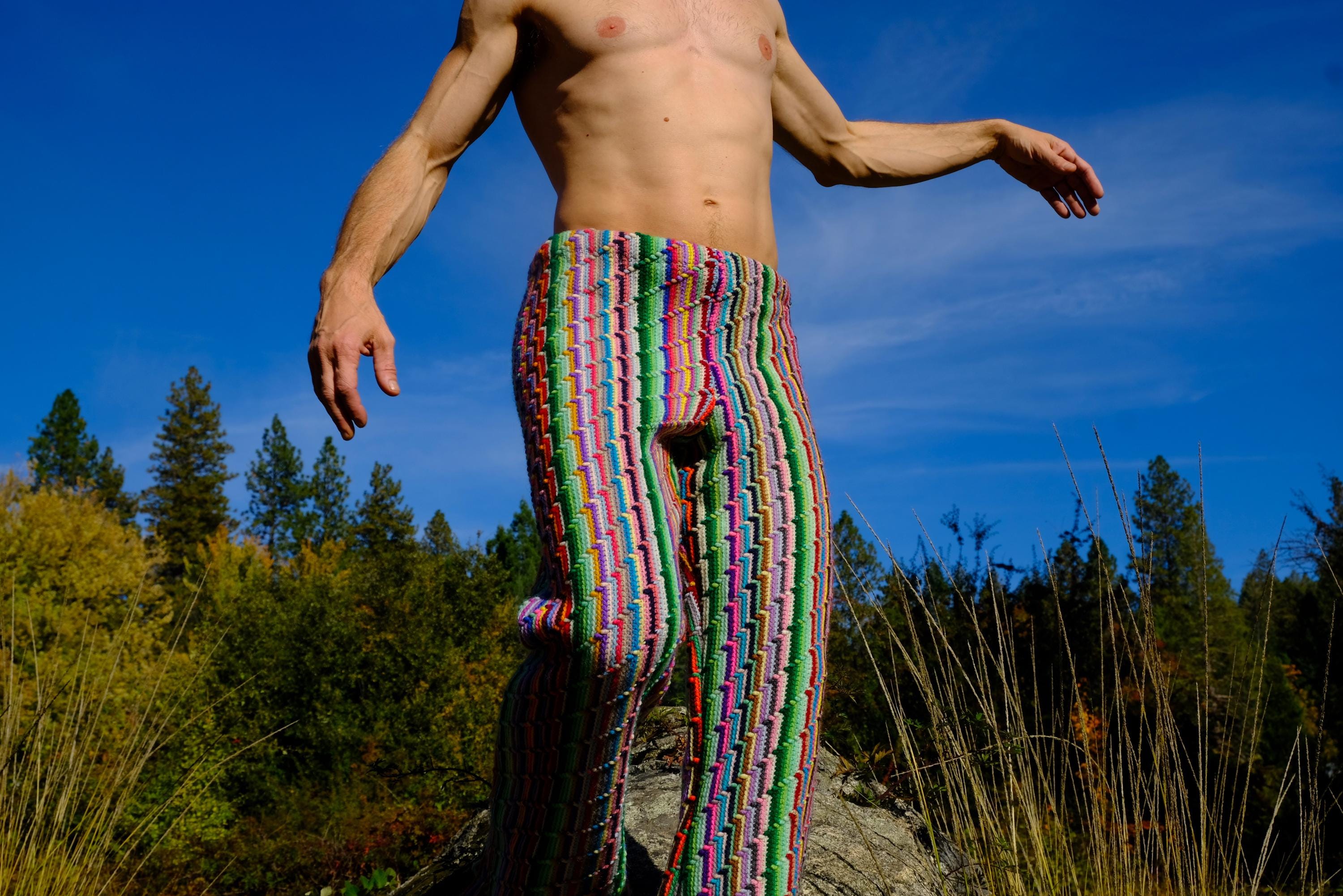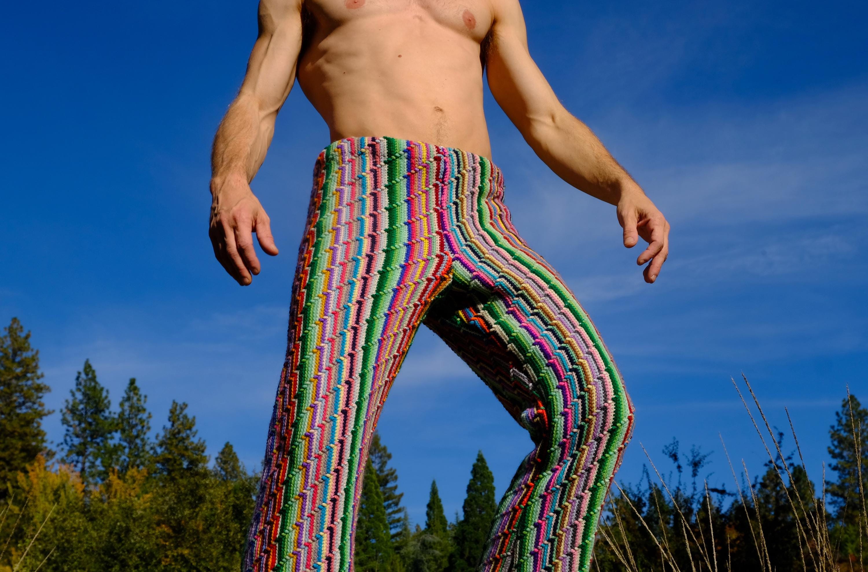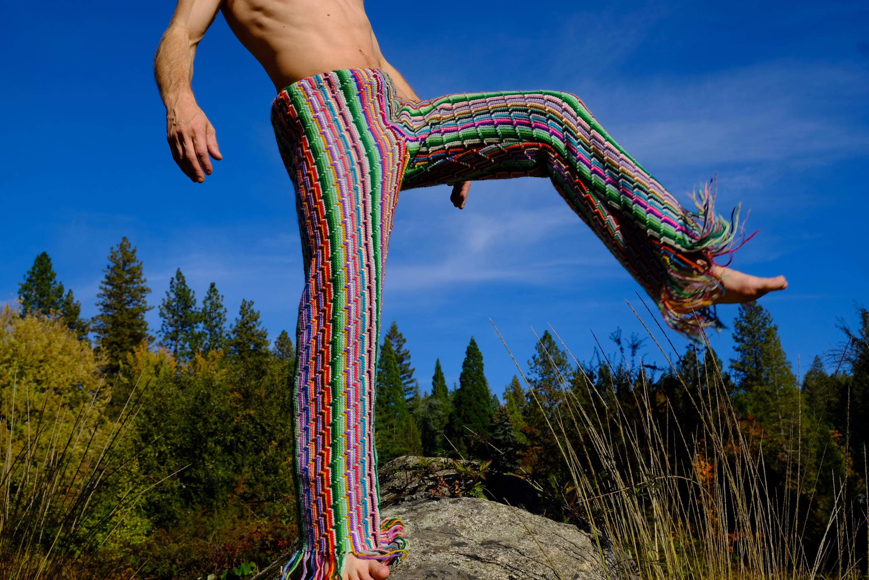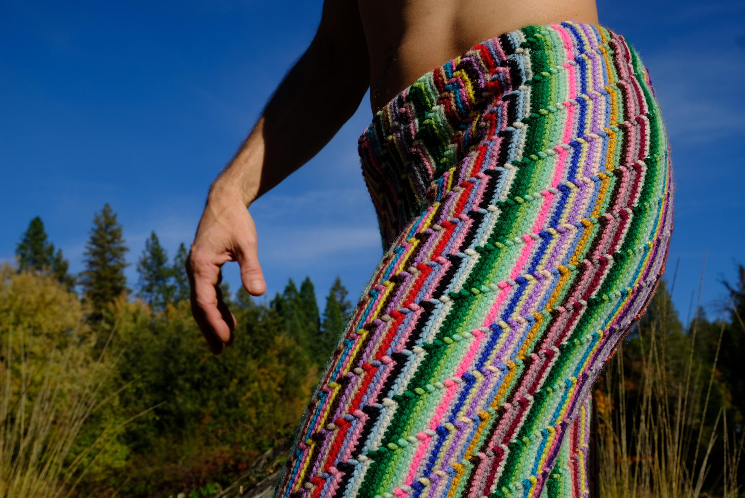 These are crochet pants with multicolor stripes and fringe at the ankles. Fashioned from a vintage afghan blanket crocheted in 100% wool.