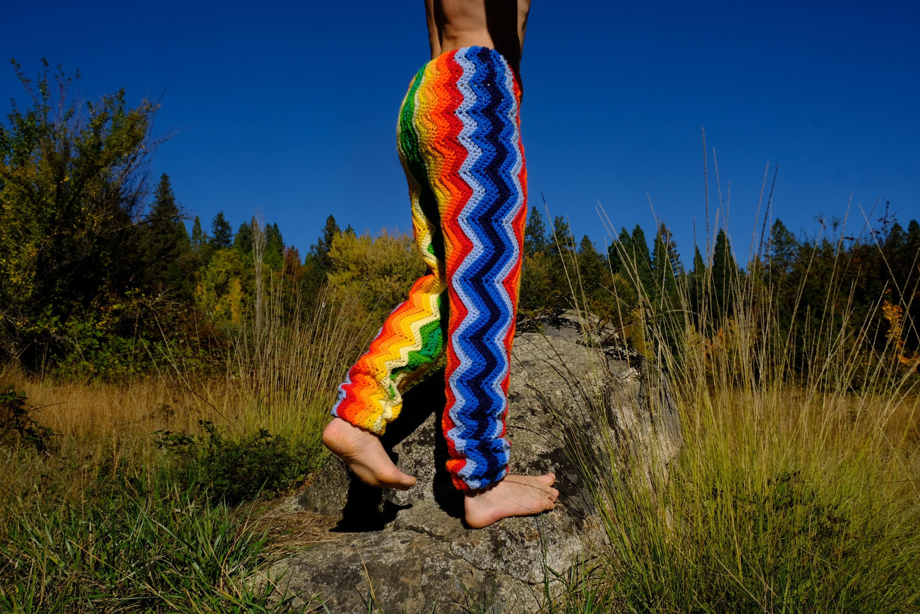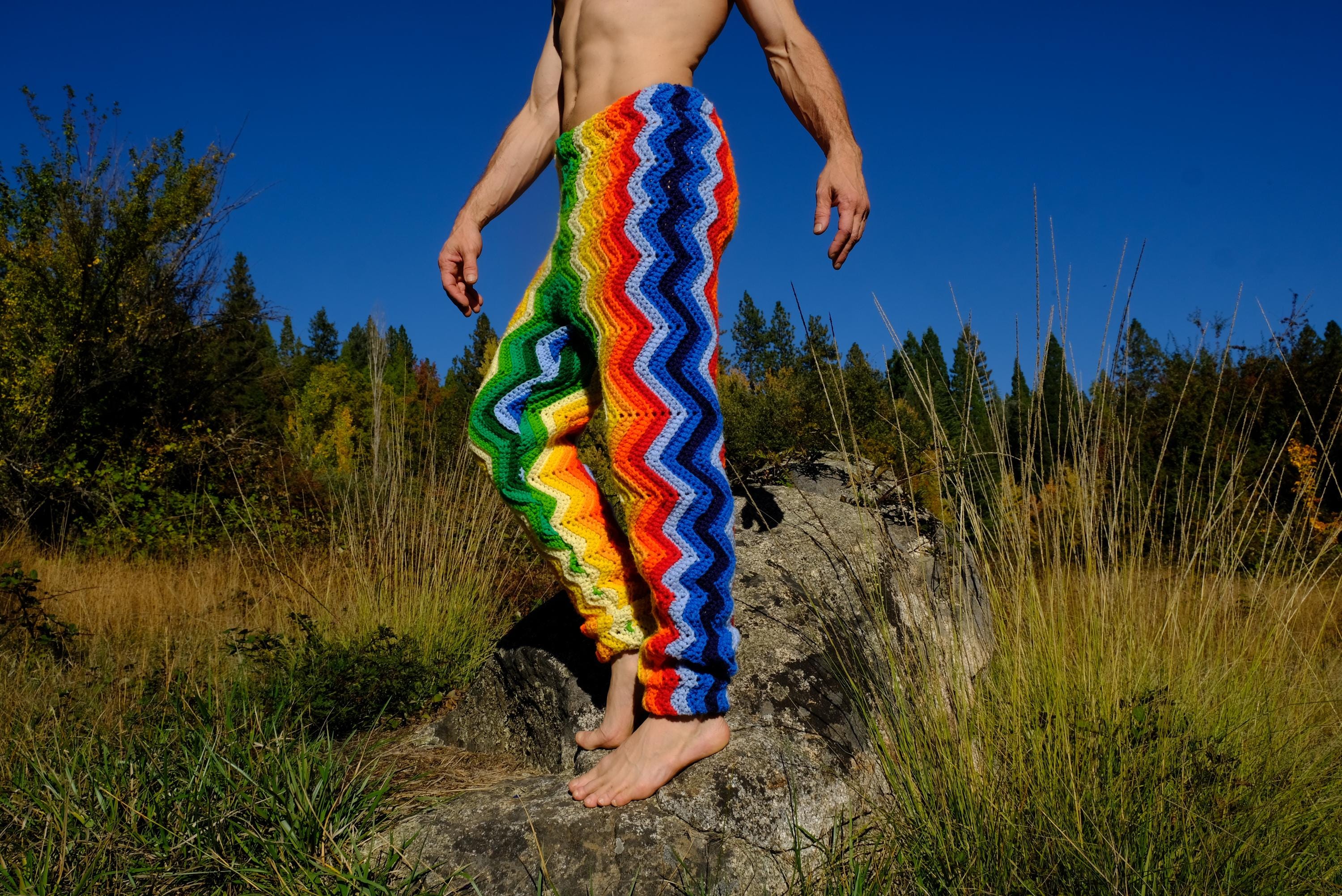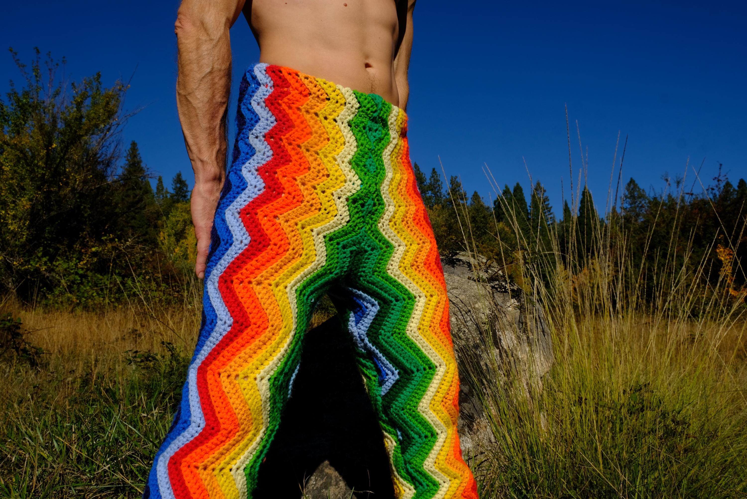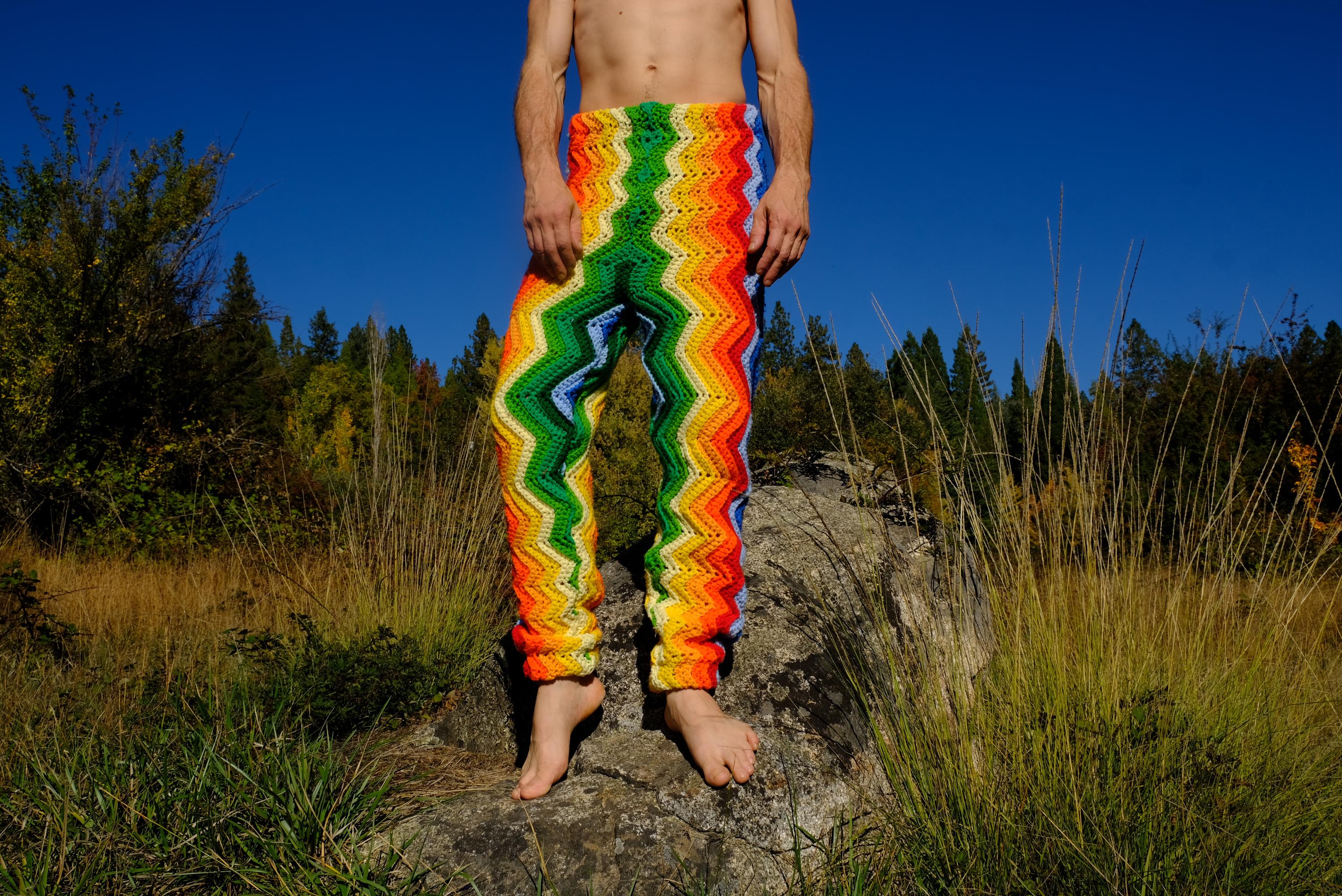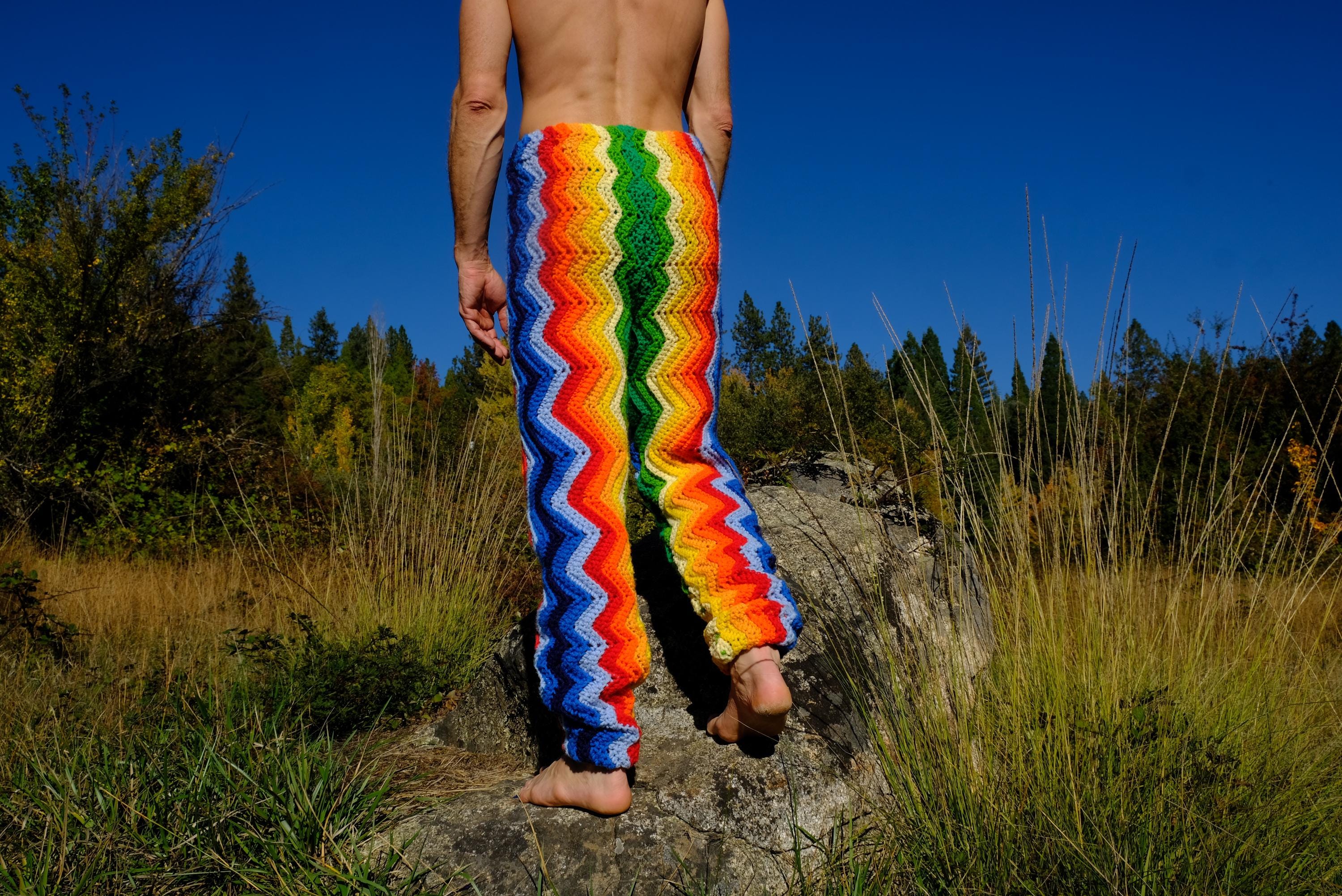 These are crochet pants in rainbow stripes with wide legs tapered at the ankles like sweatpants. Fashioned from a vintage afghan blanket crocheted in 100% acrylic yarn.
