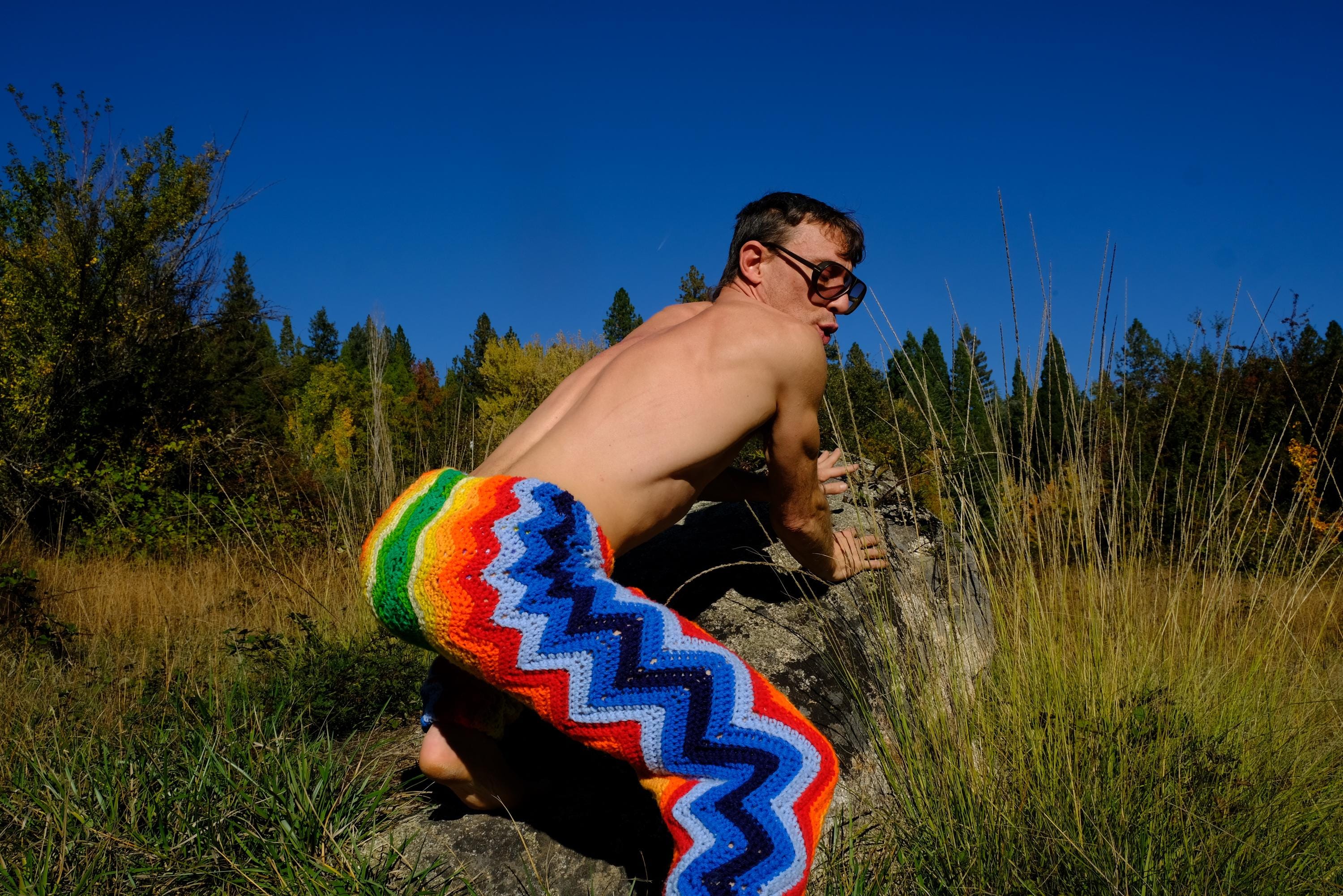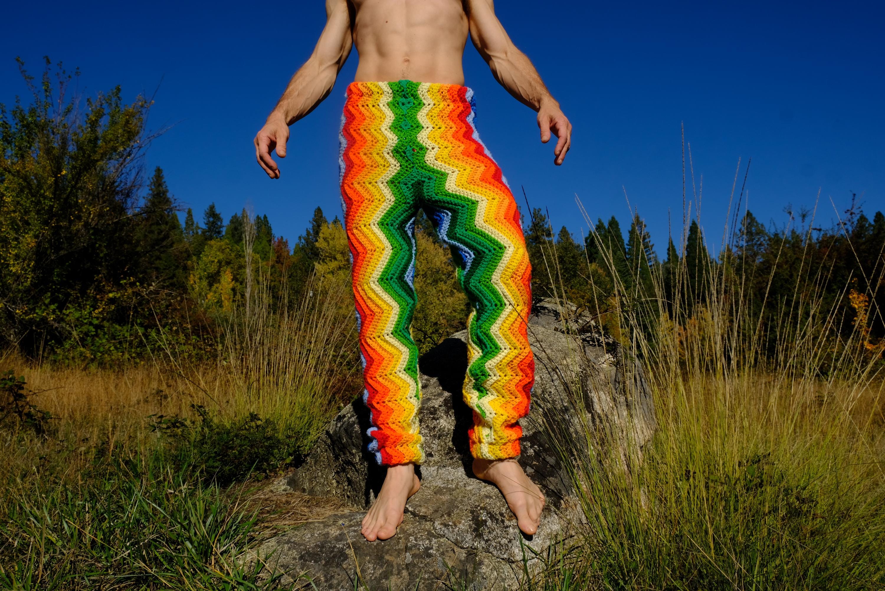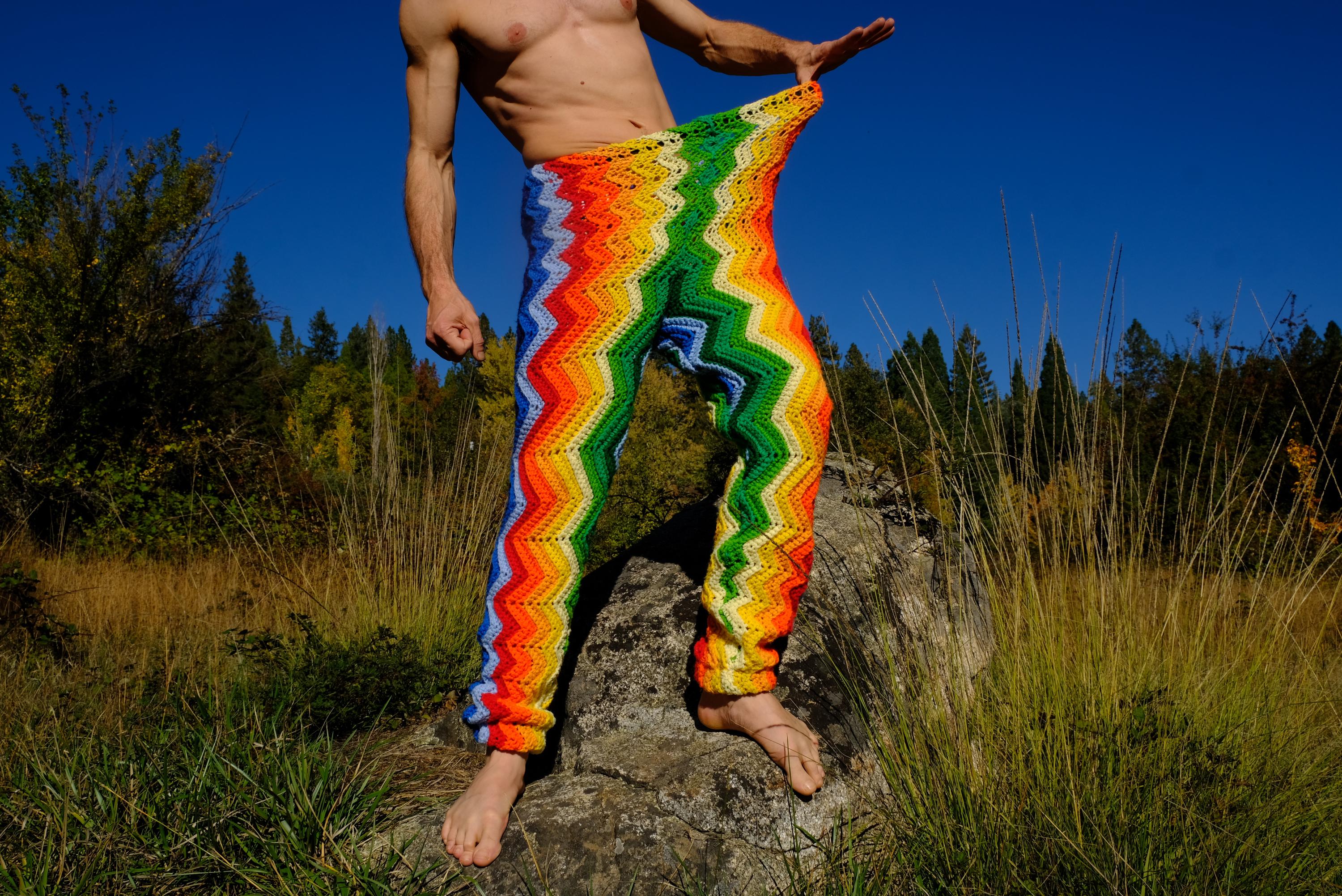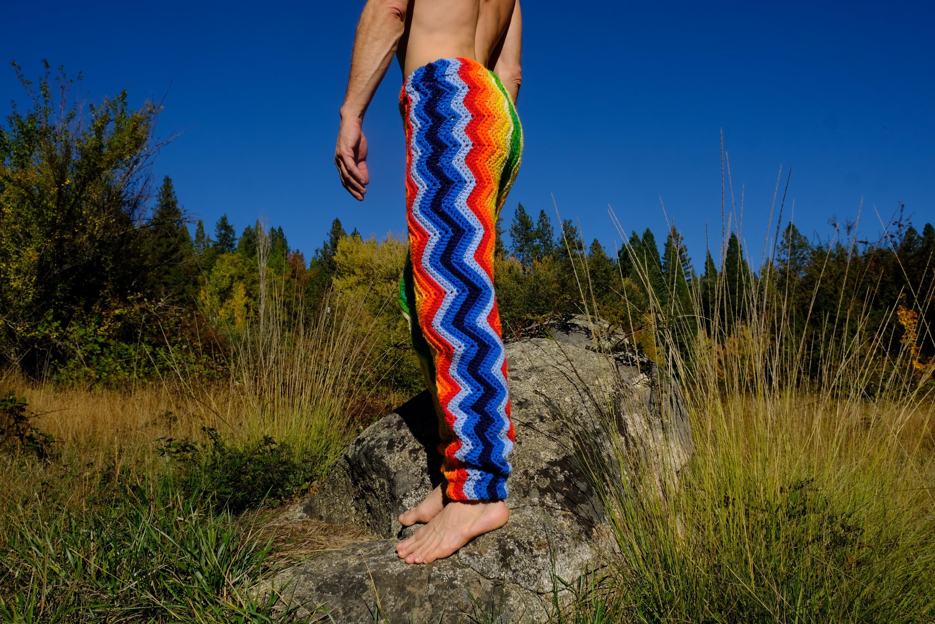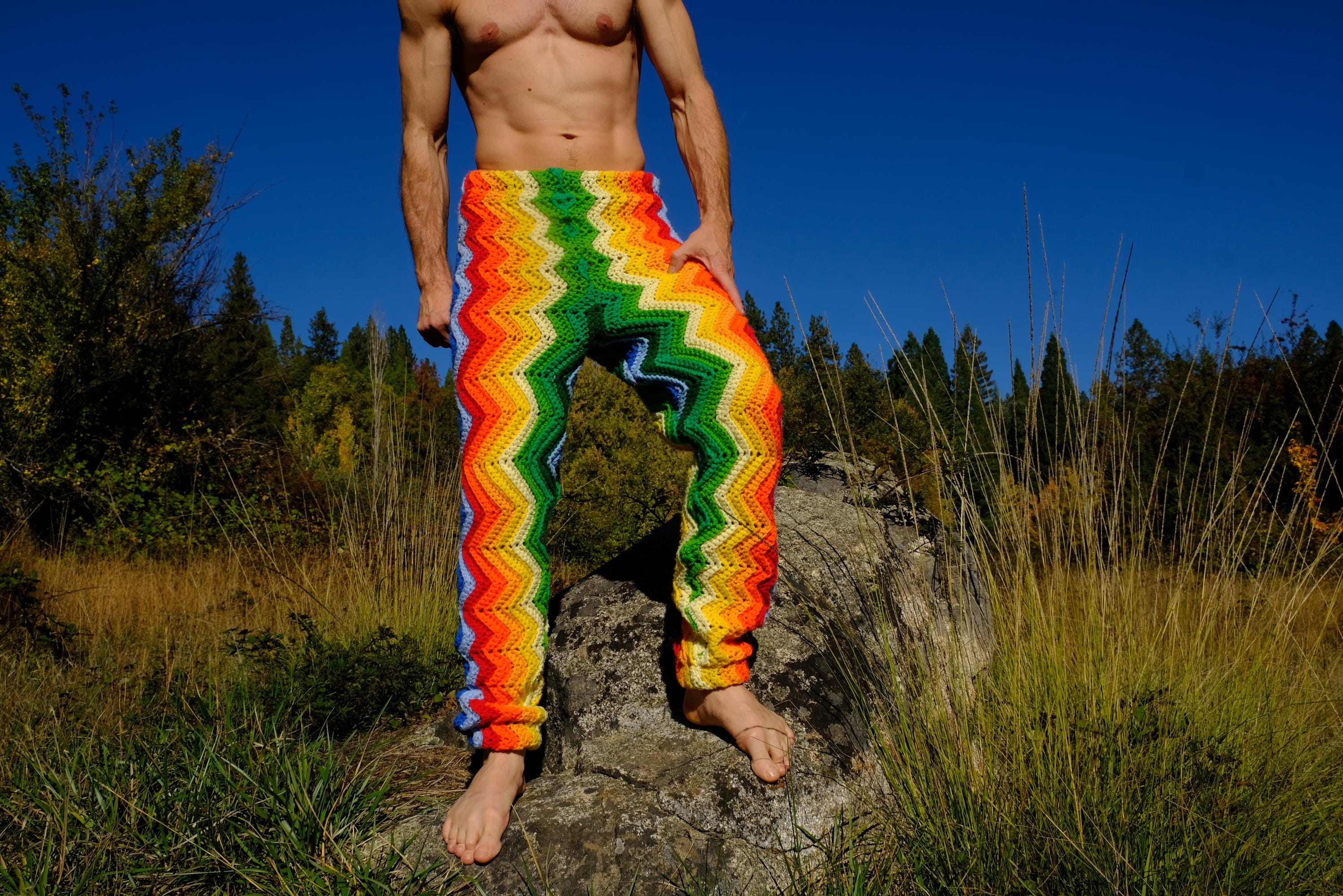 These are crochet pants in rainbow stripes with wide legs tapered at the ankles like sweatpants. Fashioned from a vintage afghan blanket crocheted in 100% acrylic yarn.