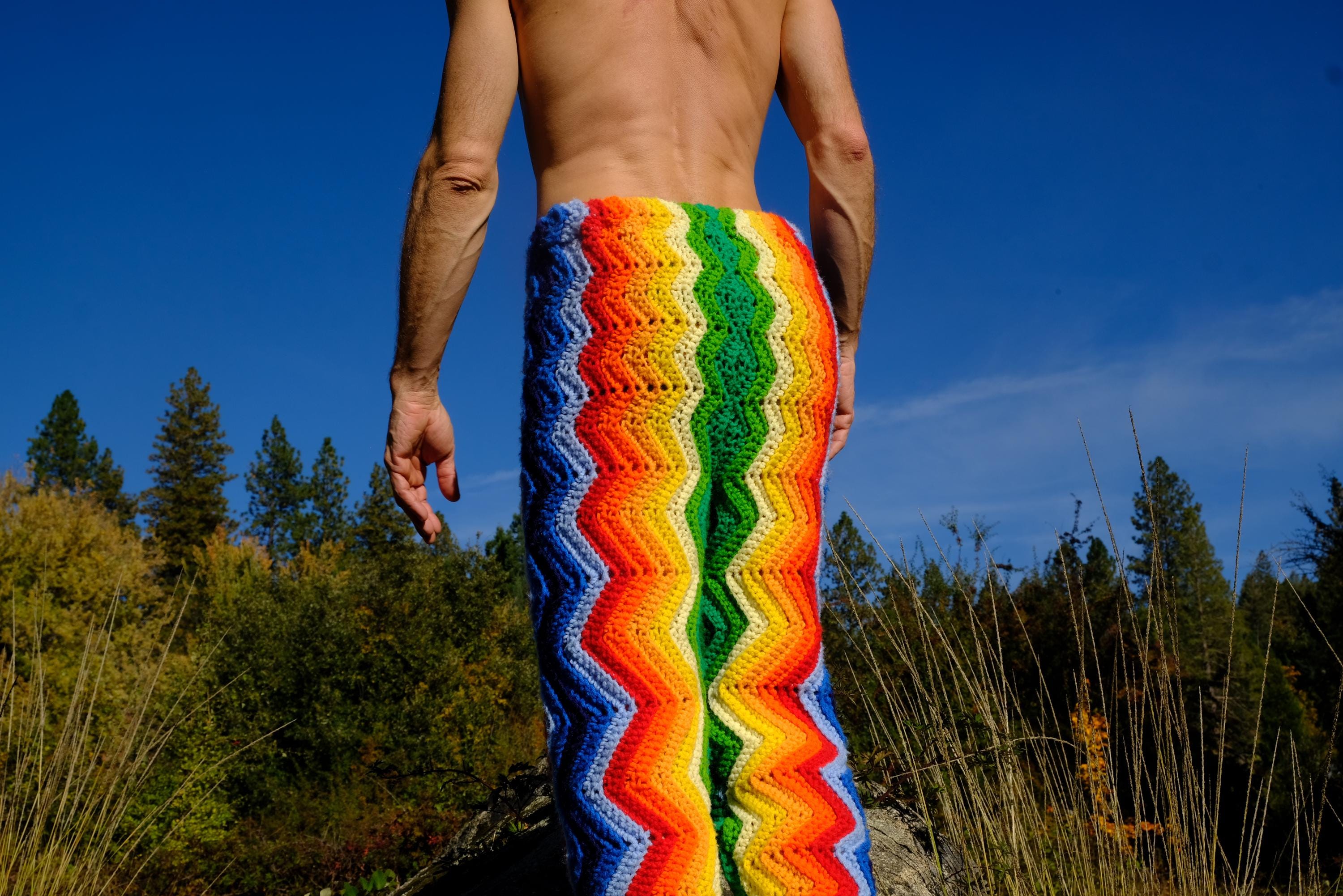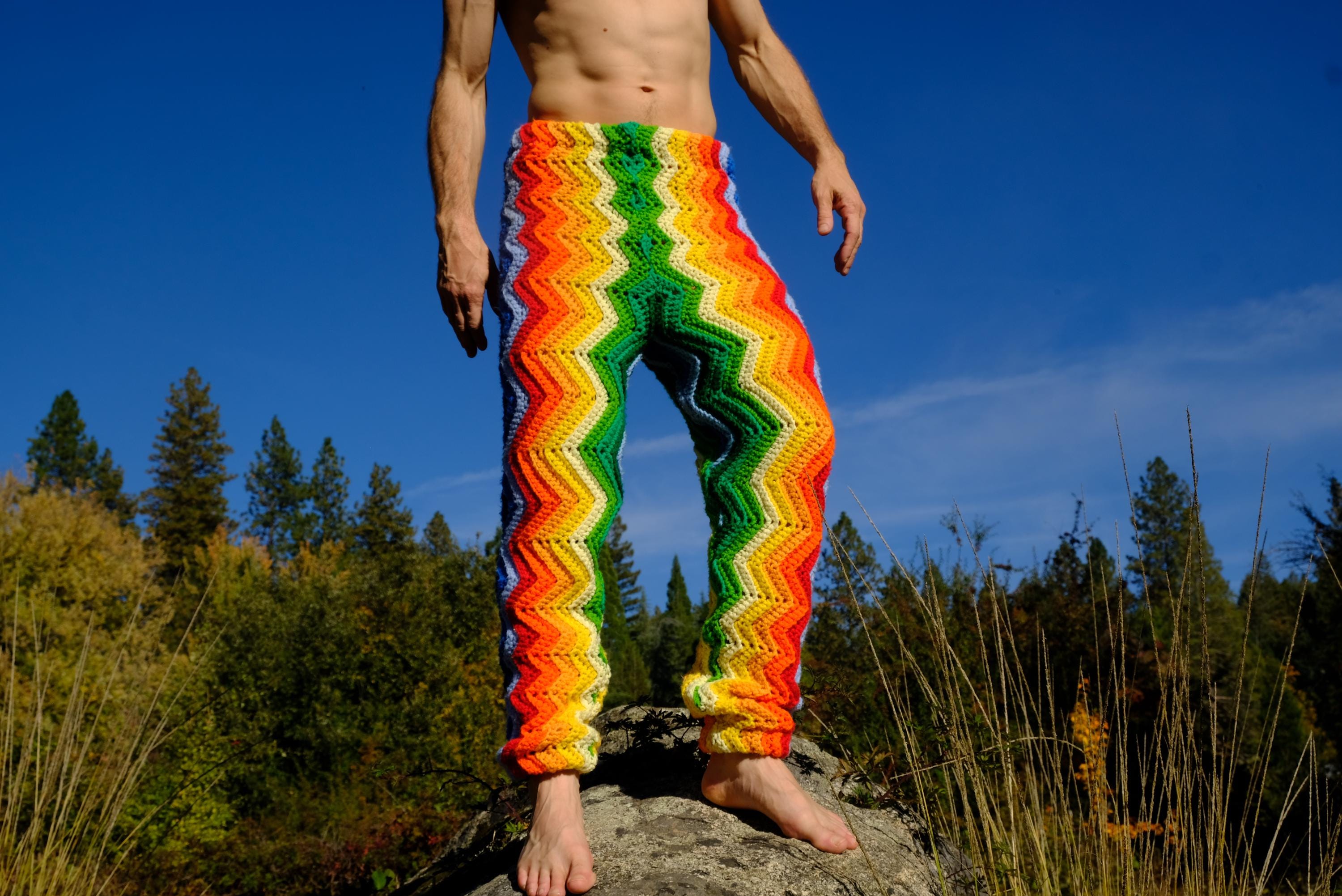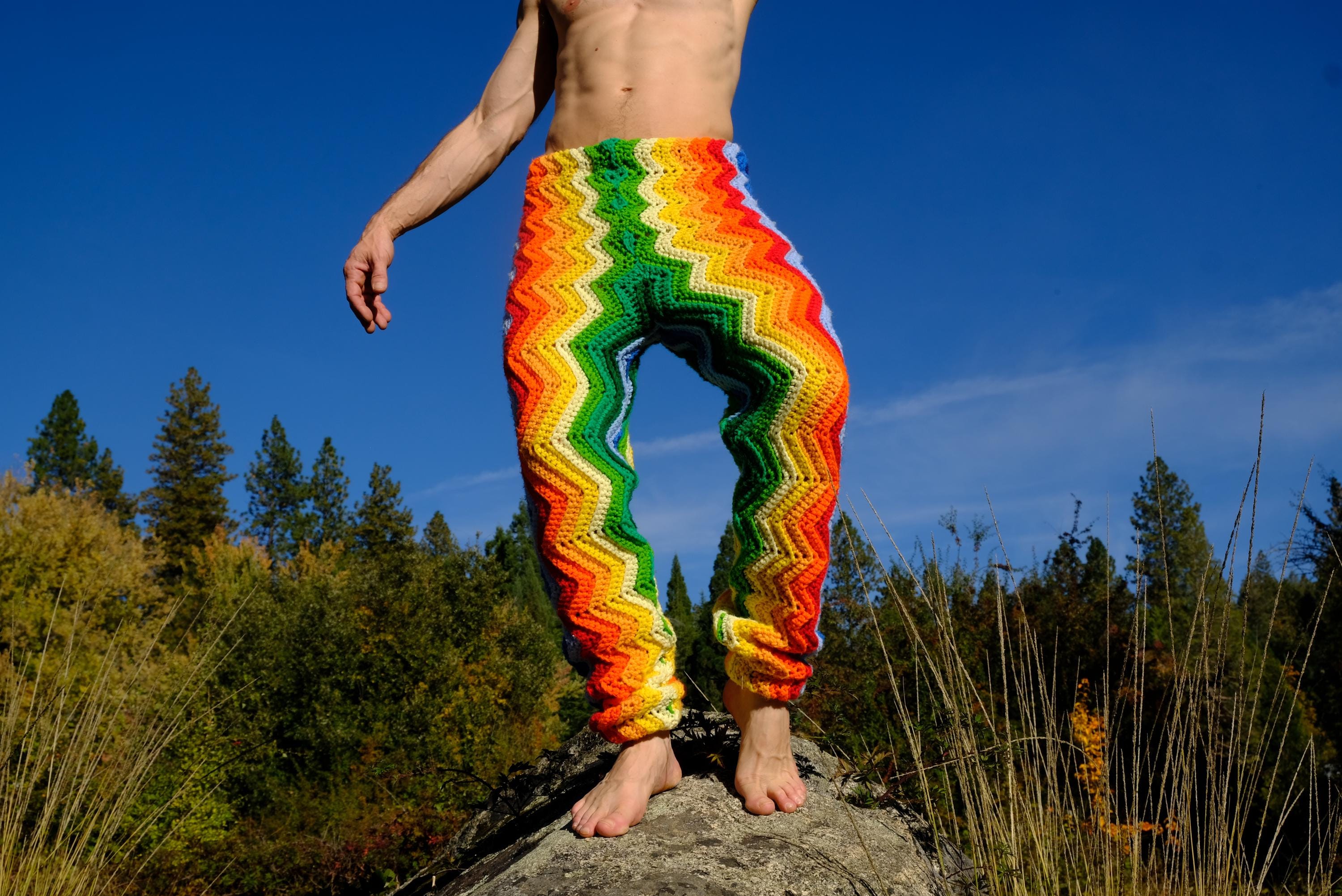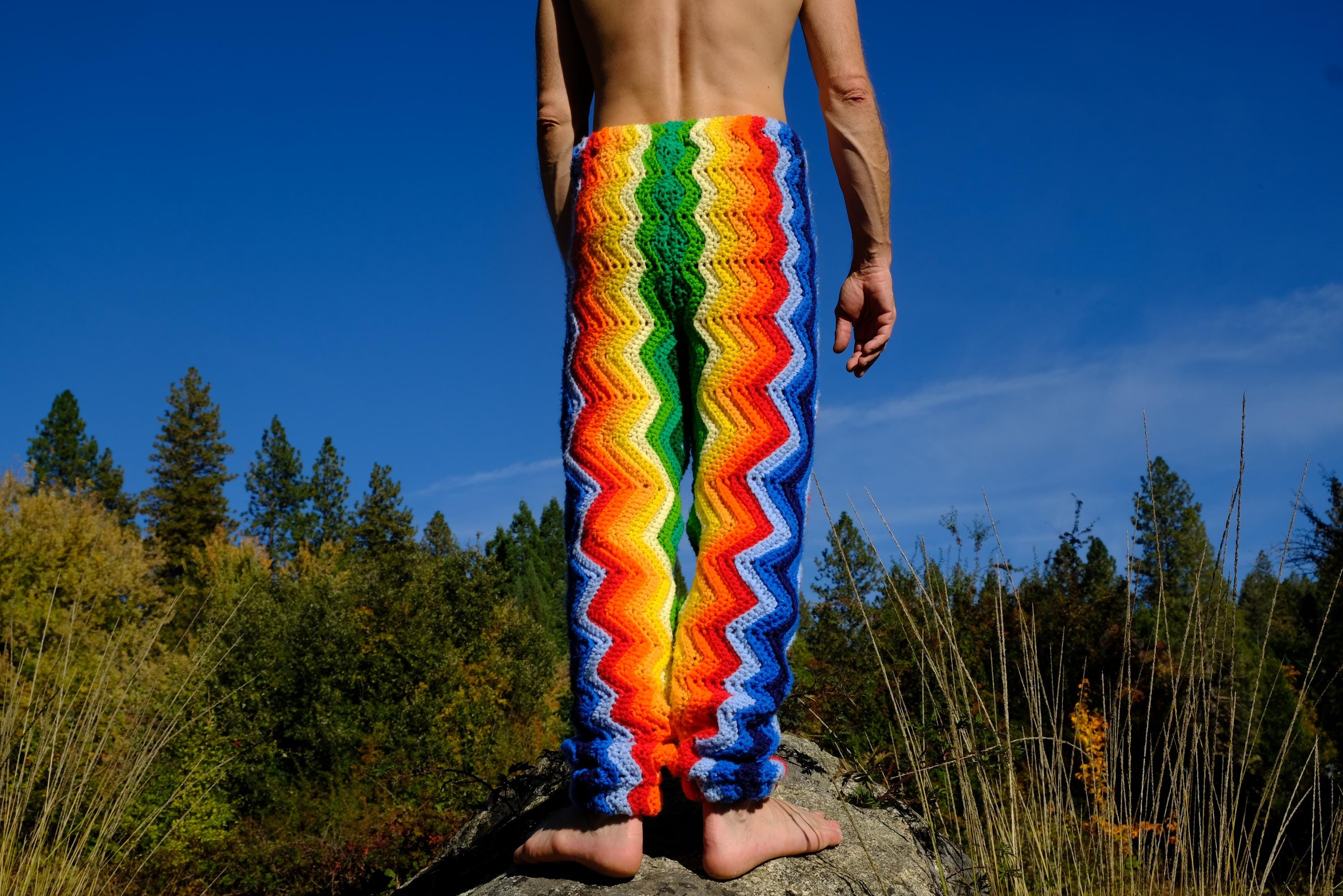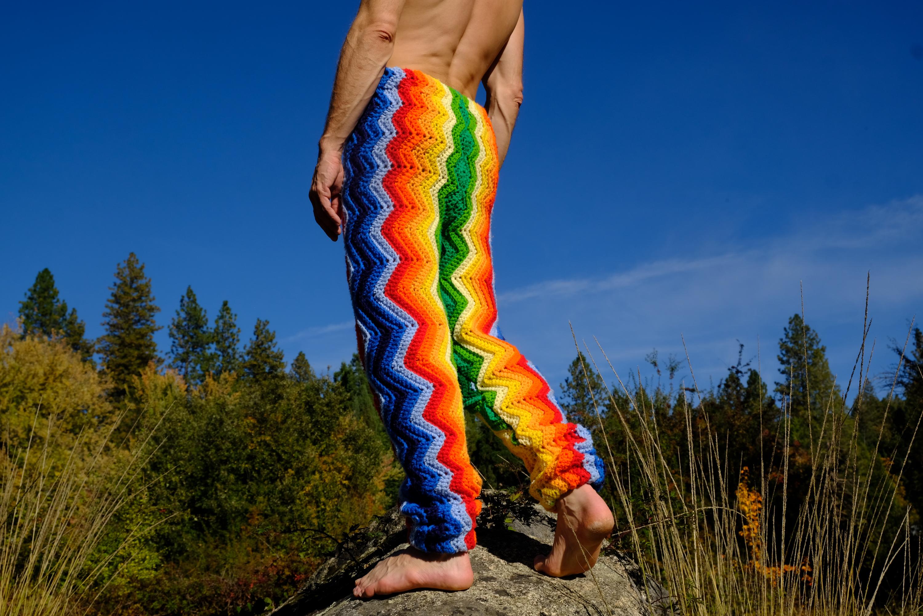 These are crochet pants in rainbow stripes with wide legs tapered at the ankles like sweatpants. Fashioned from a vintage afghan blanket crocheted in 100% acrylic yarn.