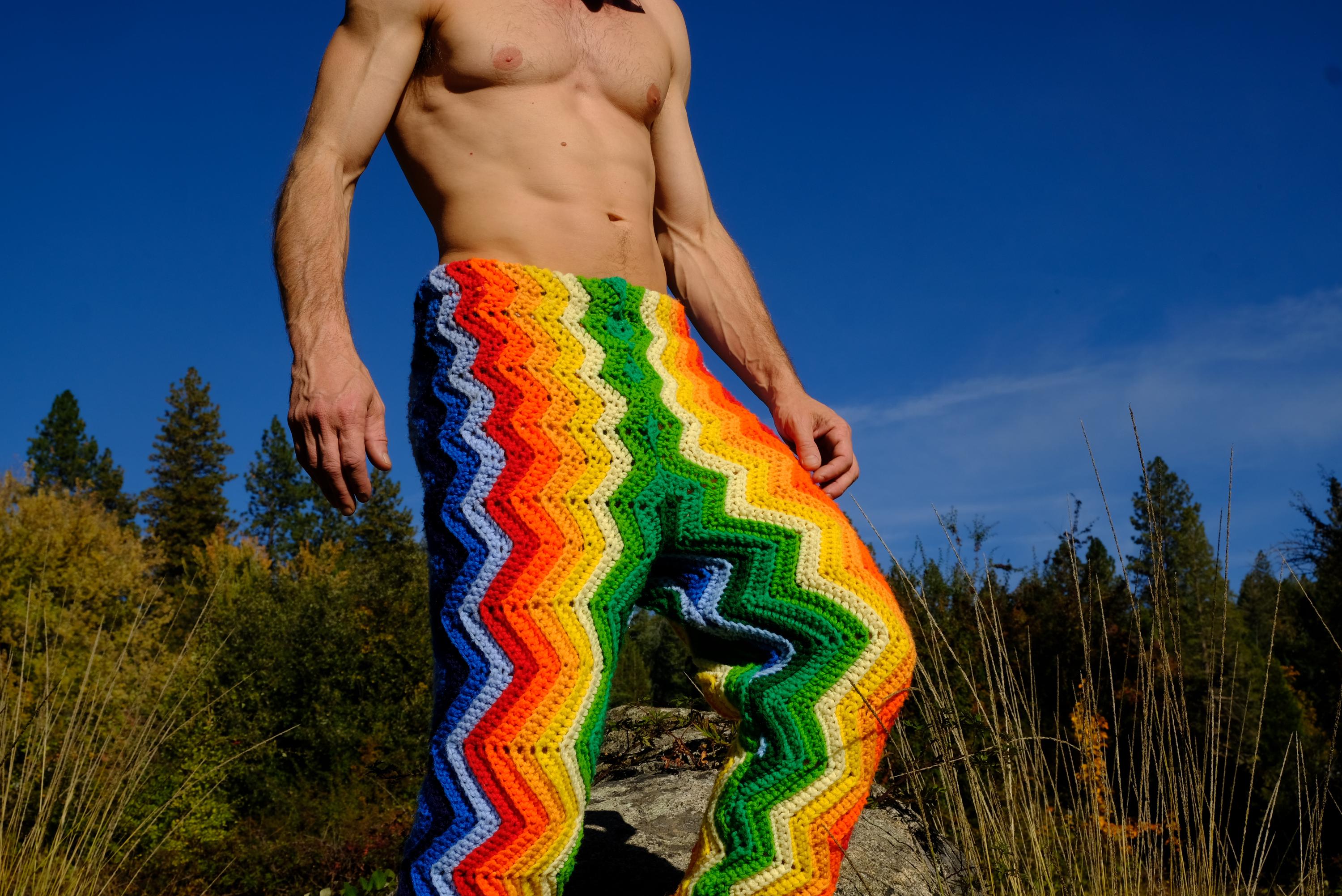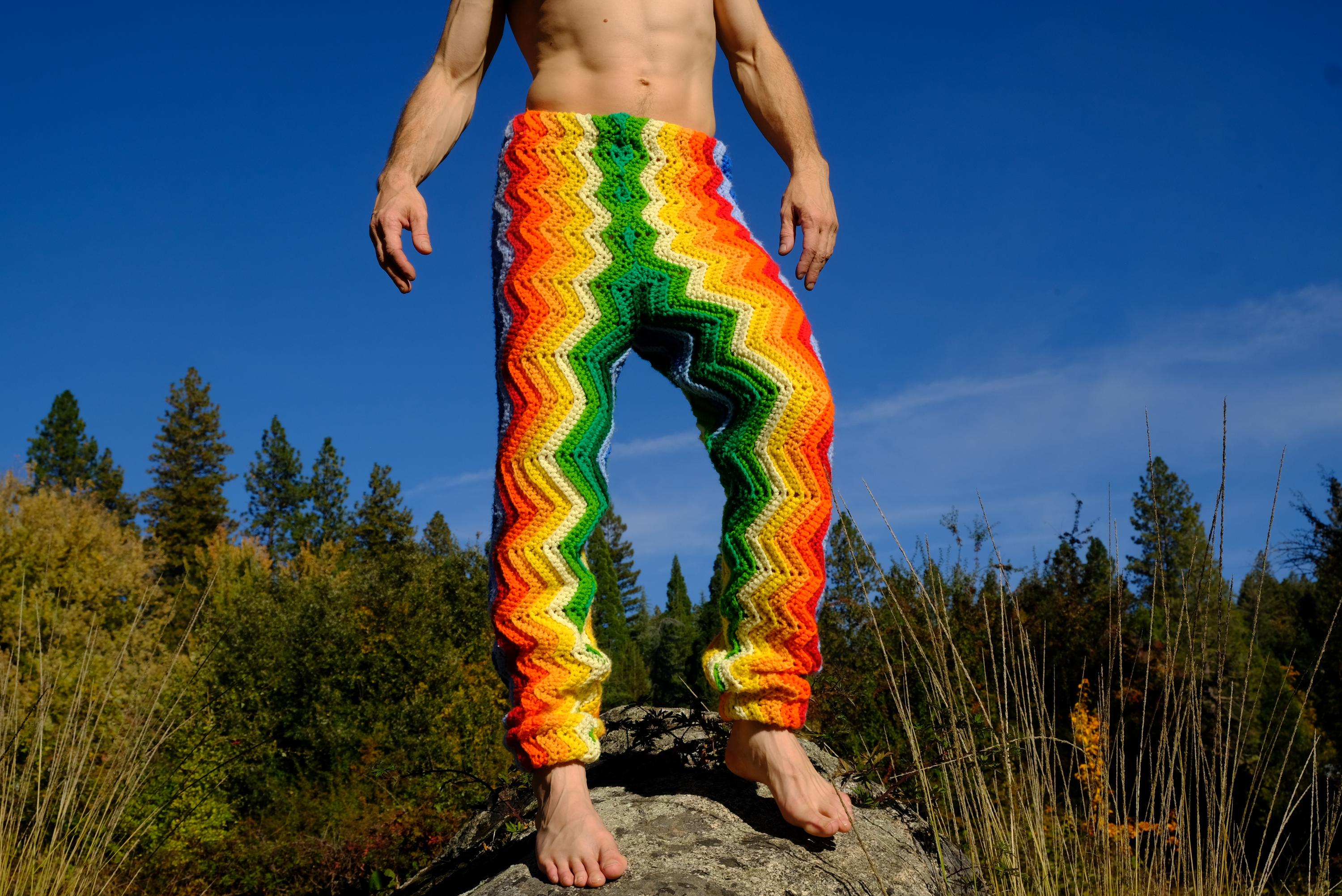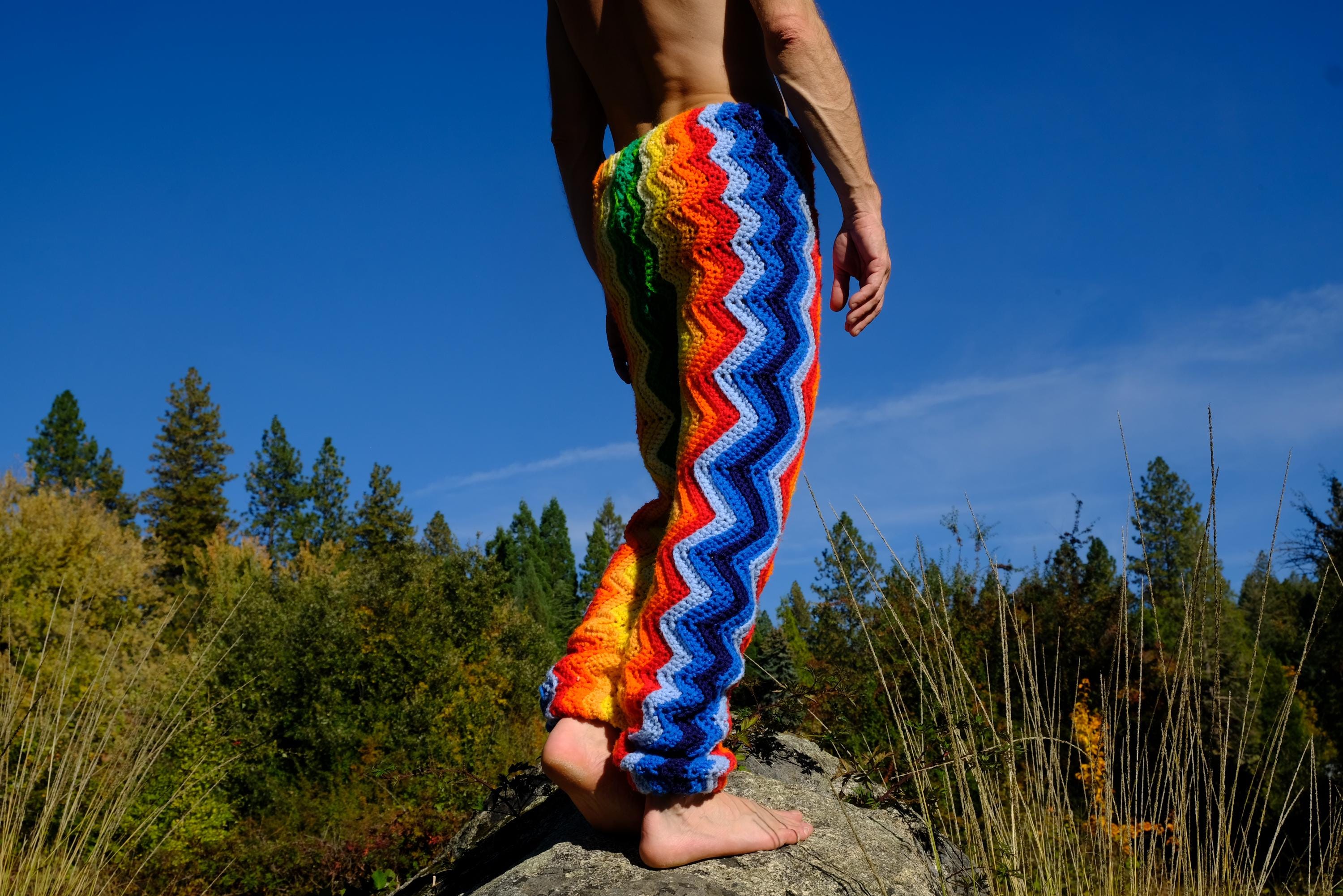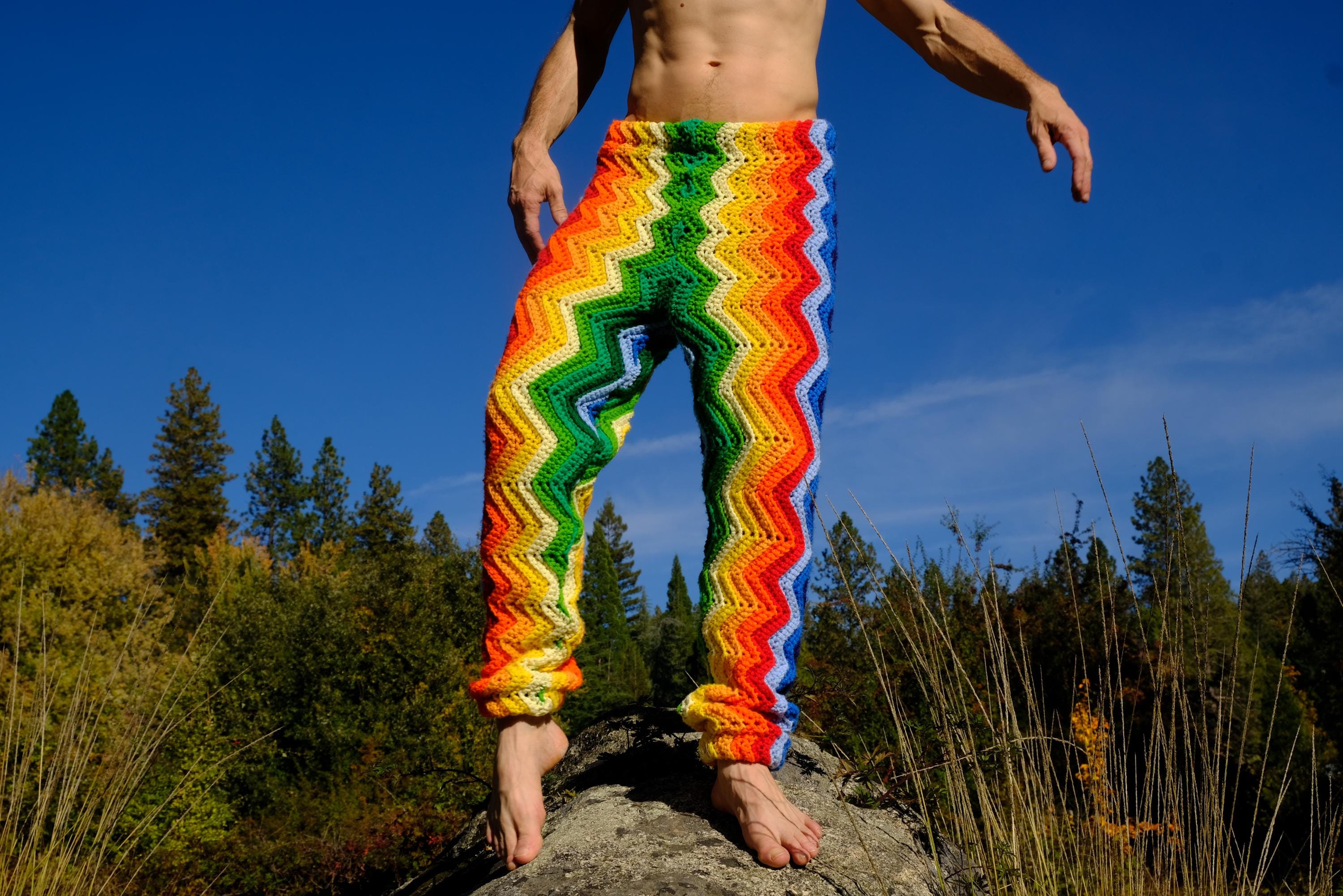 These are crochet pants in rainbow stripes with wide legs tapered at the ankles like sweatpants. Fashioned from a vintage afghan blanket crocheted in 100% acrylic yarn.