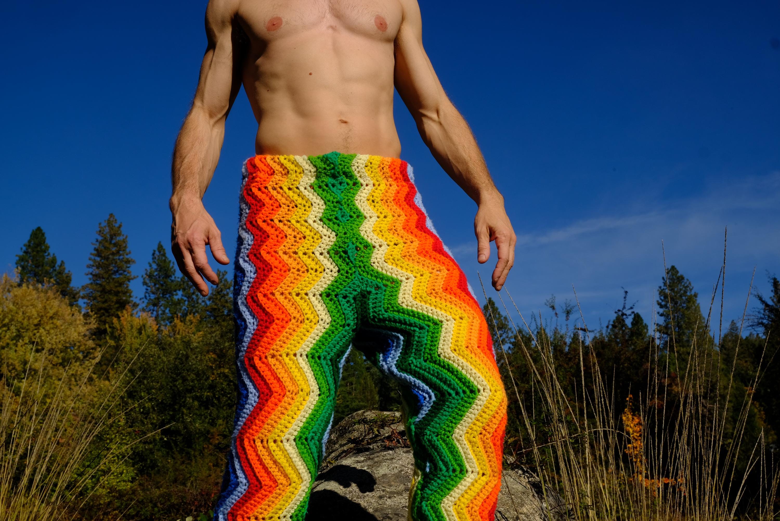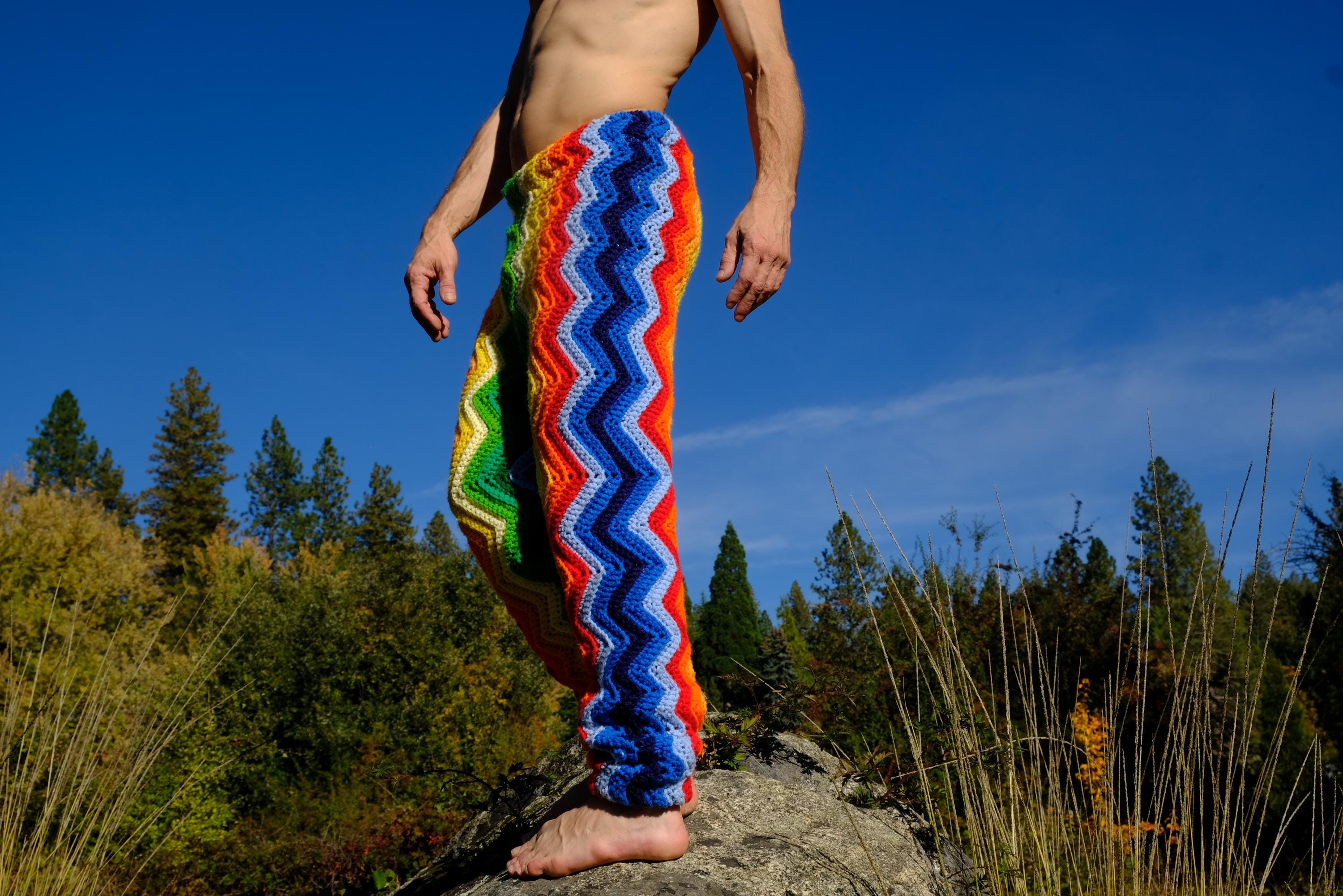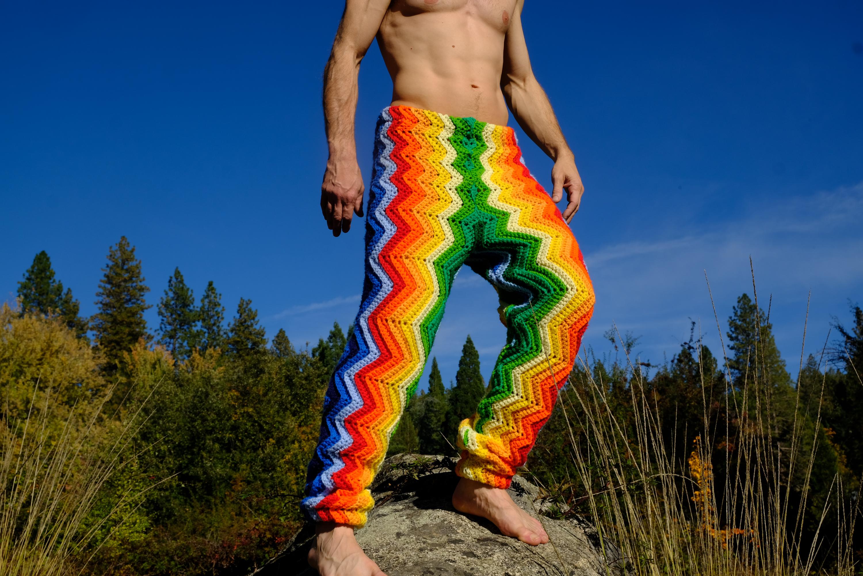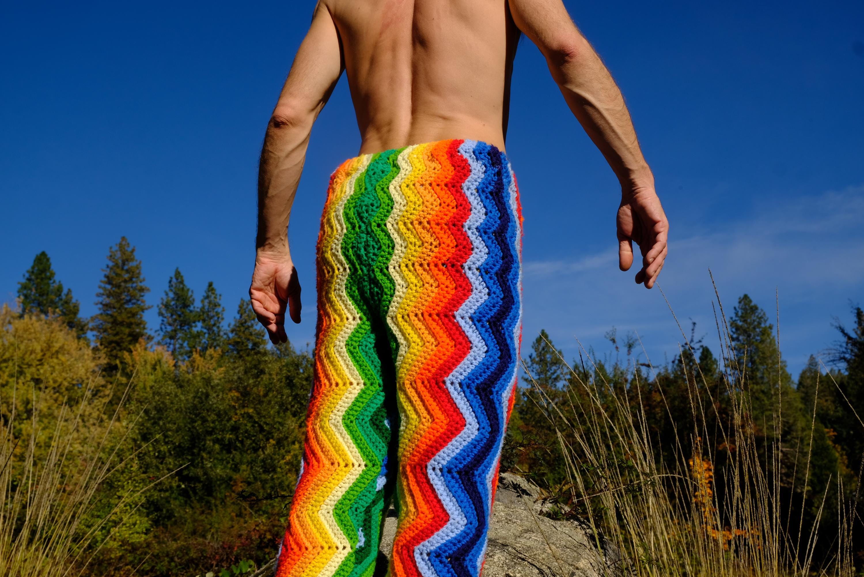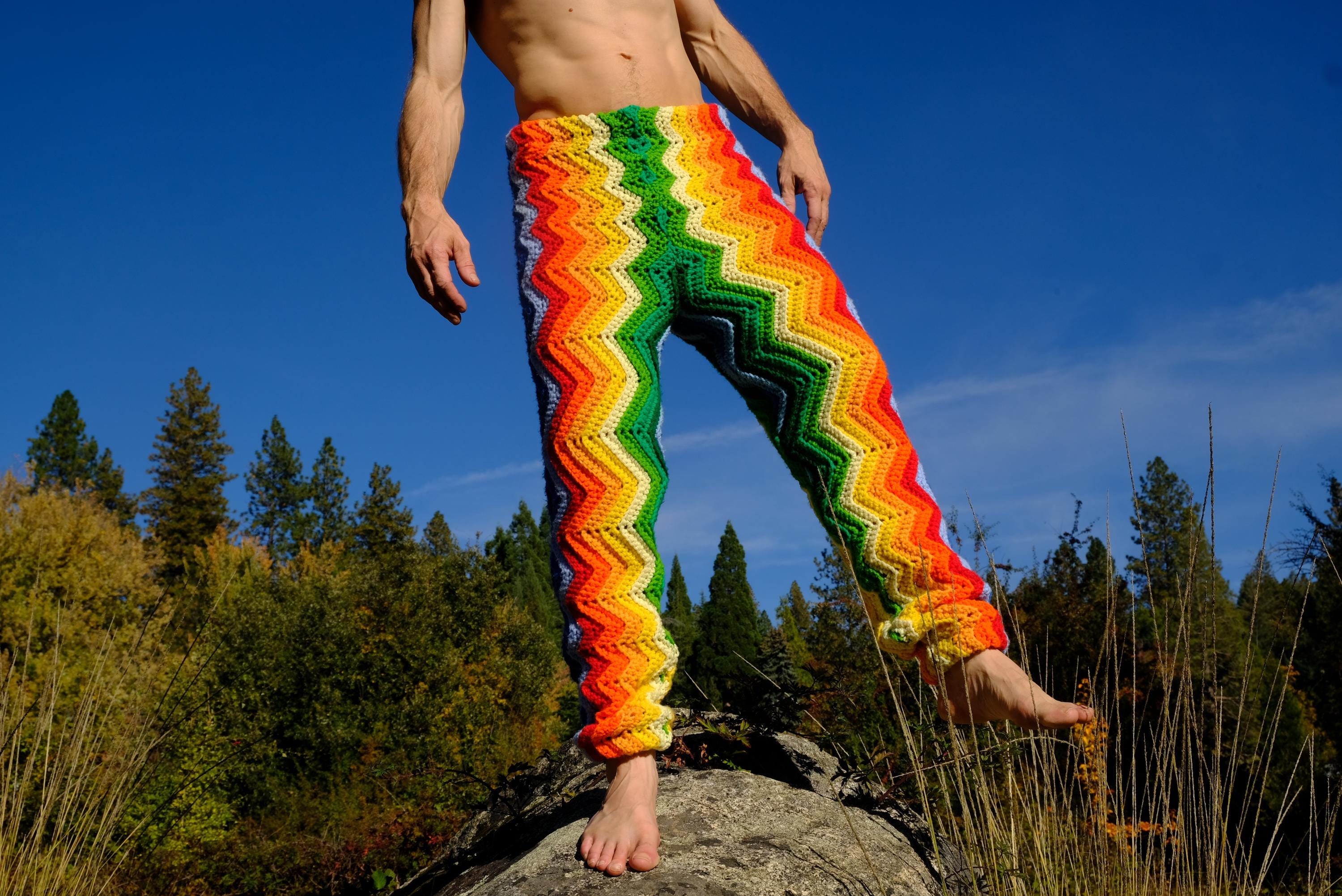 These are crochet pants in rainbow stripes with wide legs tapered at the ankles like sweatpants. Fashioned from a vintage afghan blanket crocheted in 100% acrylic yarn.