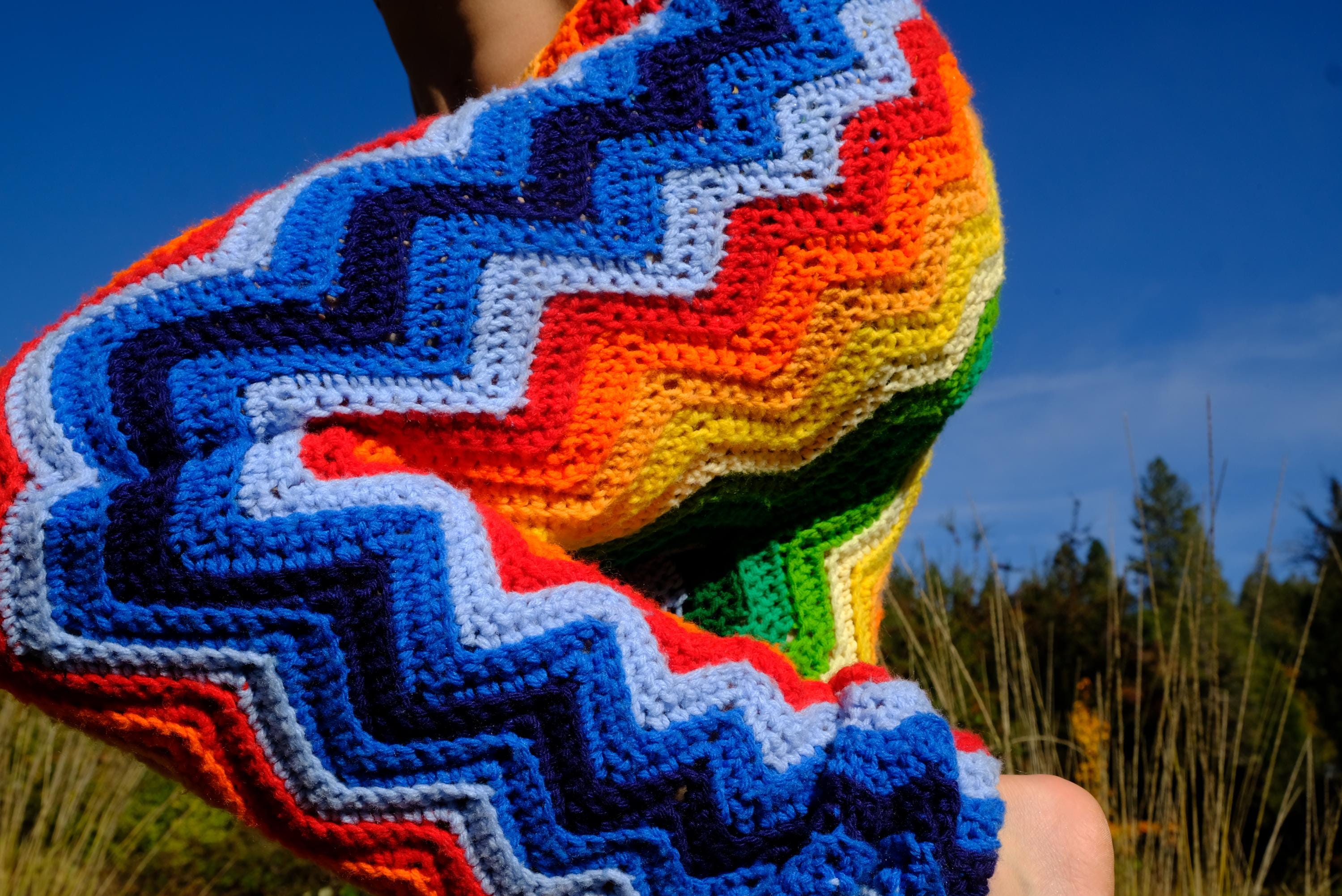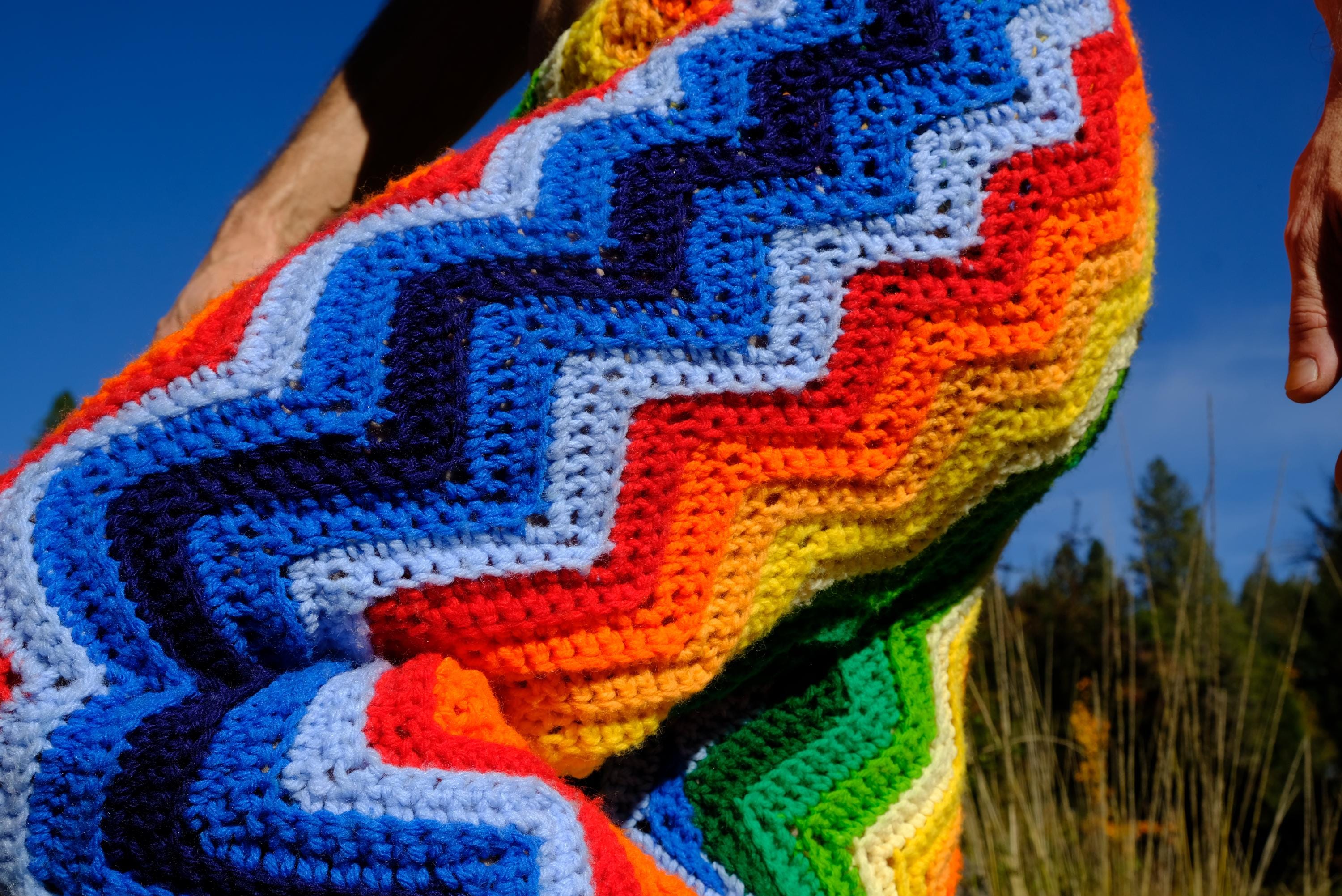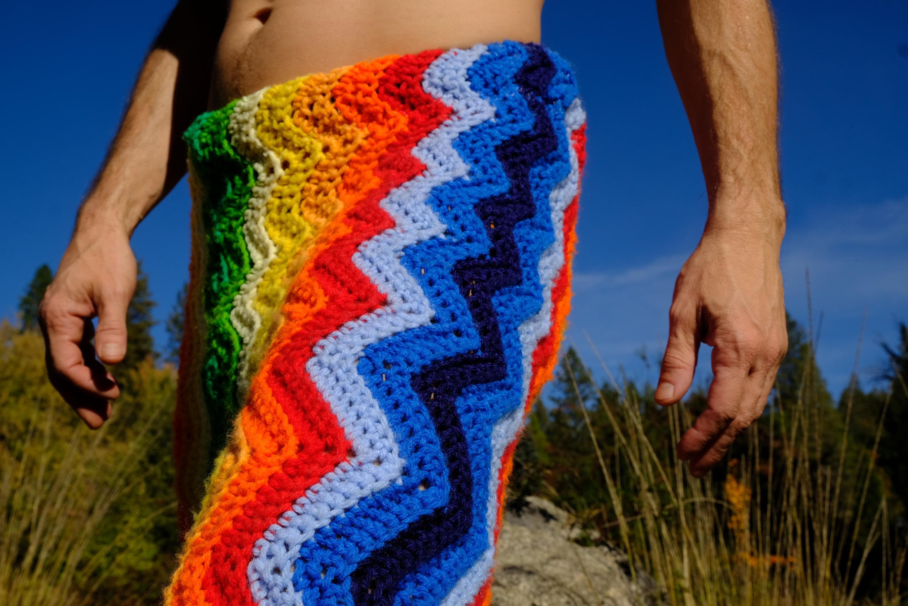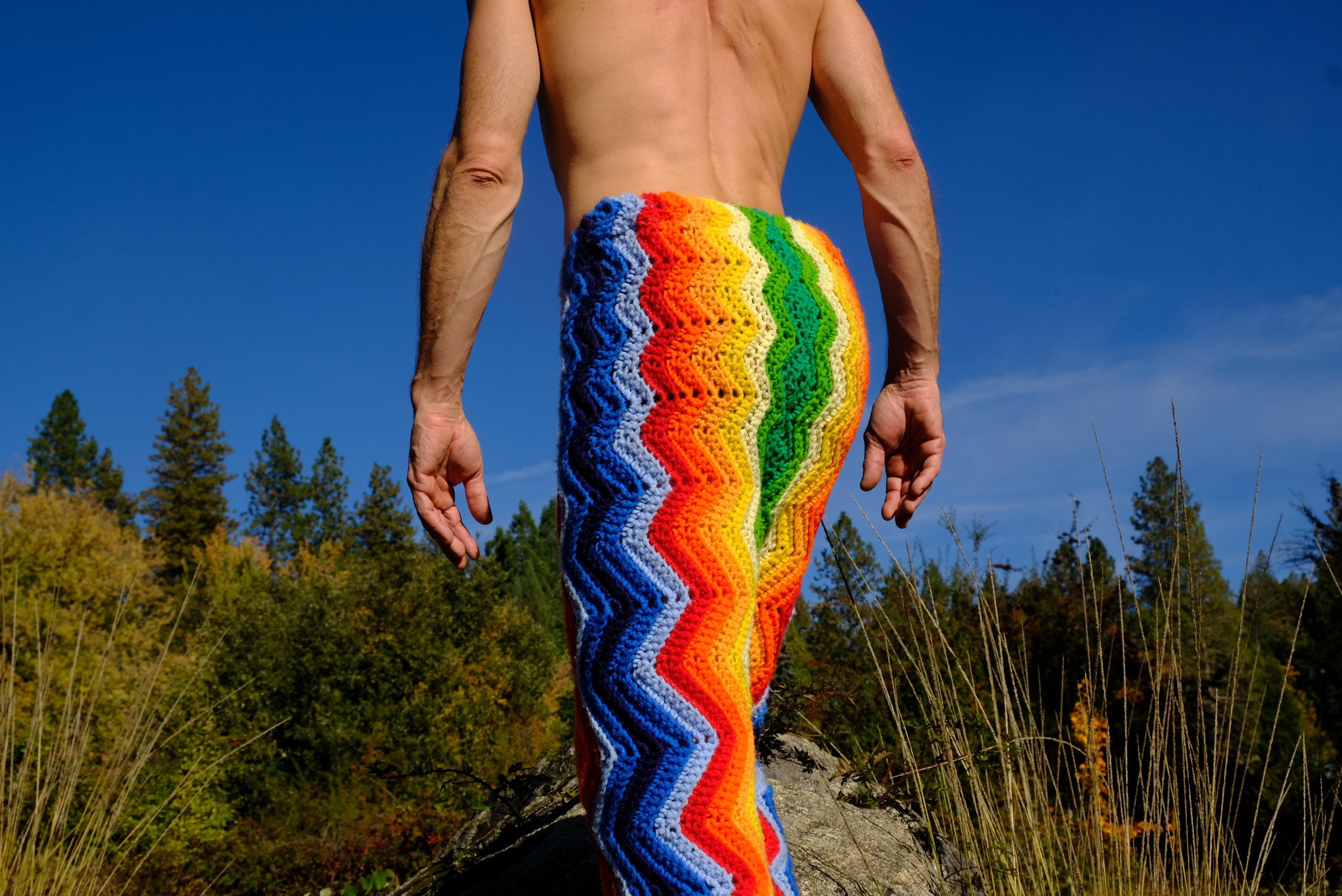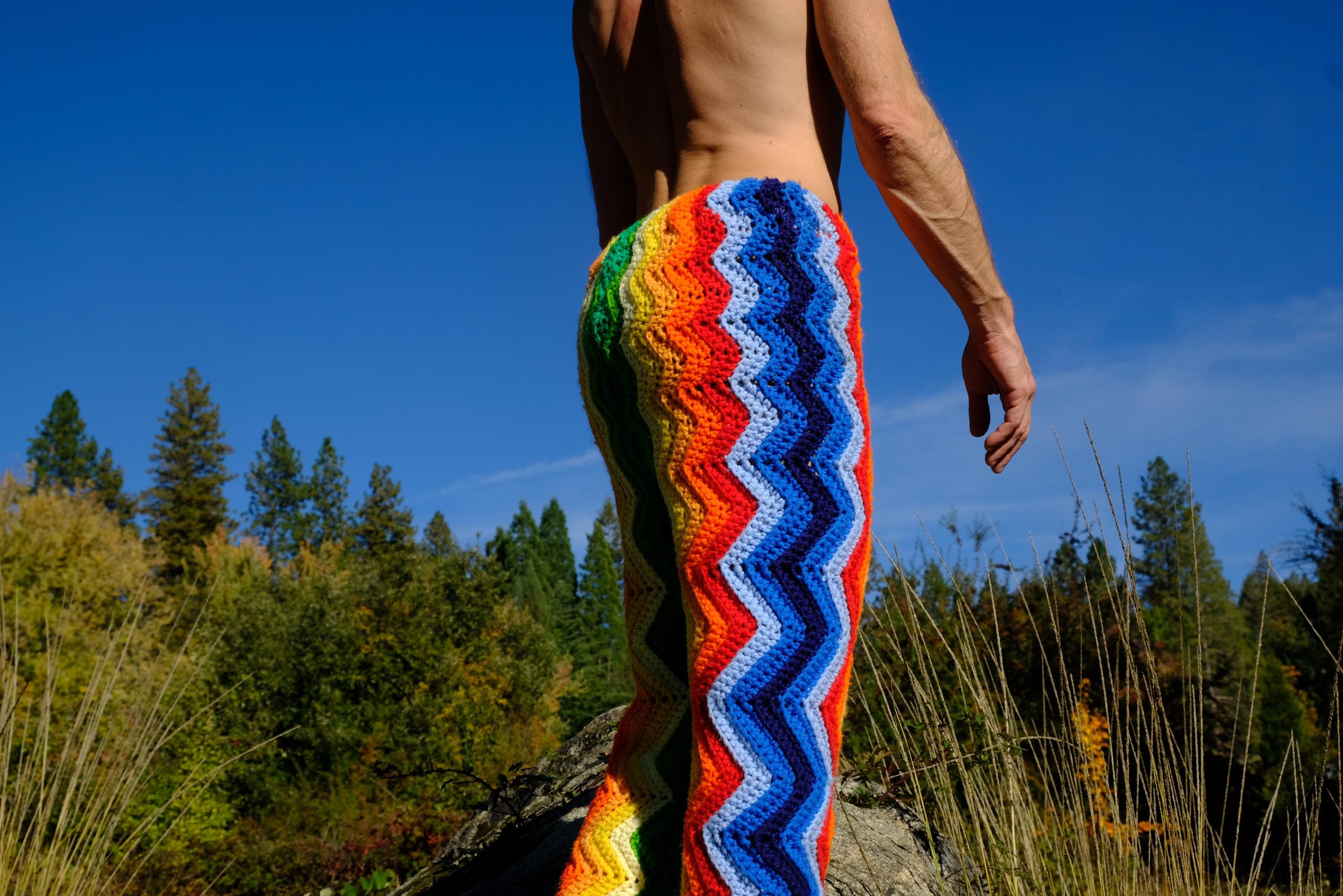These are crochet pants in rainbow stripes with wide legs tapered at the ankles like sweatpants. Fashioned from a vintage afghan blanket crocheted in 100% acrylic yarn.