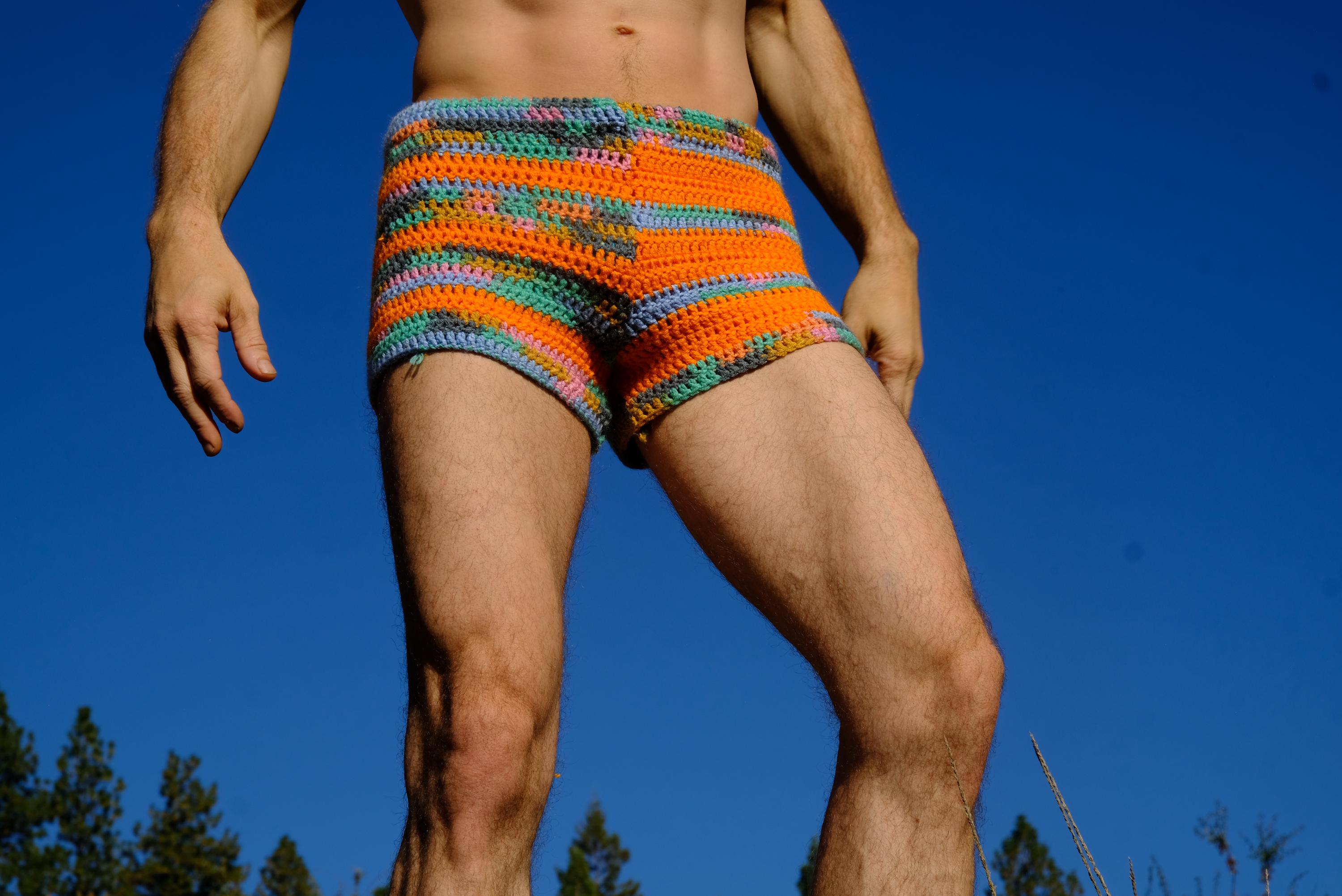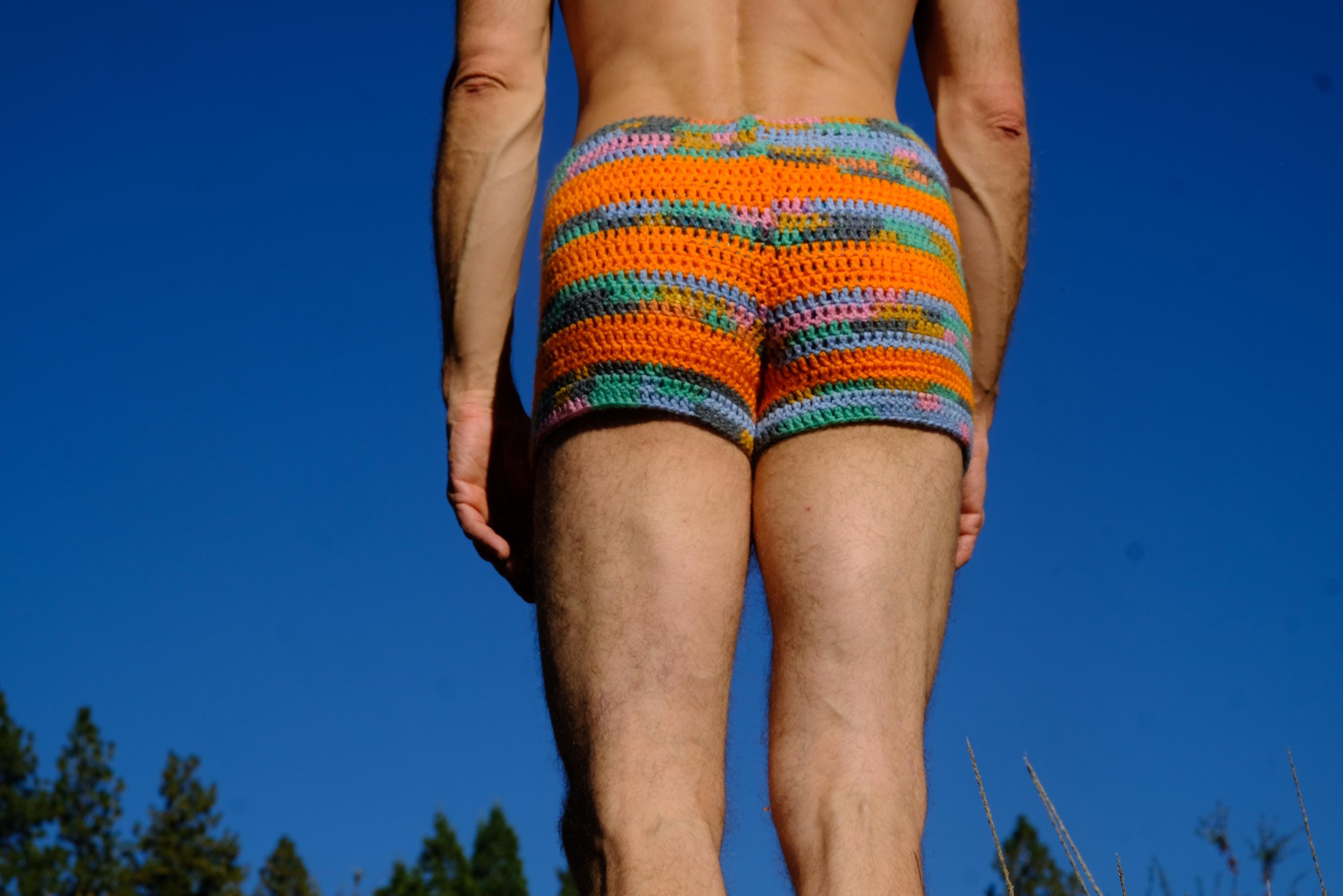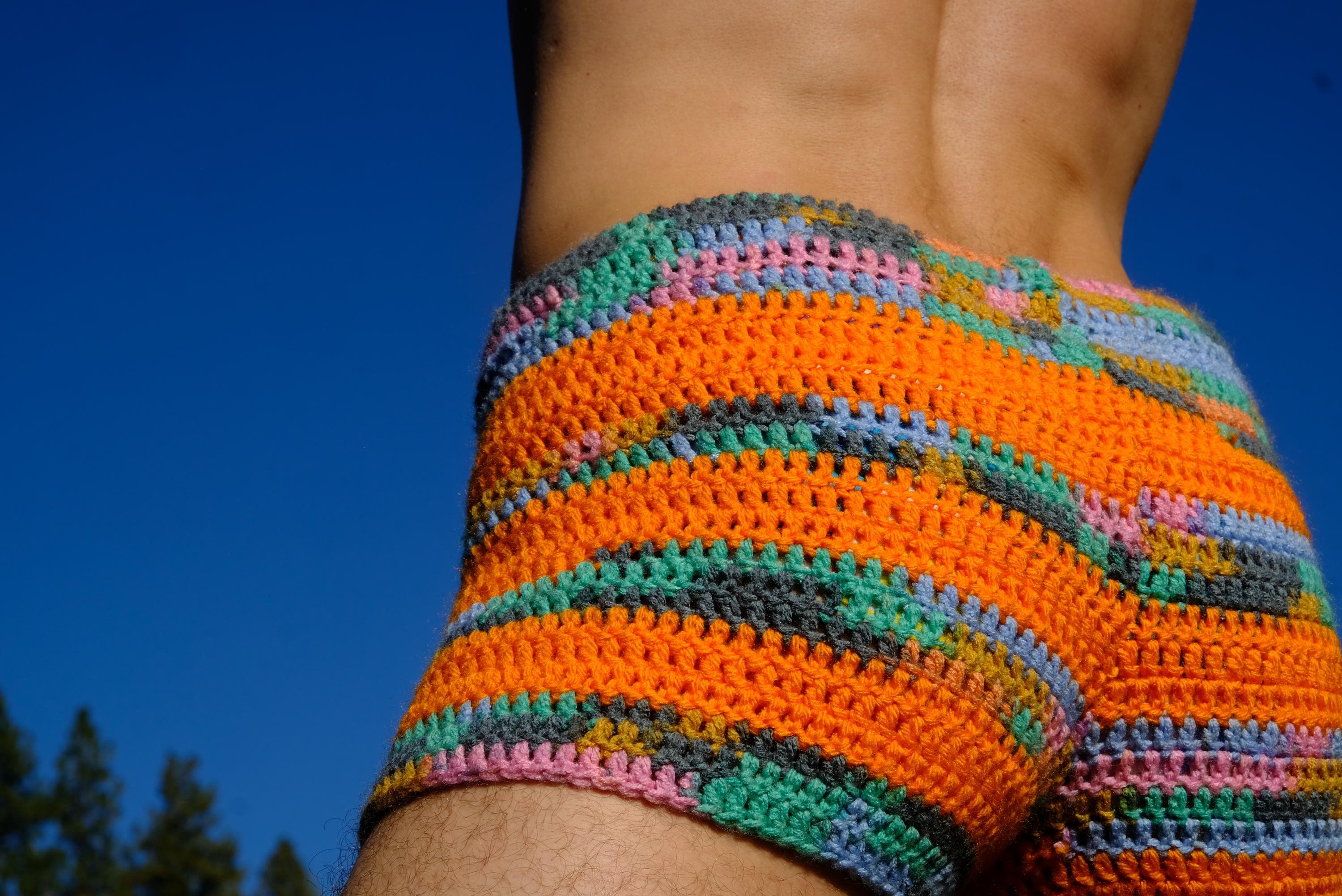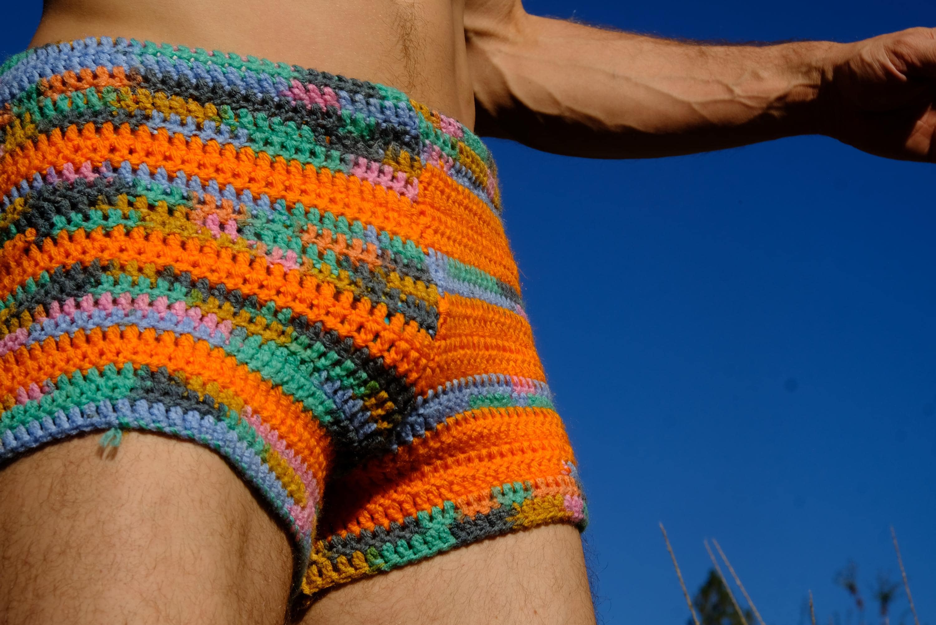 These are crochet shorts with orange stripes. Repurposed from a vintage afghan blanket crocheted in 100% acrylic yarn.
