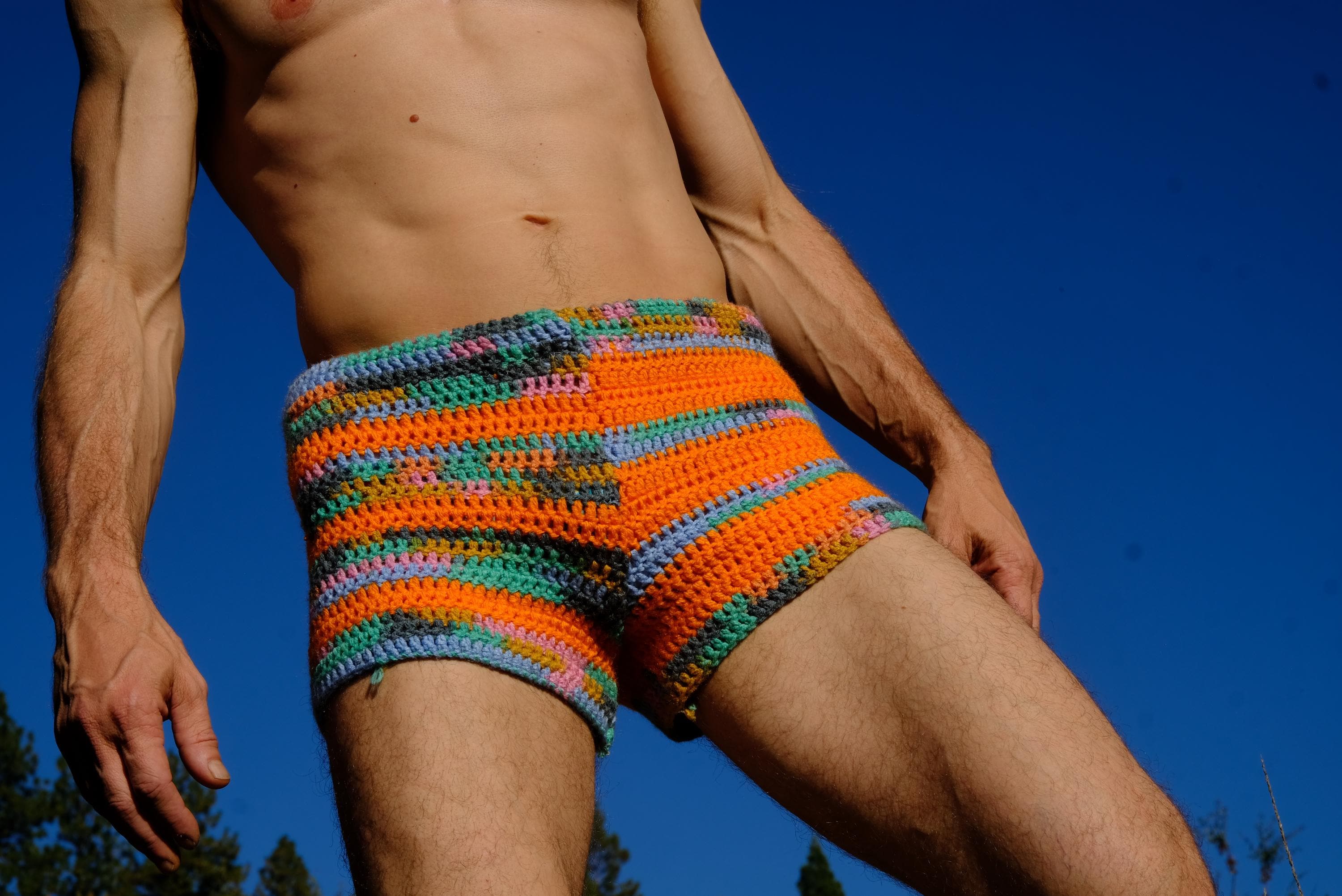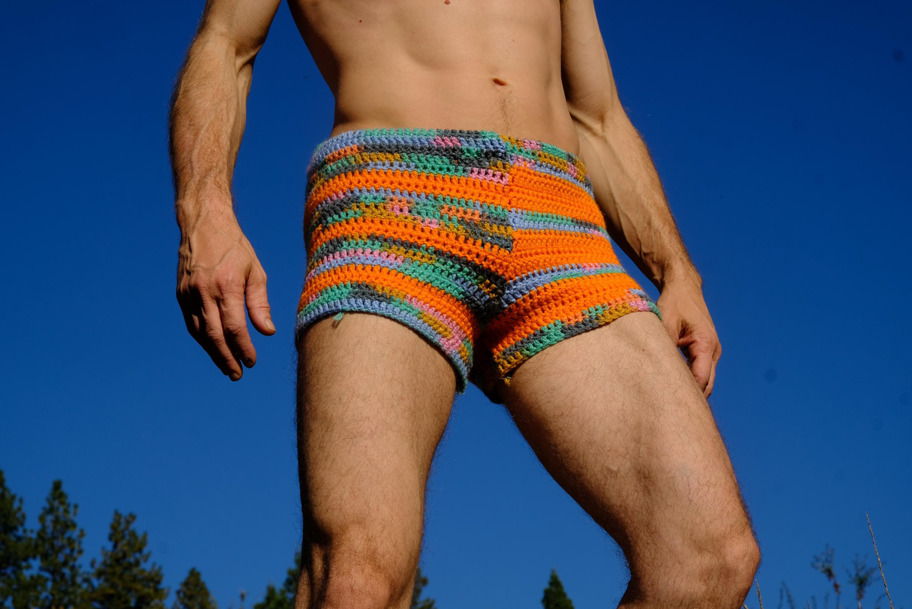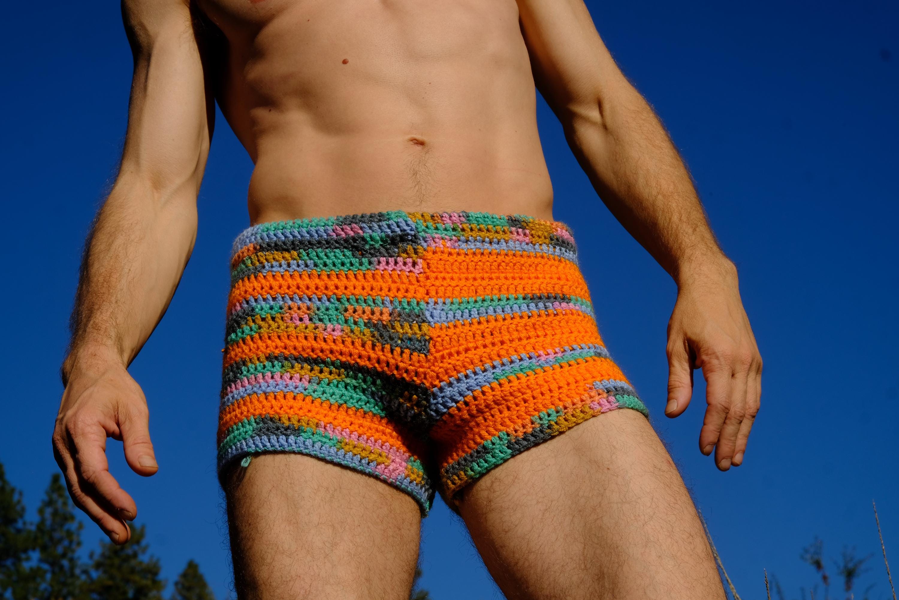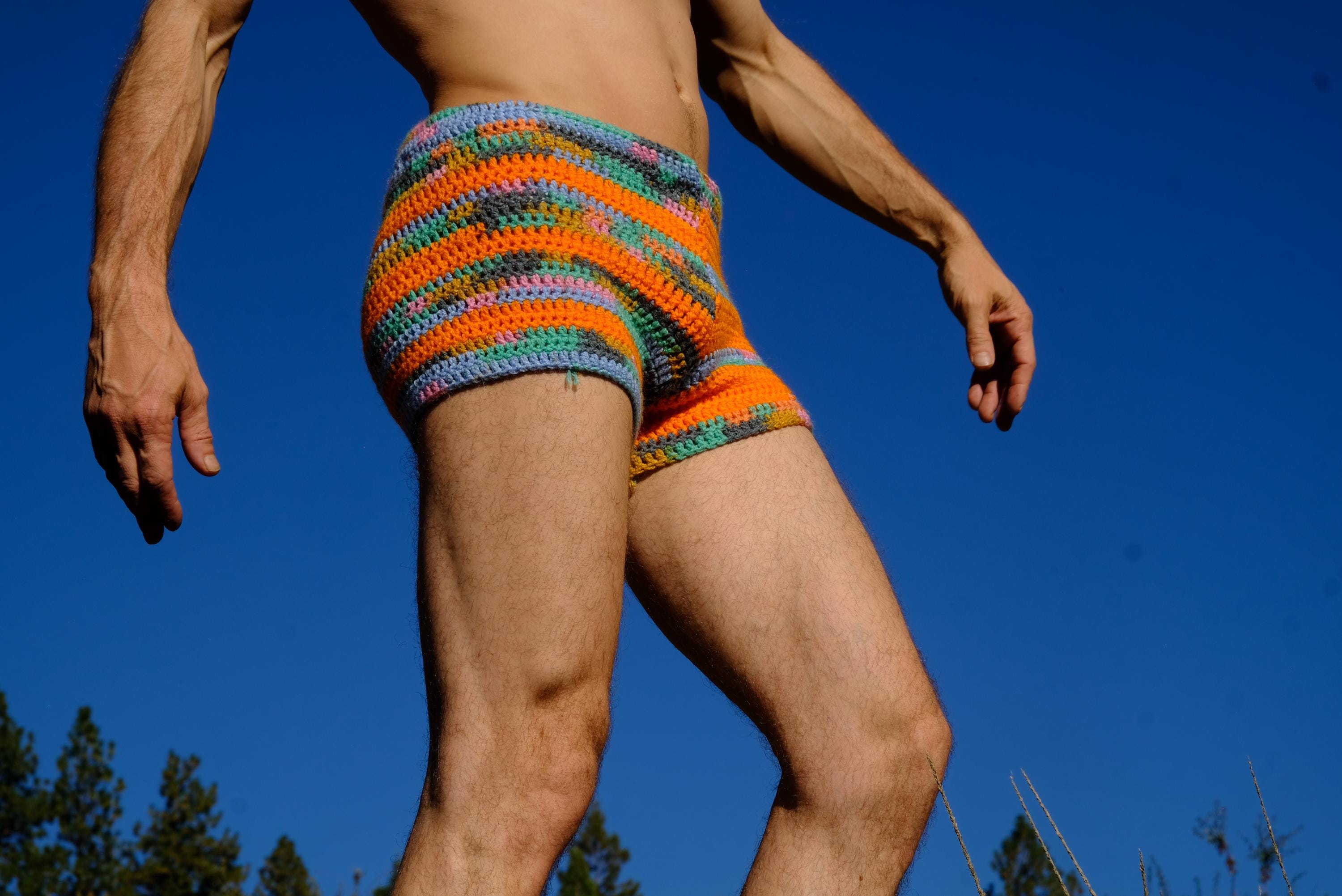 These are crochet shorts with orange stripes. Repurposed from a vintage afghan blanket crocheted in 100% acrylic yarn.