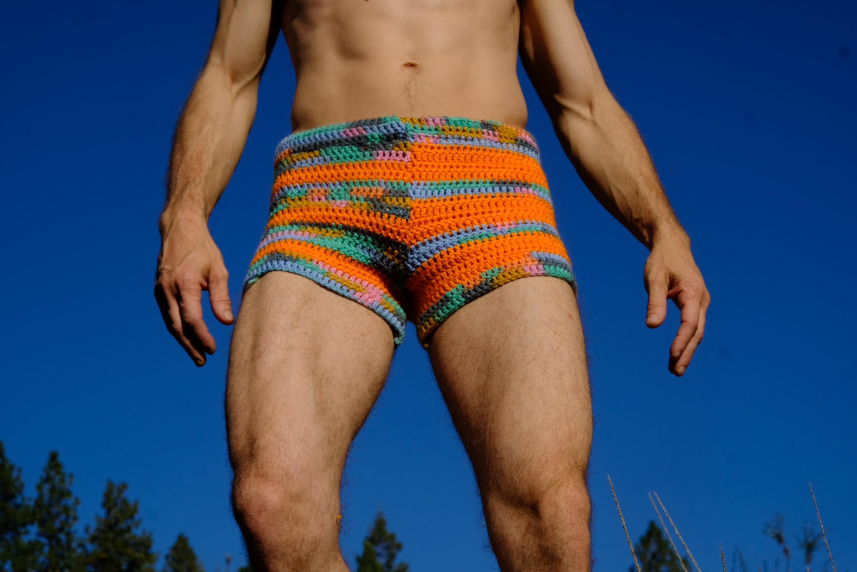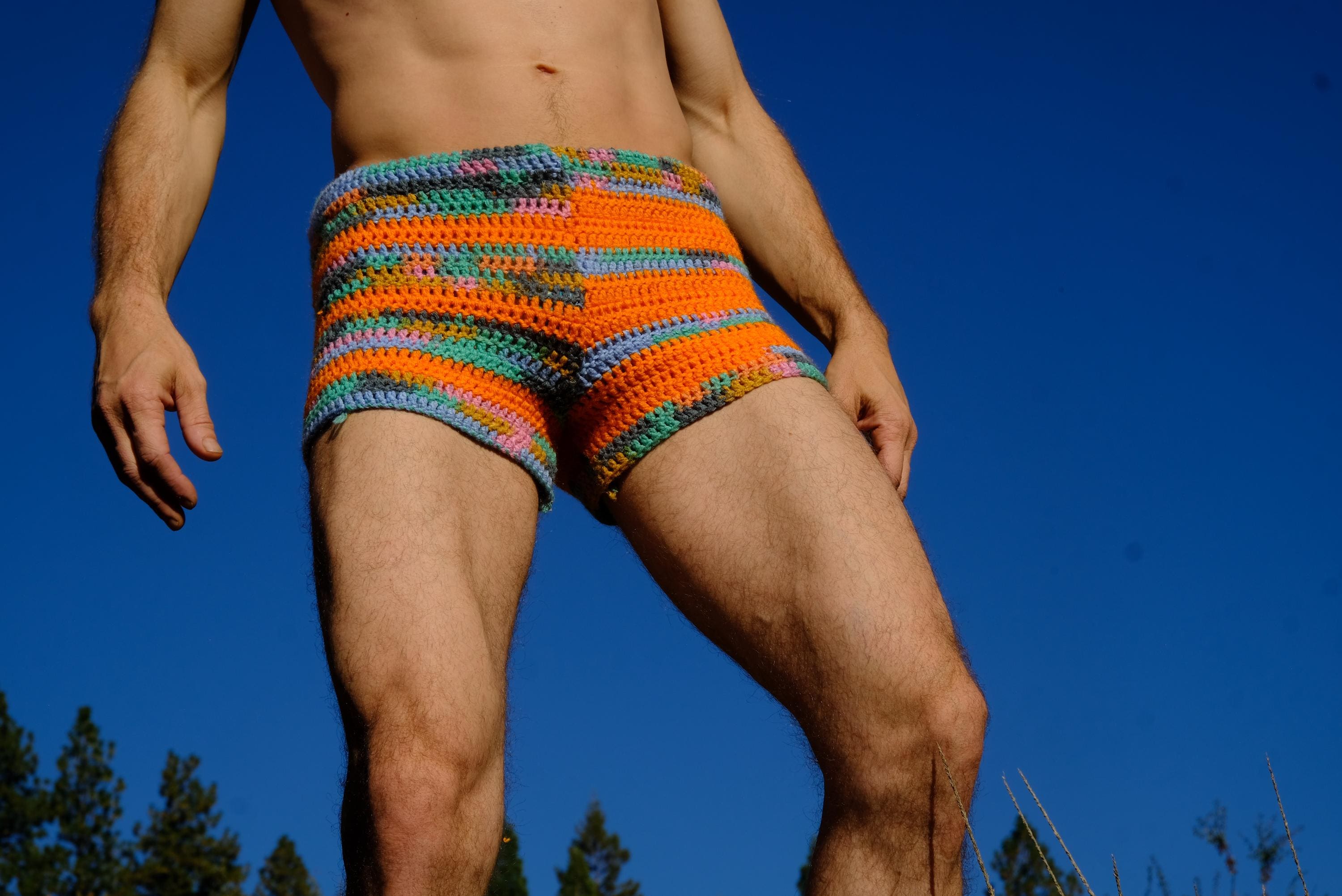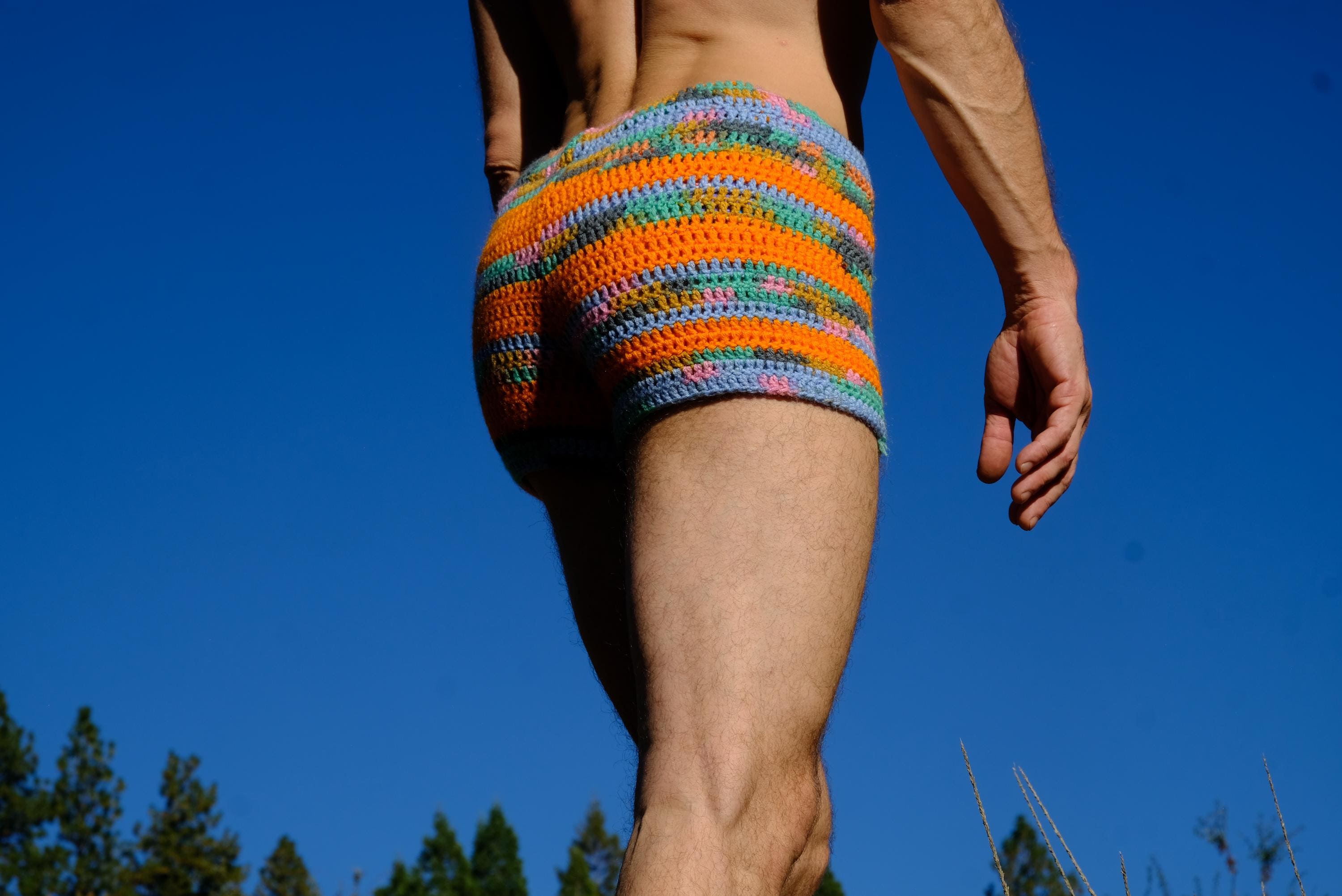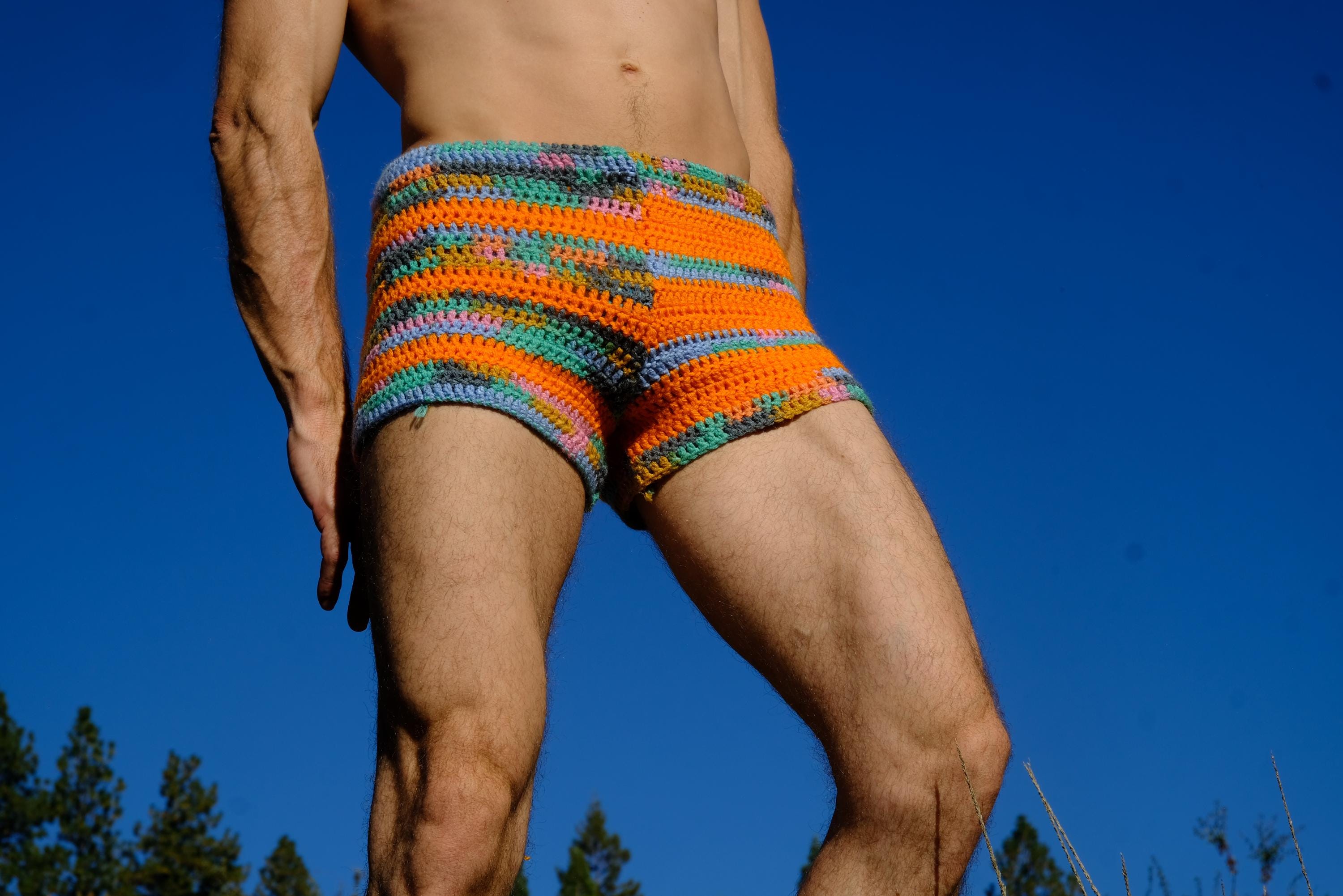 These are crochet shorts with orange stripes. Repurposed from a vintage afghan blanket crocheted in 100% acrylic yarn.
