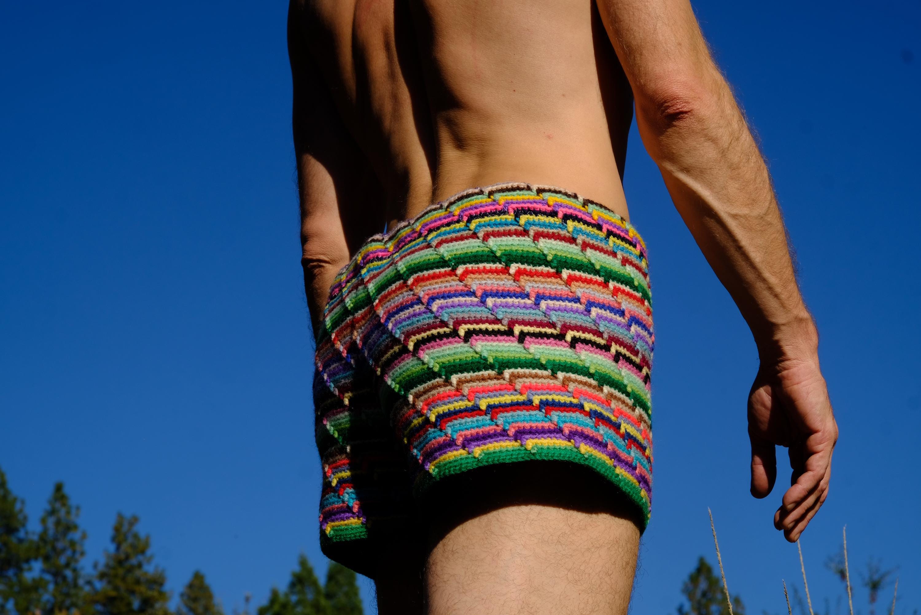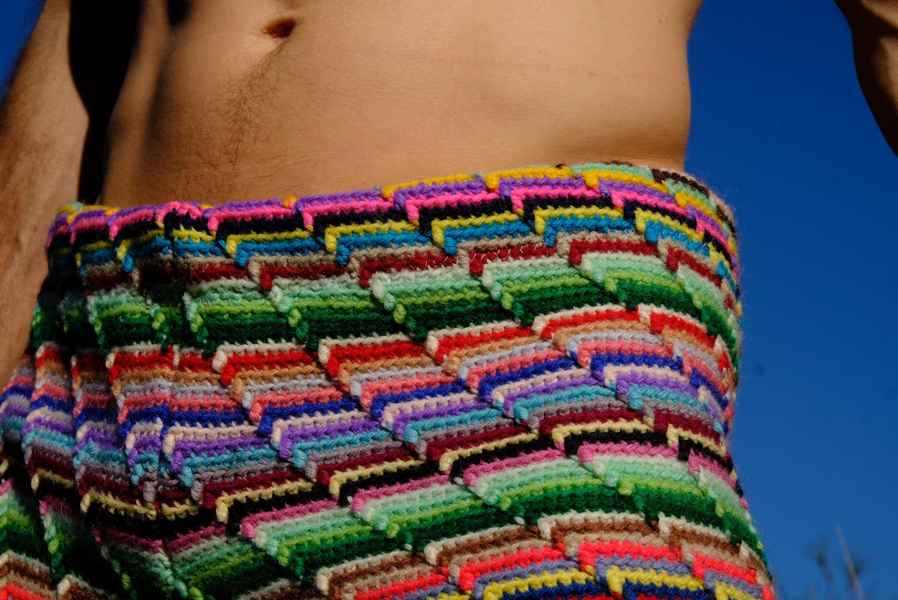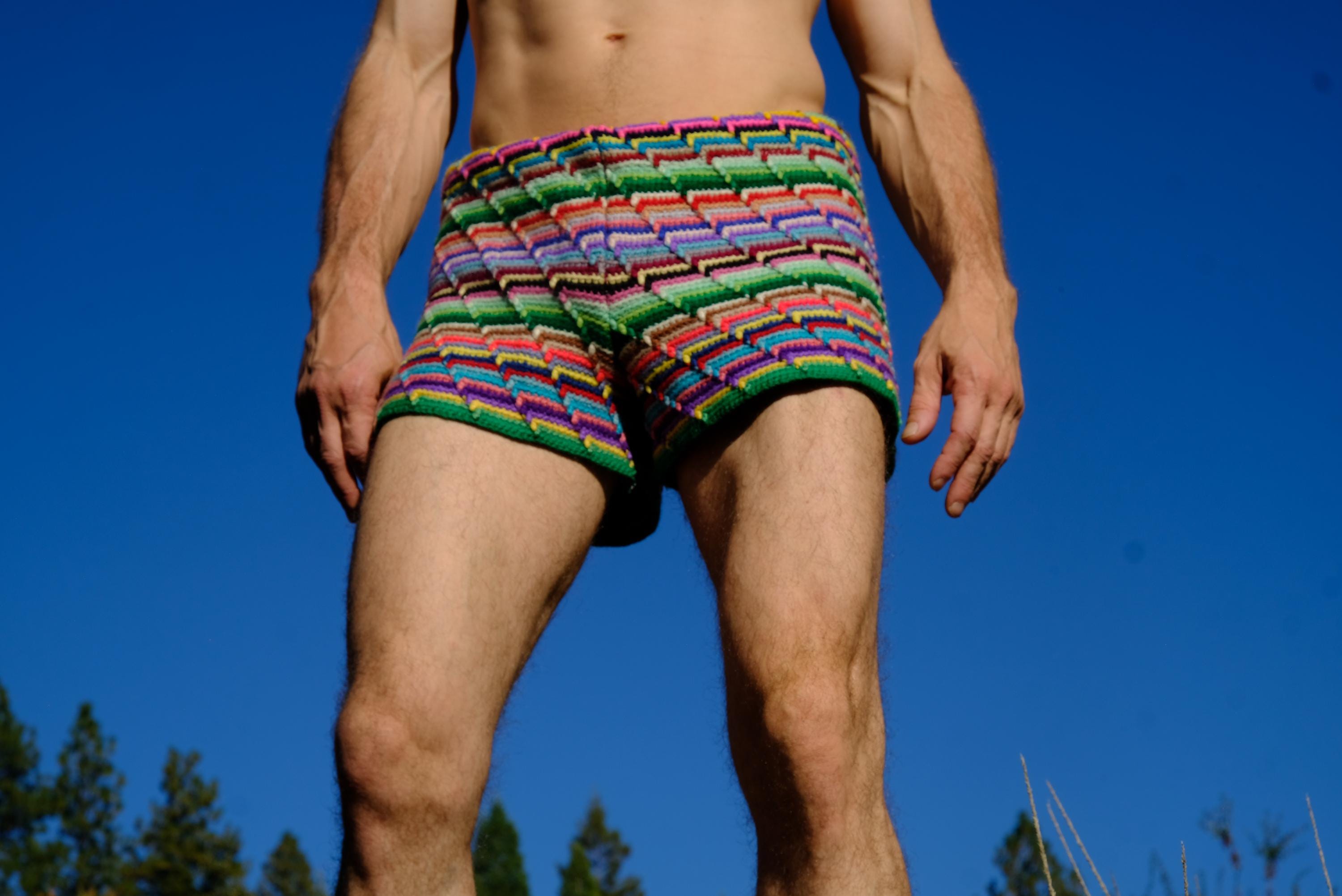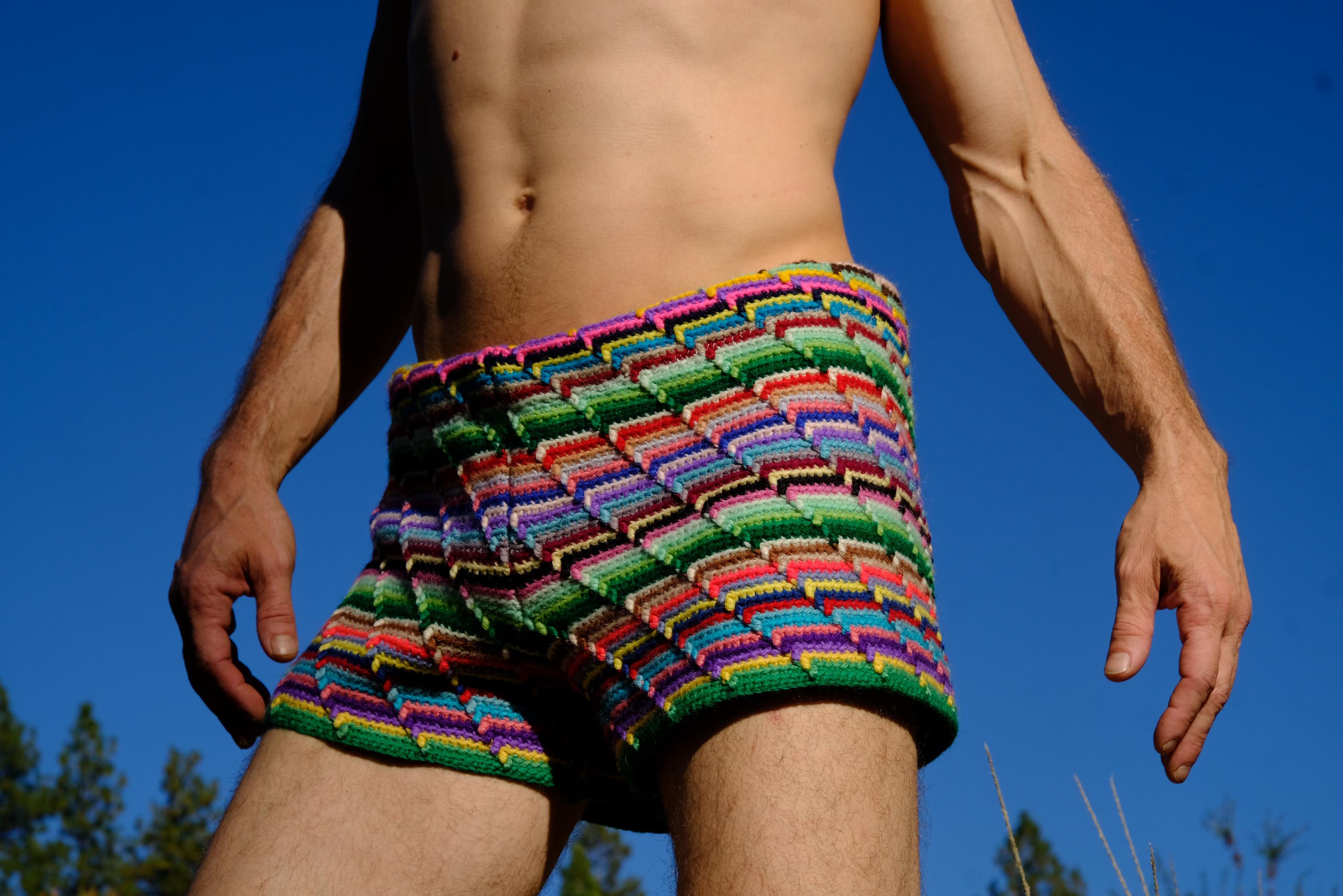 These are crochet shorts with rainbow stripes. Repurposed from a vintage afghan blanket crocheted in 100% acrylic yarn.