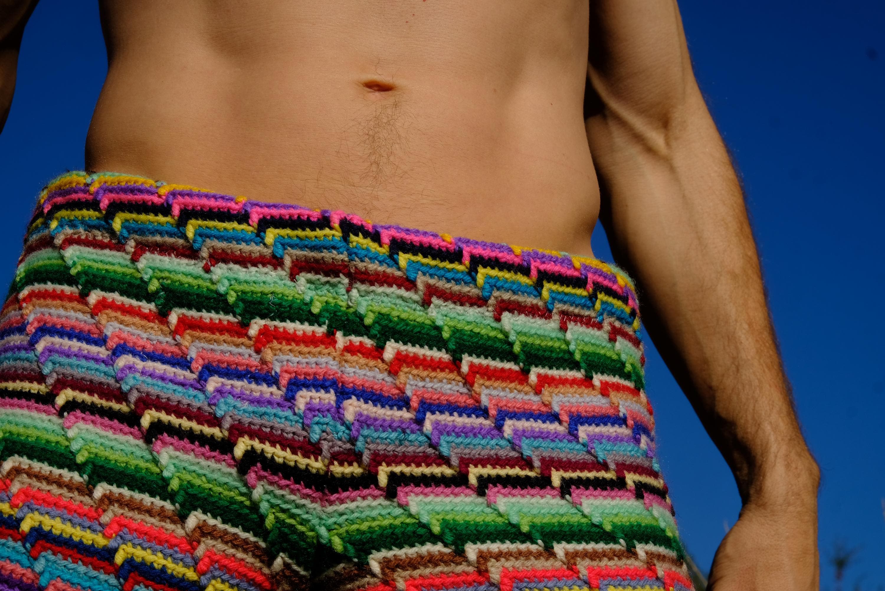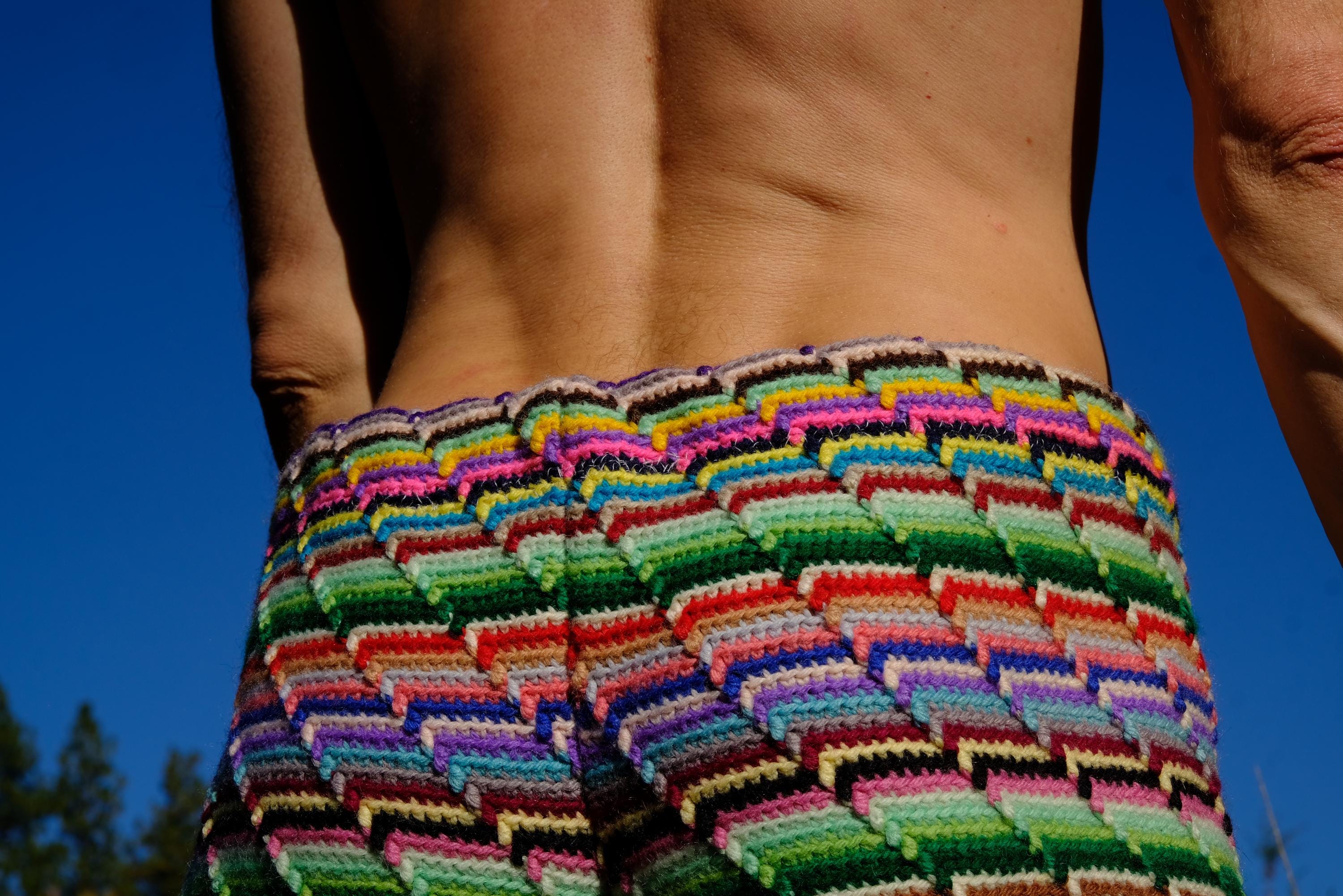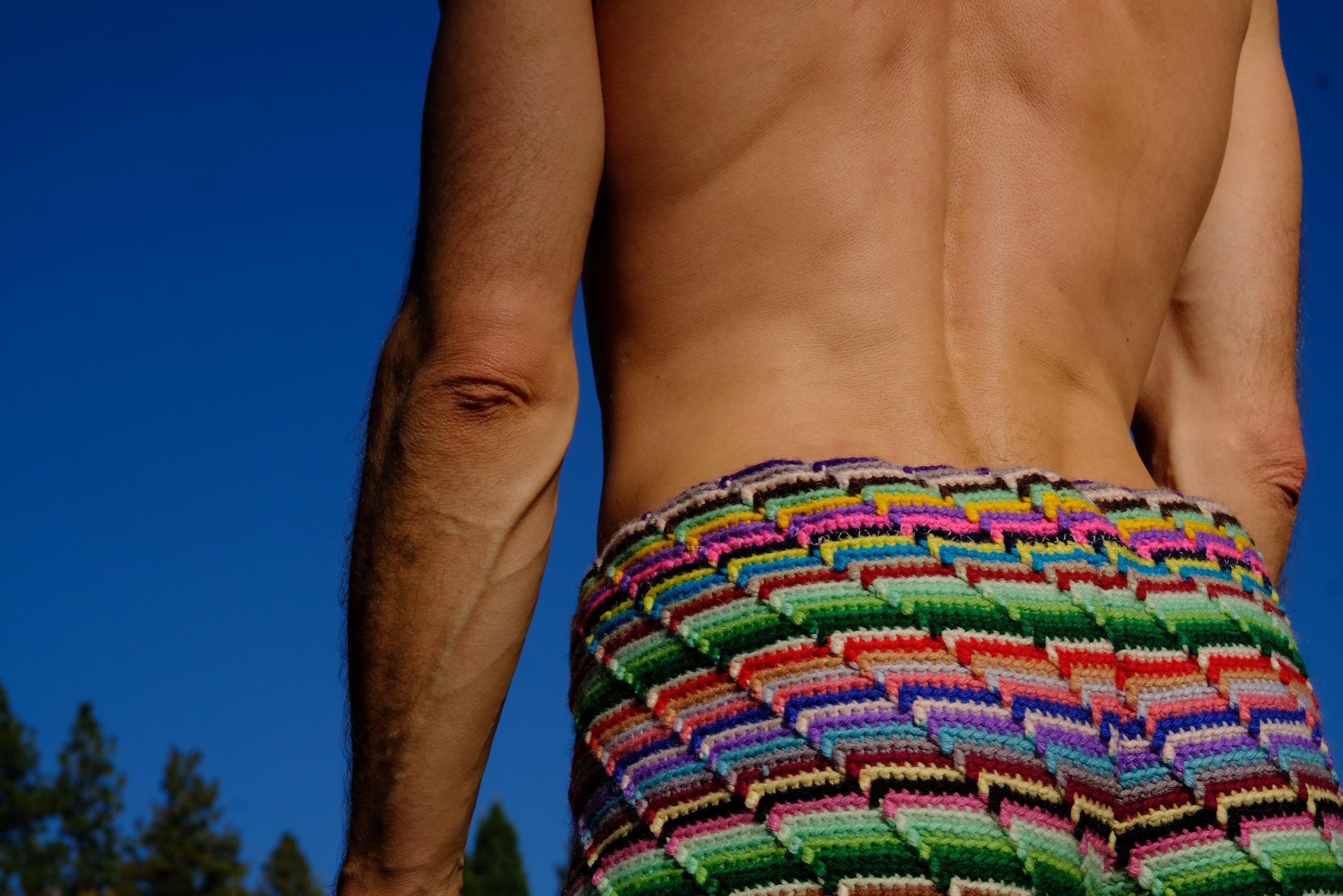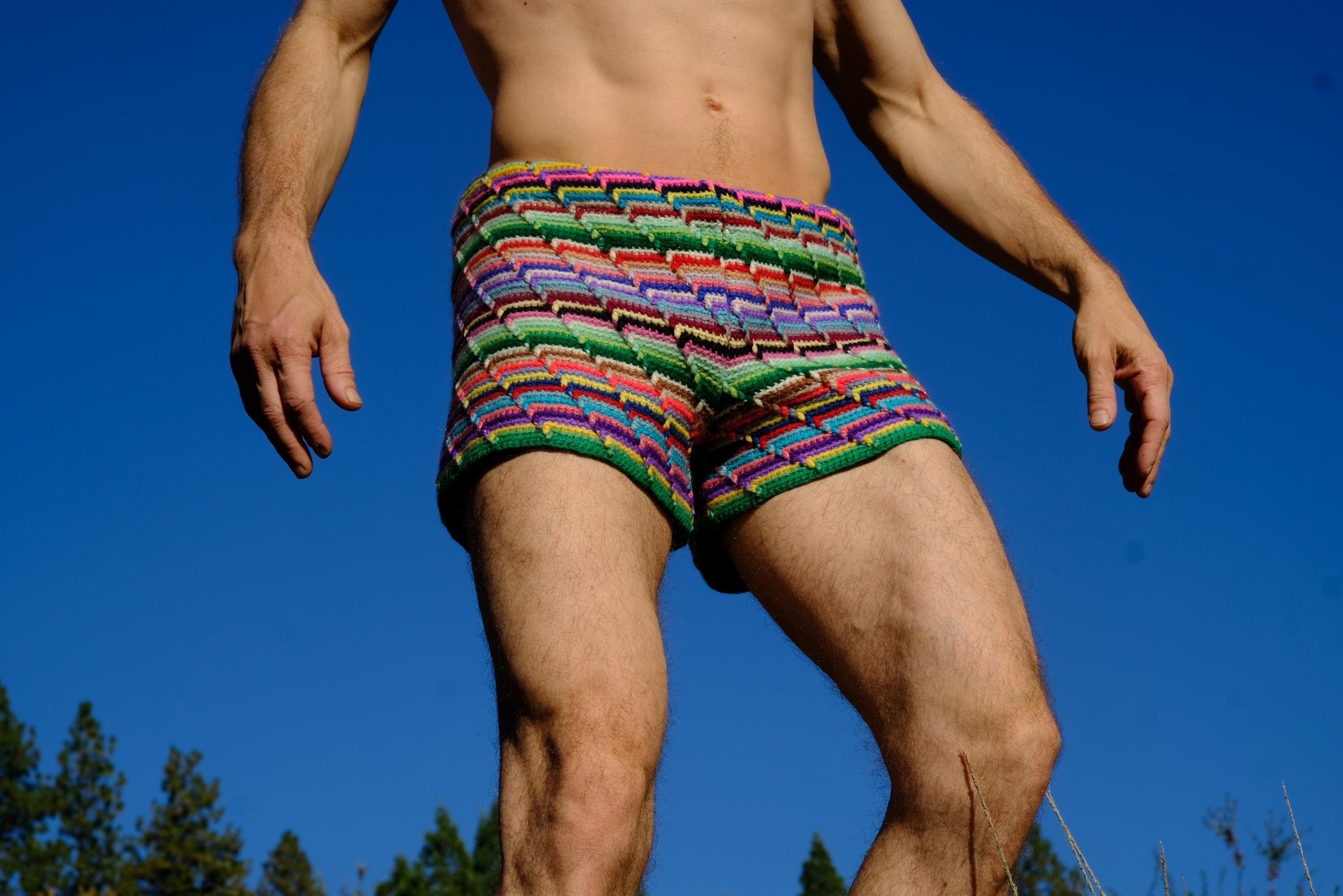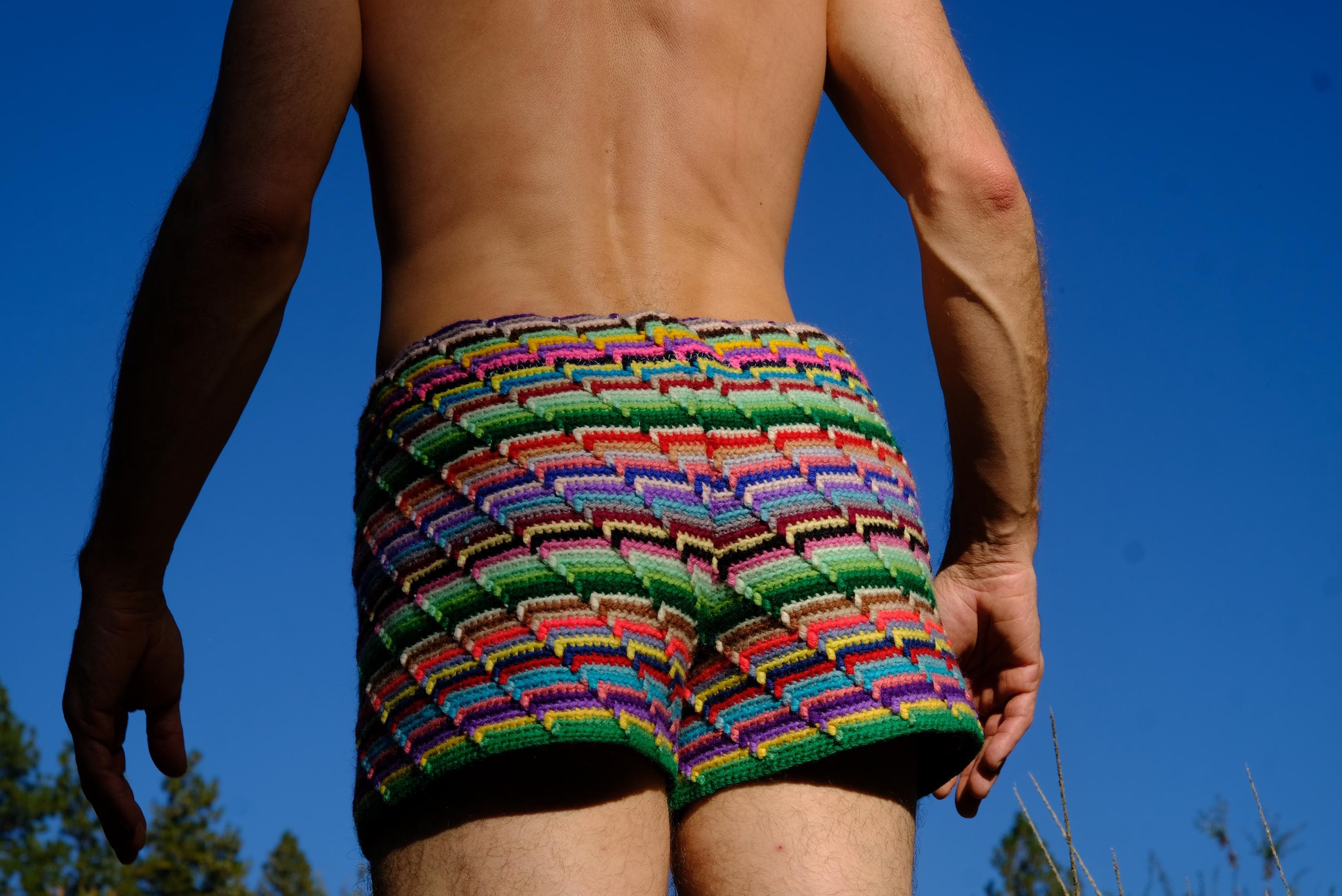 These are crochet shorts with rainbow stripes. Repurposed from a vintage afghan blanket crocheted in 100% acrylic yarn.