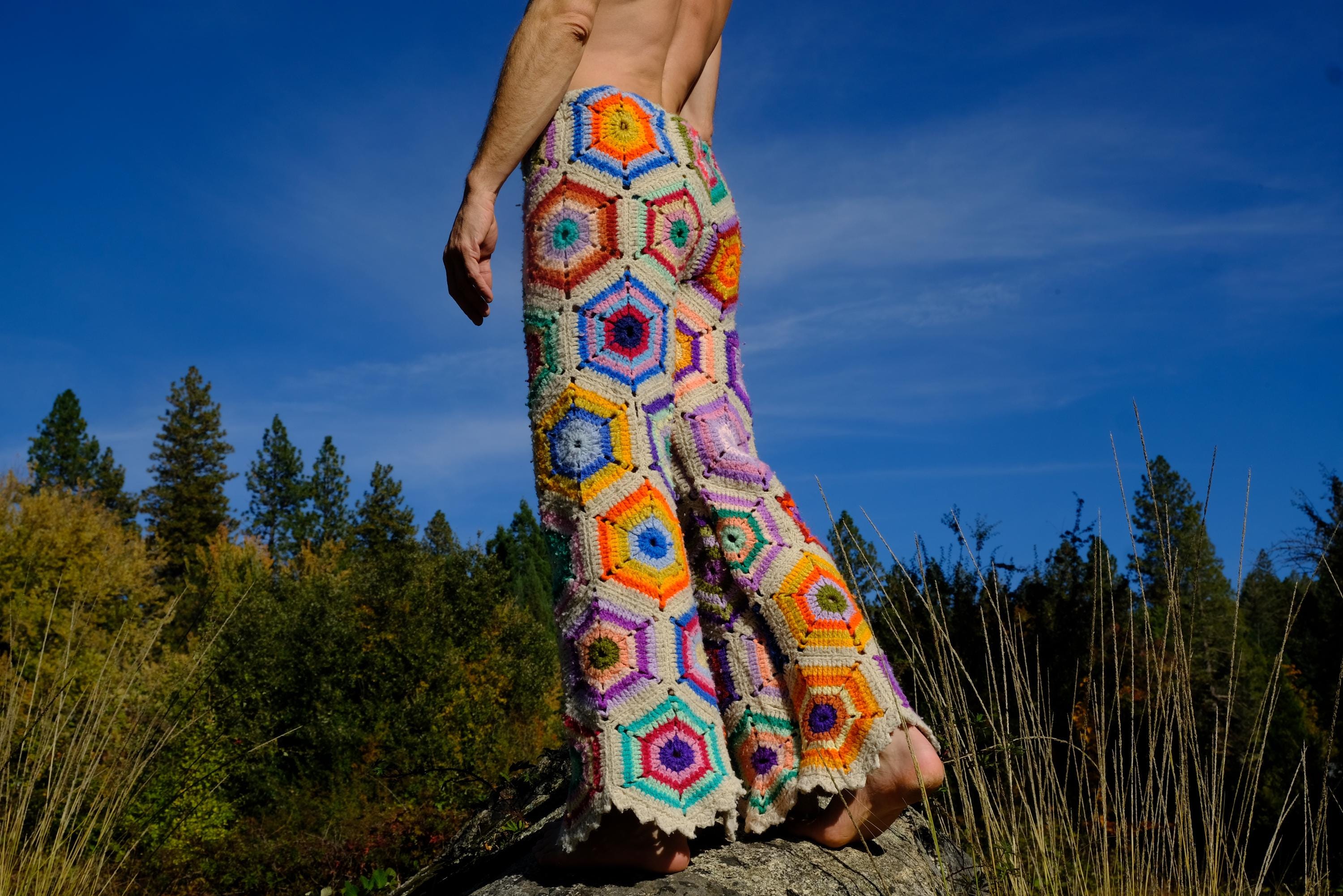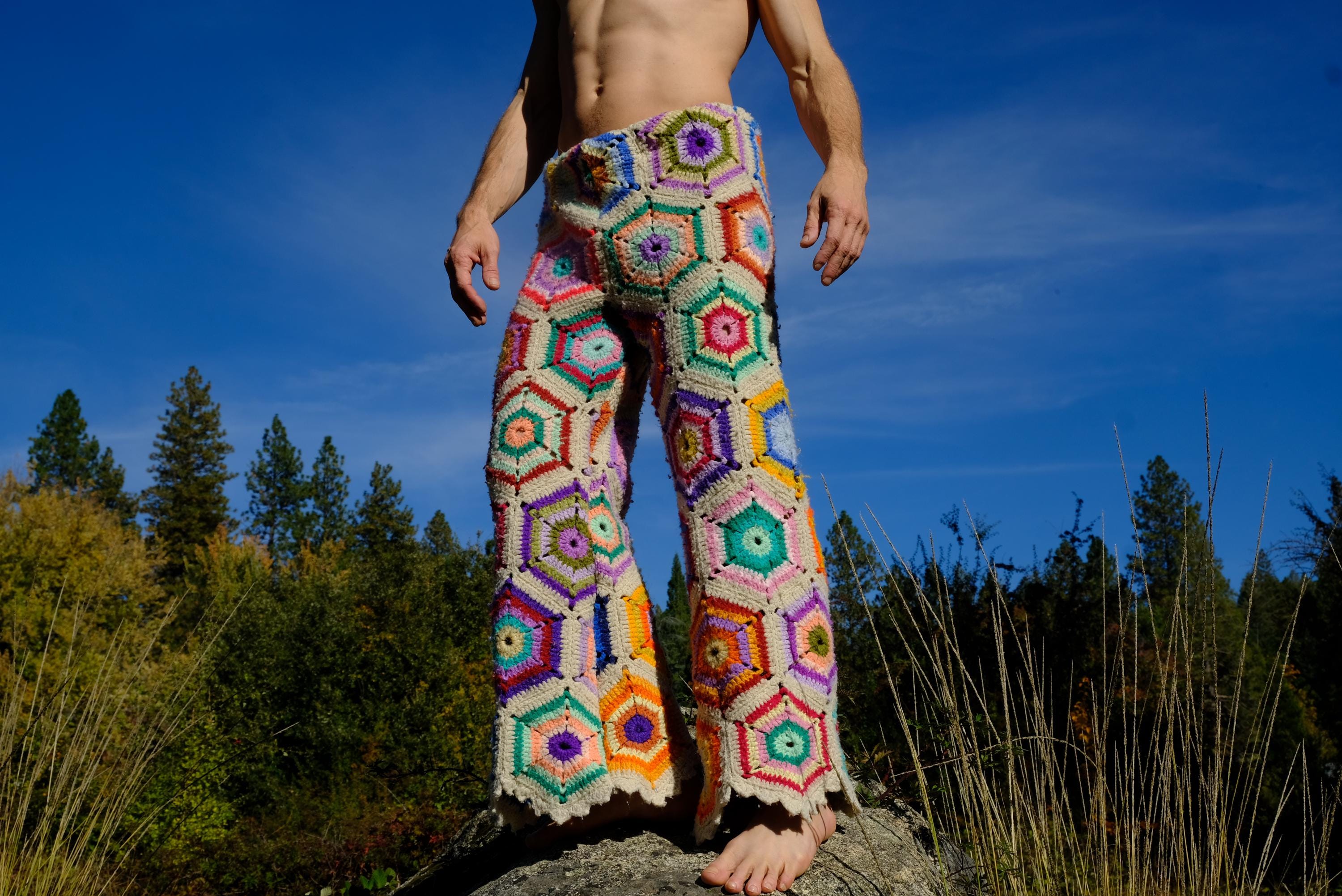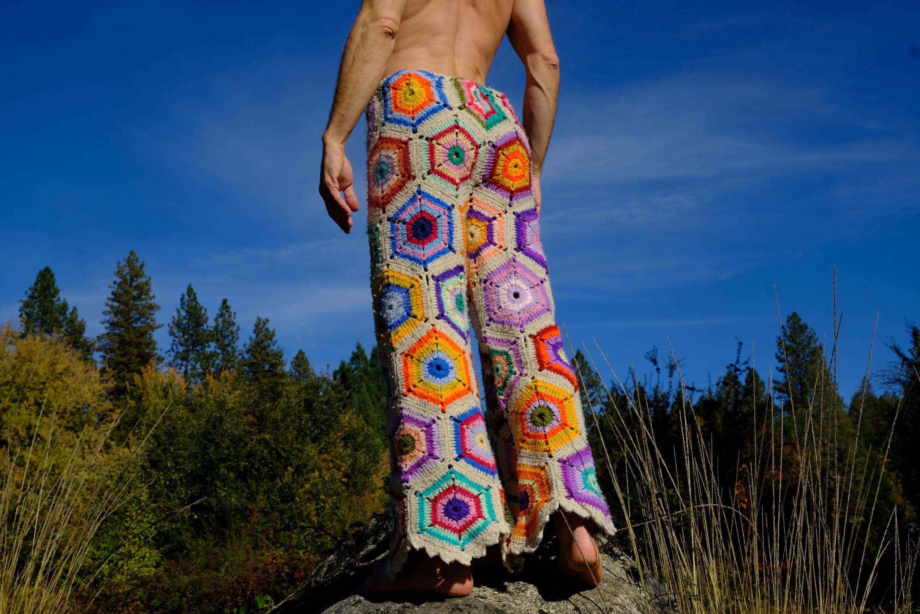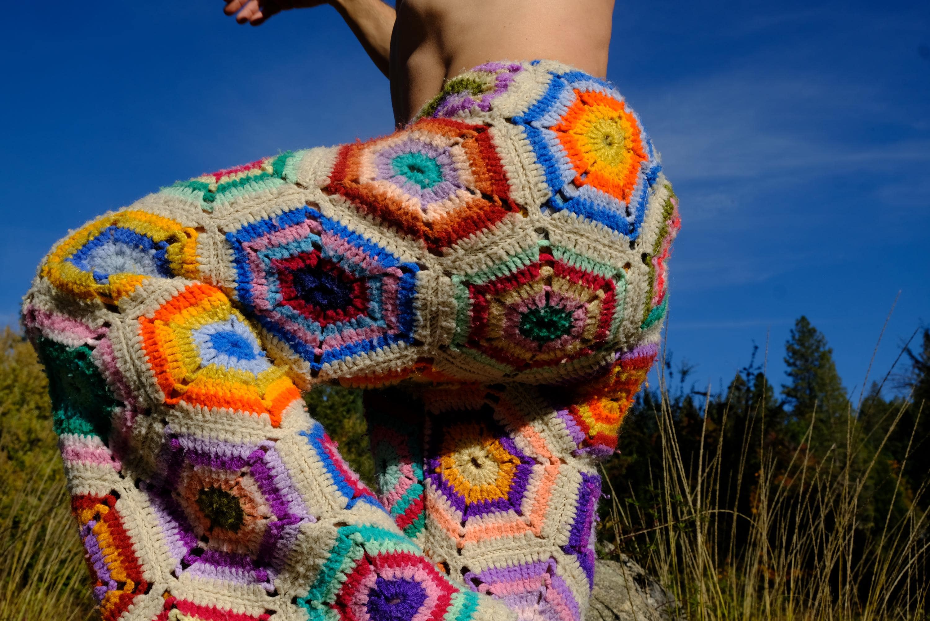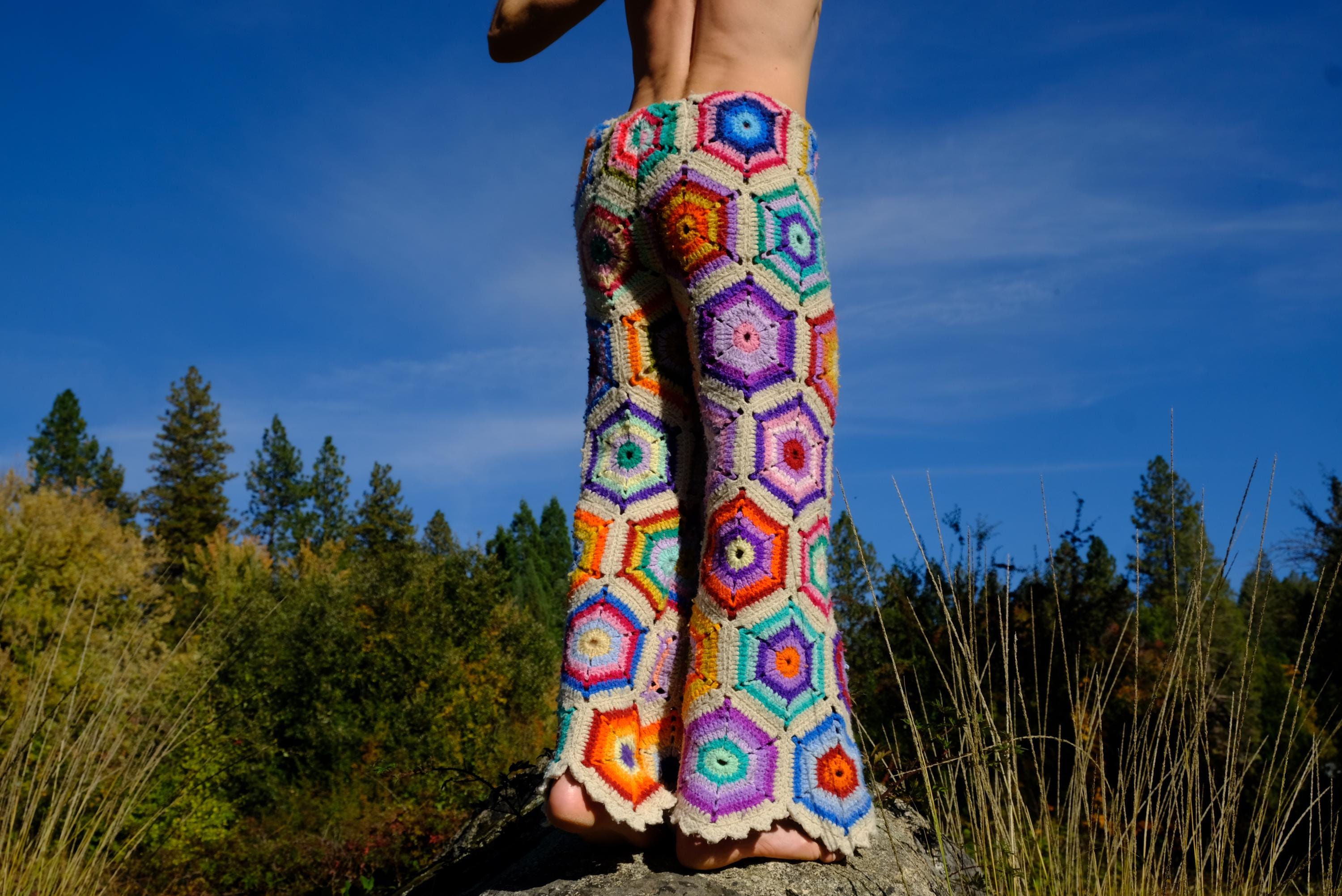 These are crochet pants with multicolor bullseye hexagons. Fashioned from a vintage afghan blanket crocheted in 100% acrylic yarn.