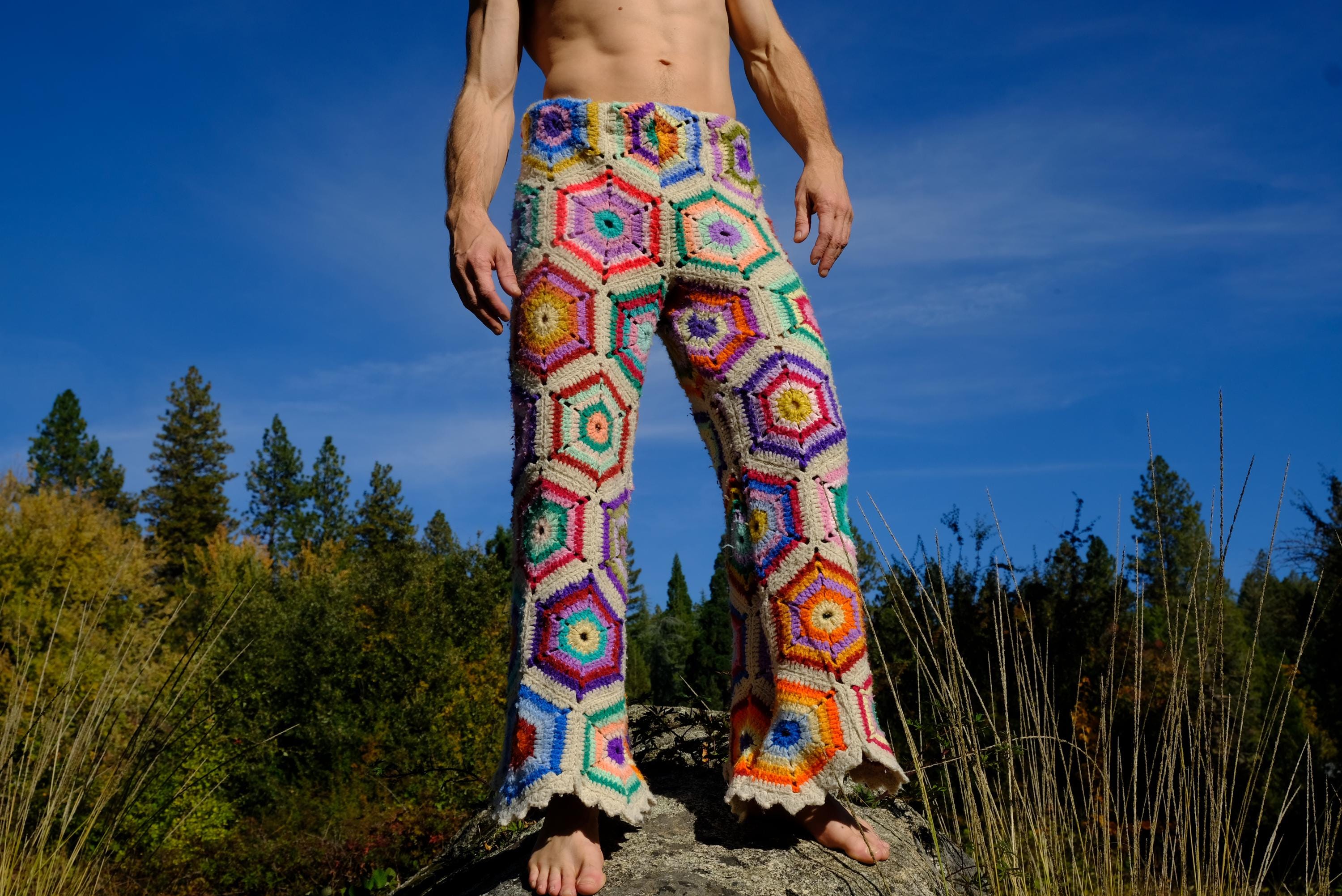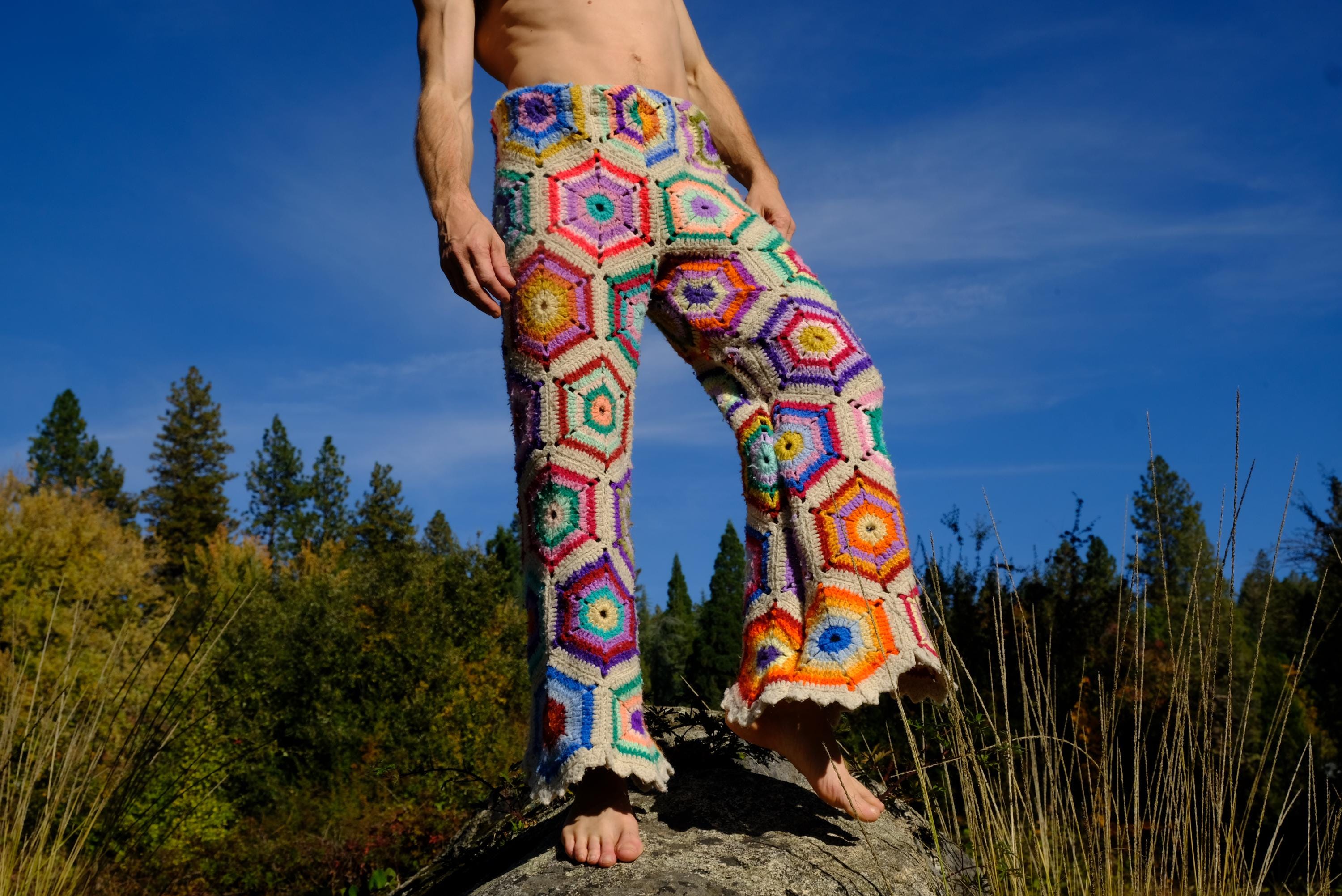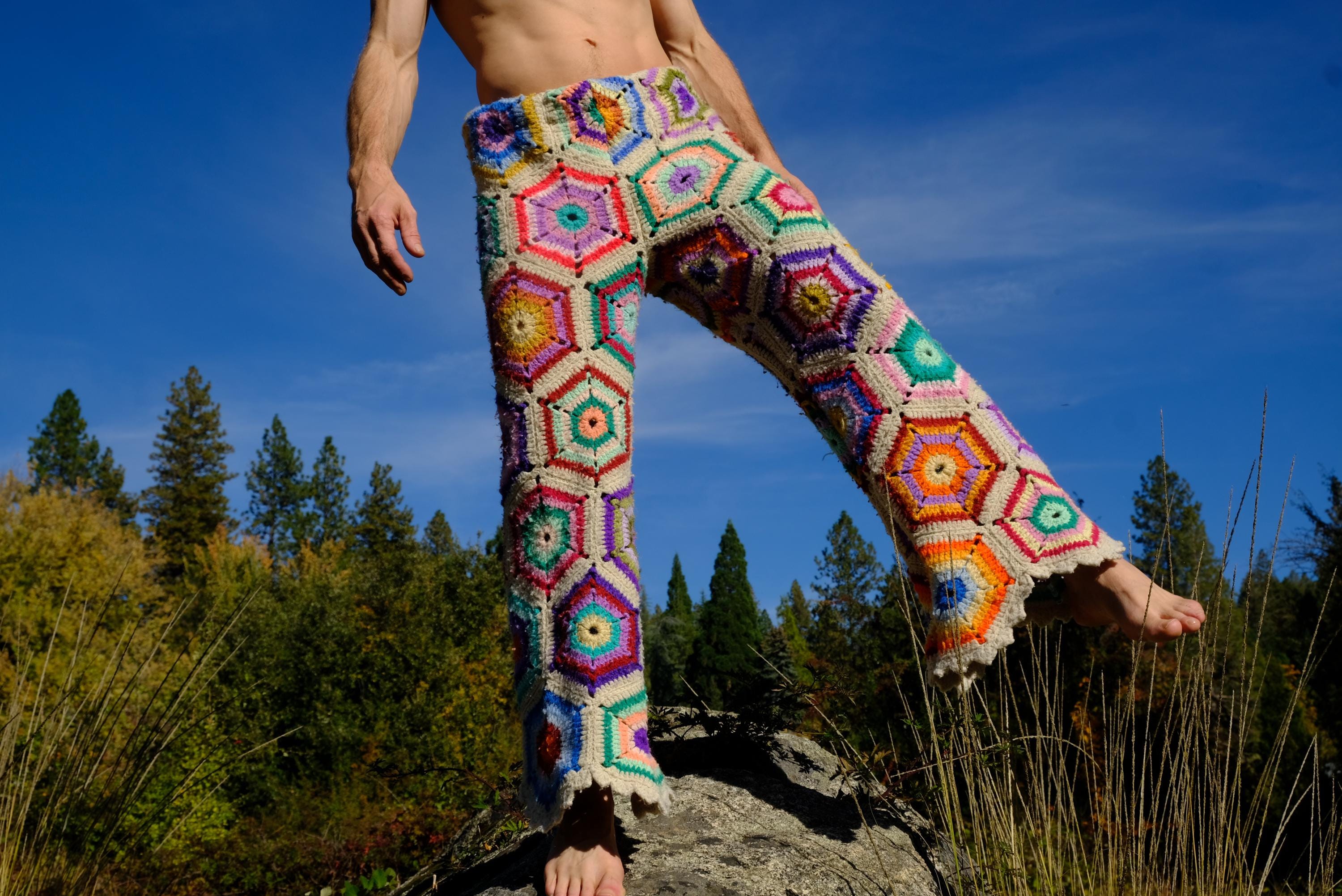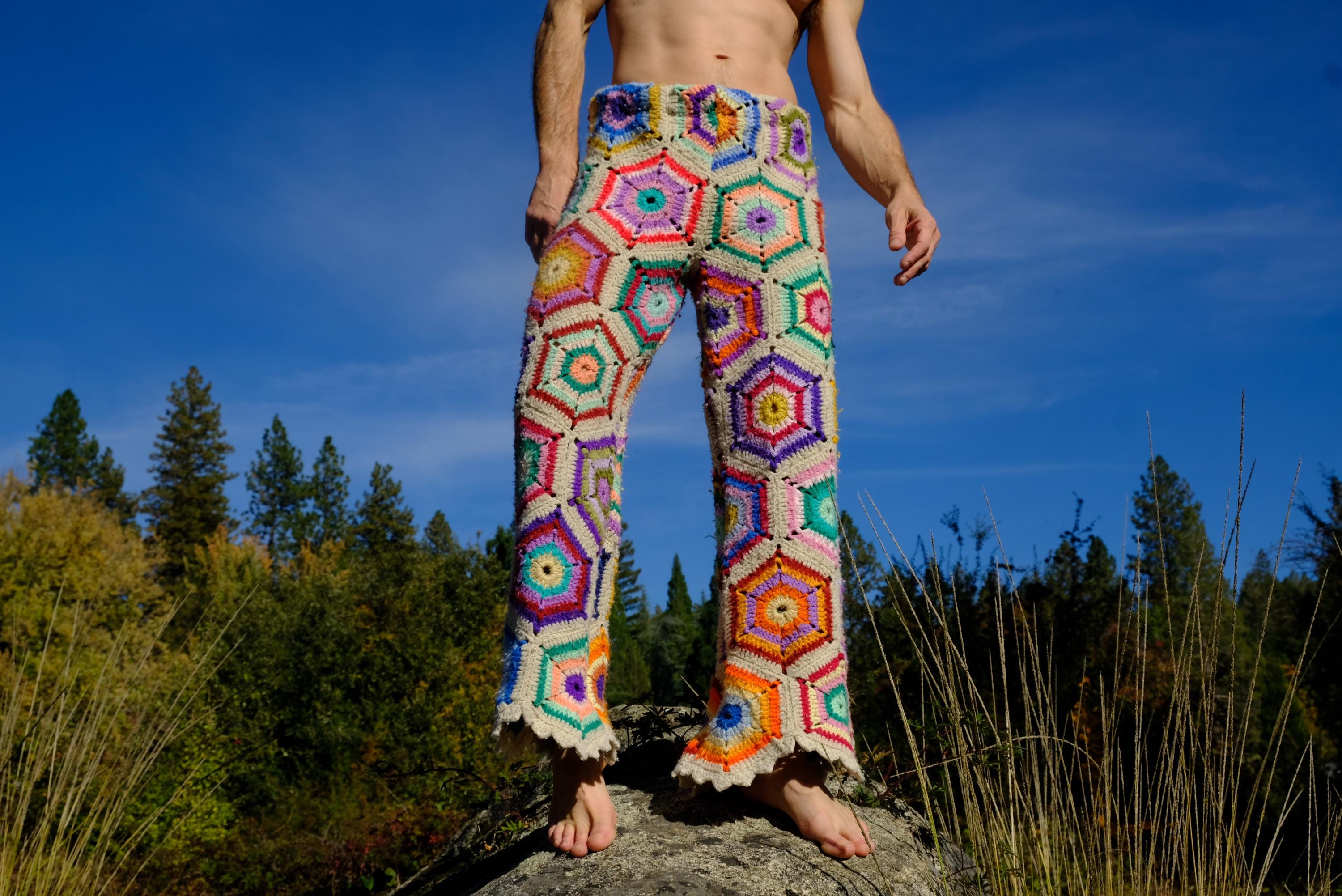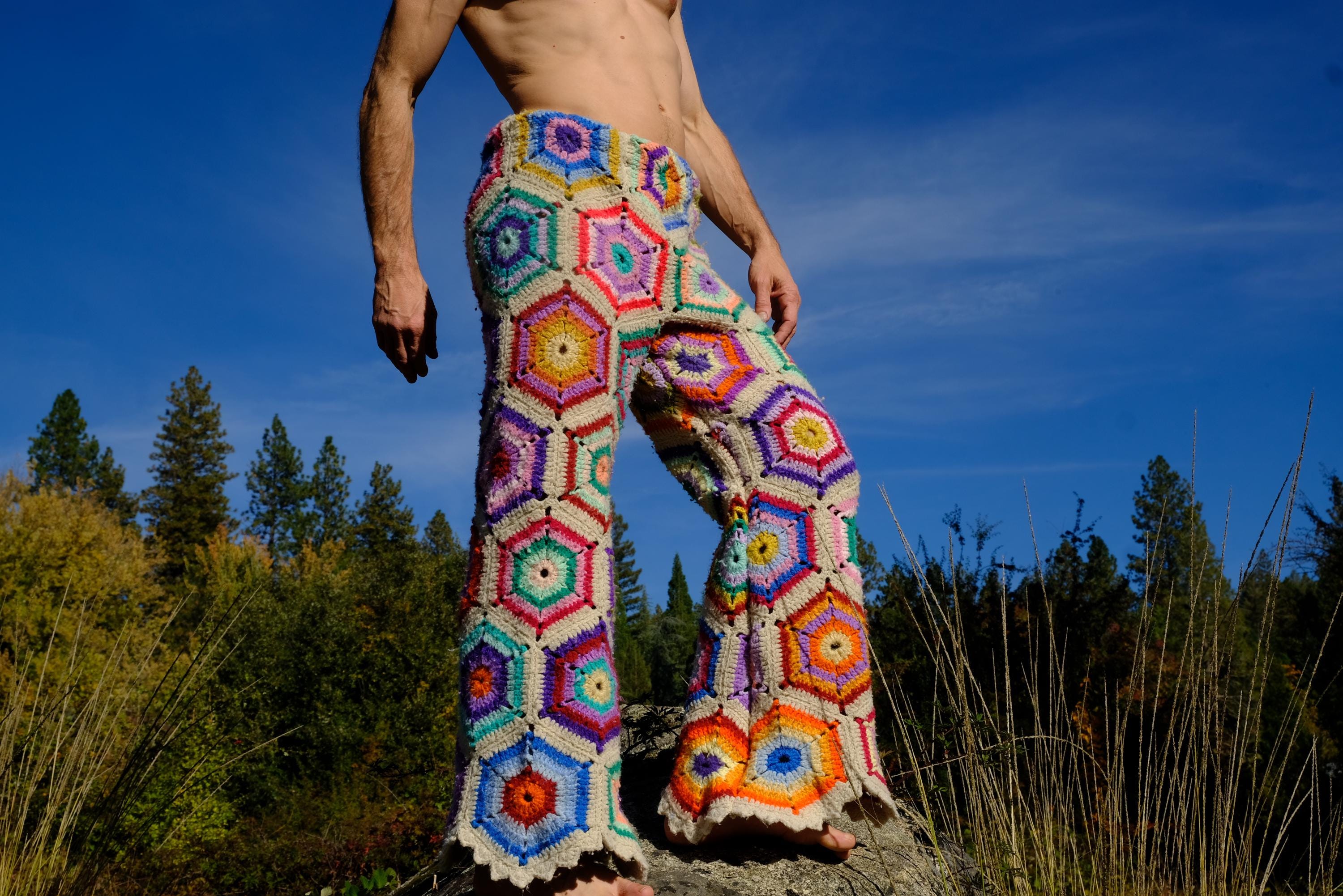 These are crochet pants with multicolor bullseye hexagons. Fashioned from a vintage afghan blanket crocheted in 100% acrylic yarn.