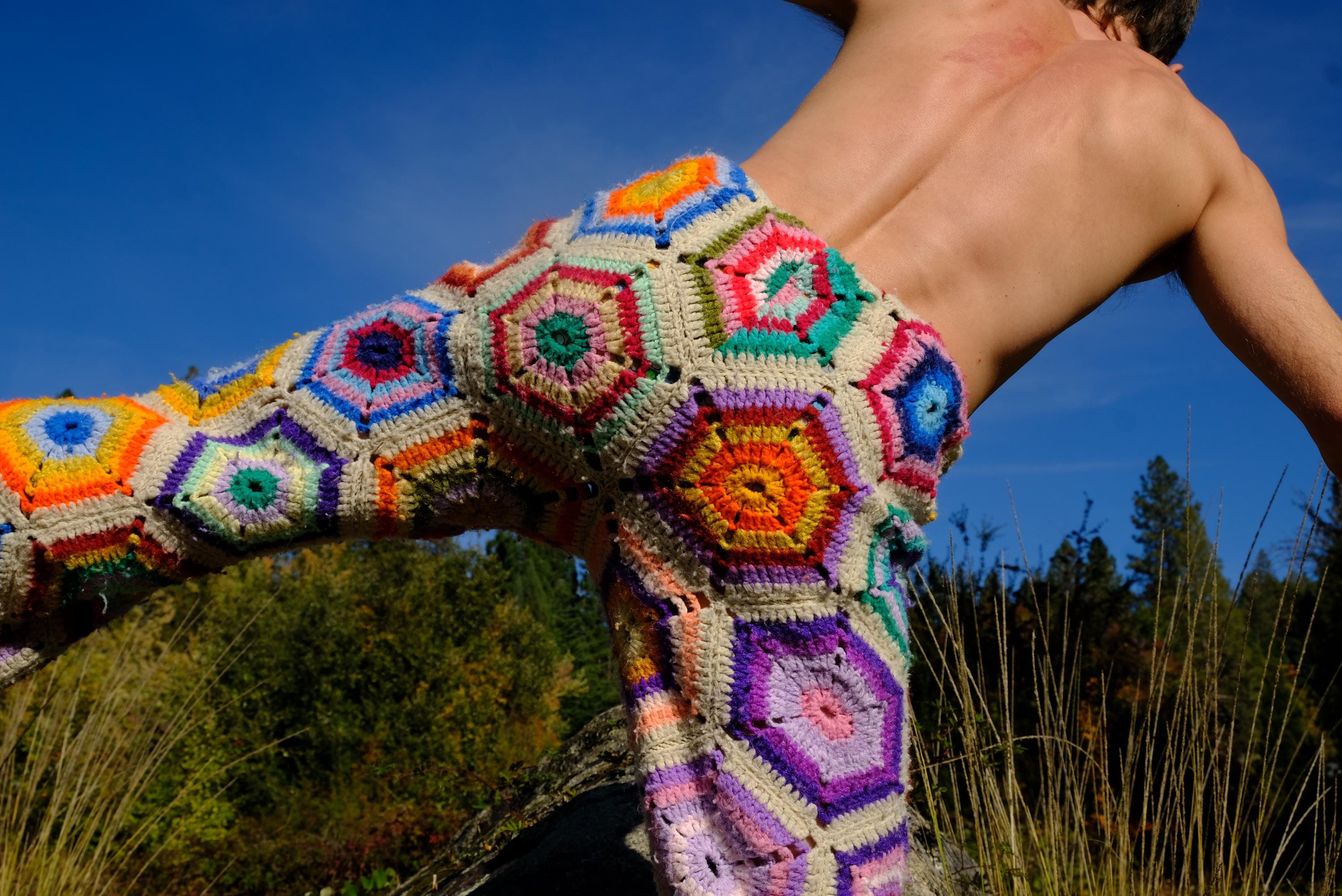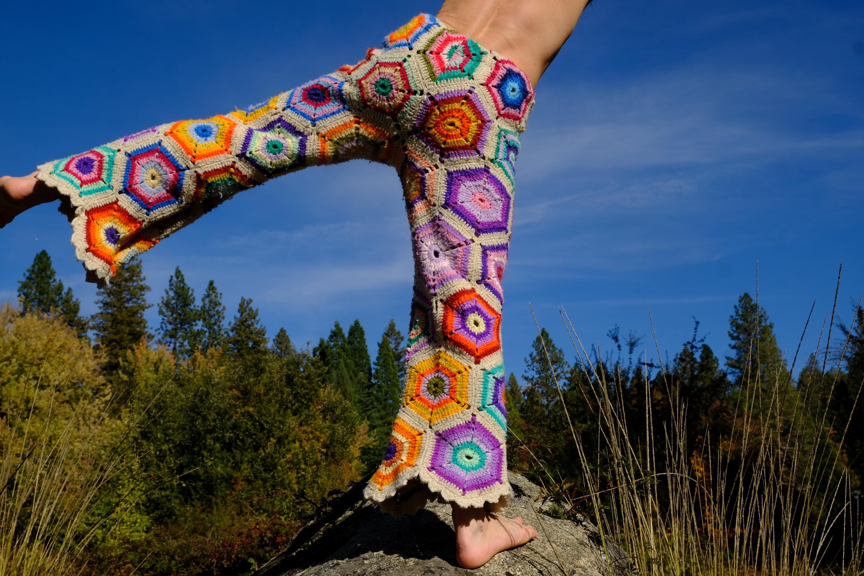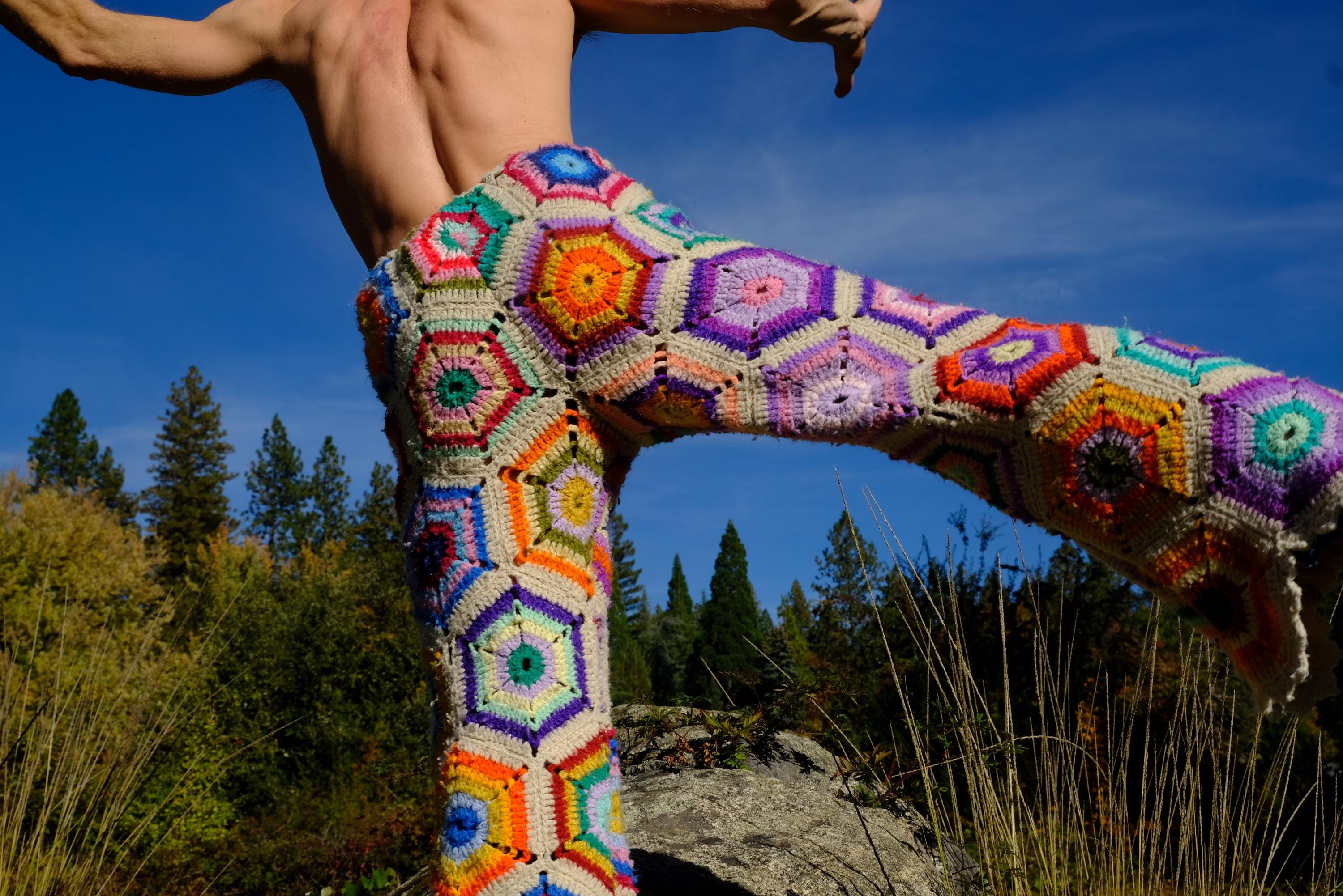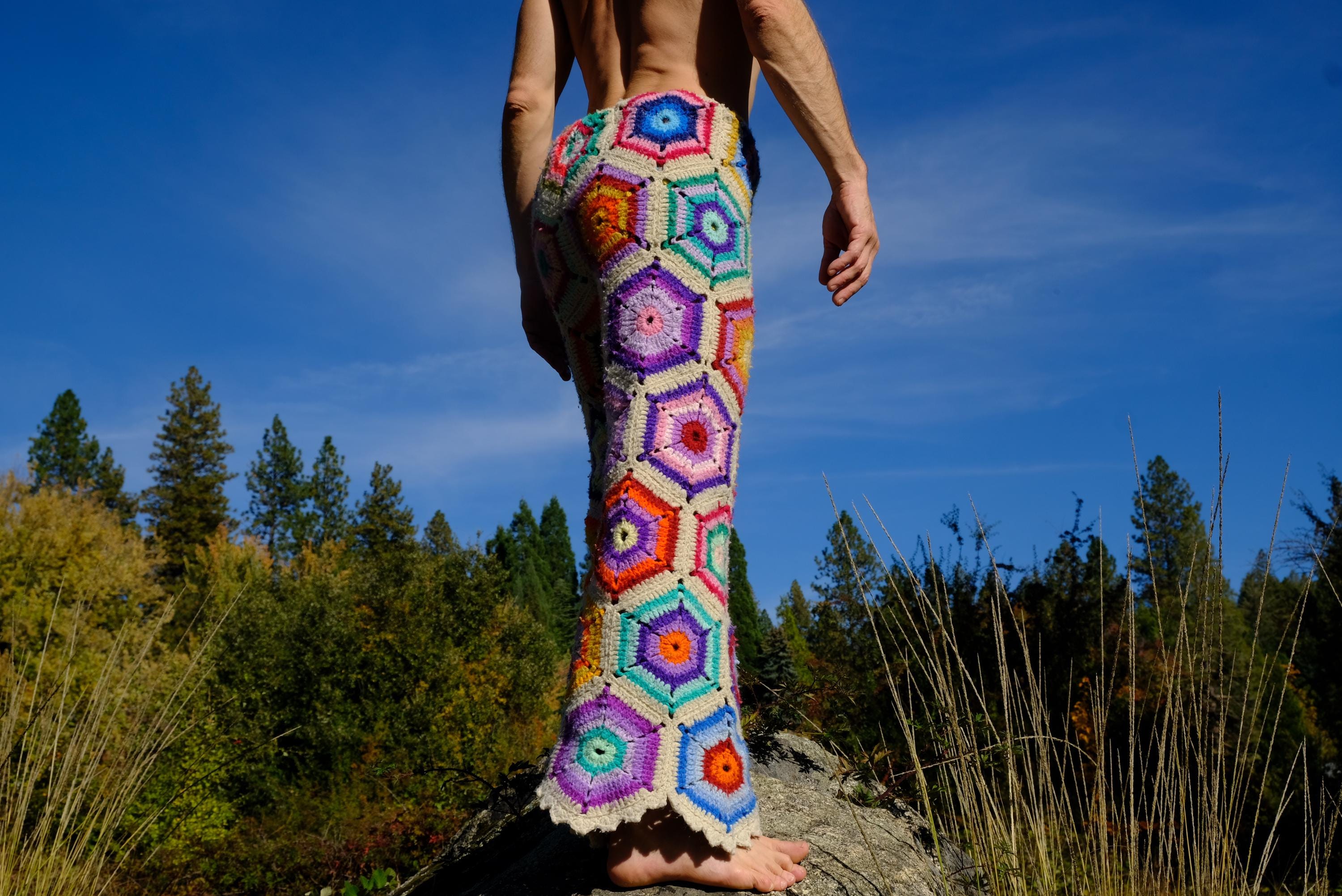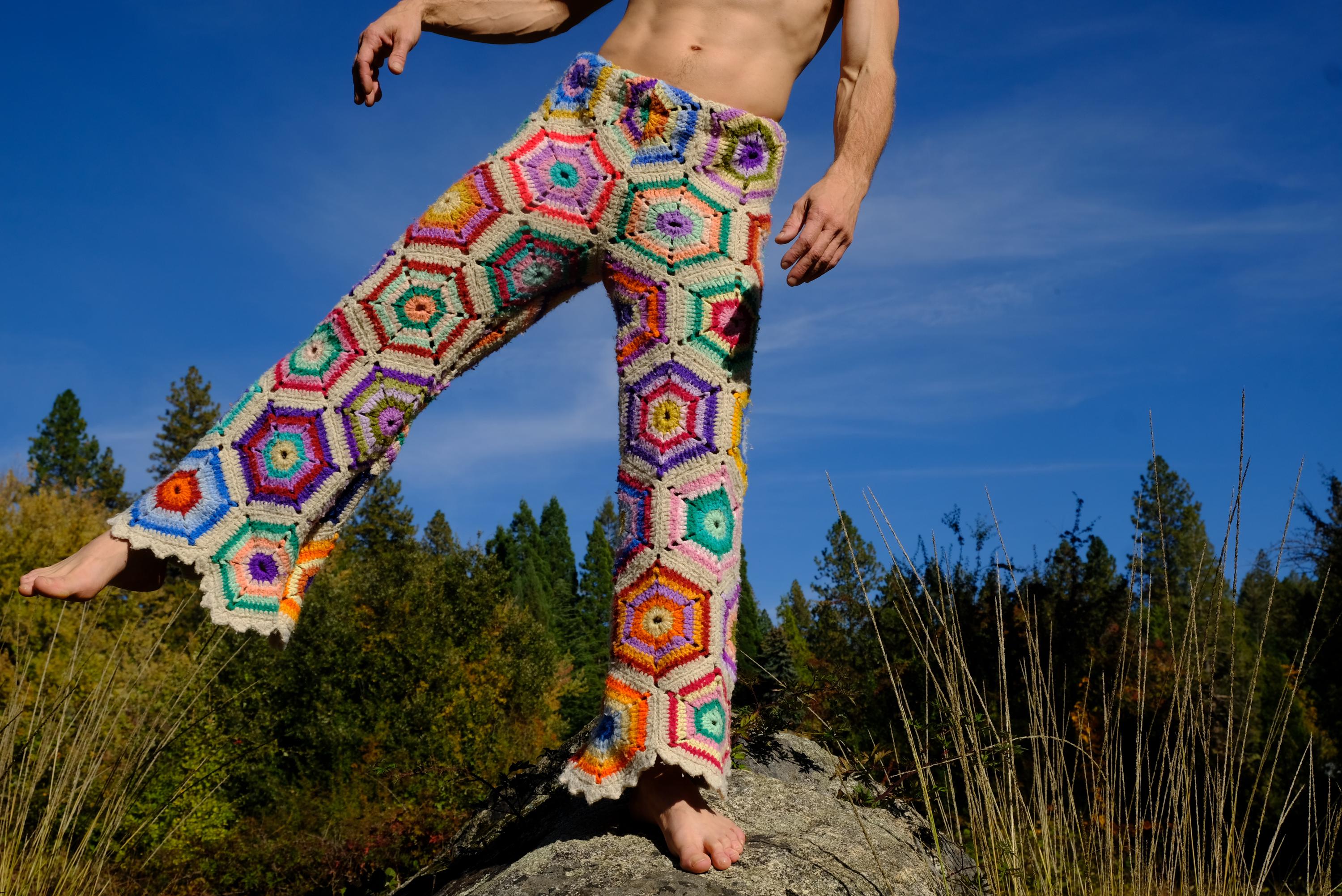 These are crochet pants with multicolor bullseye hexagons. Fashioned from a vintage afghan blanket crocheted in 100% acrylic yarn.