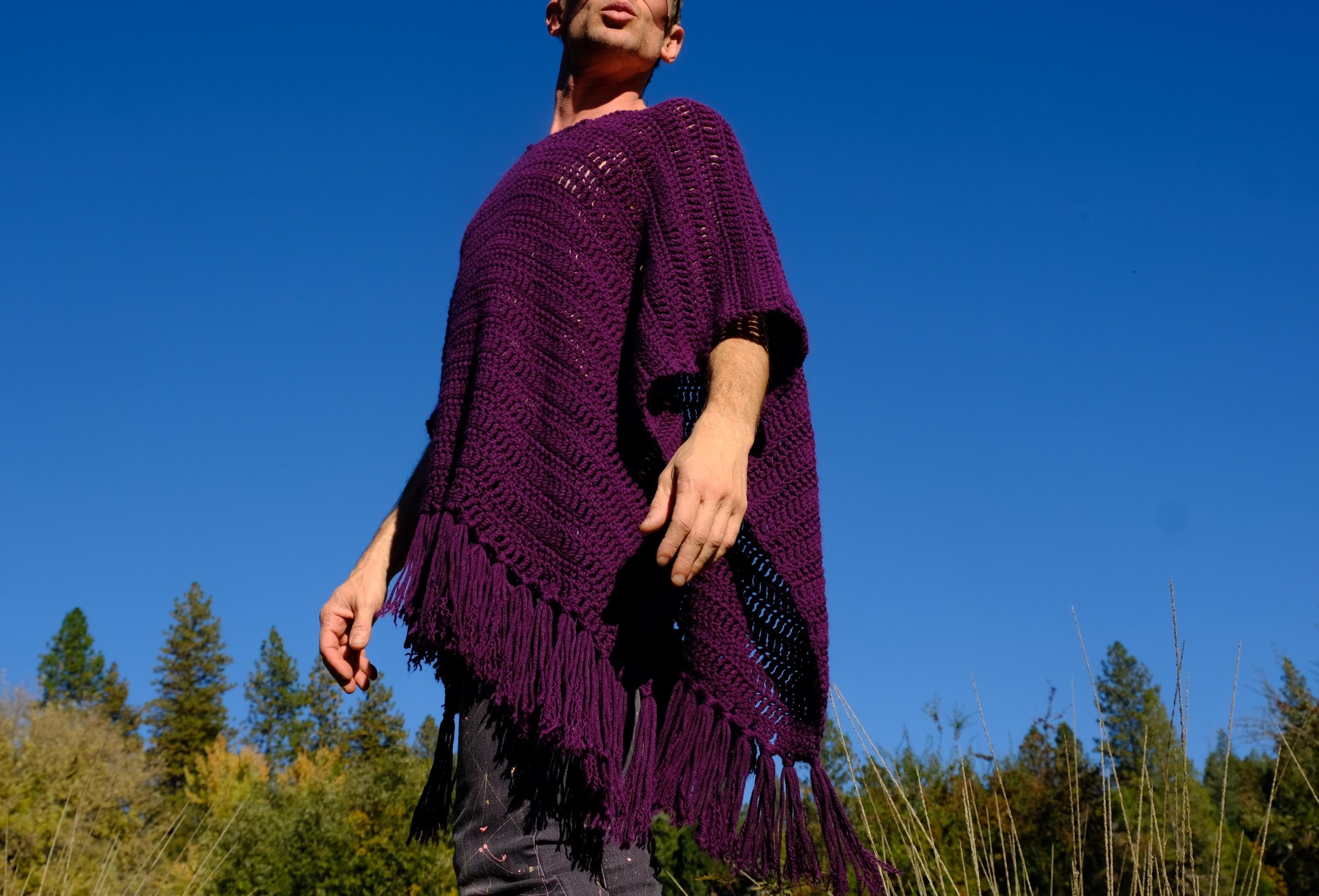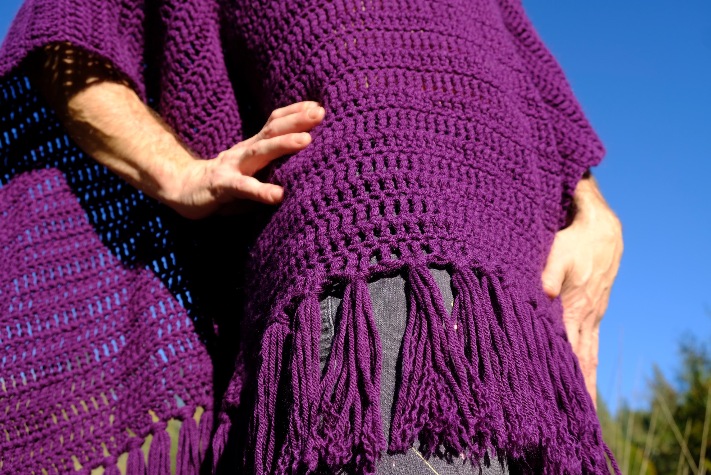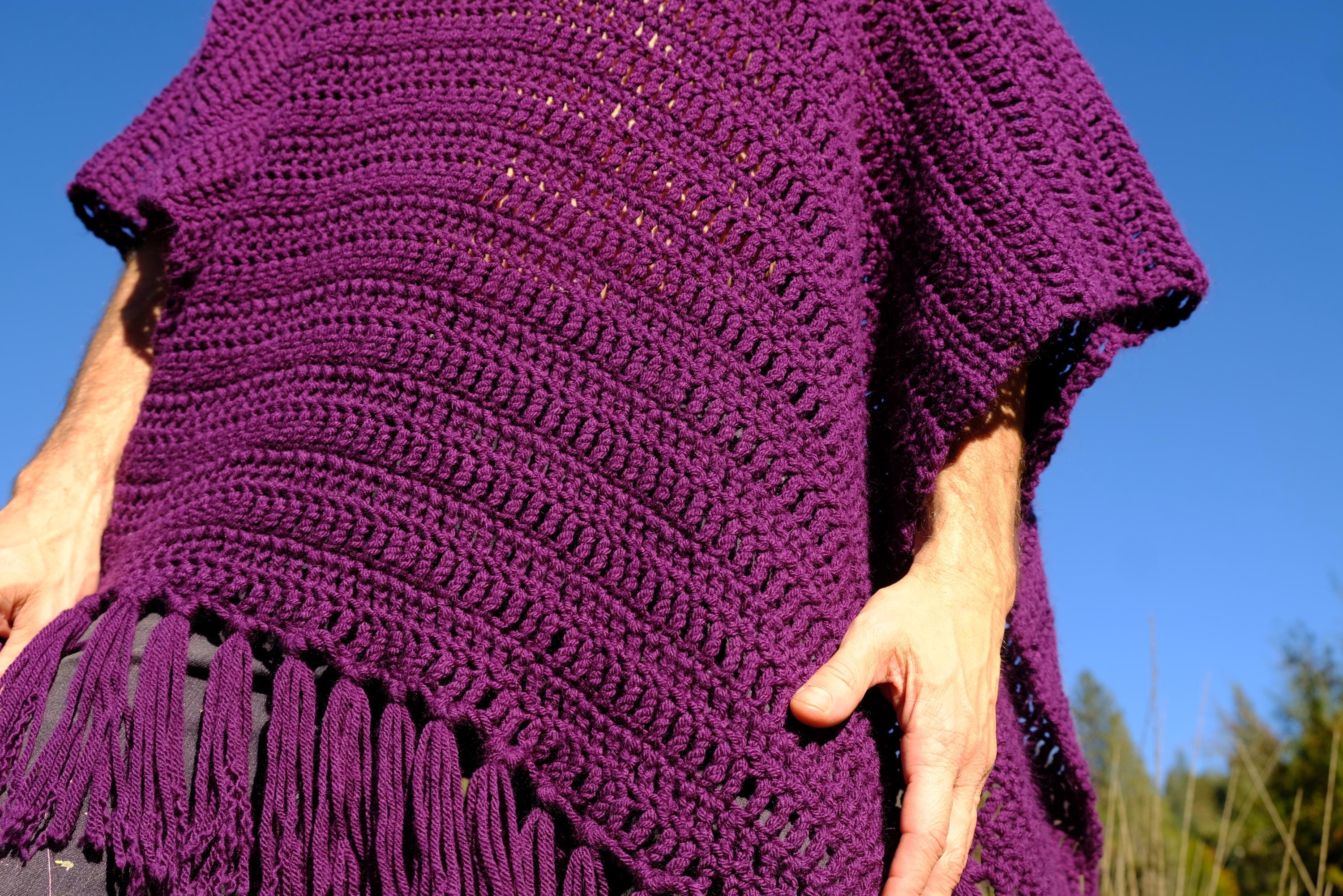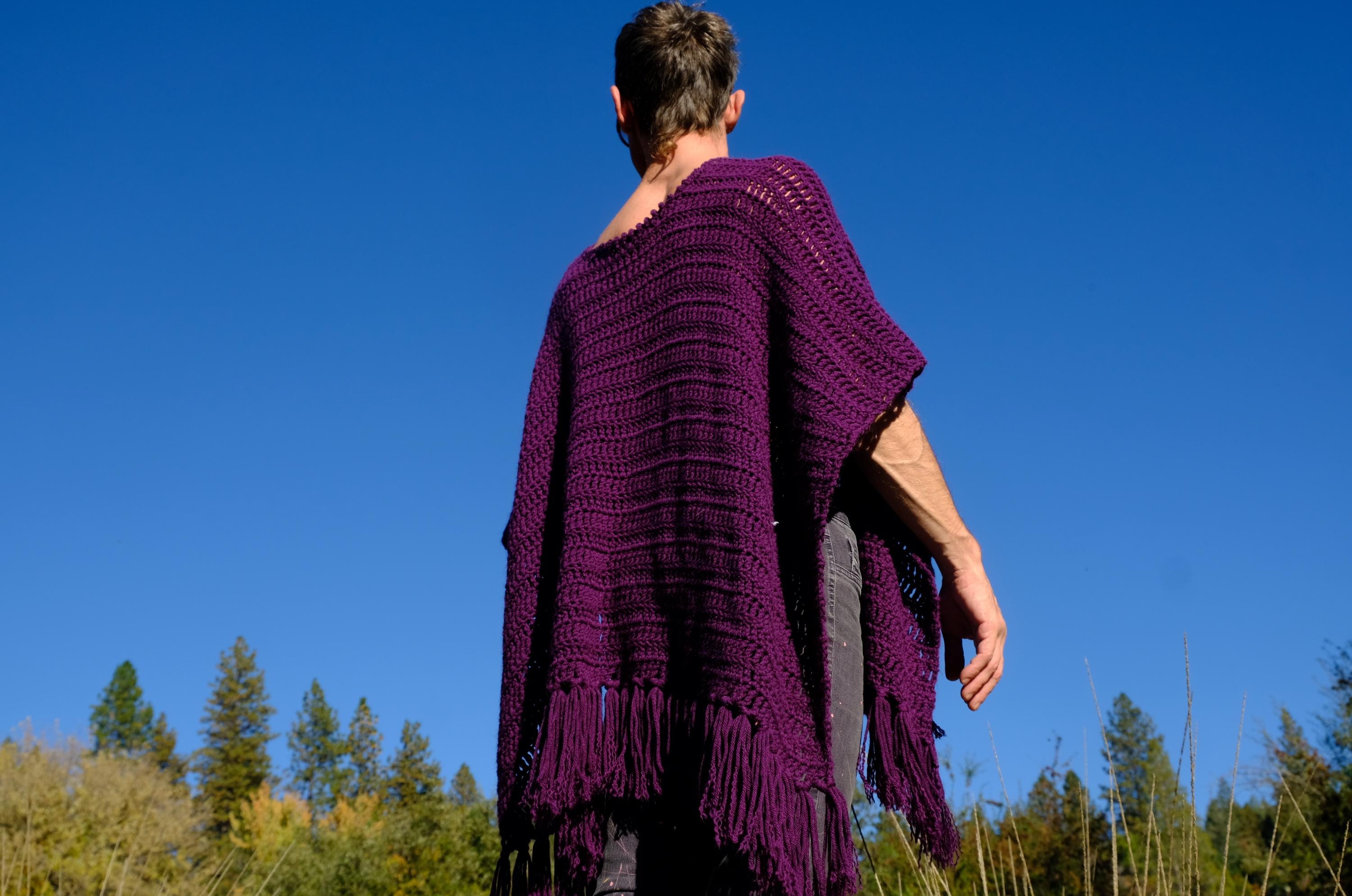 This is a crochet poncho in deep burgundy with fringe. Repurposed from an afghan blanket in 100 % acrylic yarn and hand stitched by yours truly, Lord von Schmitt.
