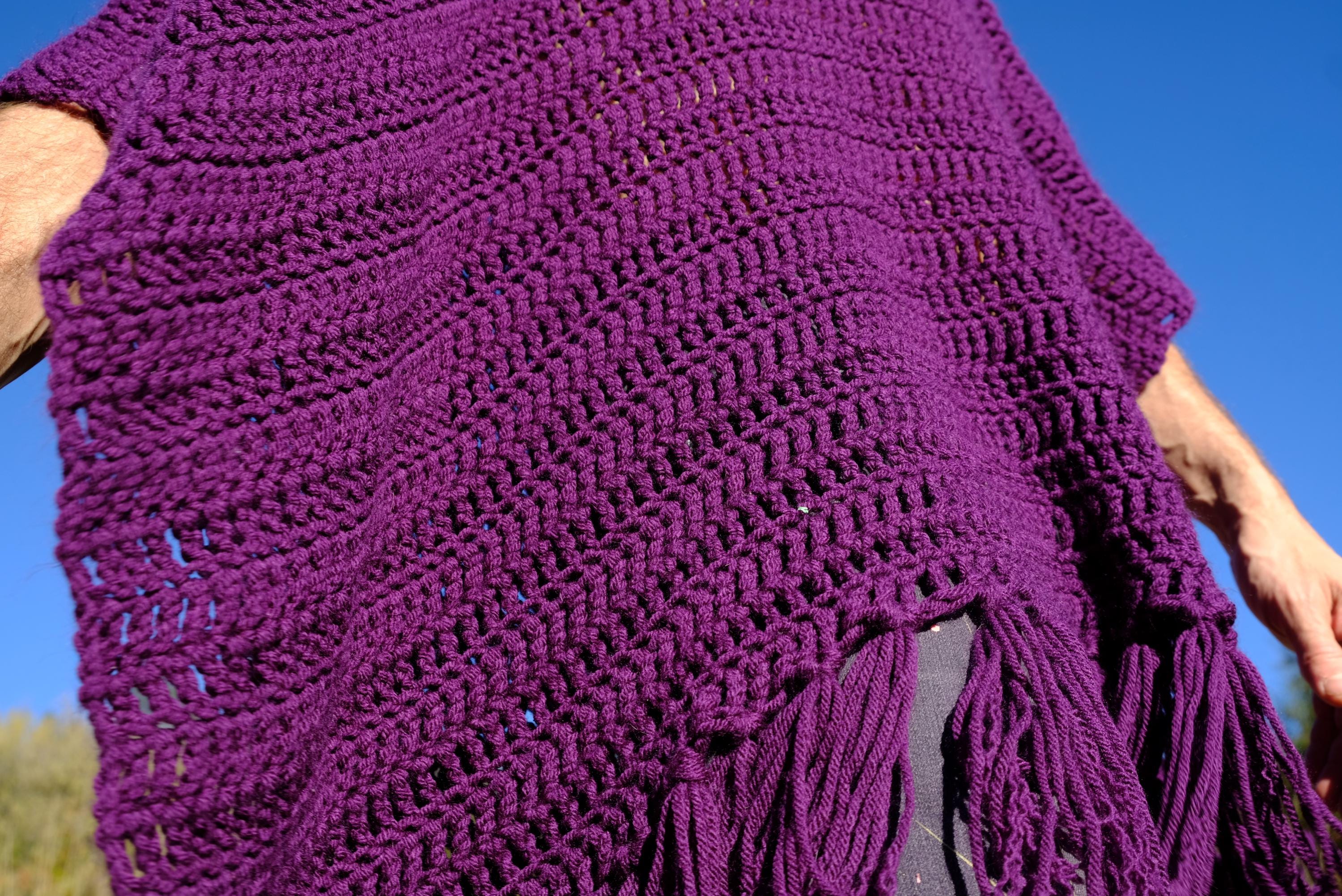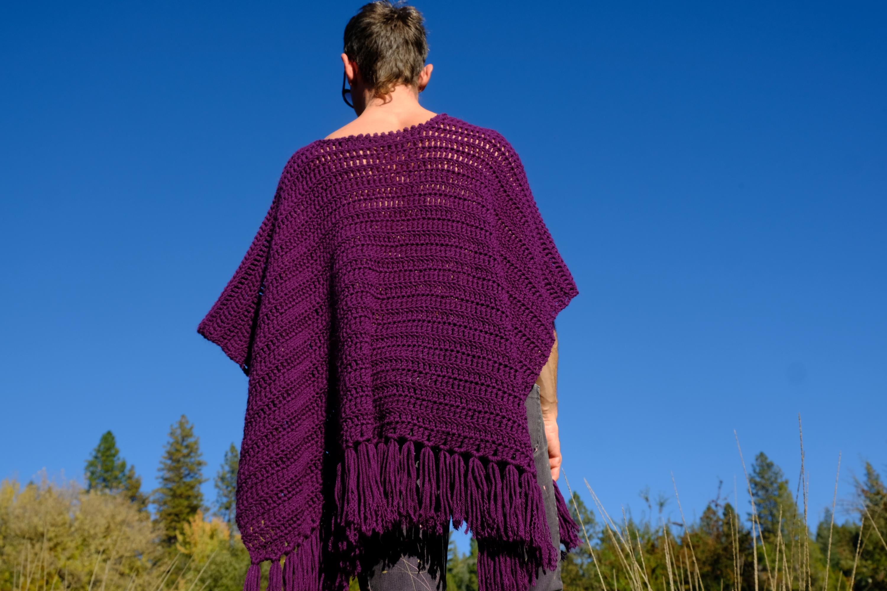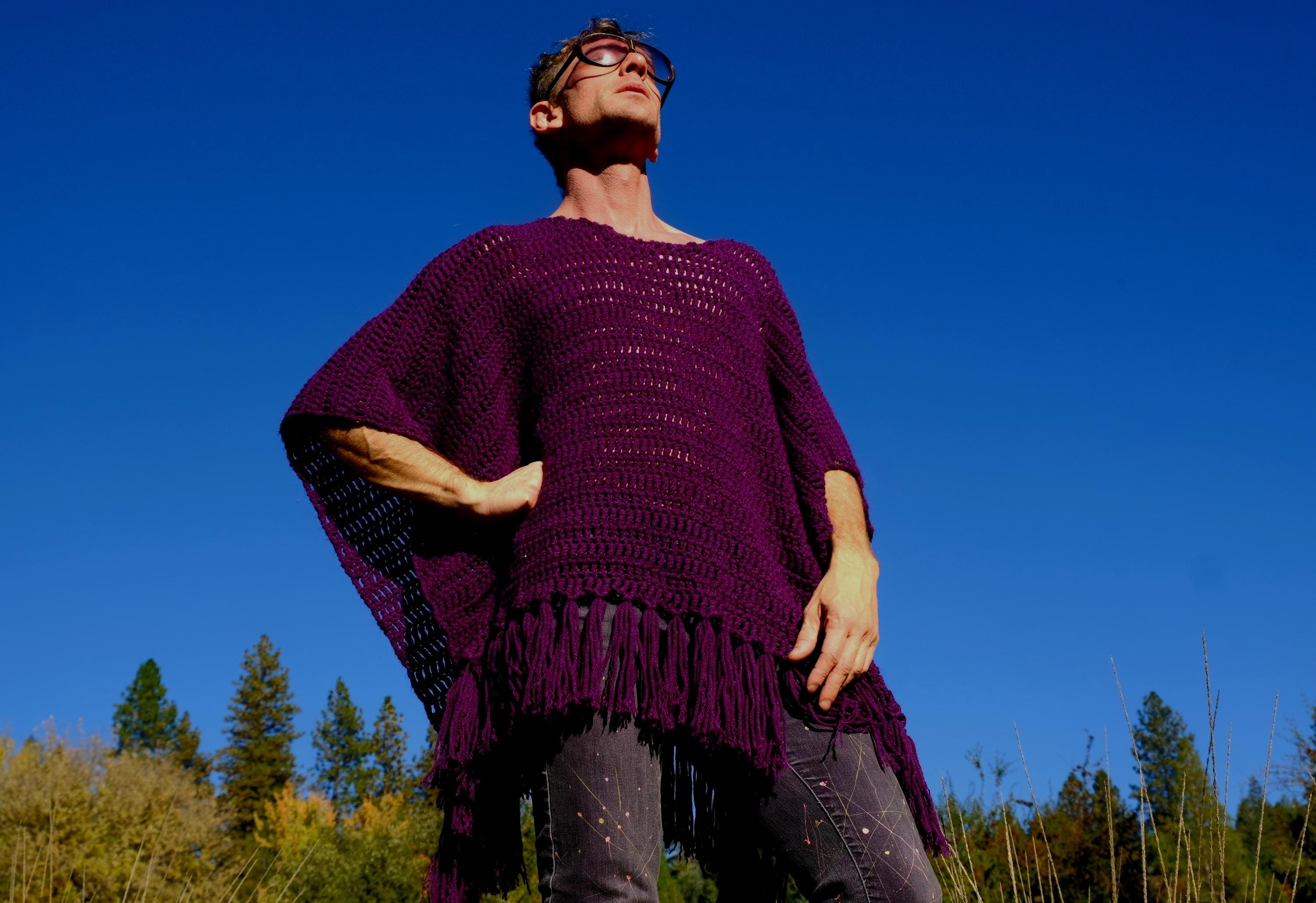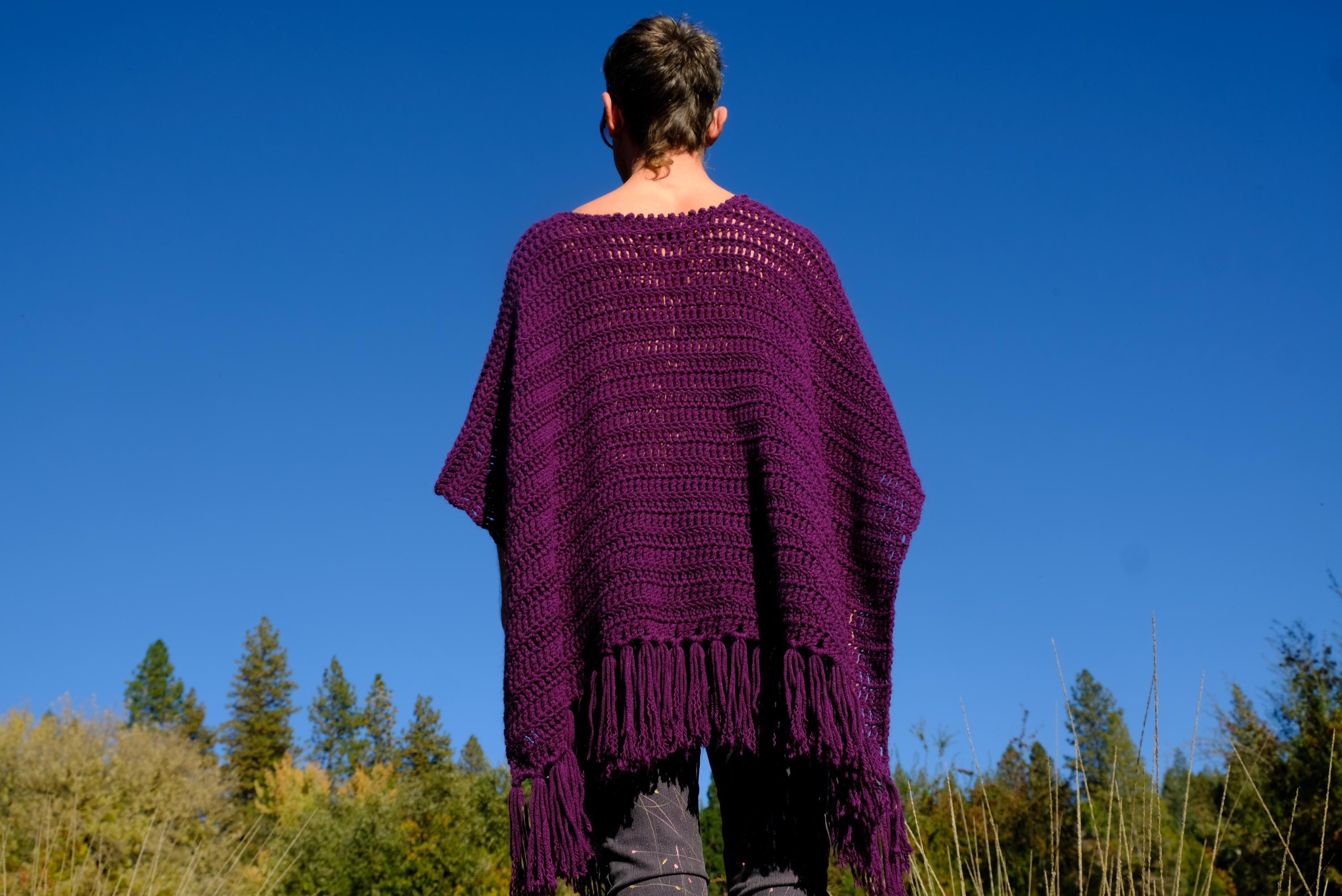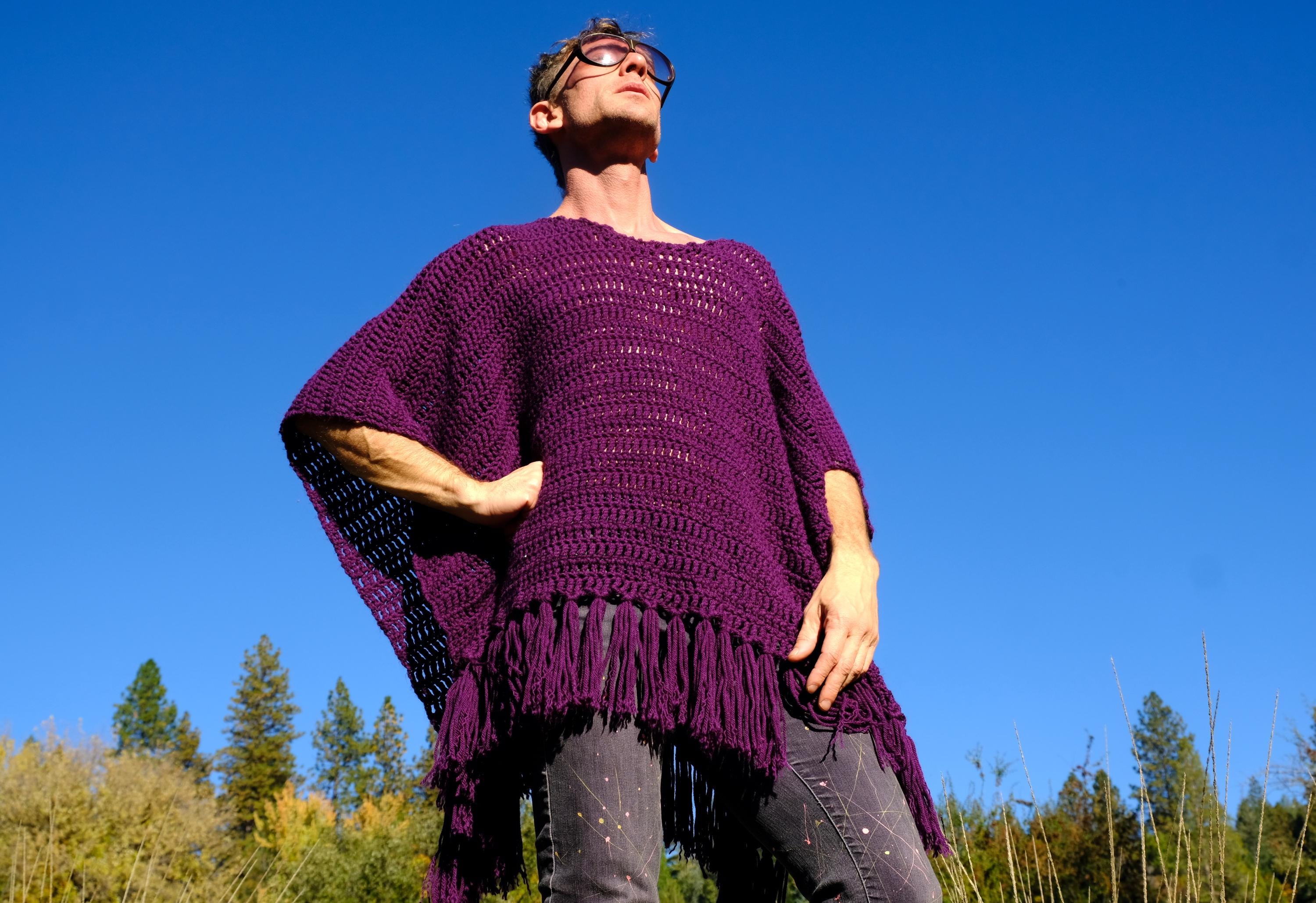 This is a crochet poncho in deep burgundy with fringe. Repurposed from an afghan blanket in 100 % acrylic yarn and hand stitched by yours truly, Lord von Schmitt.
