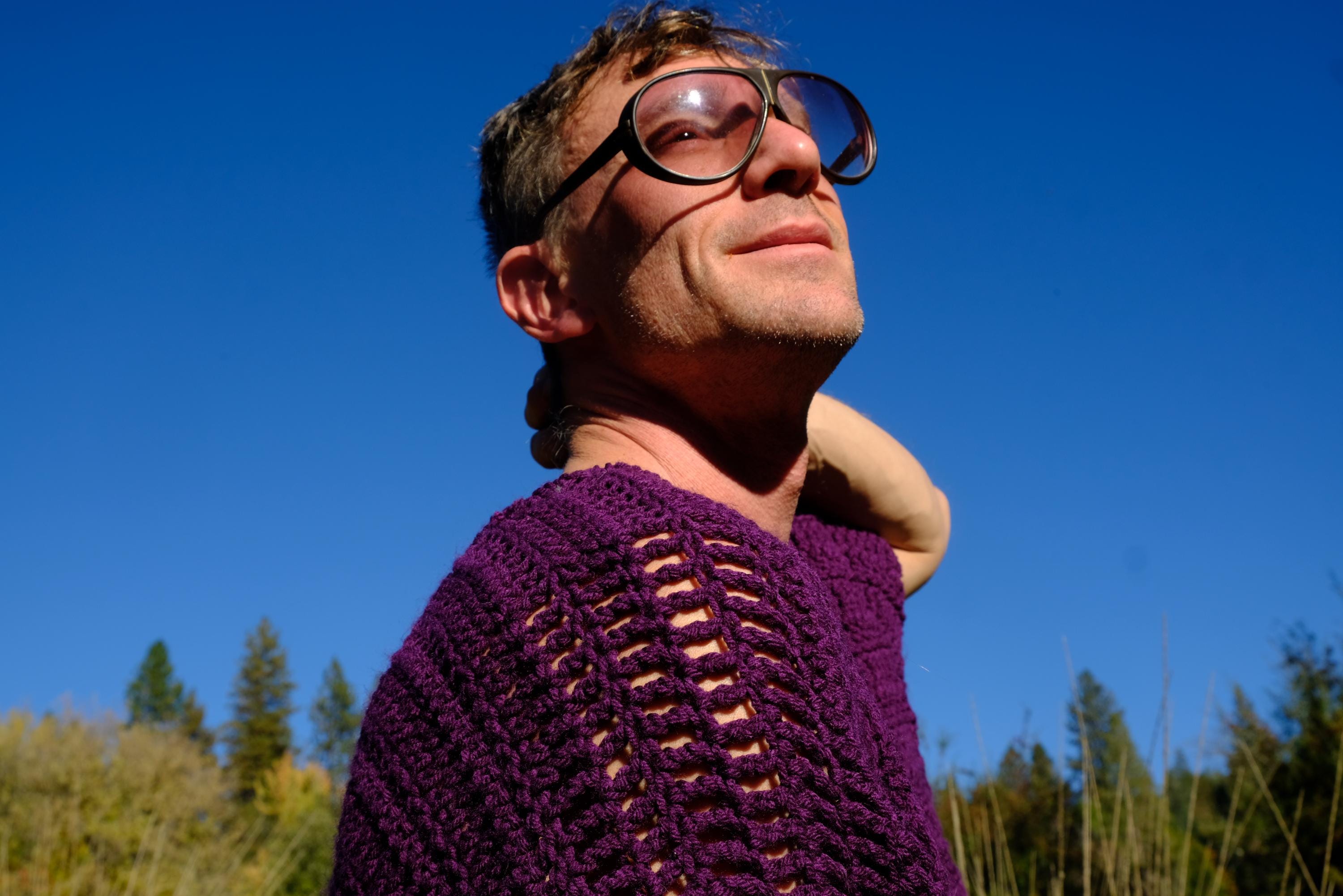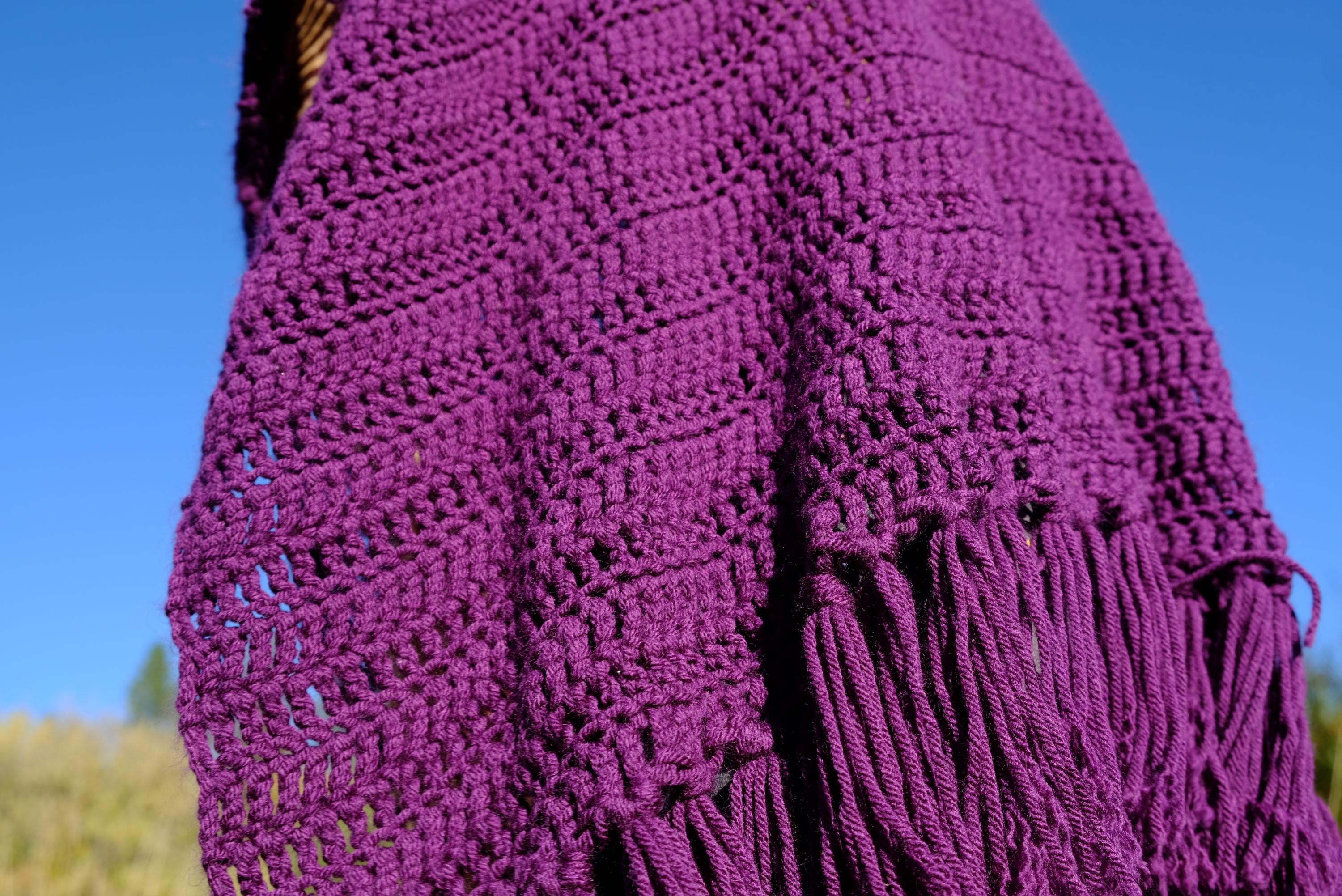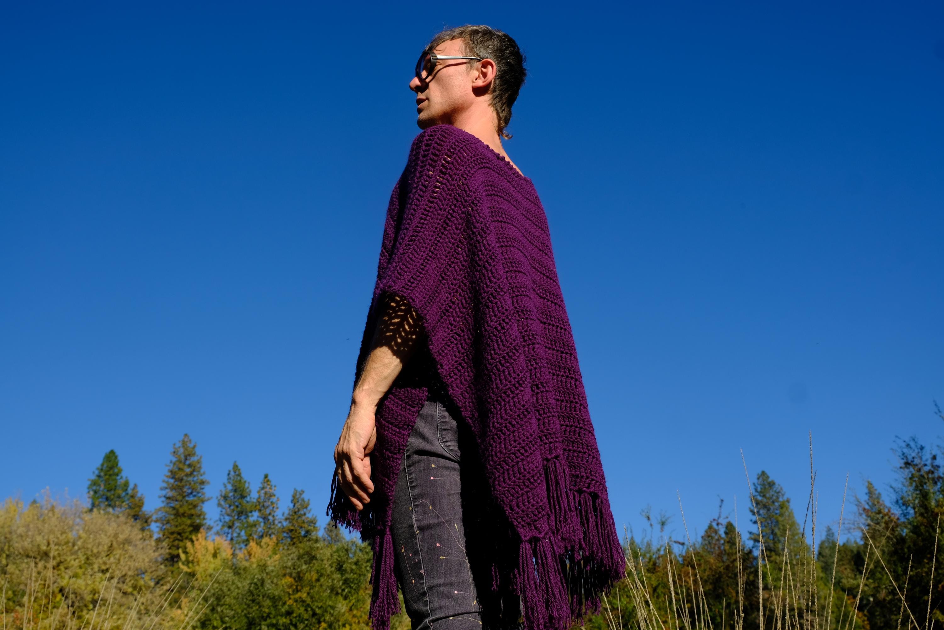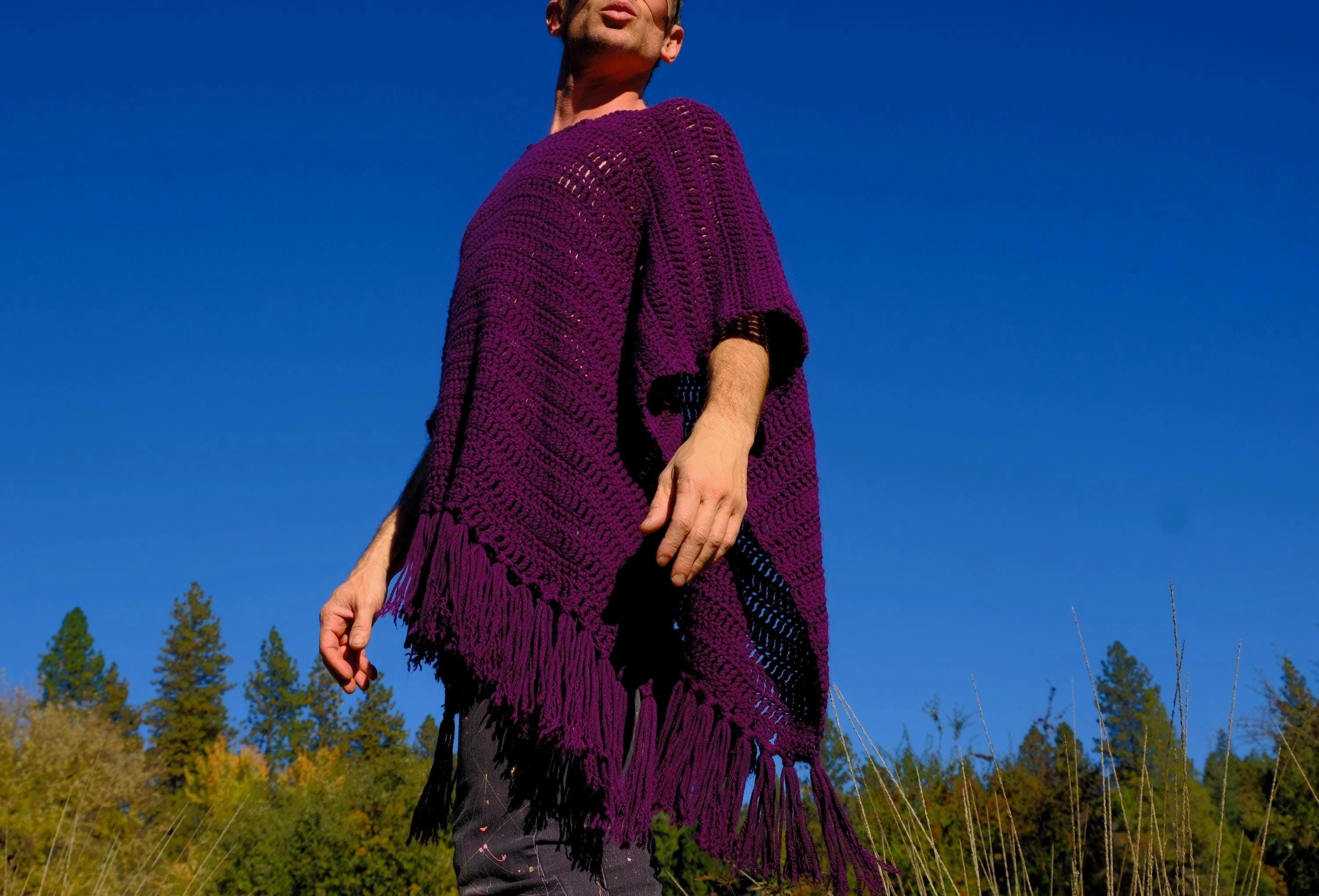 This is a crochet poncho in deep burgundy with fringe. Repurposed from an afghan blanket in 100 % acrylic yarn and hand stitched by yours truly, Lord von Schmitt.