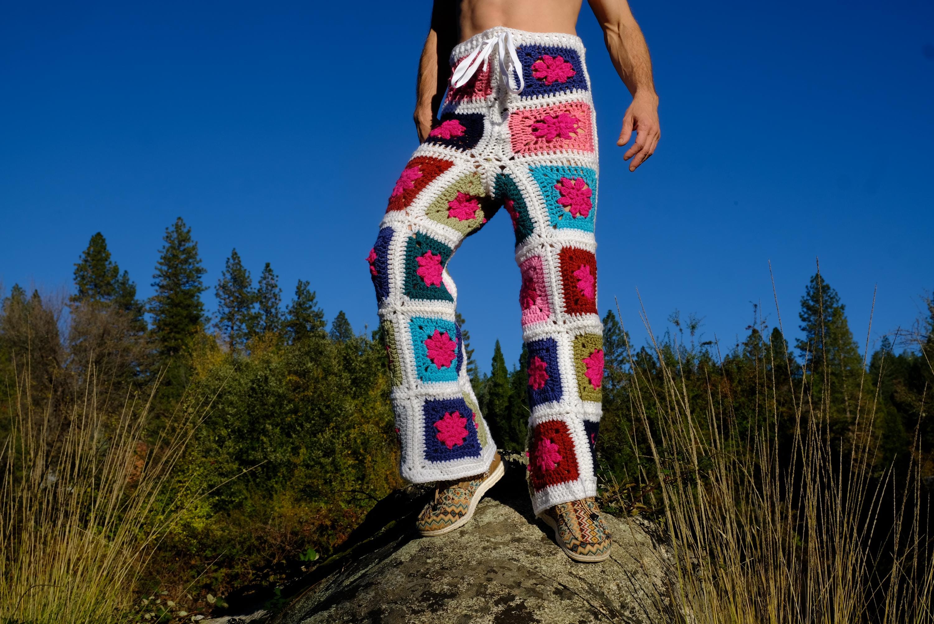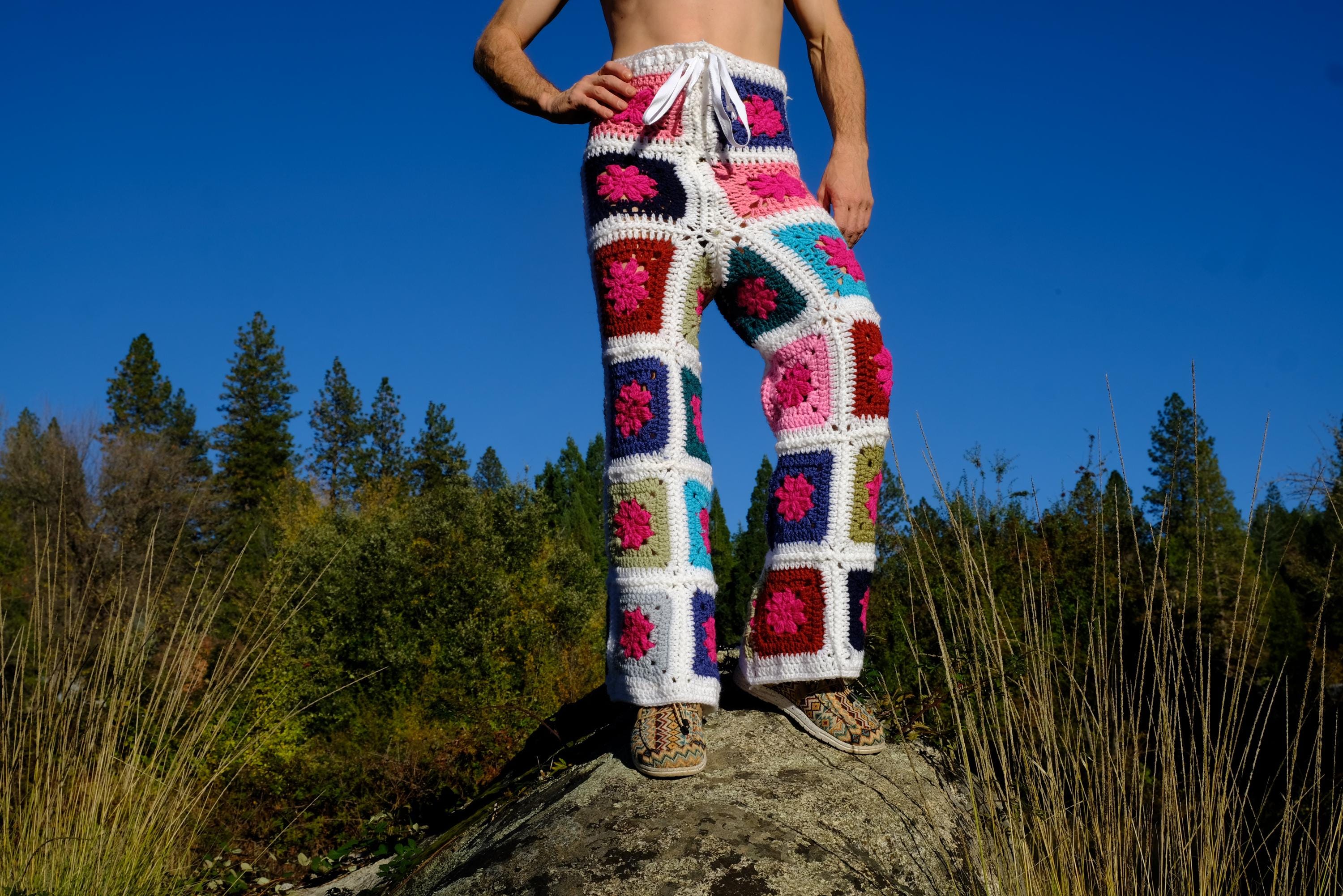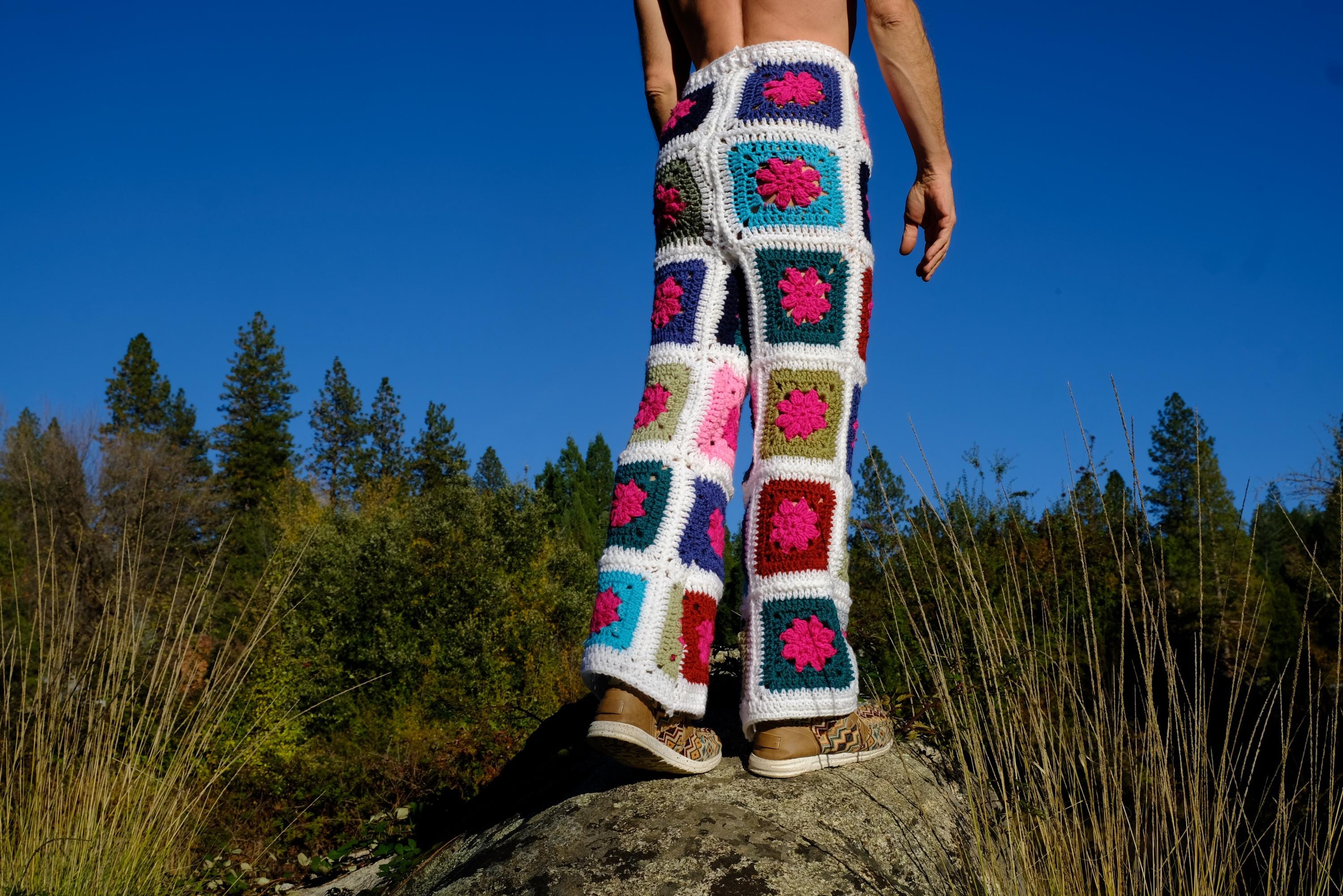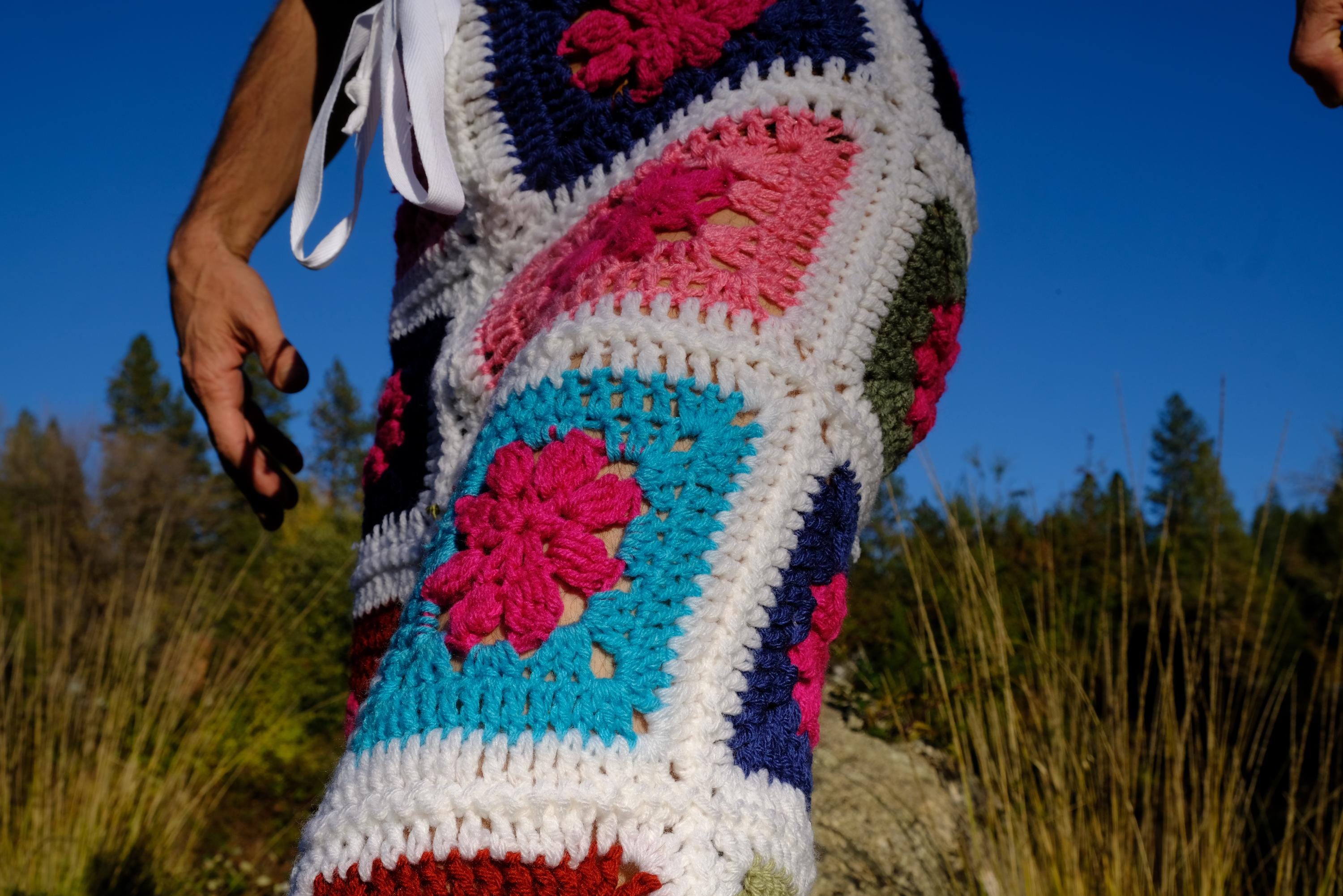 These are crochet pants with multicolor flower squares on white. Fashioned from a vintage afghan blanket crocheted in 100% acrylic yarn.