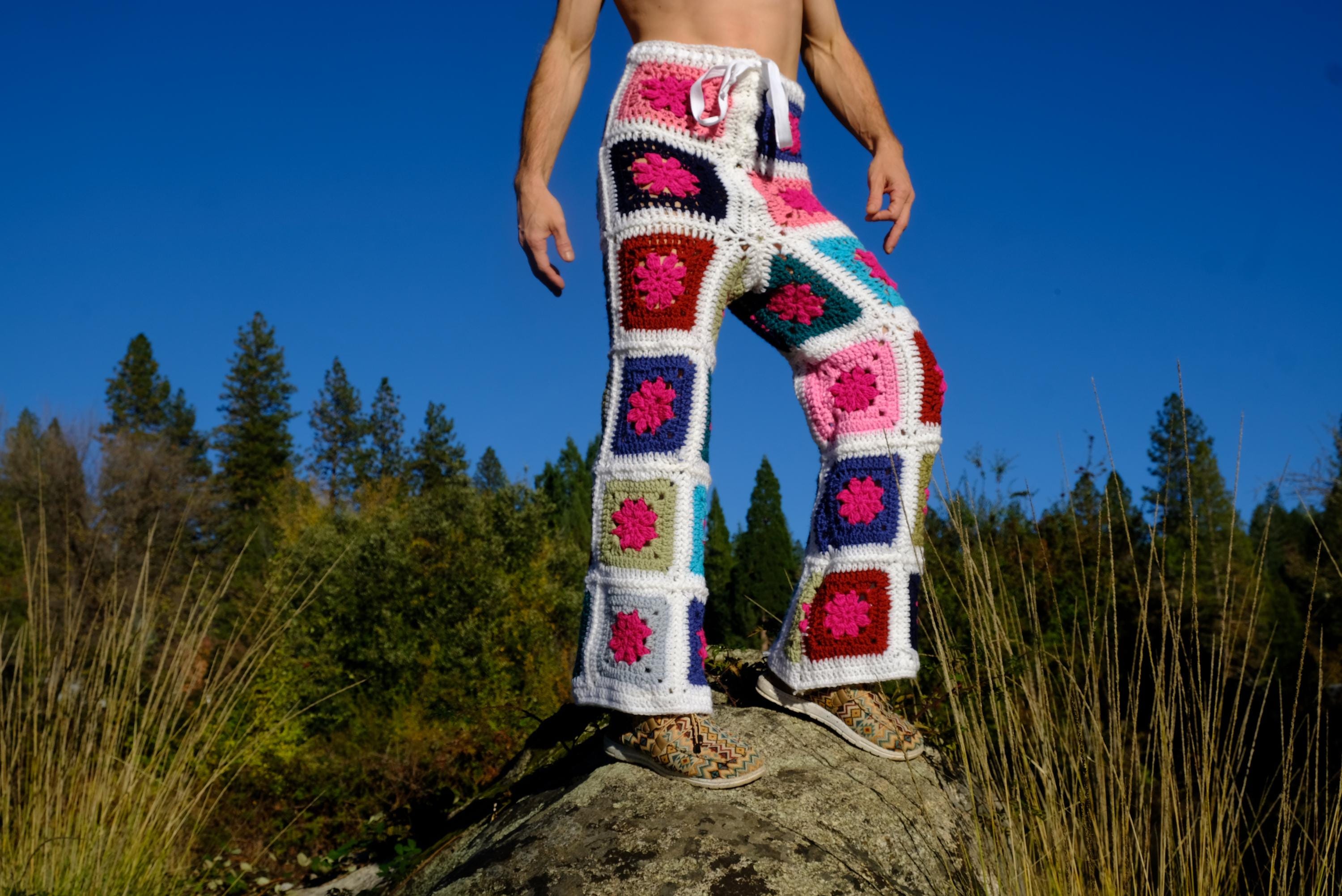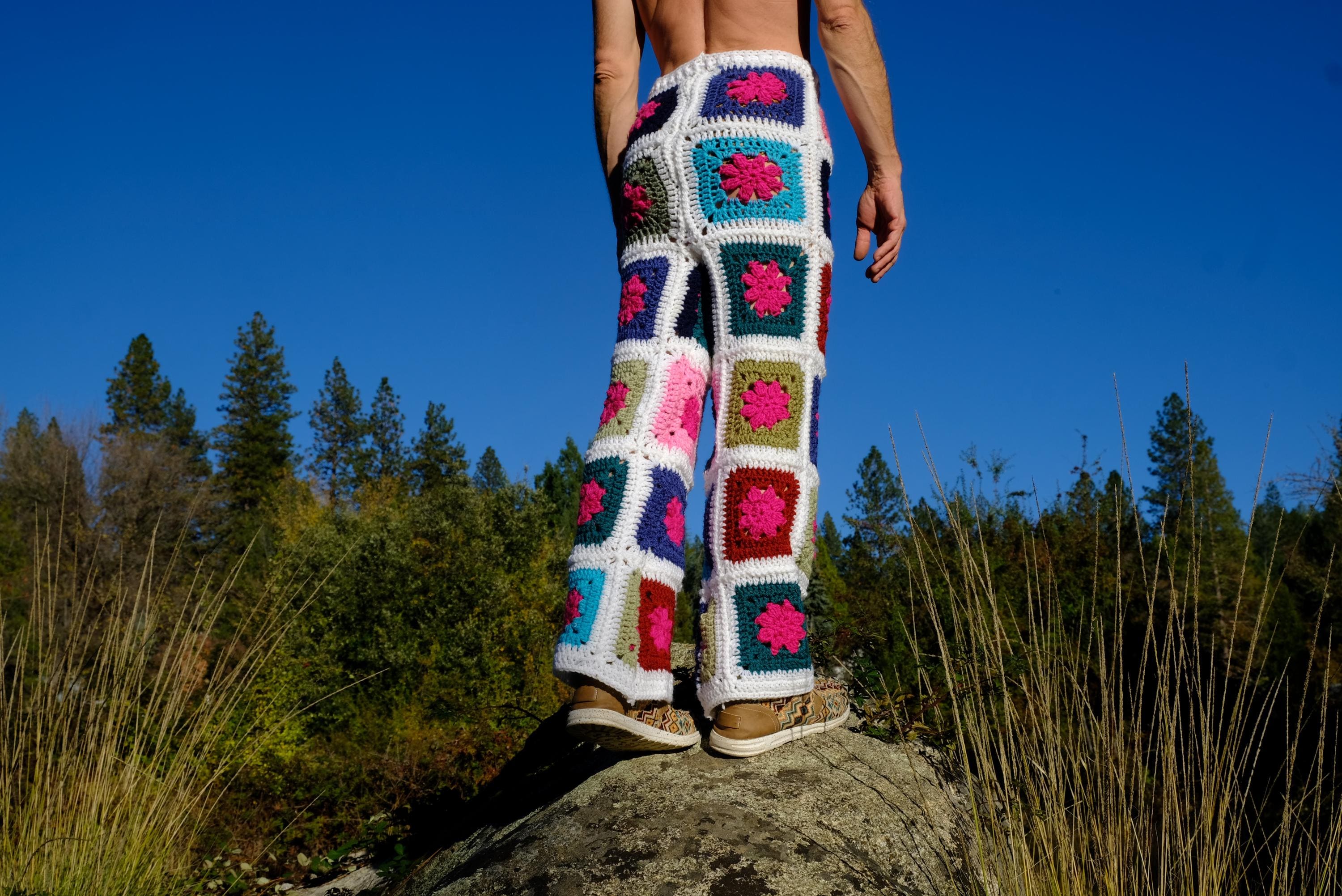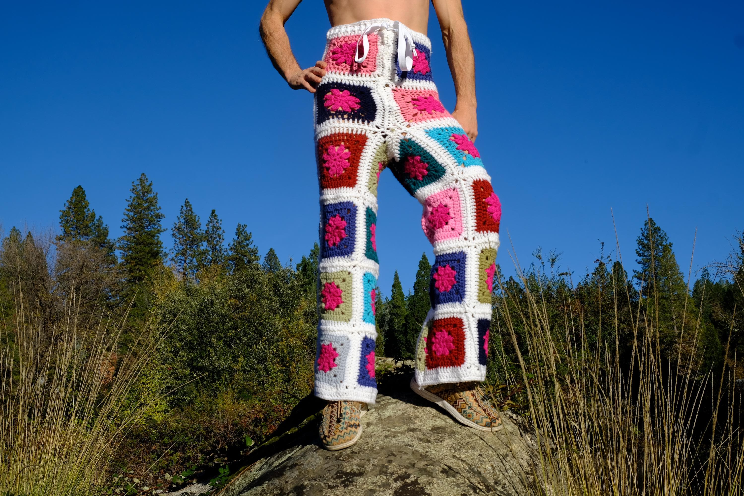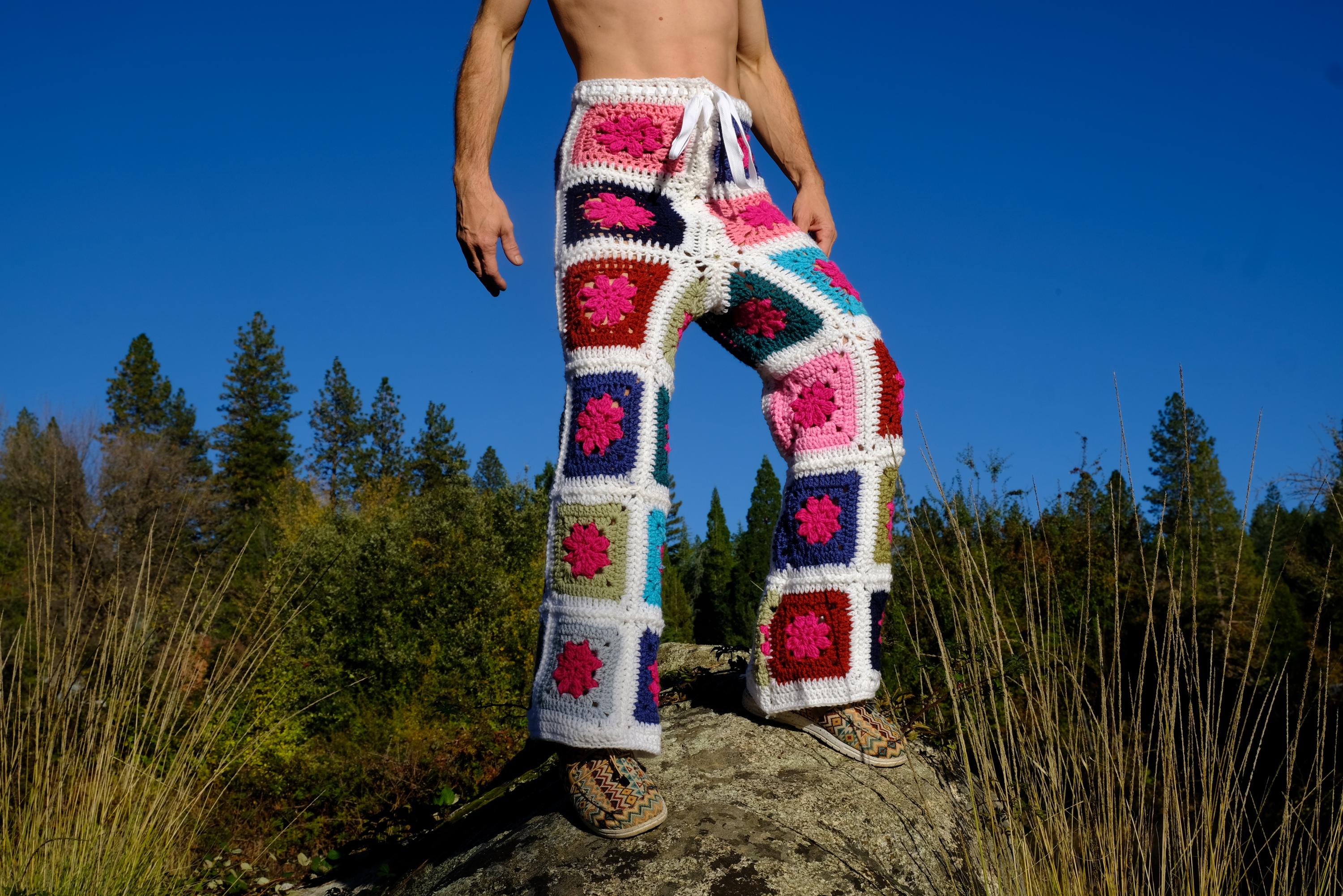 These are crochet pants with multicolor flower squares on white. Fashioned from a vintage afghan blanket crocheted in 100% acrylic yarn.