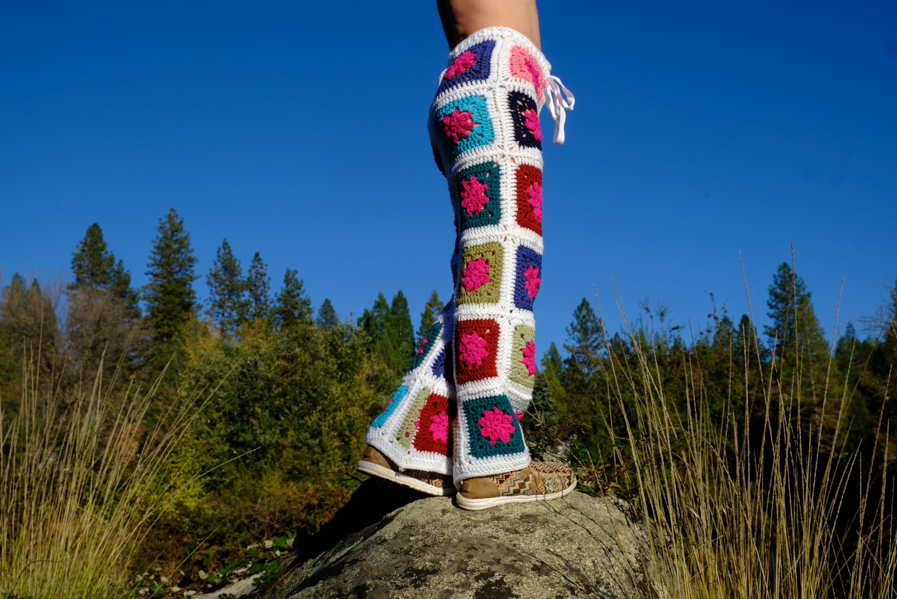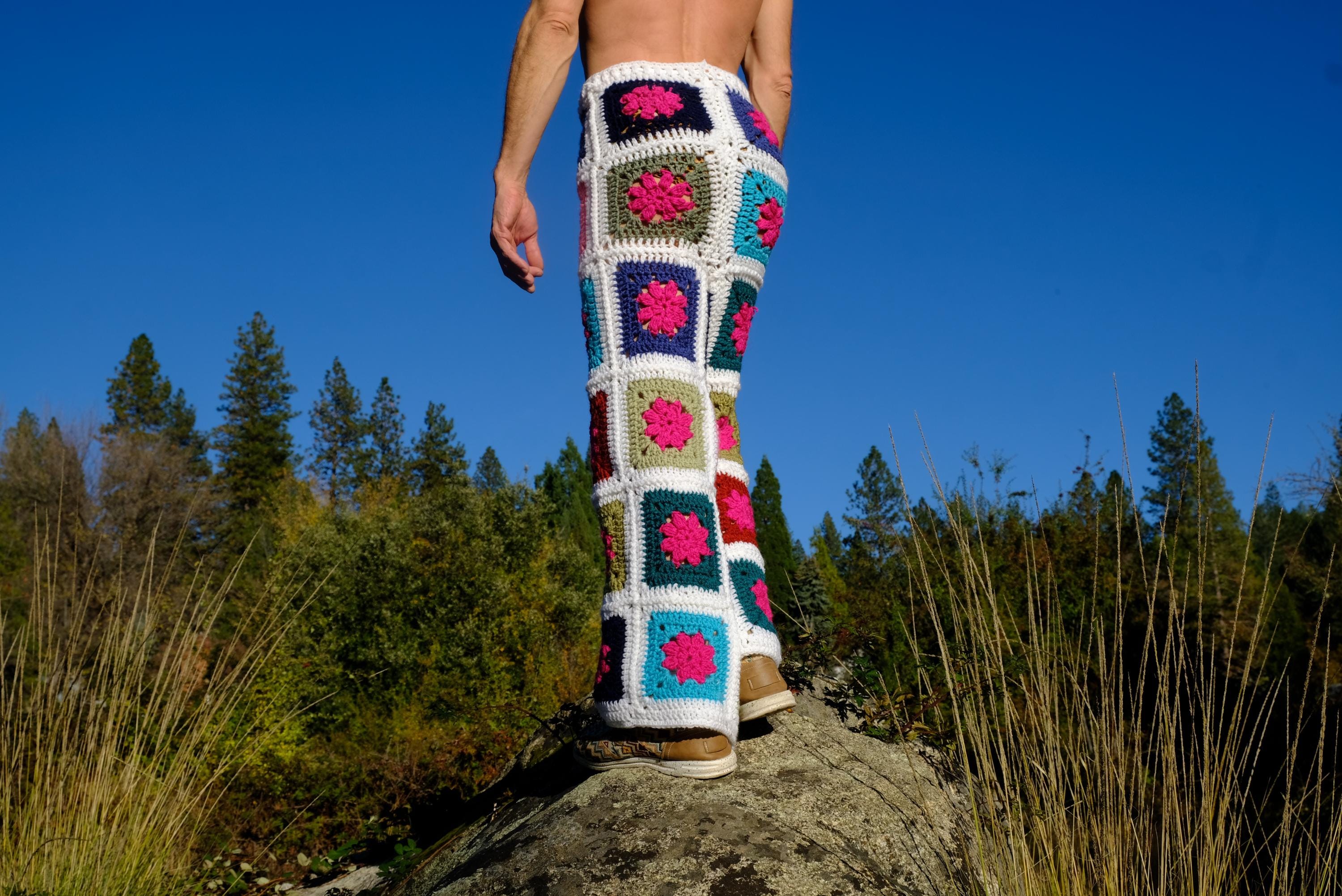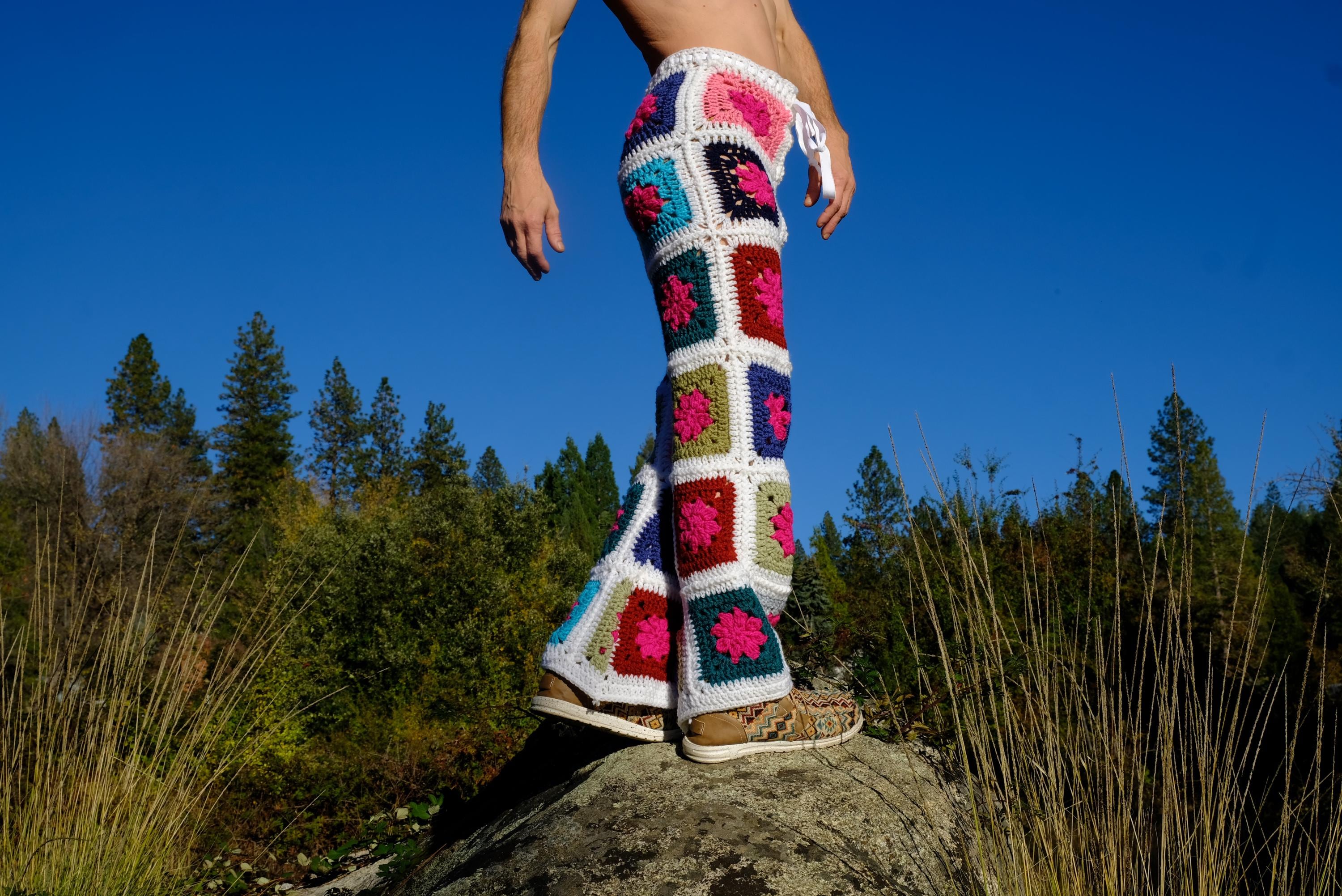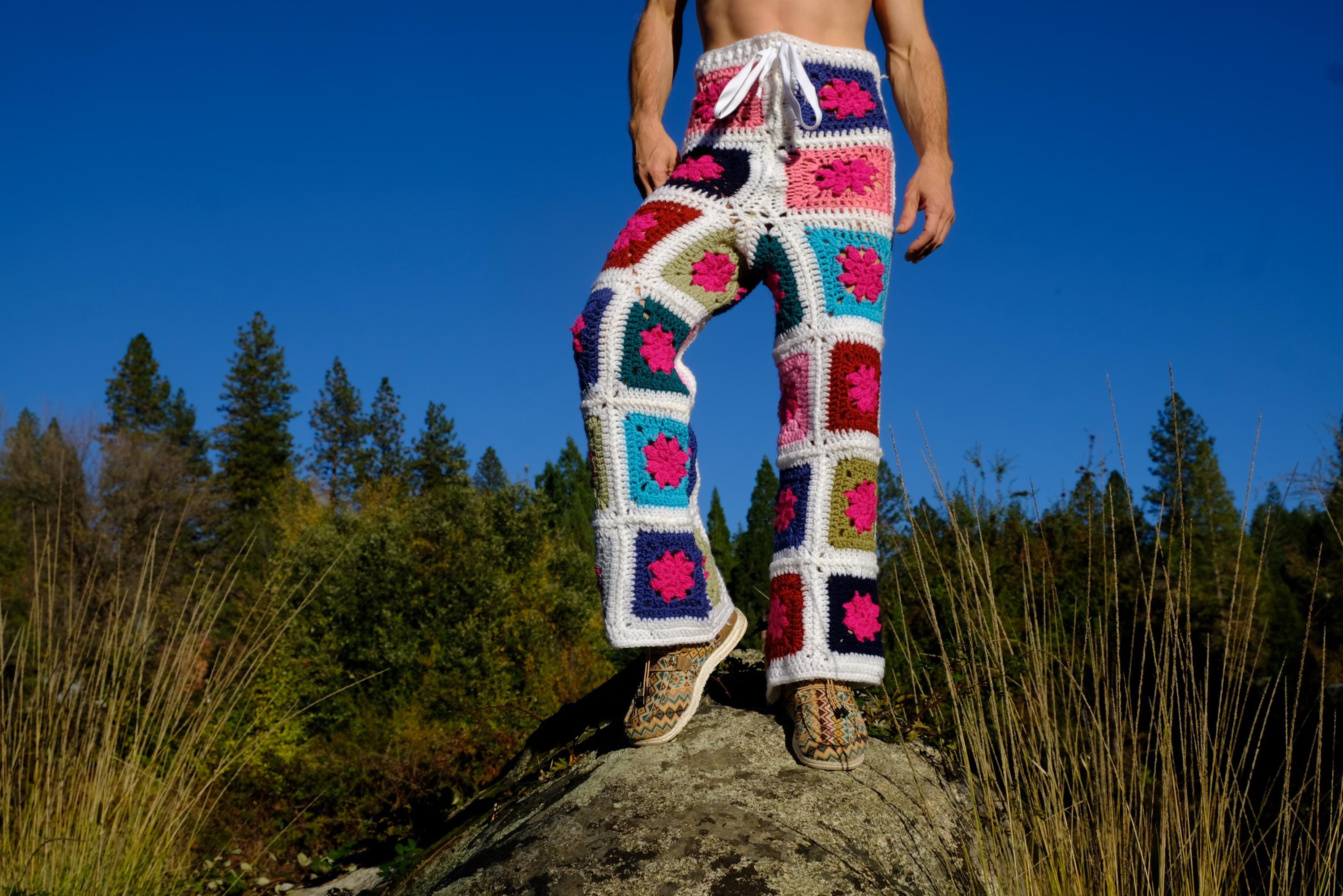 These are crochet pants with multicolor flower squares on white. Fashioned from a vintage afghan blanket crocheted in 100% acrylic yarn.