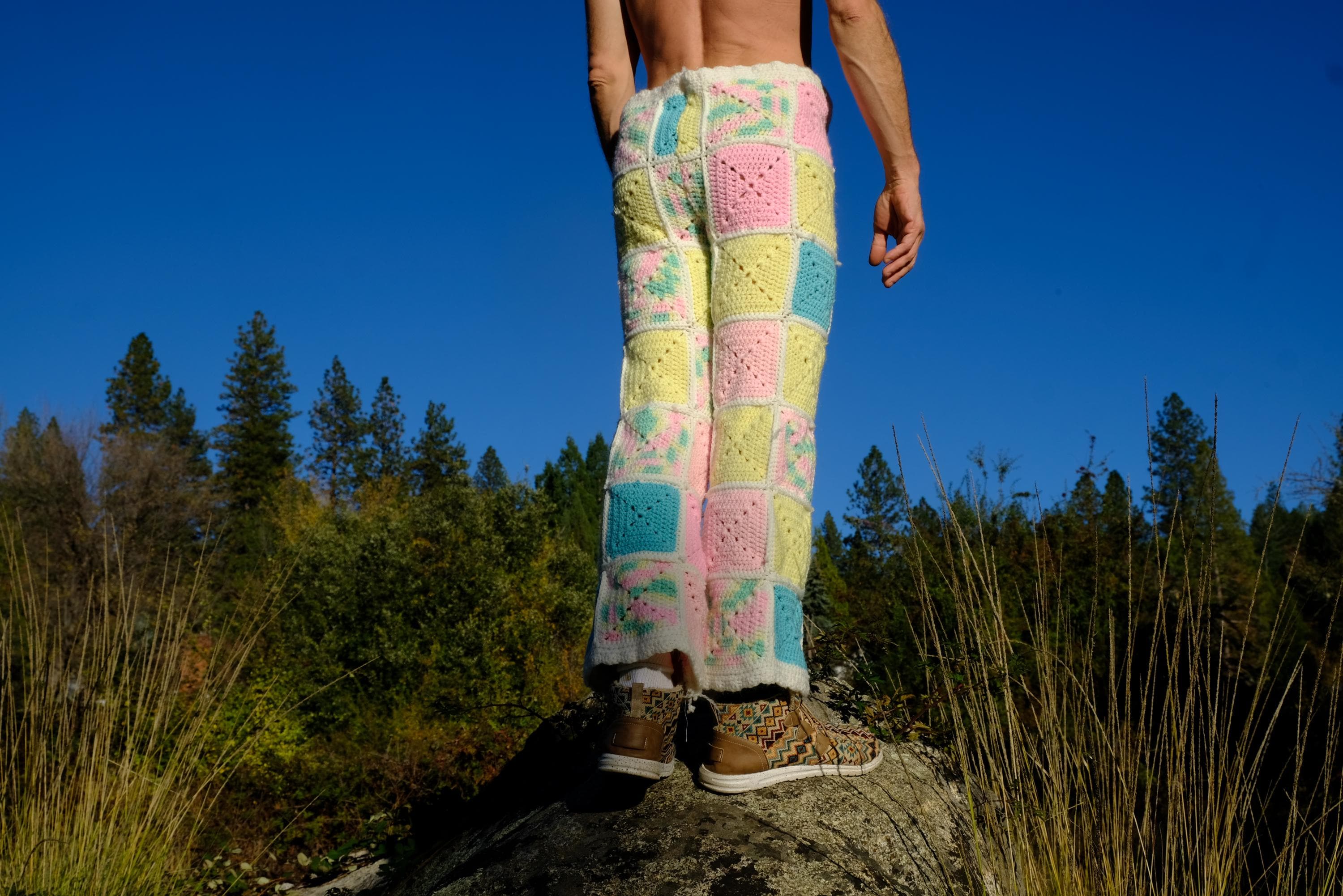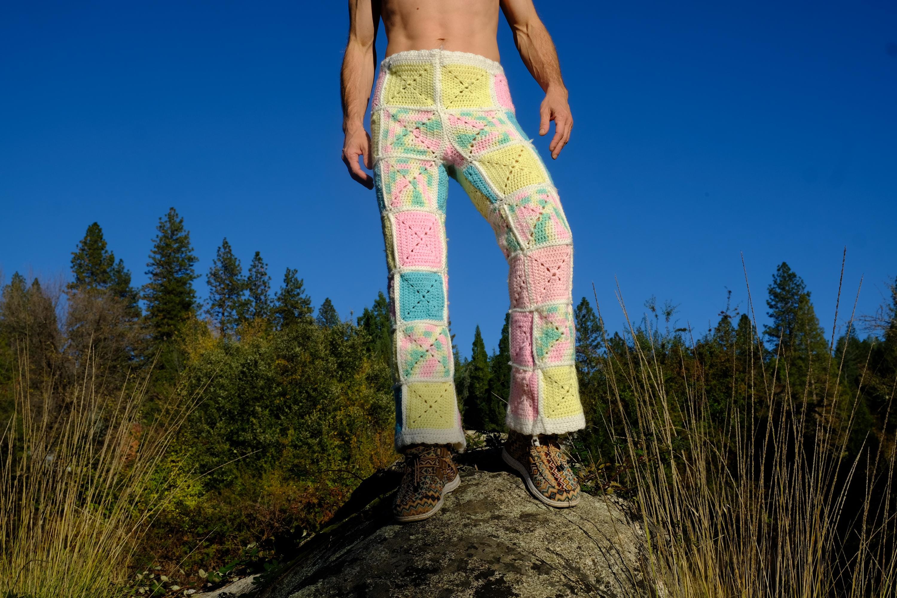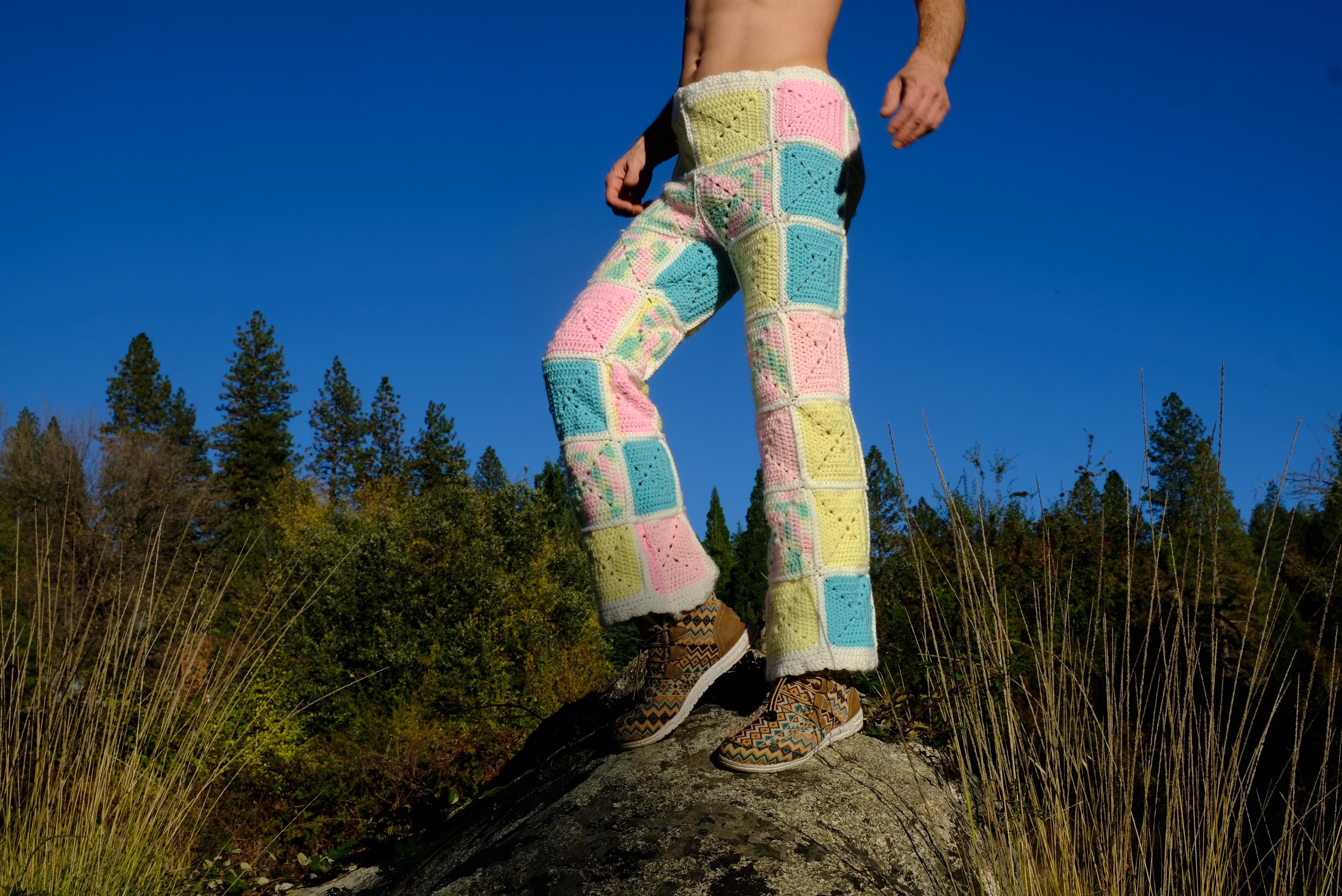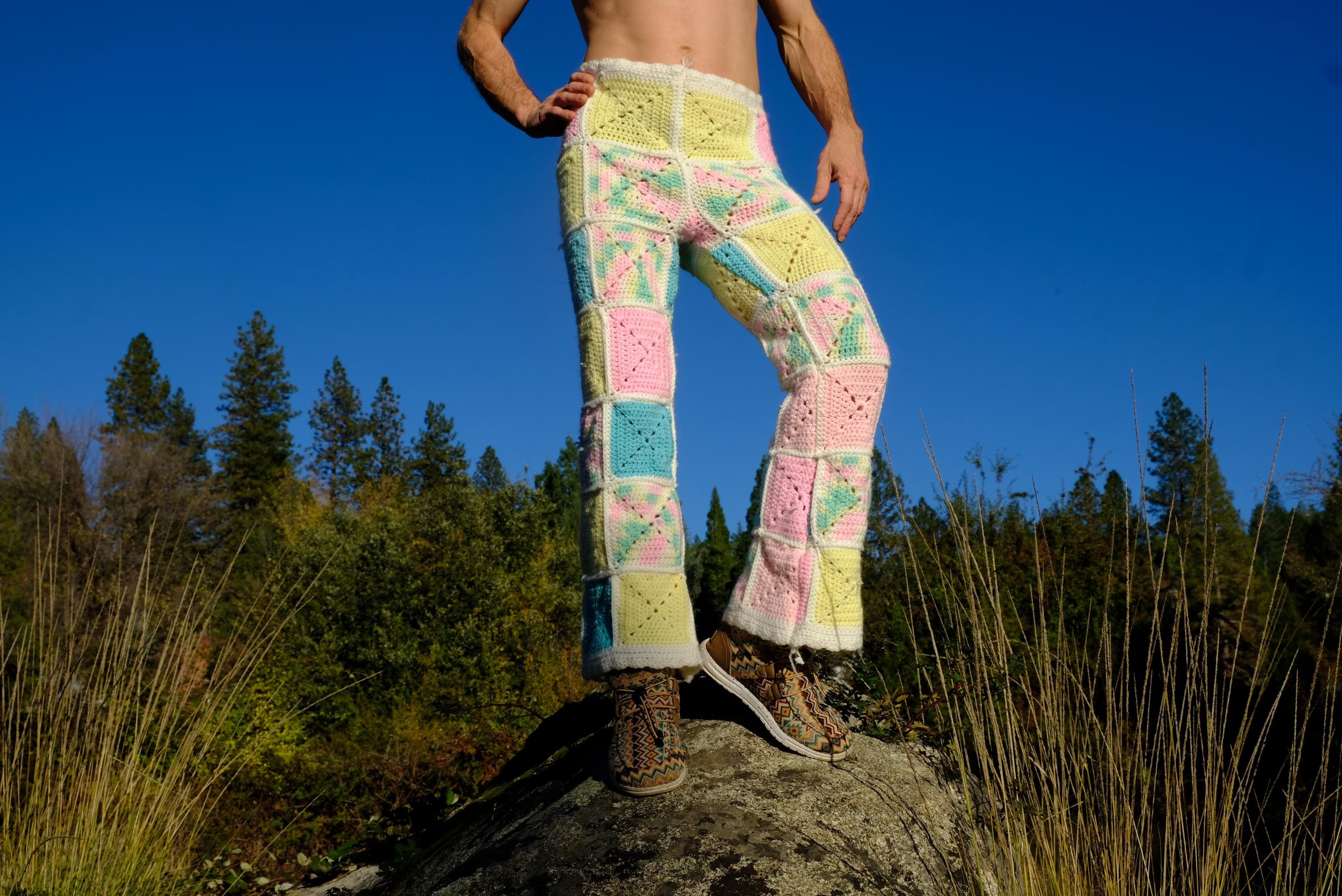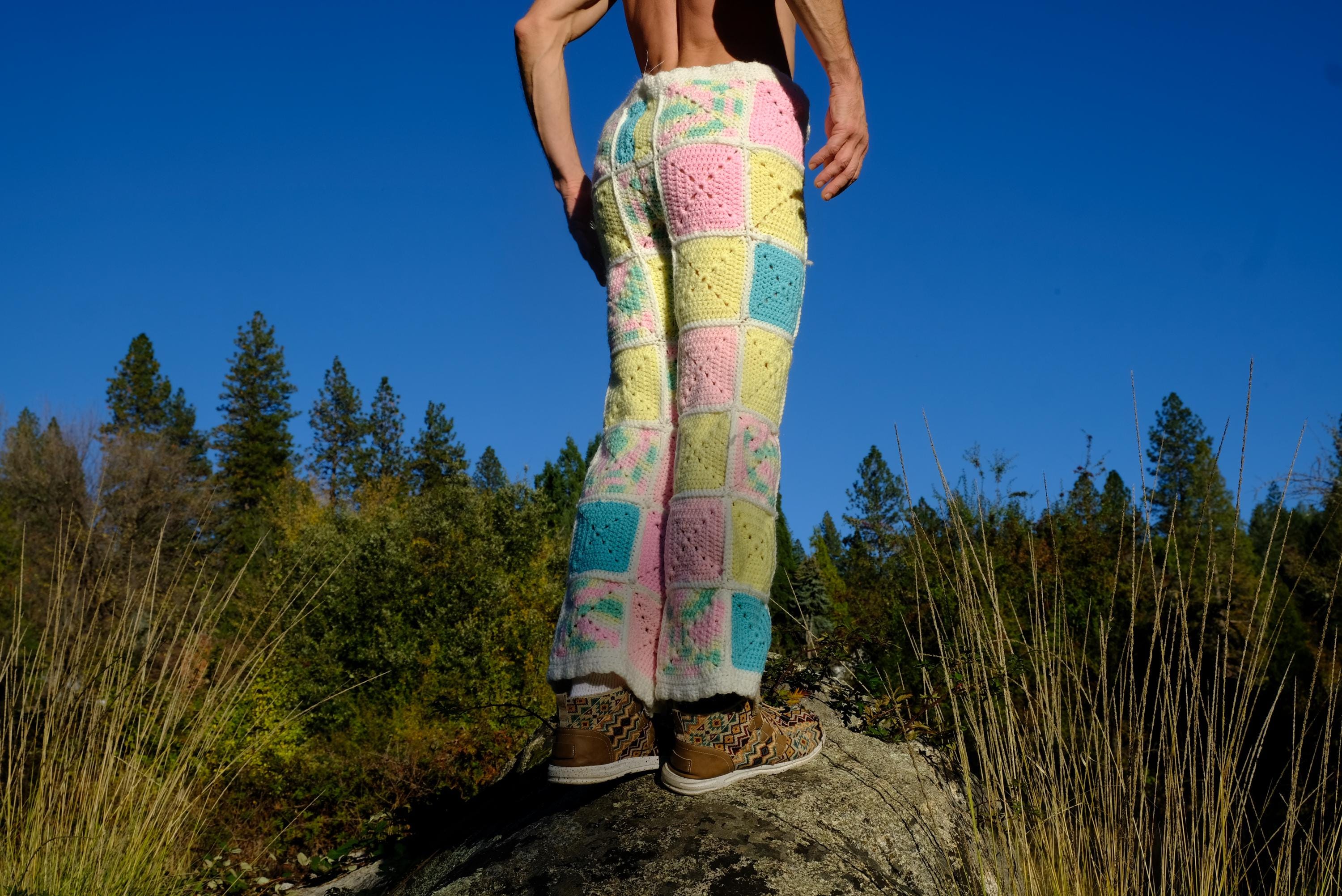 These are crochet pants with multicolor pastel squares on white. Fashioned from a vintage afghan blanket crocheted in 100% acrylic yarn.