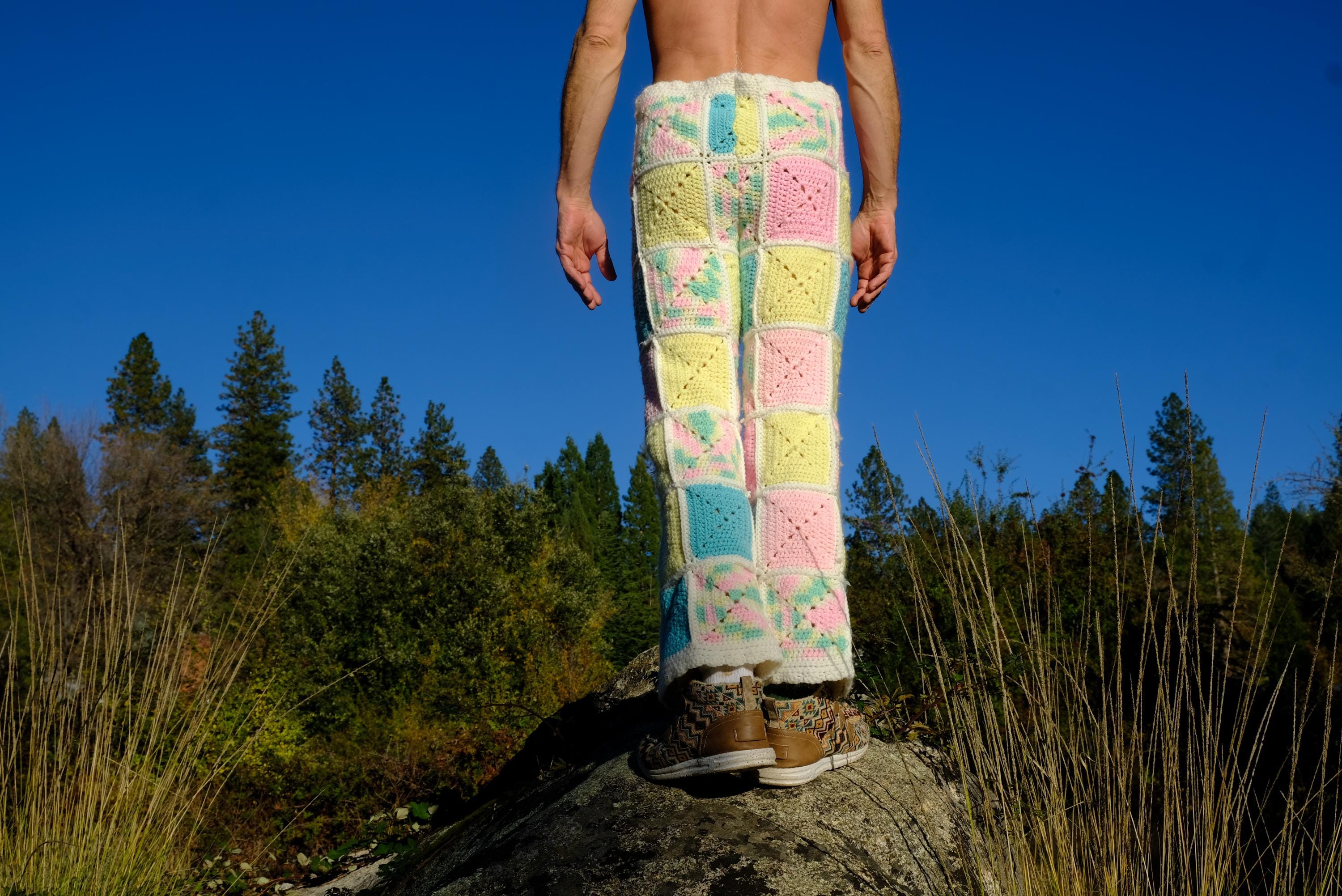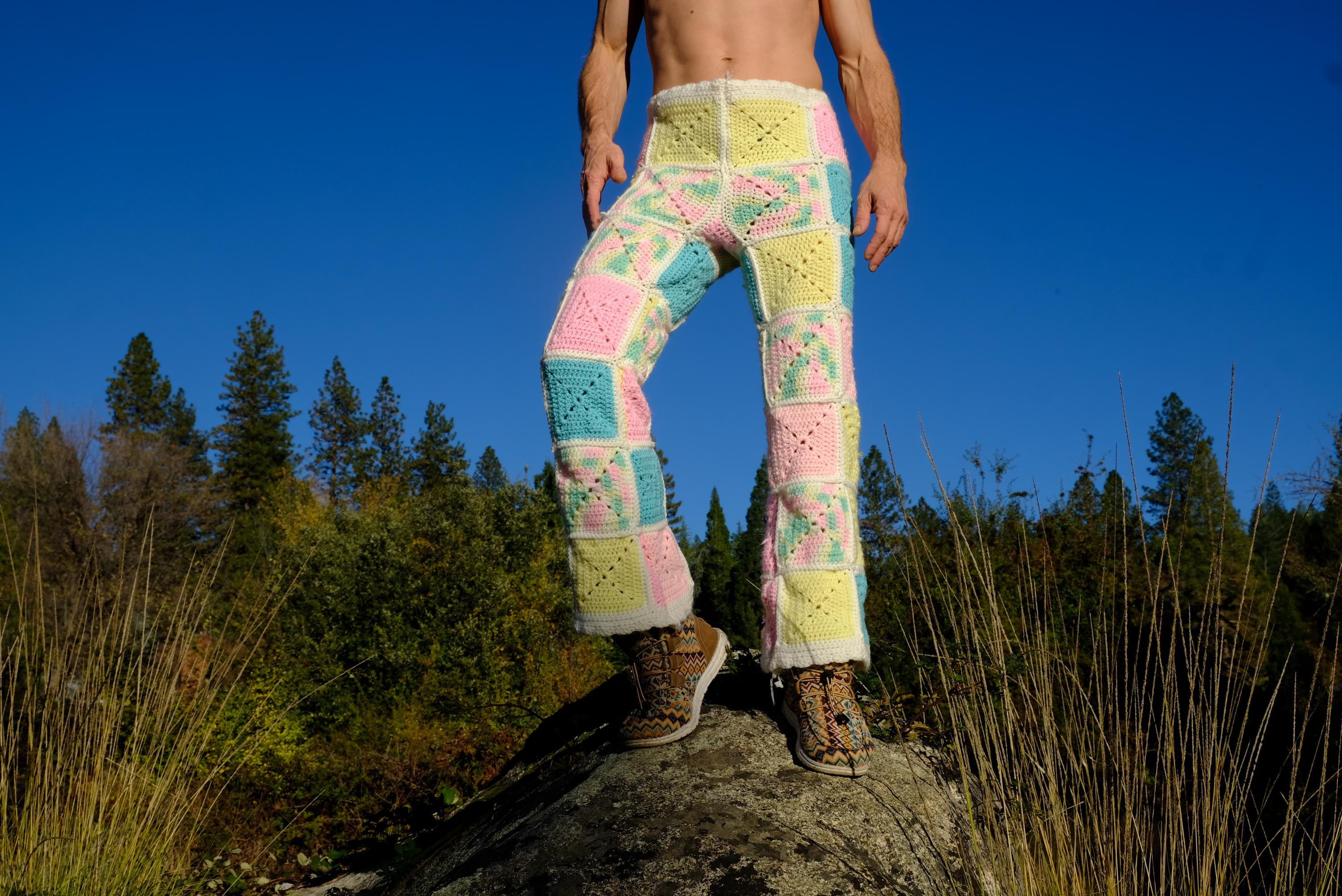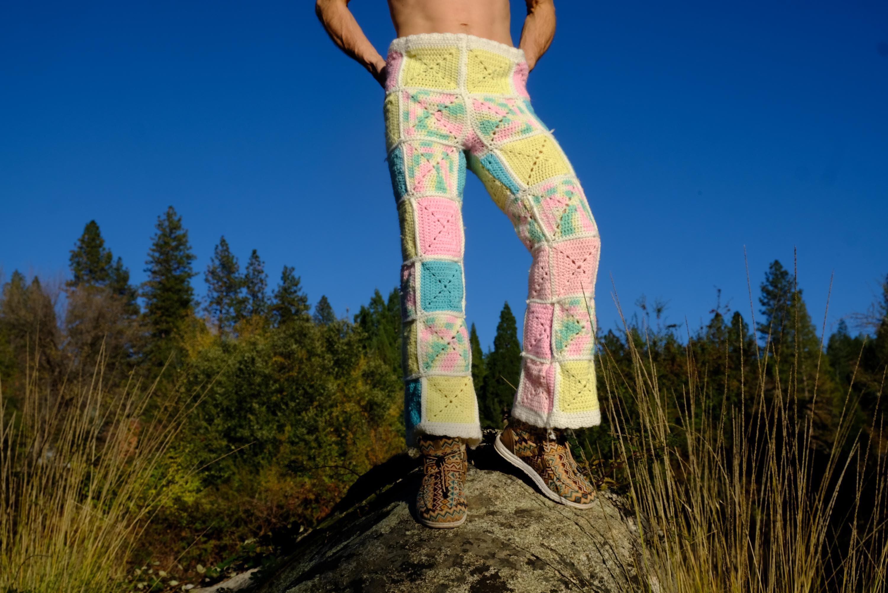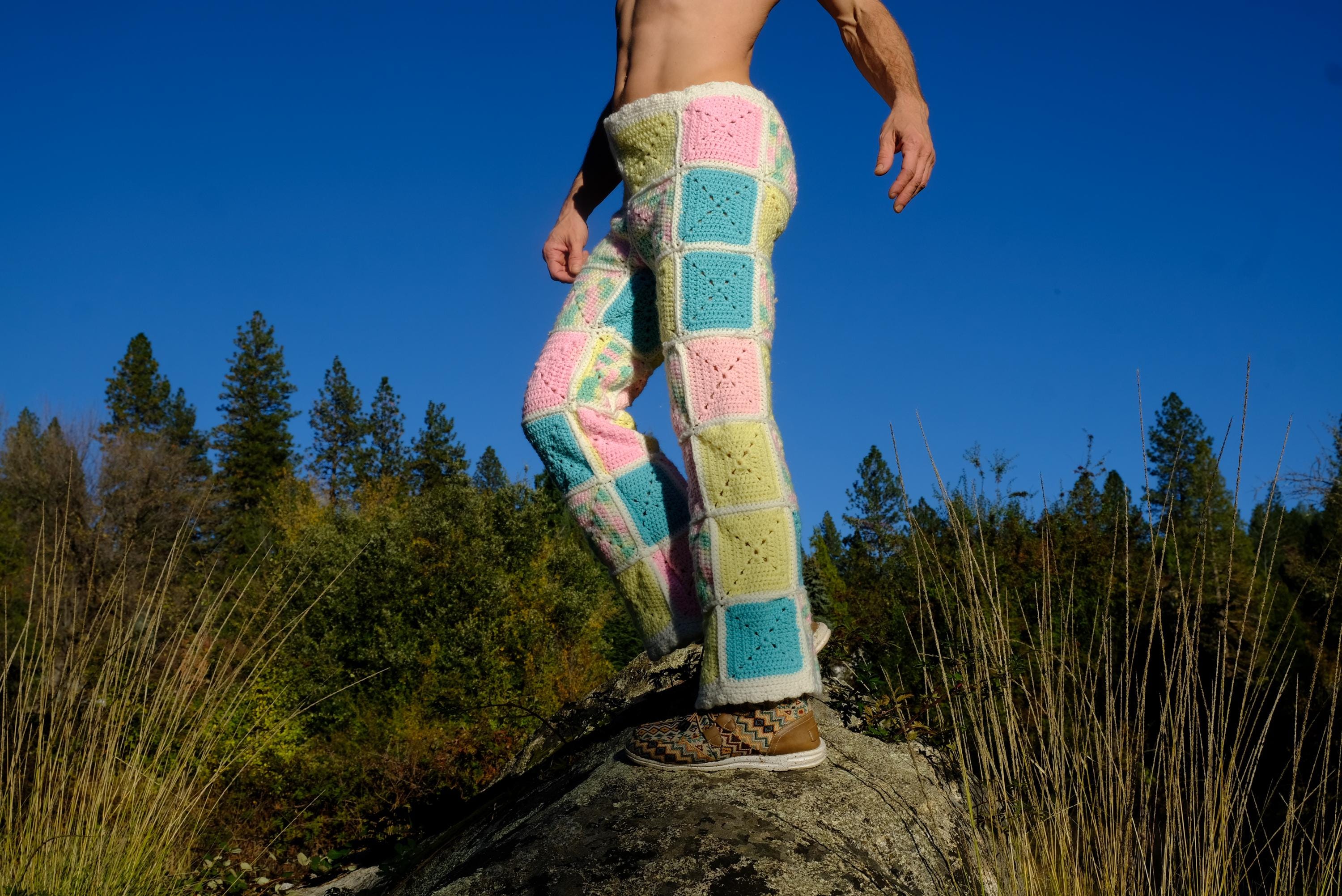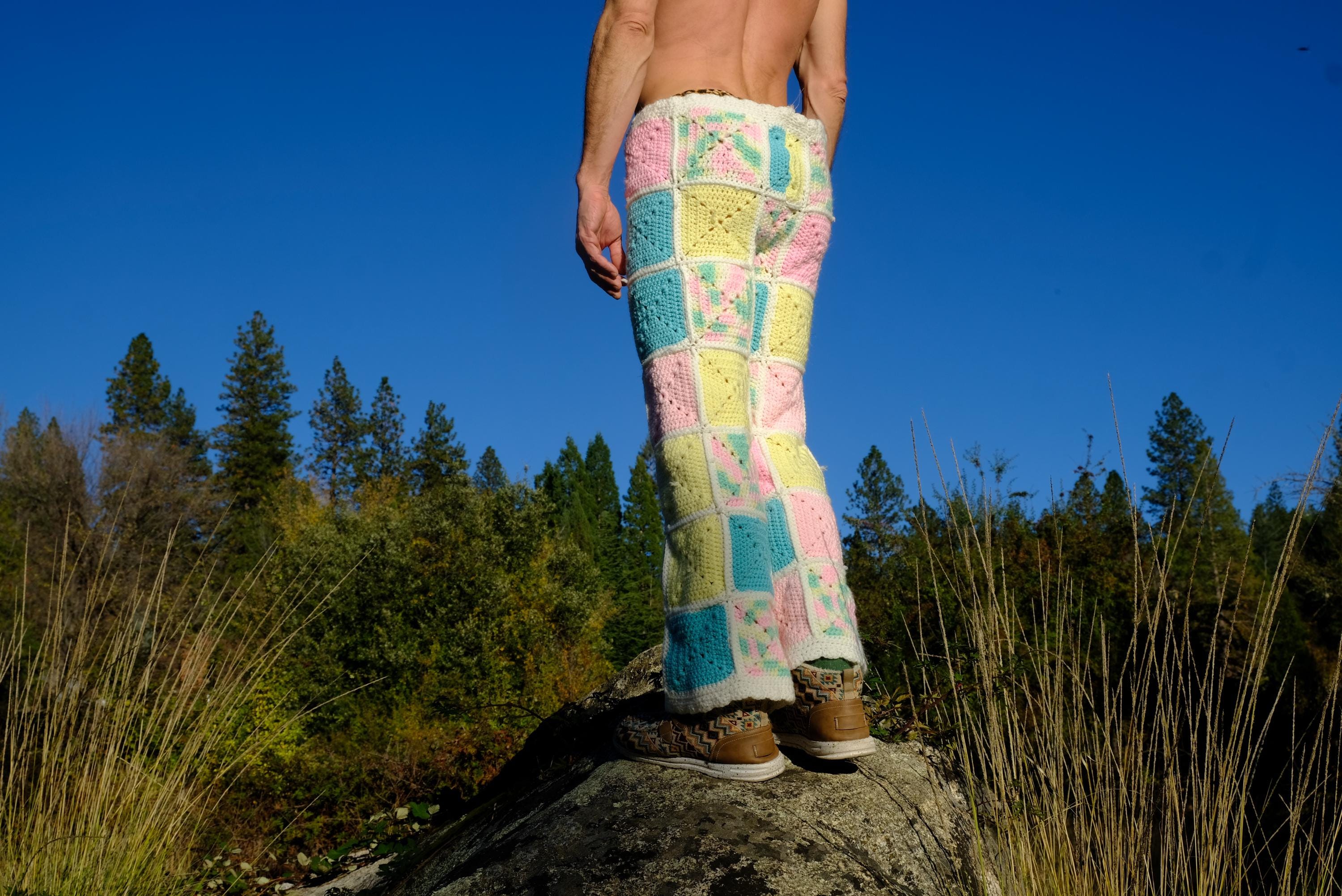 These are crochet pants with multicolor pastel squares on white. Fashioned from a vintage afghan blanket crocheted in 100% acrylic yarn.