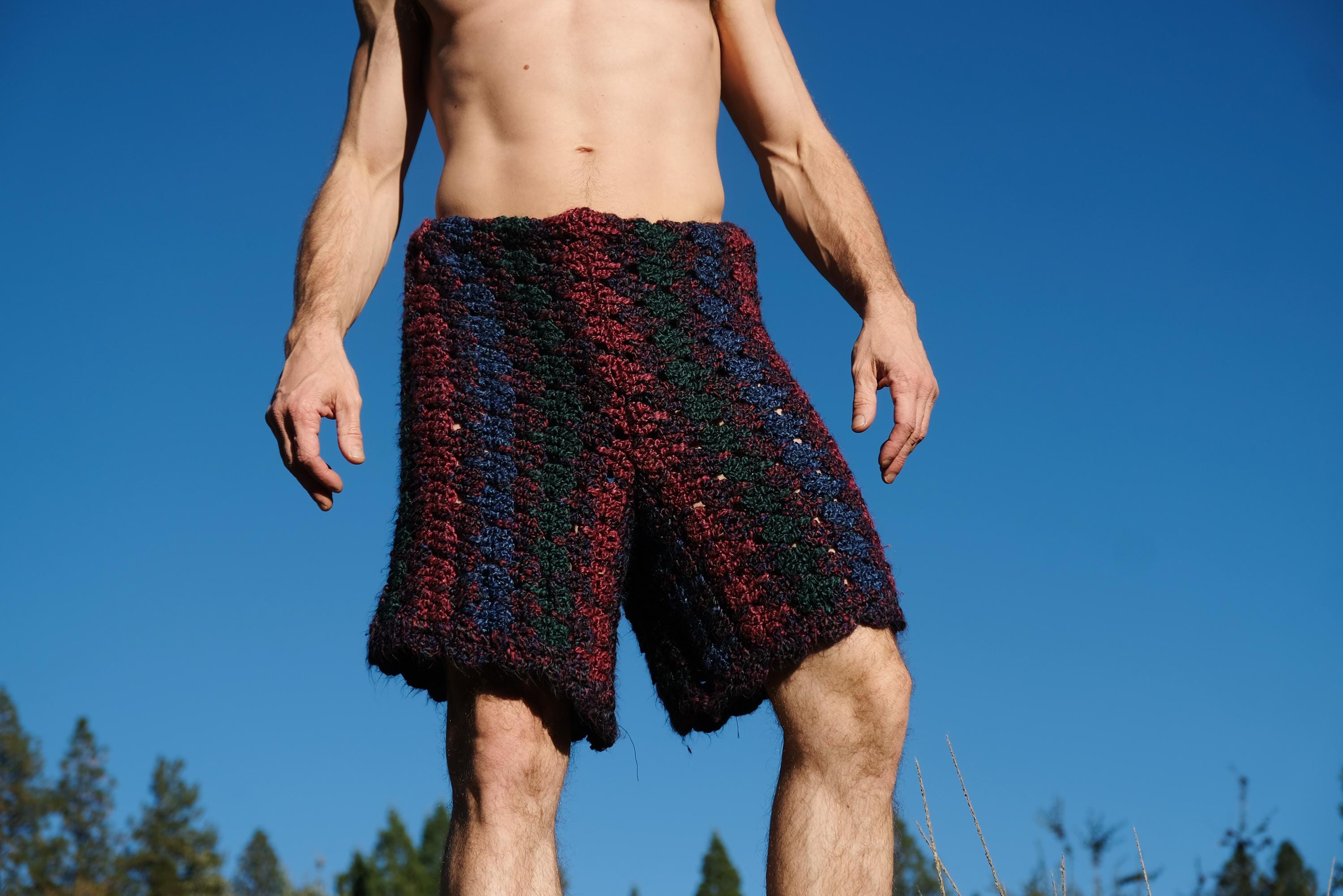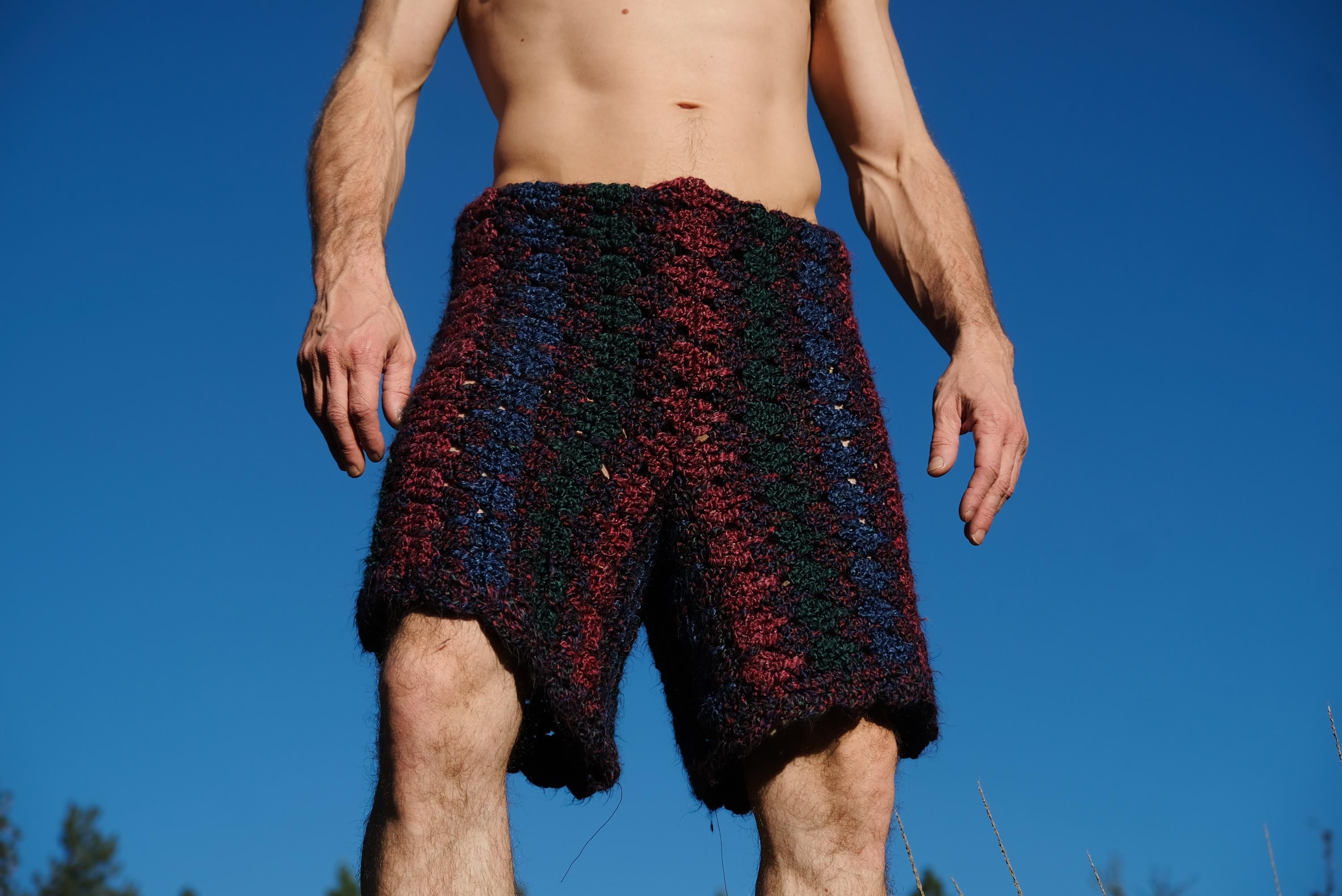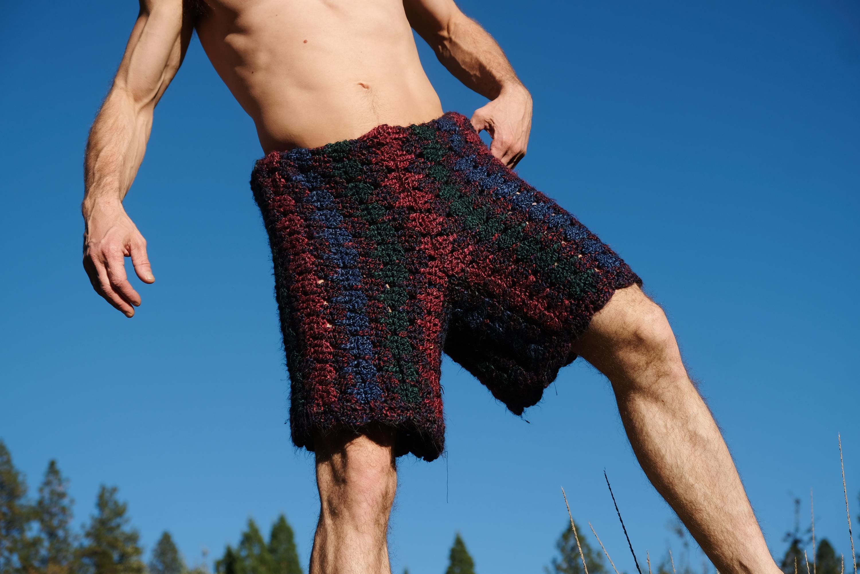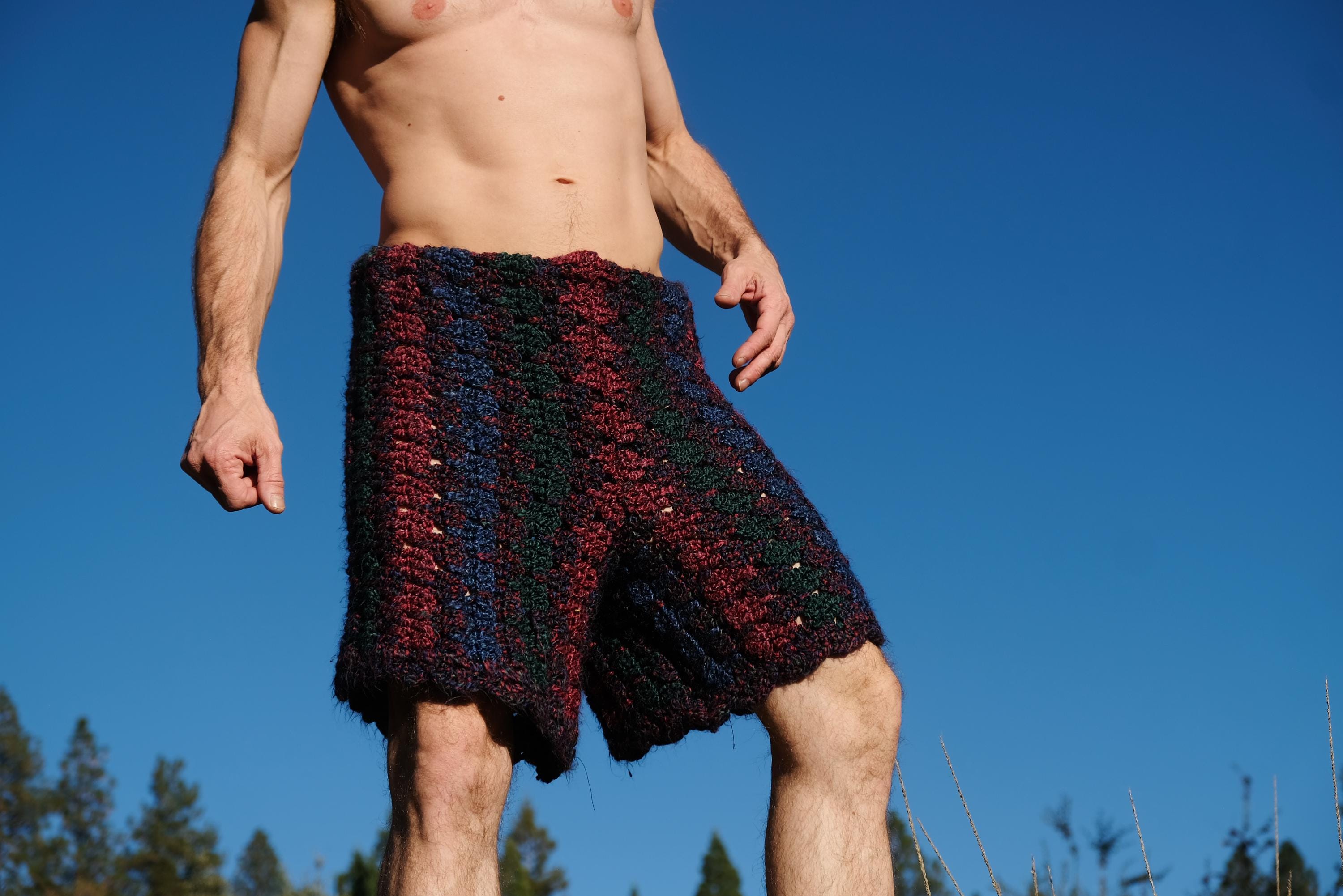 These are crochet shorts in dark earth tones, crocheted in a very soft yarn. Repurposed from a vintage afghan blanket crocheted in 100% acrylic yarn.