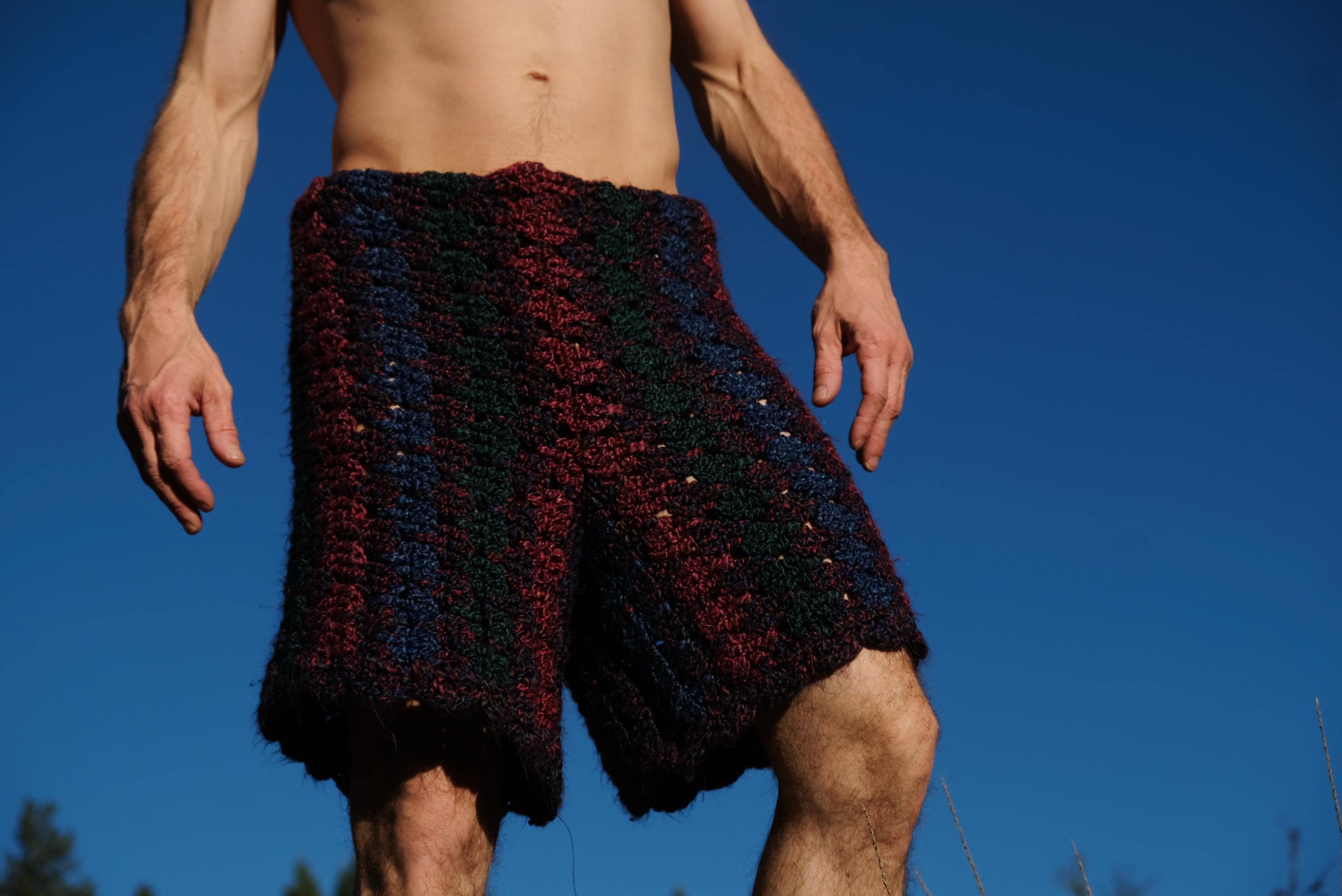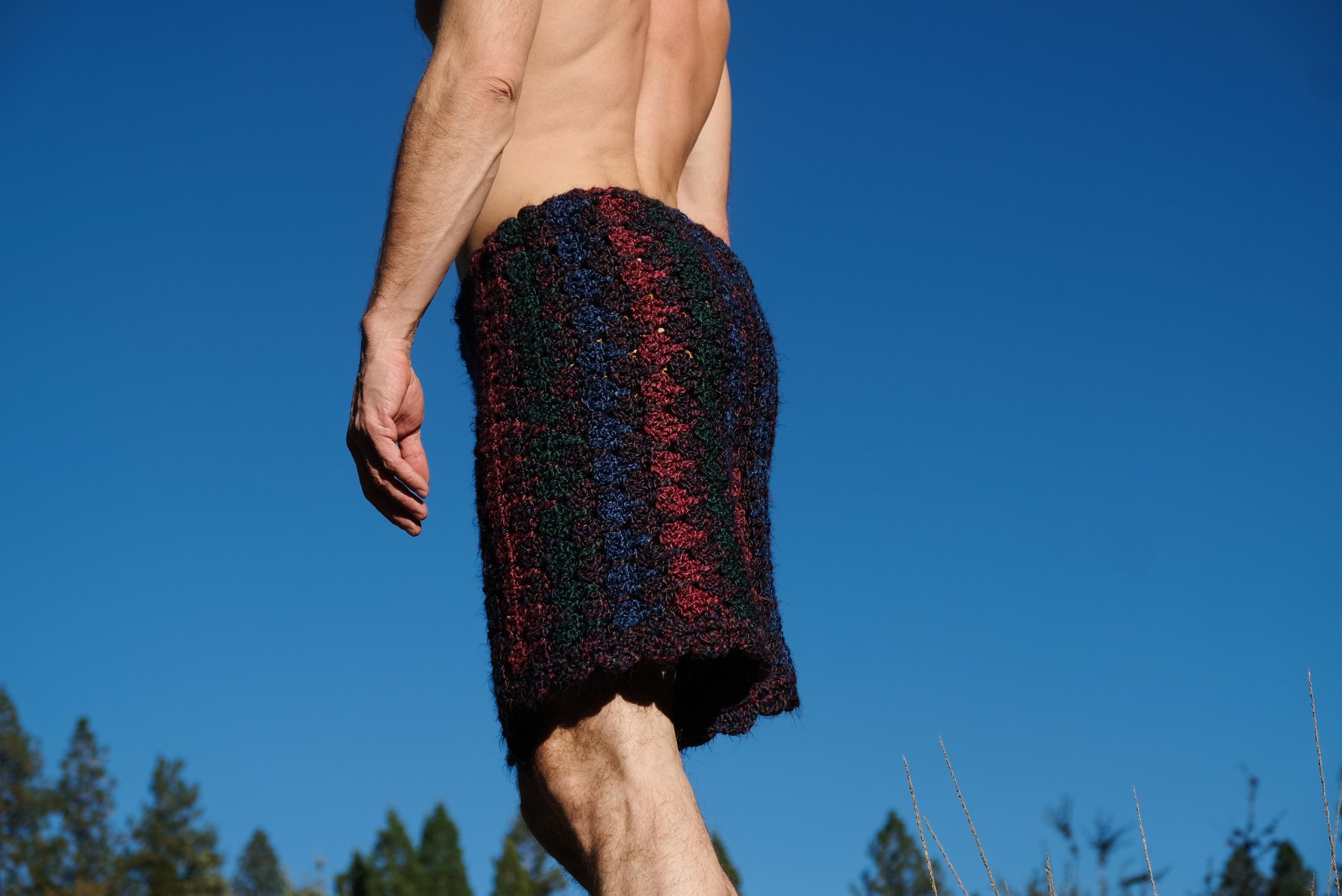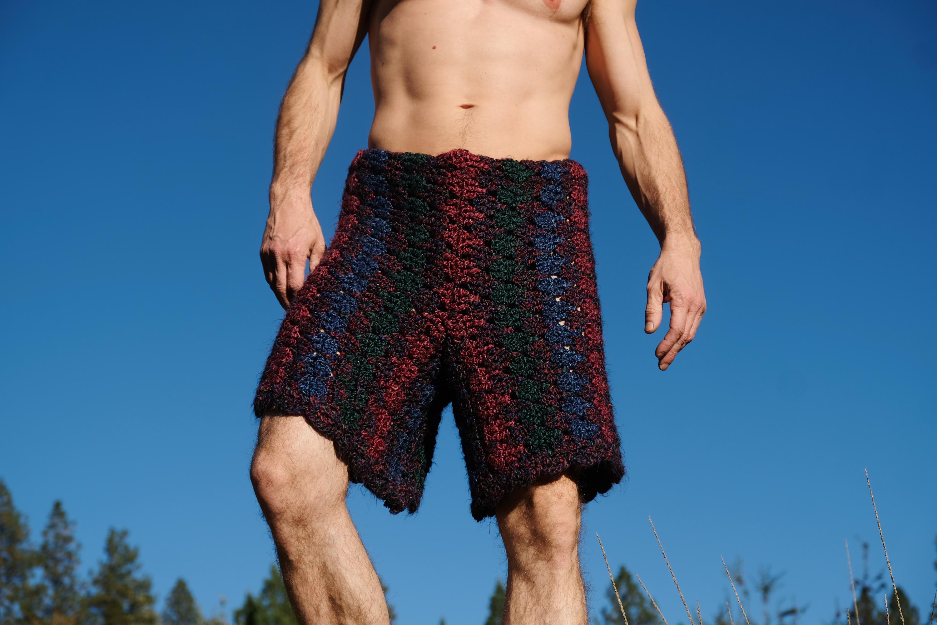 These are crochet shorts in dark earth tones, crocheted in a very soft yarn. Repurposed from a vintage afghan blanket crocheted in 100% acrylic yarn.