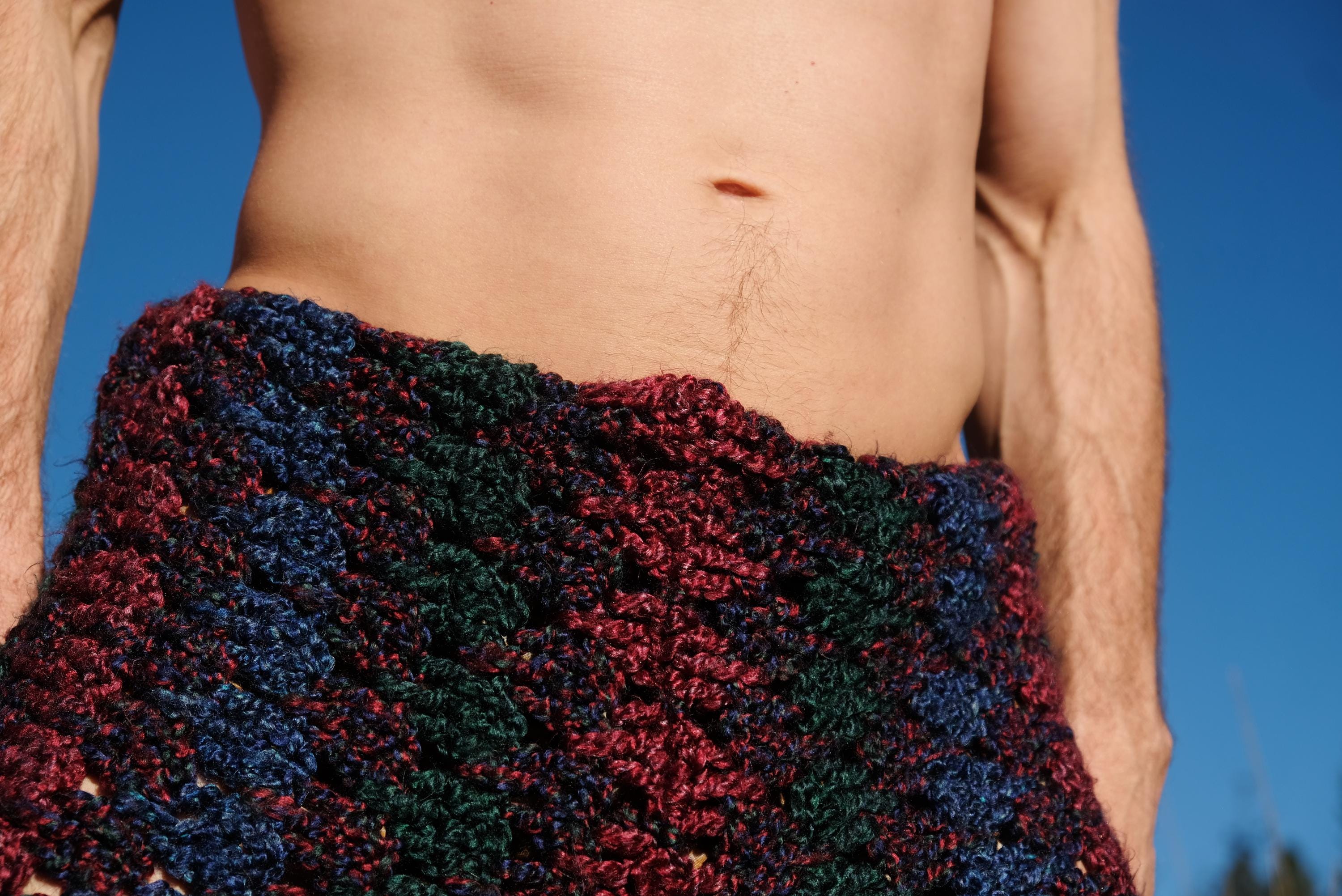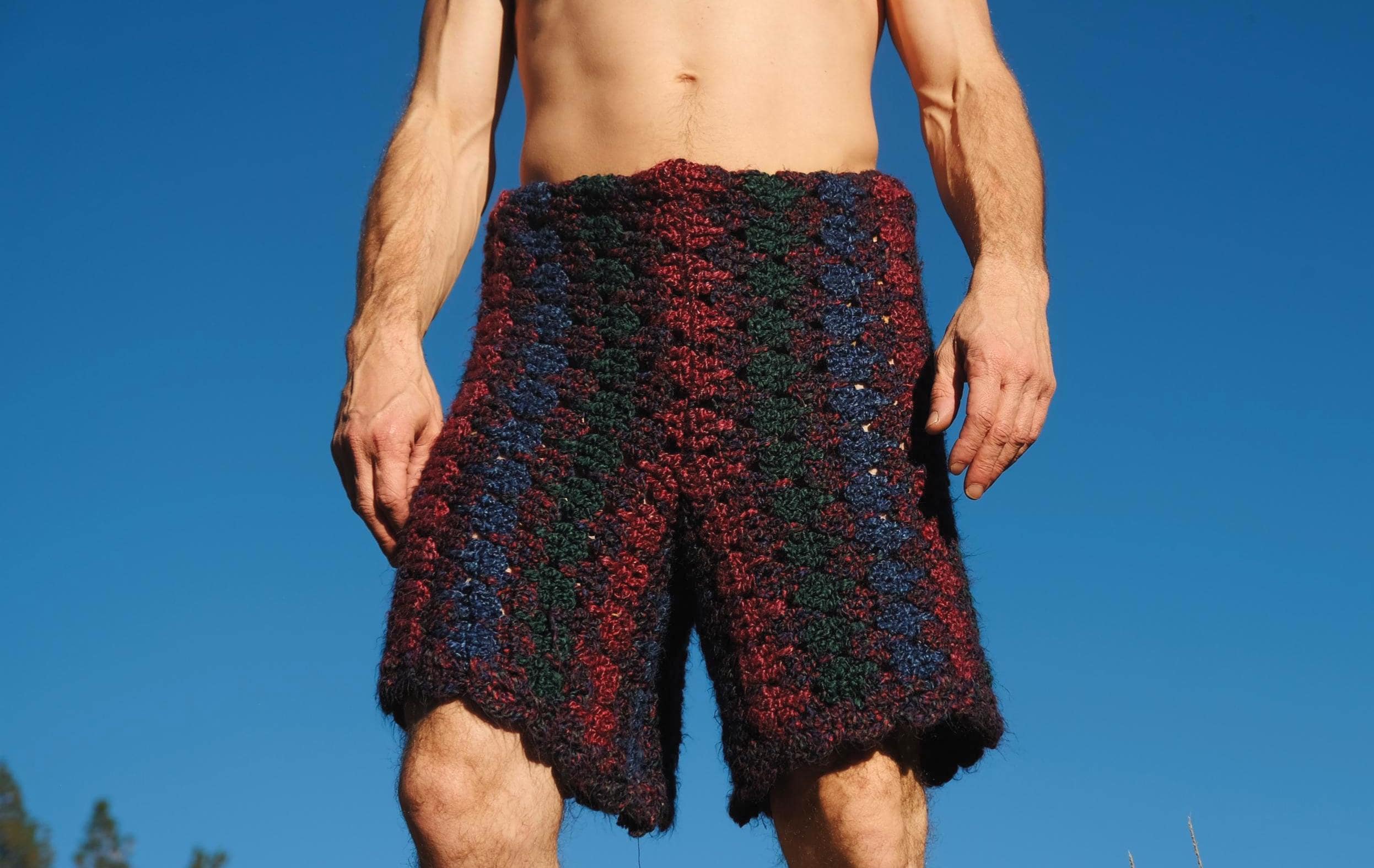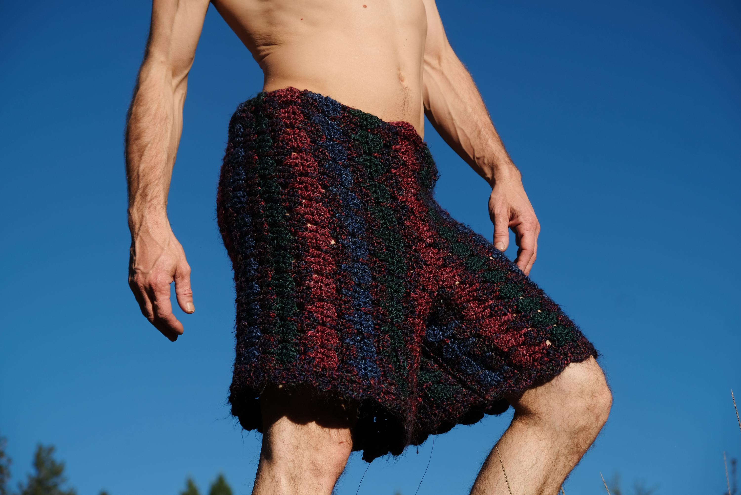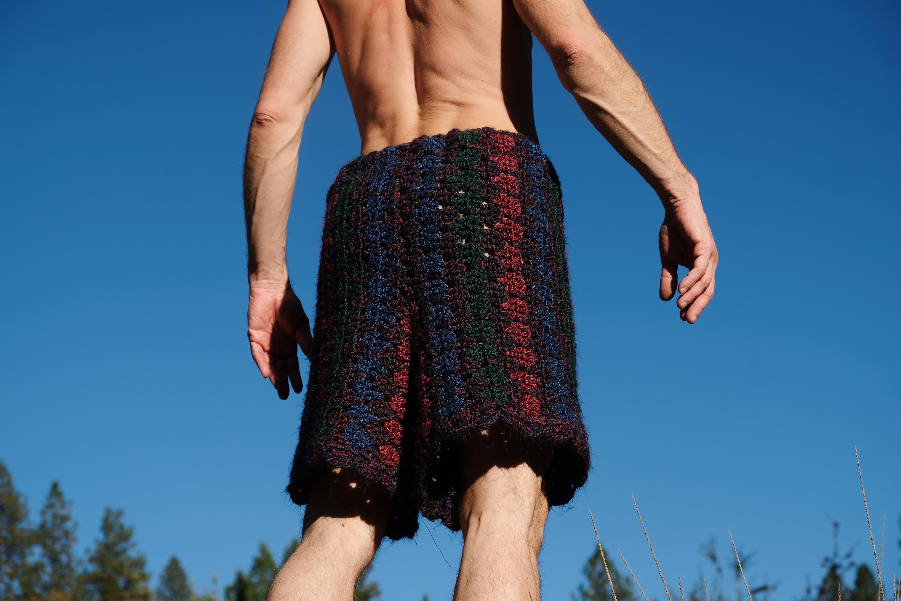 These are crochet shorts in dark earth tones, crocheted in a very soft yarn. Repurposed from a vintage afghan blanket crocheted in 100% acrylic yarn.