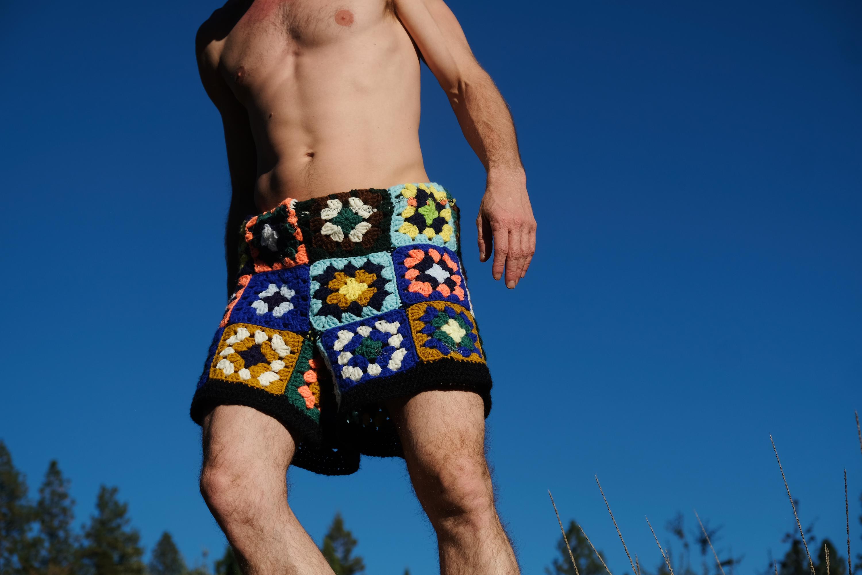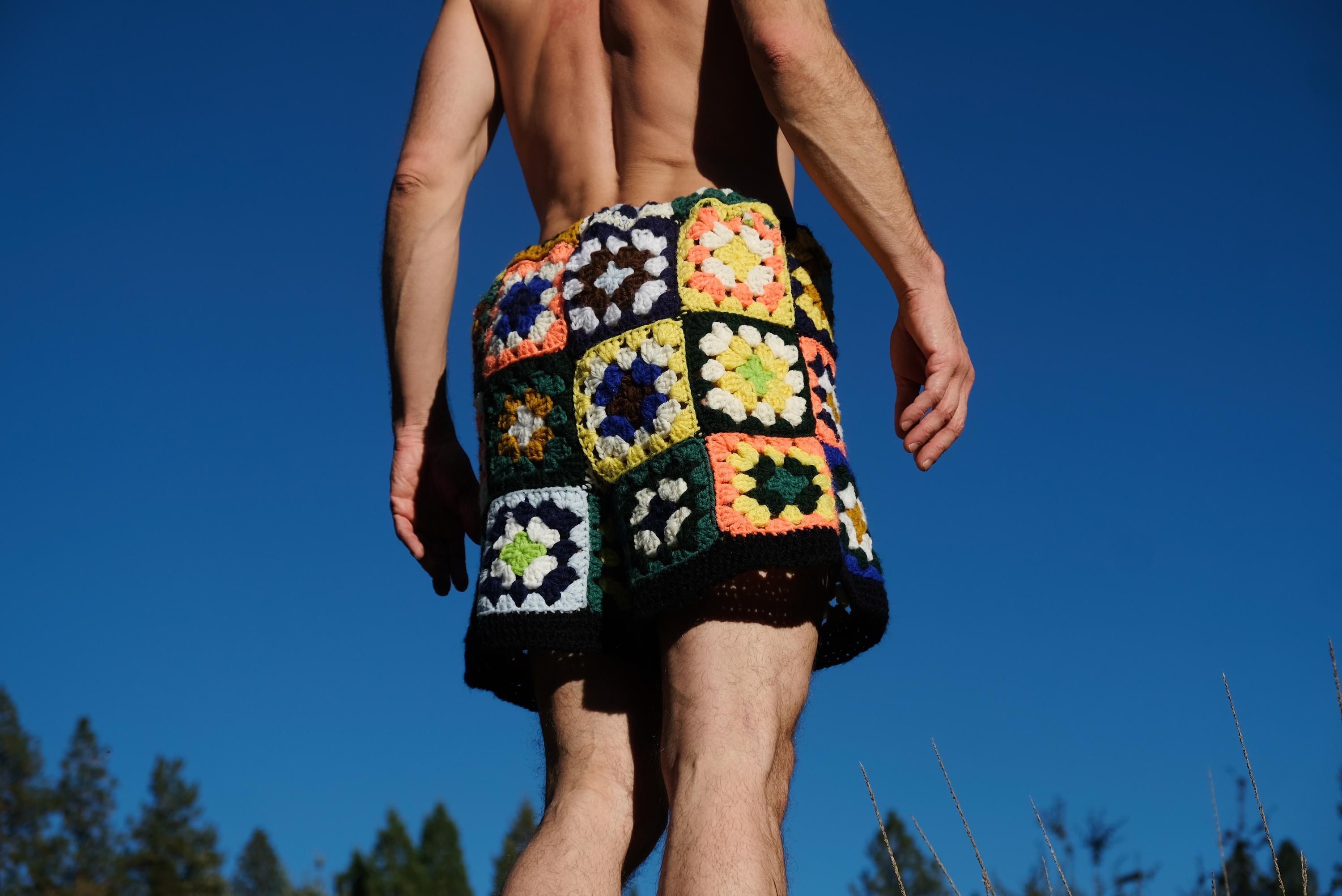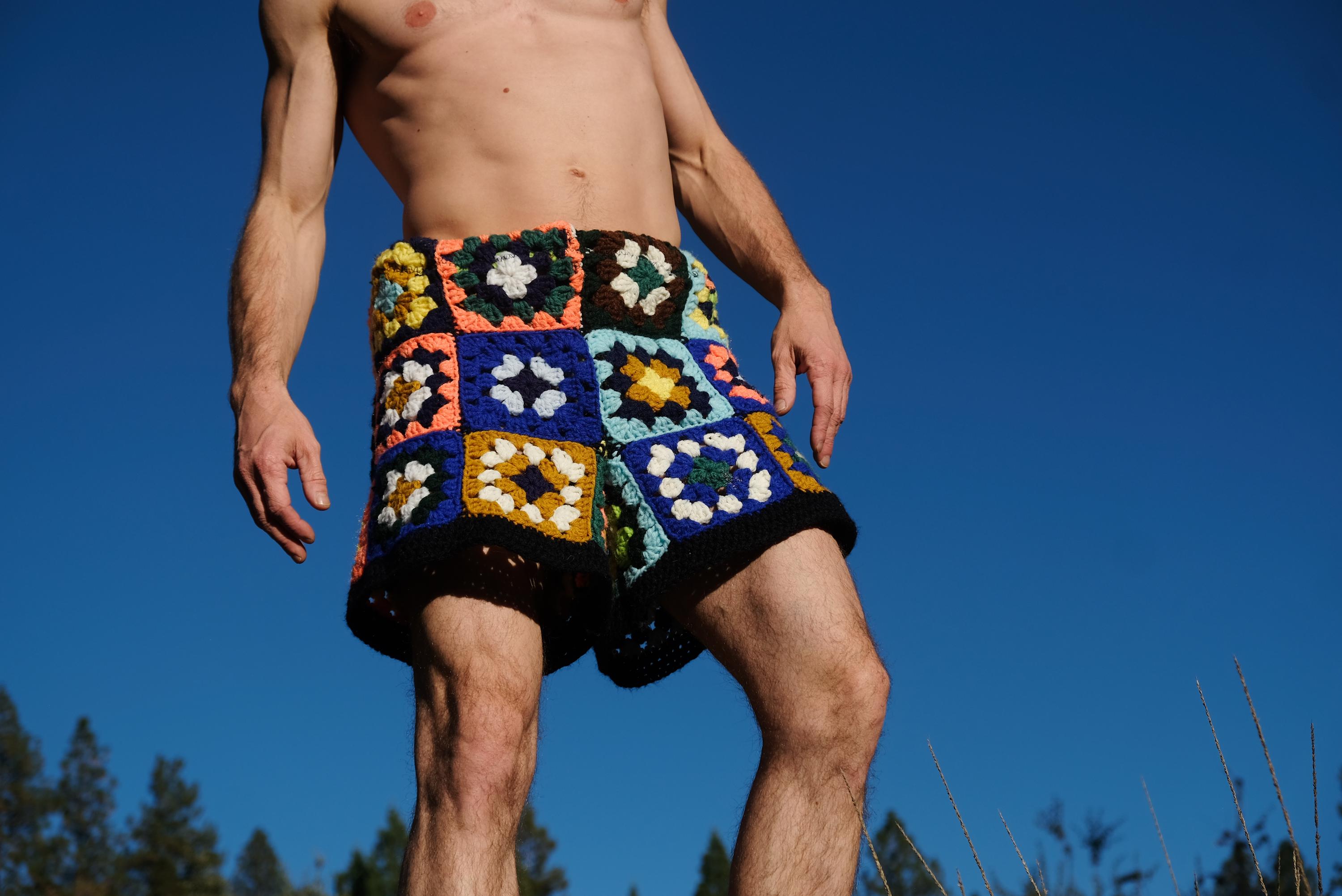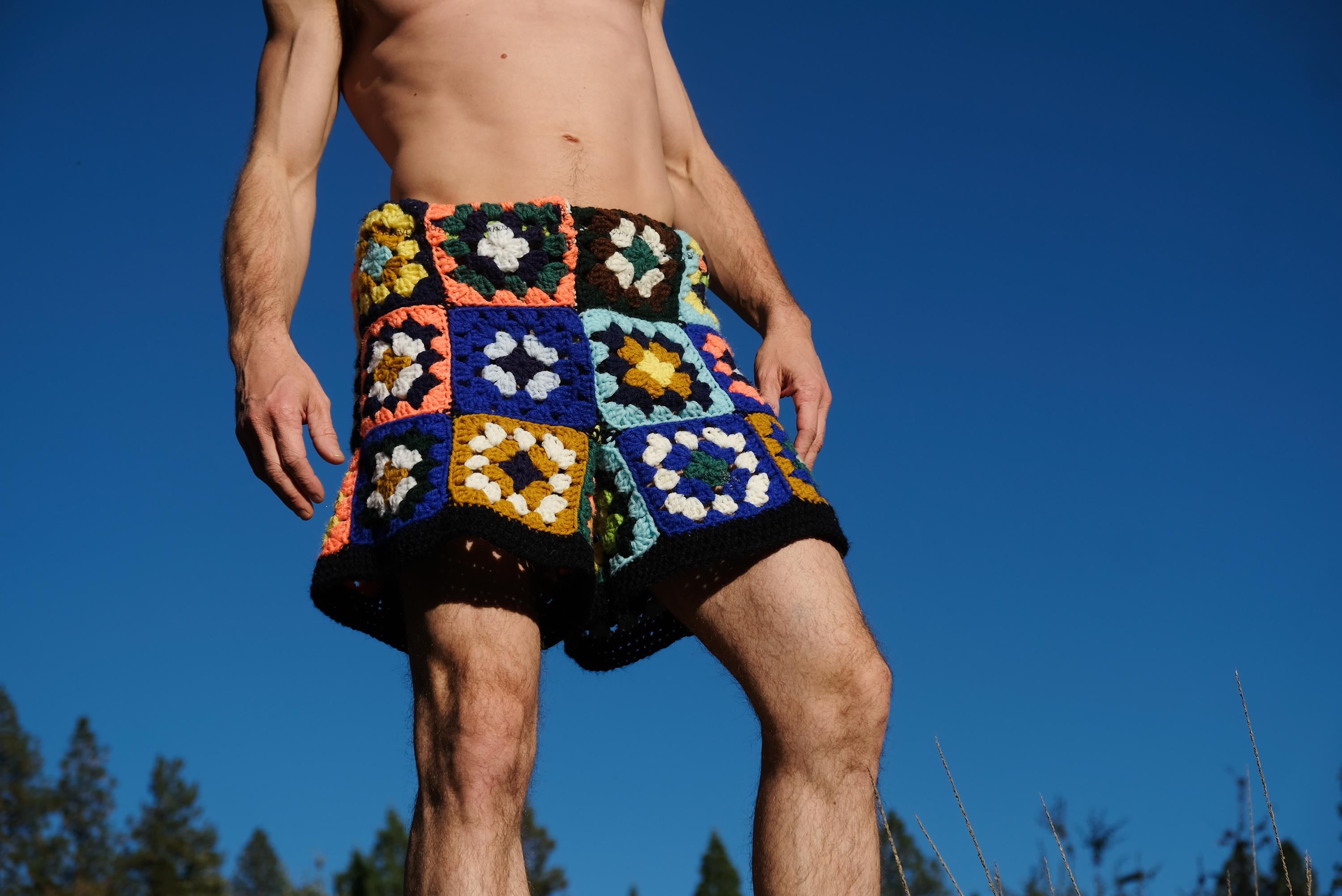 These are crochet shorts in multicolor granny squares. Repurposed from a vintage afghan blanket crocheted in 100% acrylic yarn.