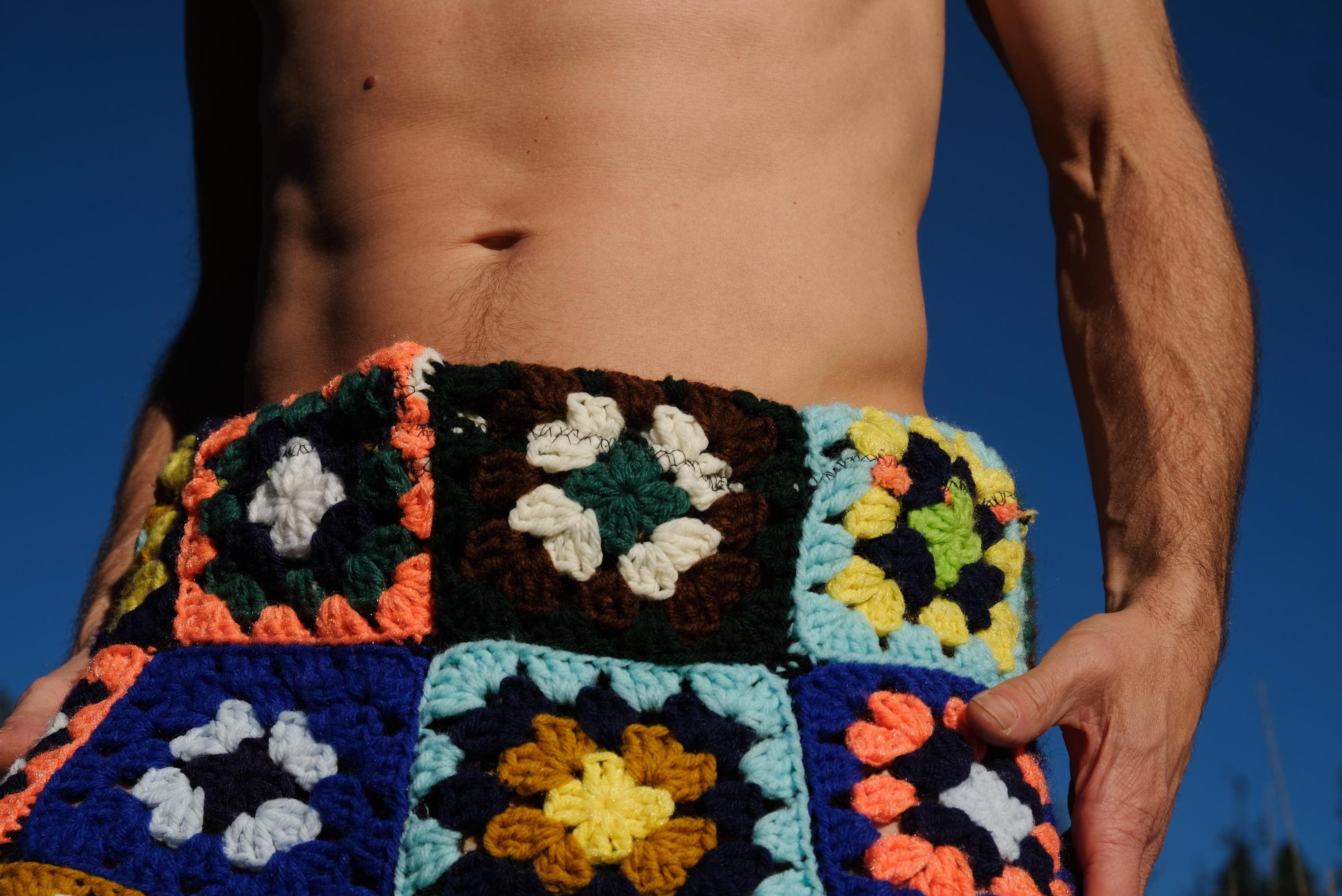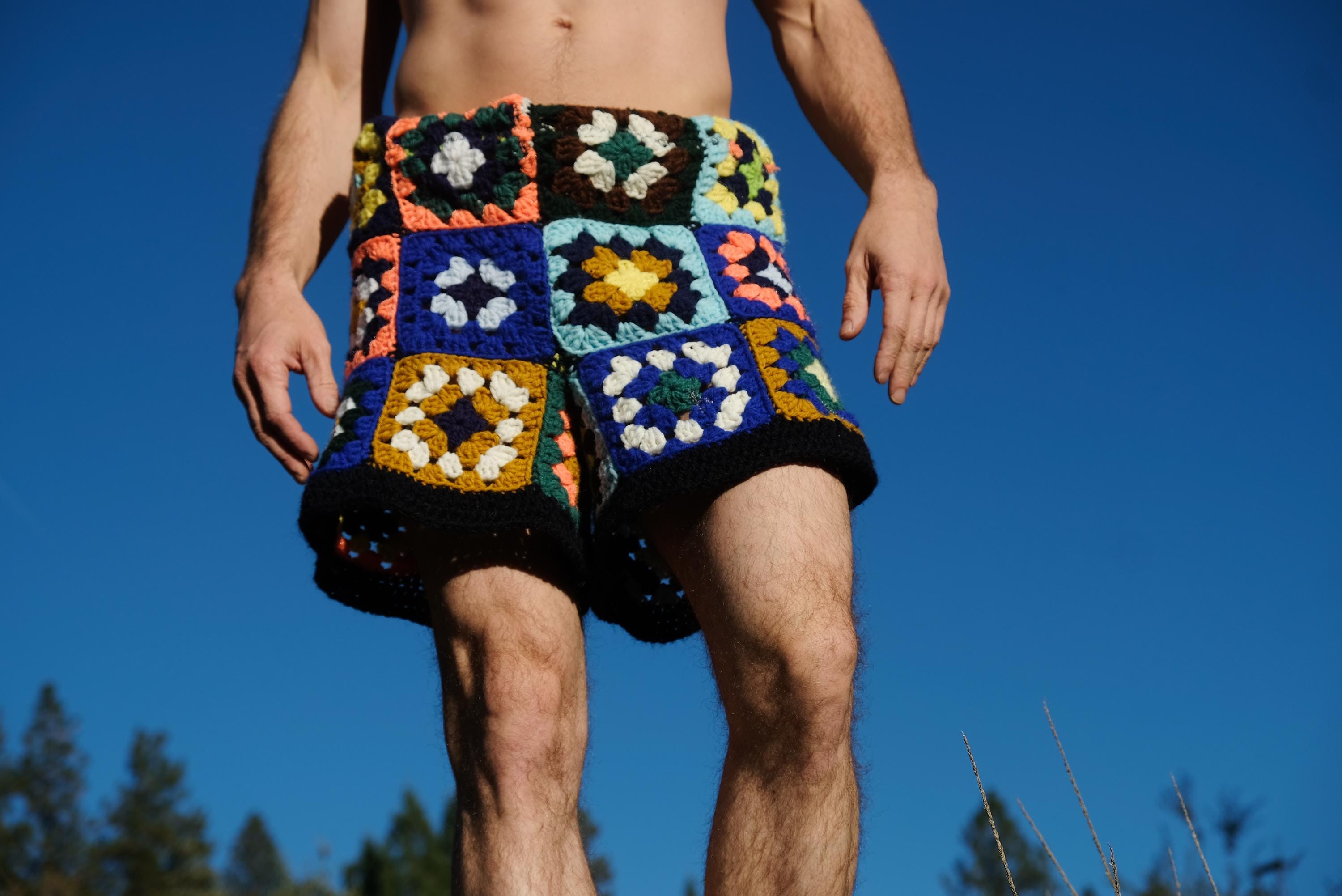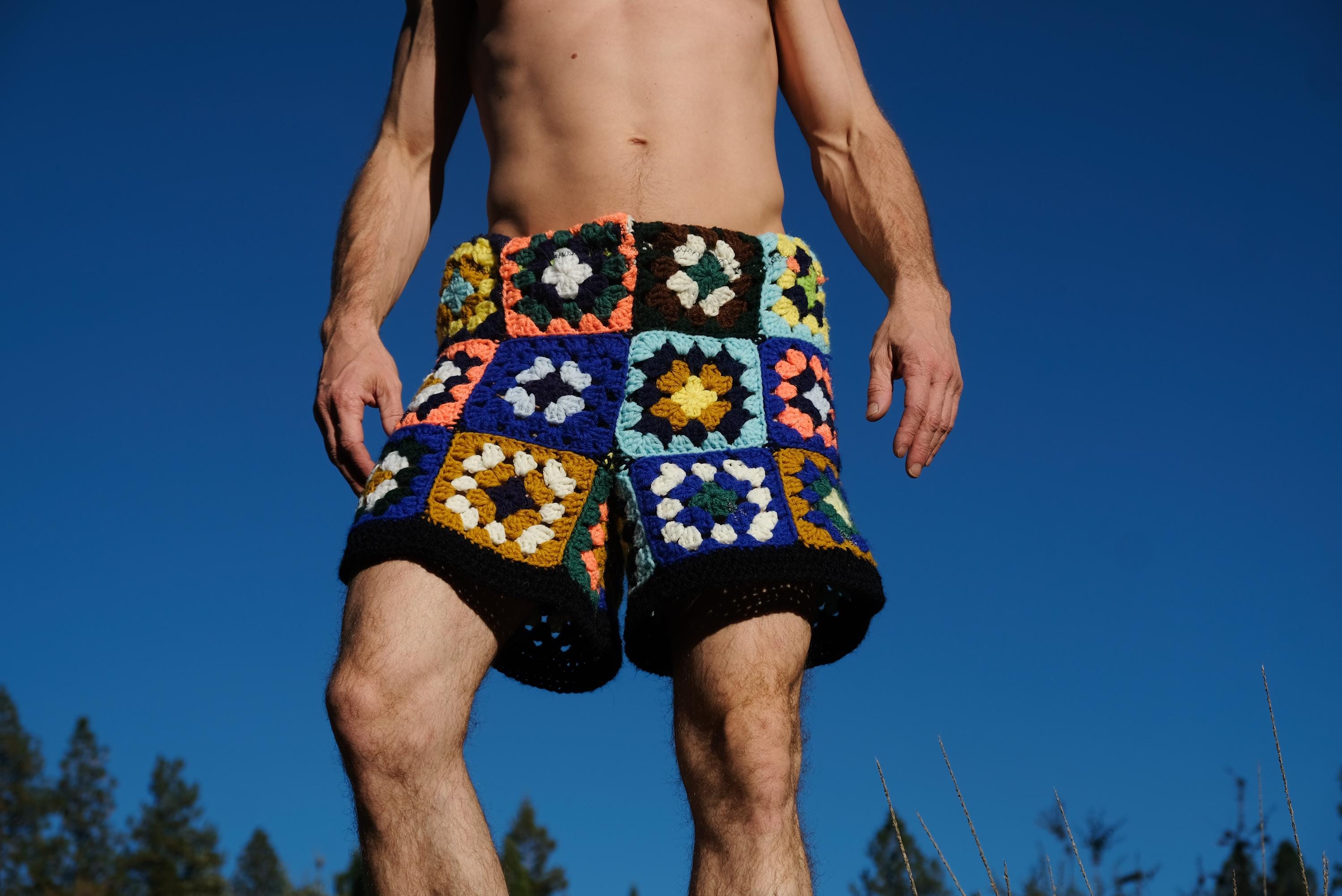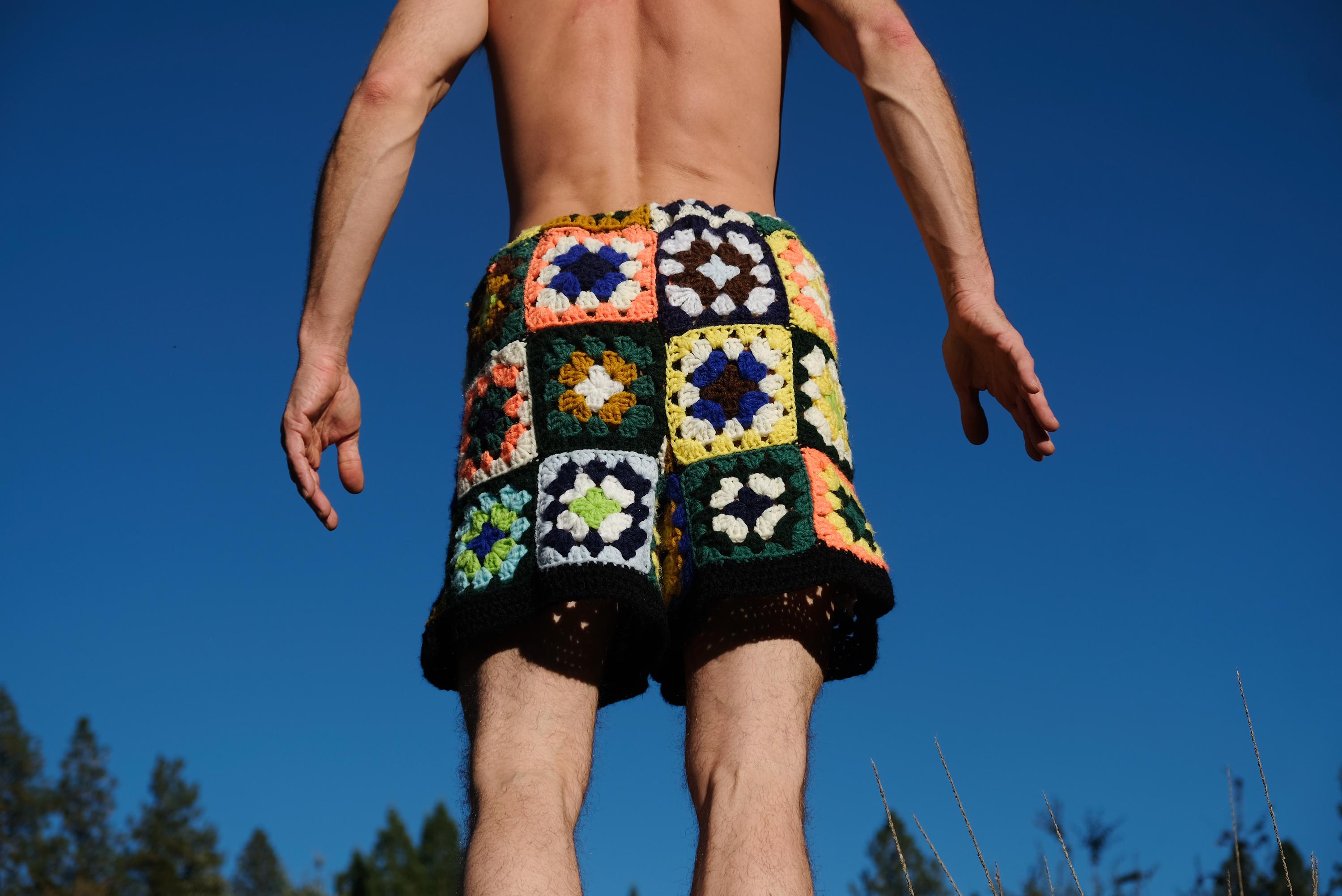 These are crochet shorts in multicolor granny squares. Repurposed from a vintage afghan blanket crocheted in 100% acrylic yarn.