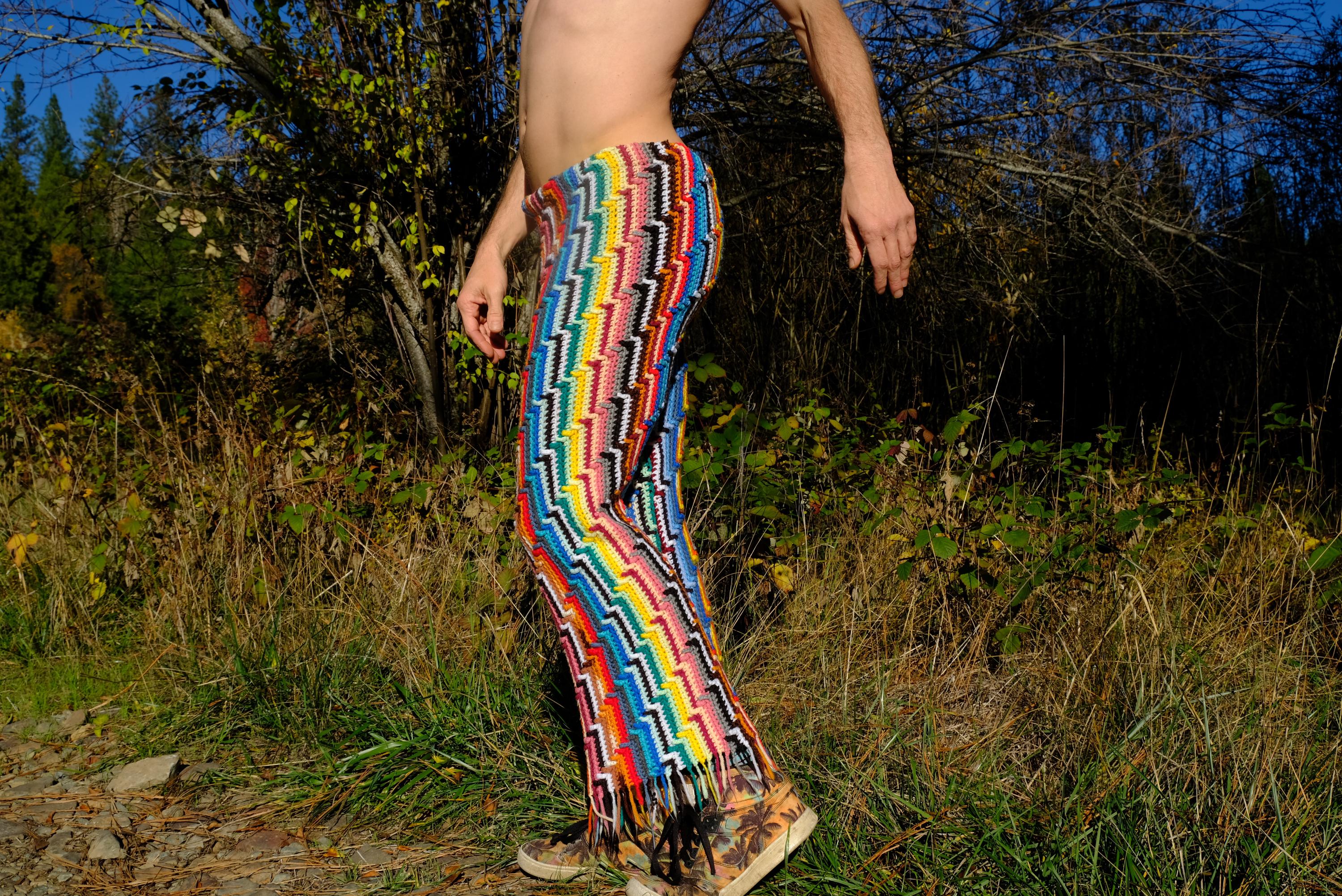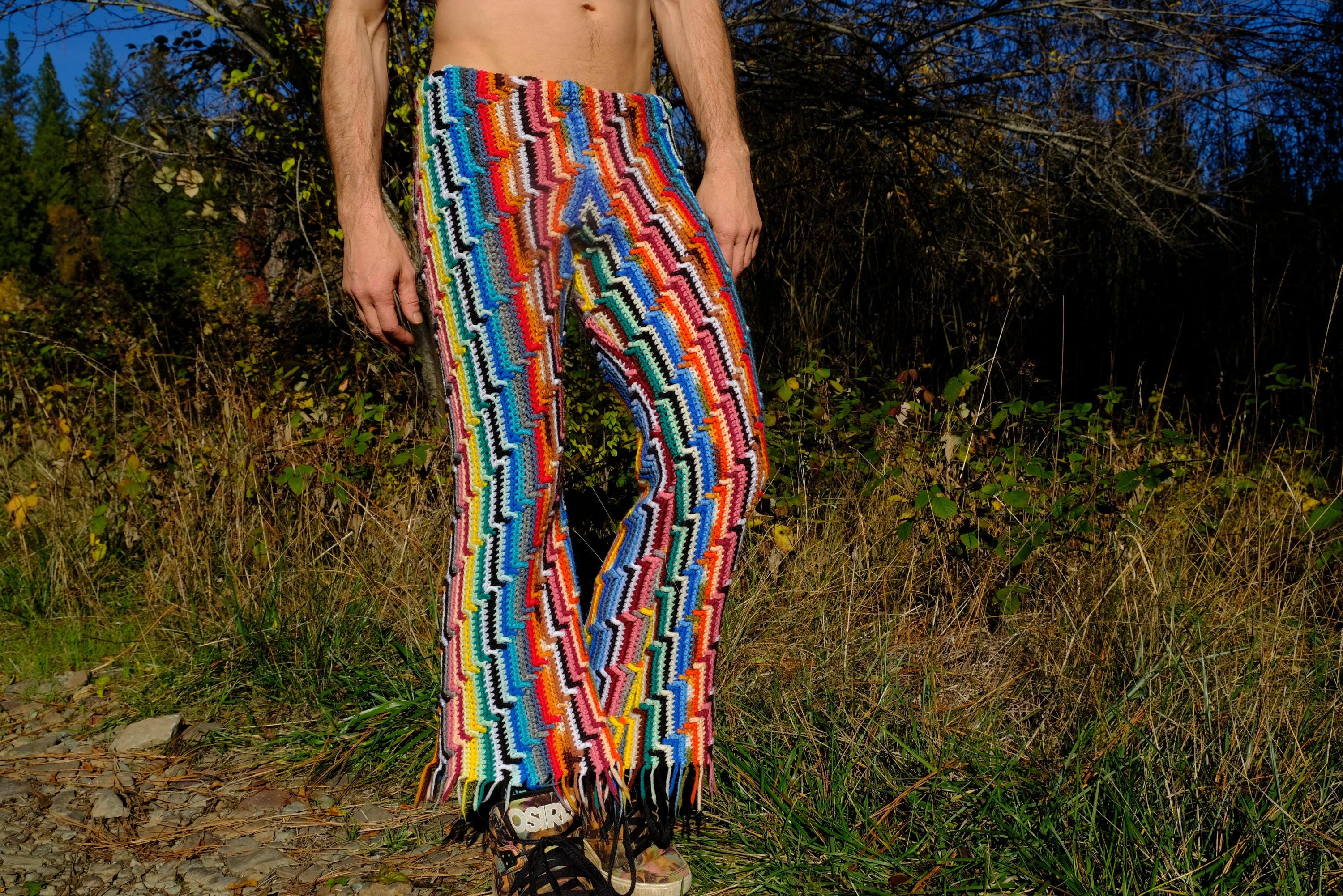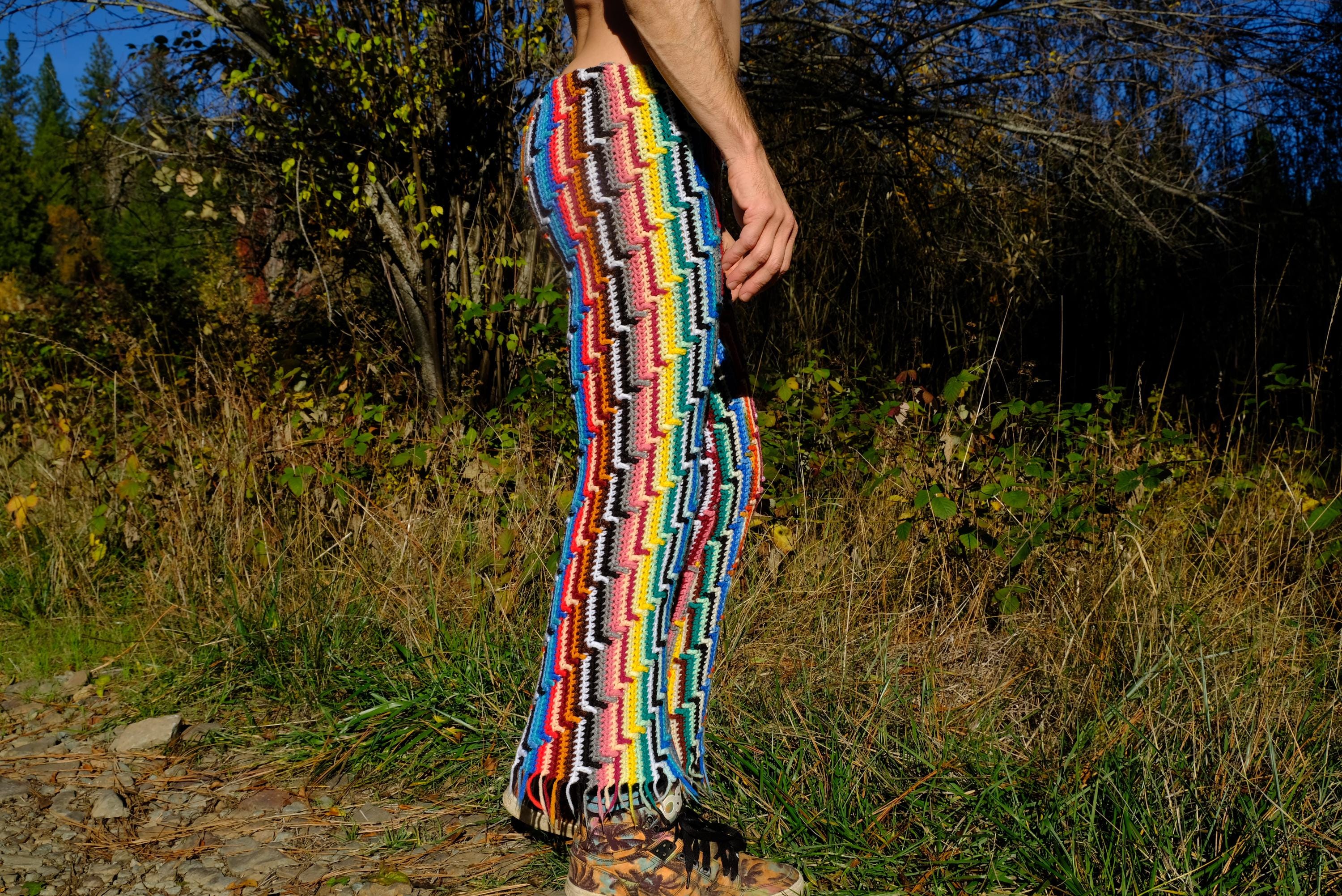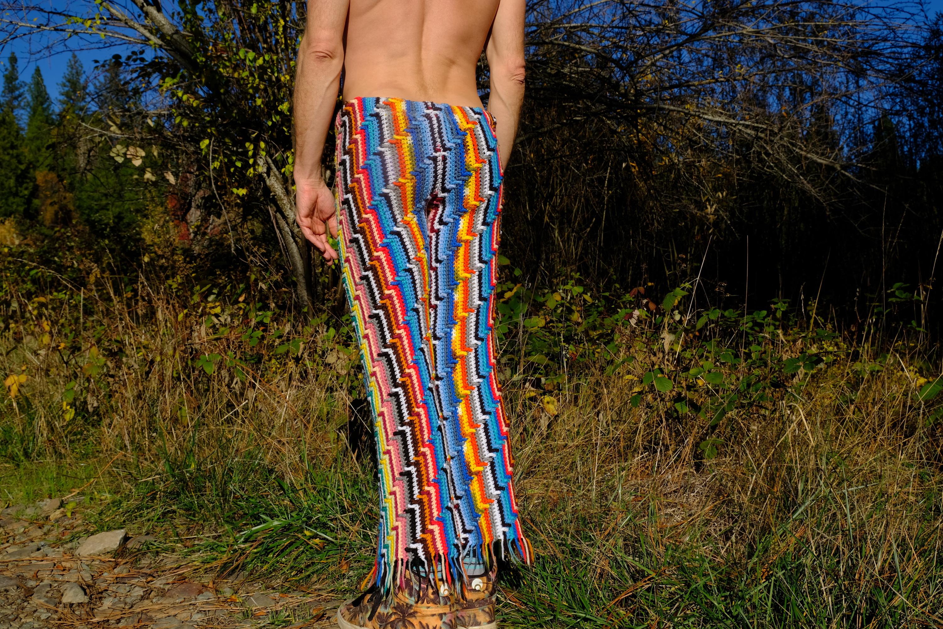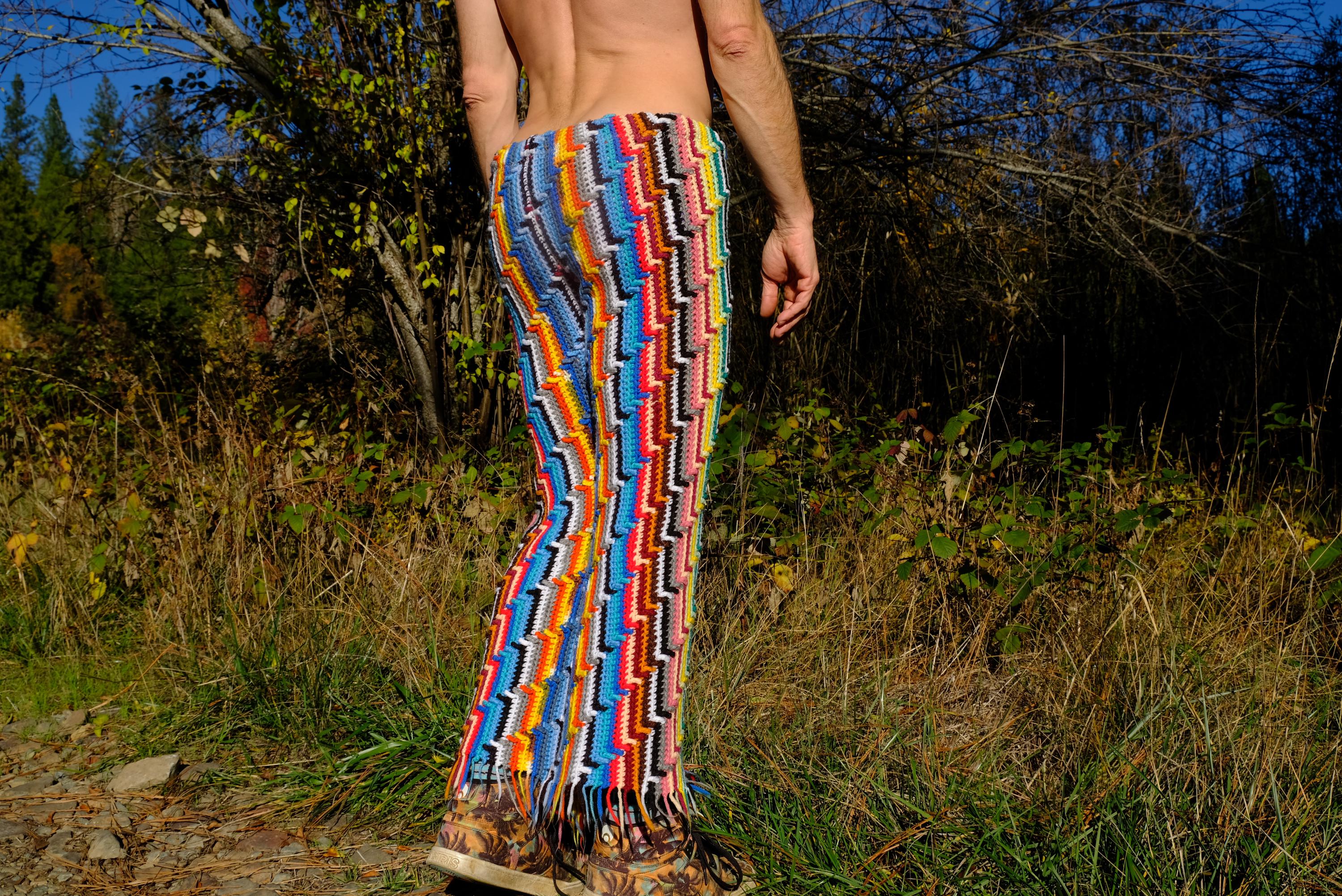 These are crochet pants with rainbow stripes. Fashioned from a vintage afghan blanket crocheted in 100% acrylic yarn.