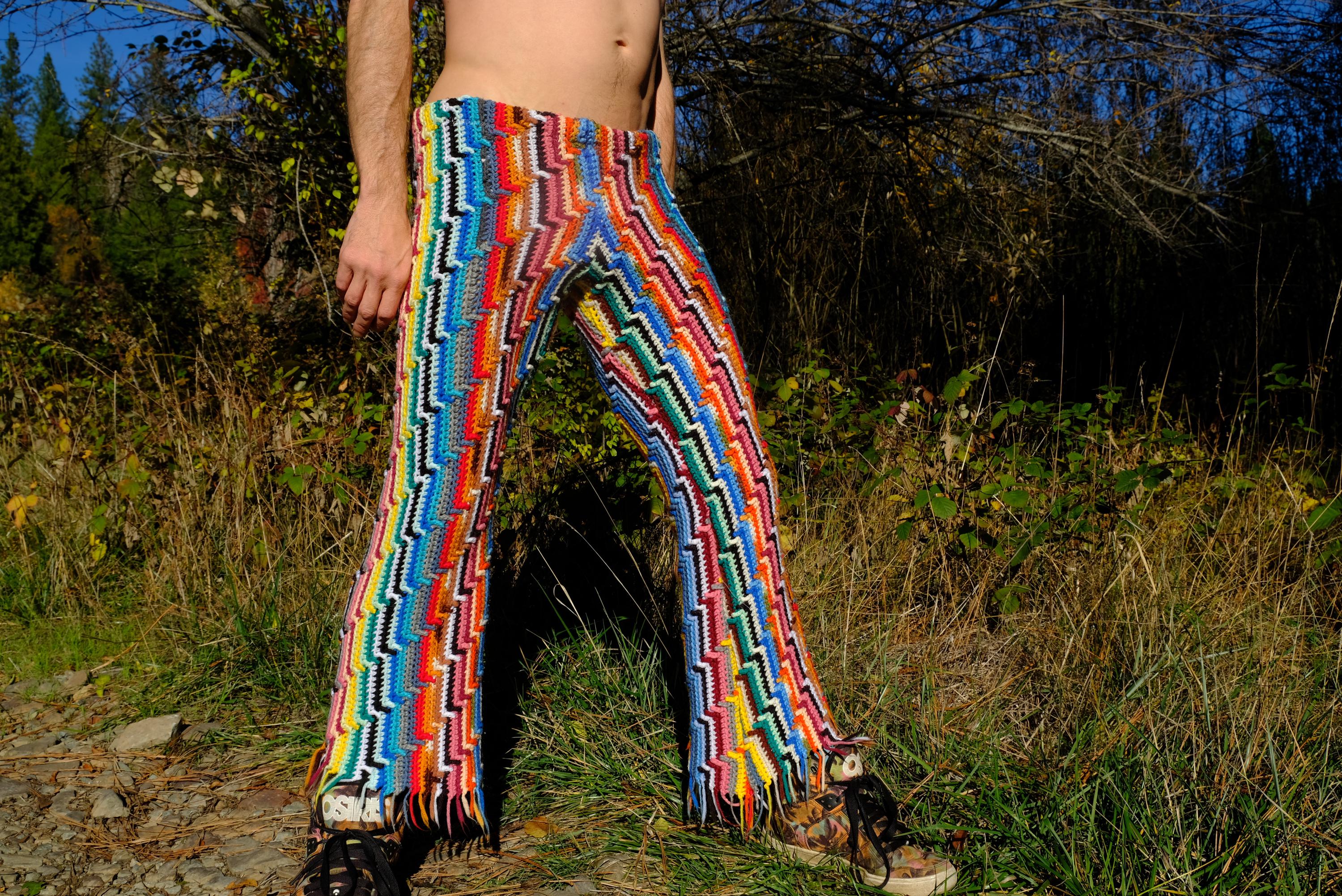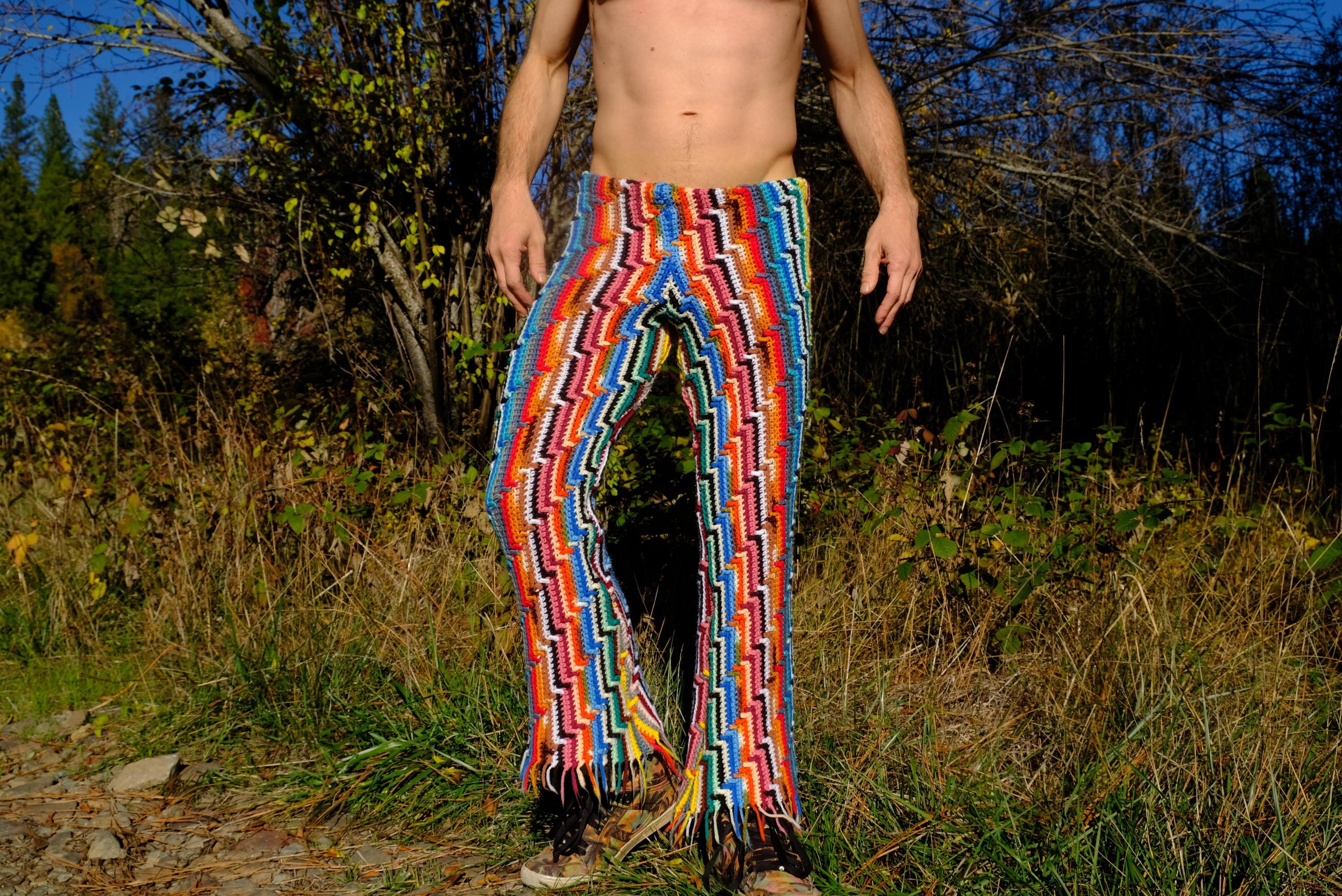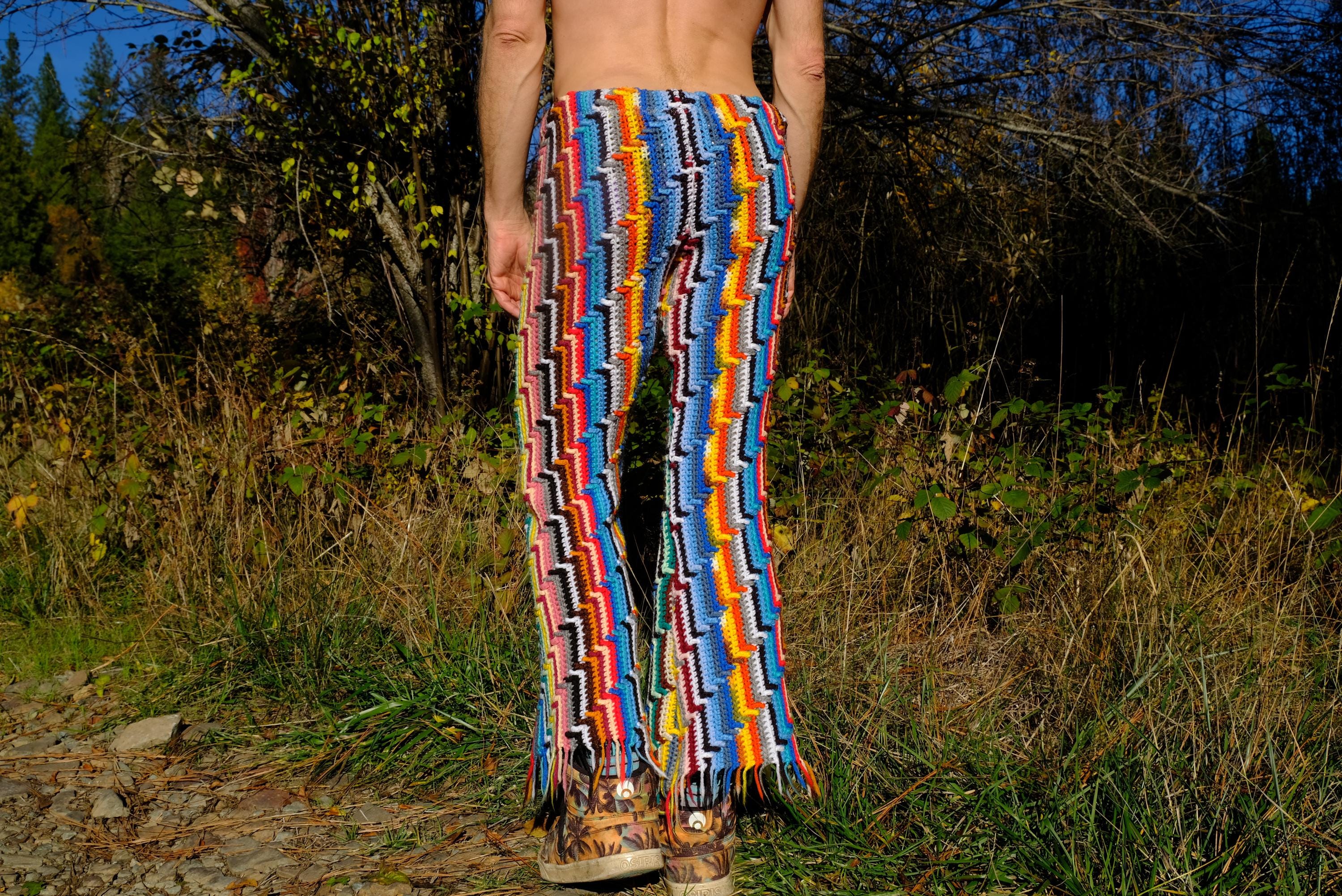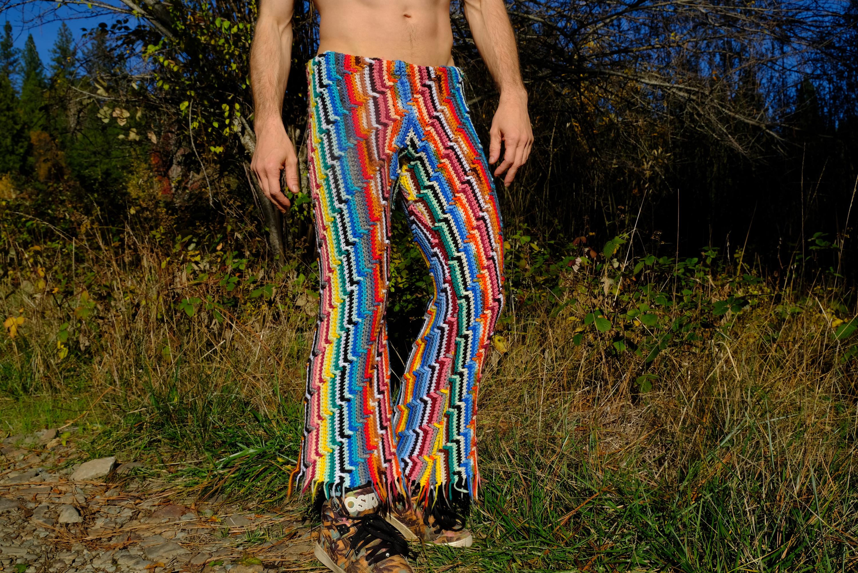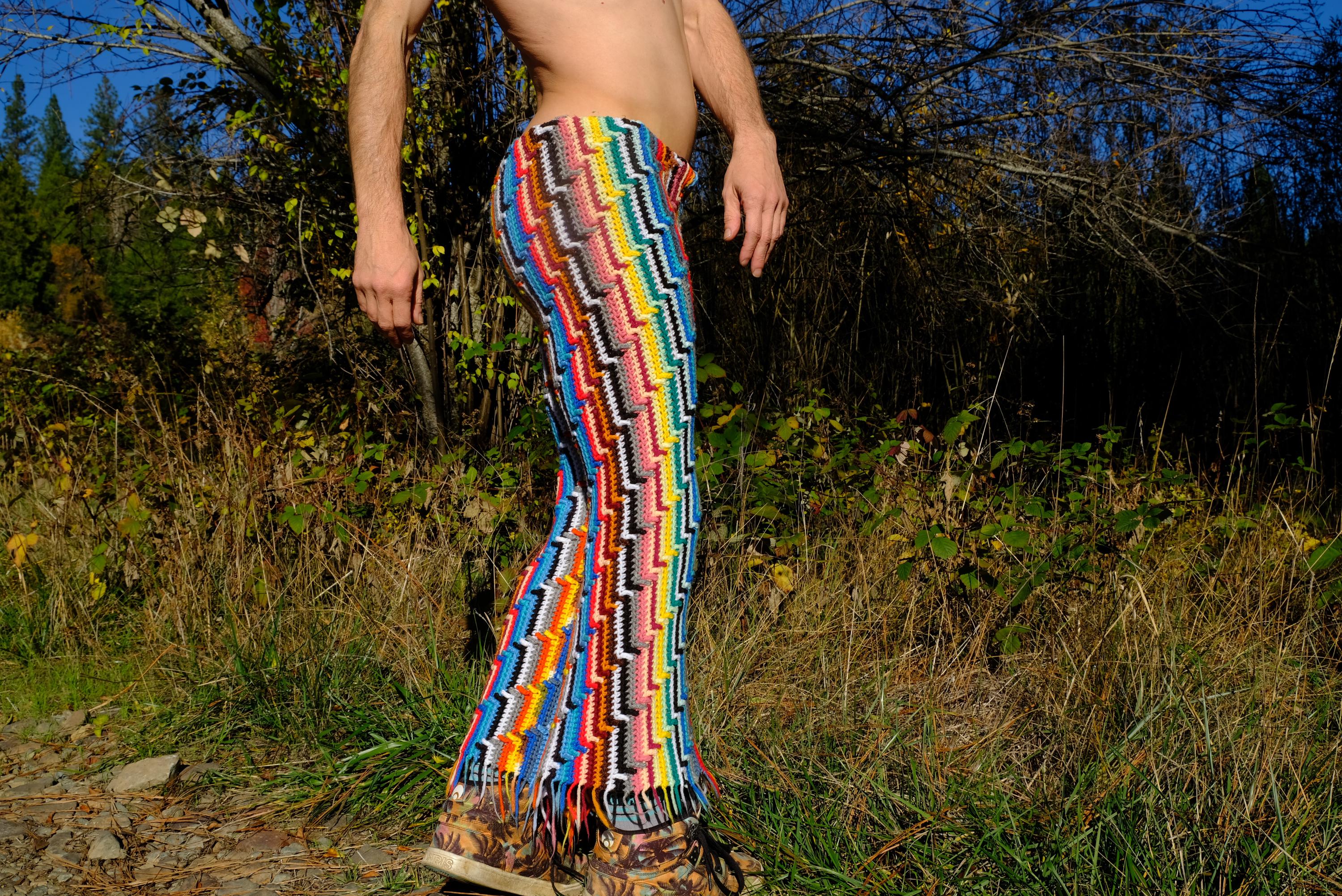 These are crochet pants with rainbow stripes. Fashioned from a vintage afghan blanket crocheted in 100% acrylic yarn.