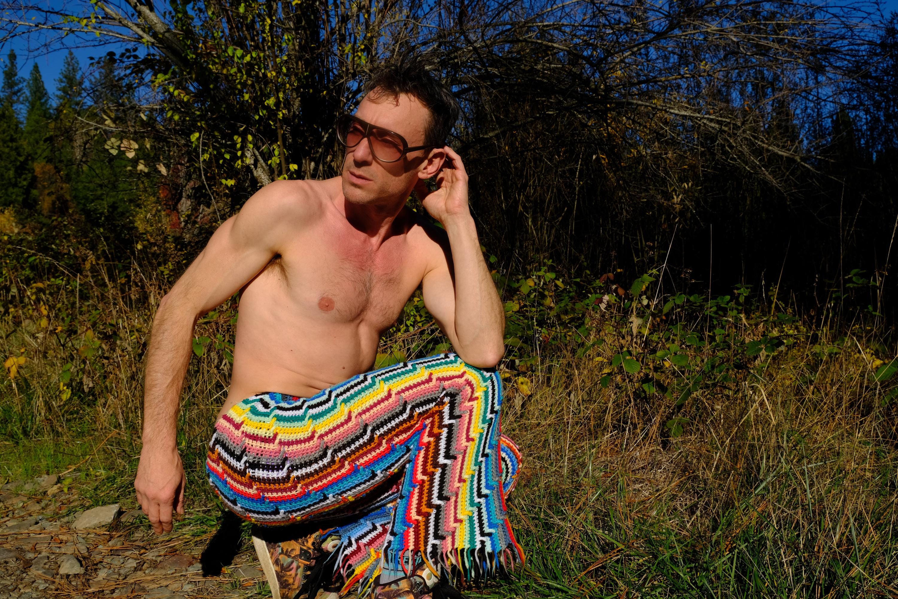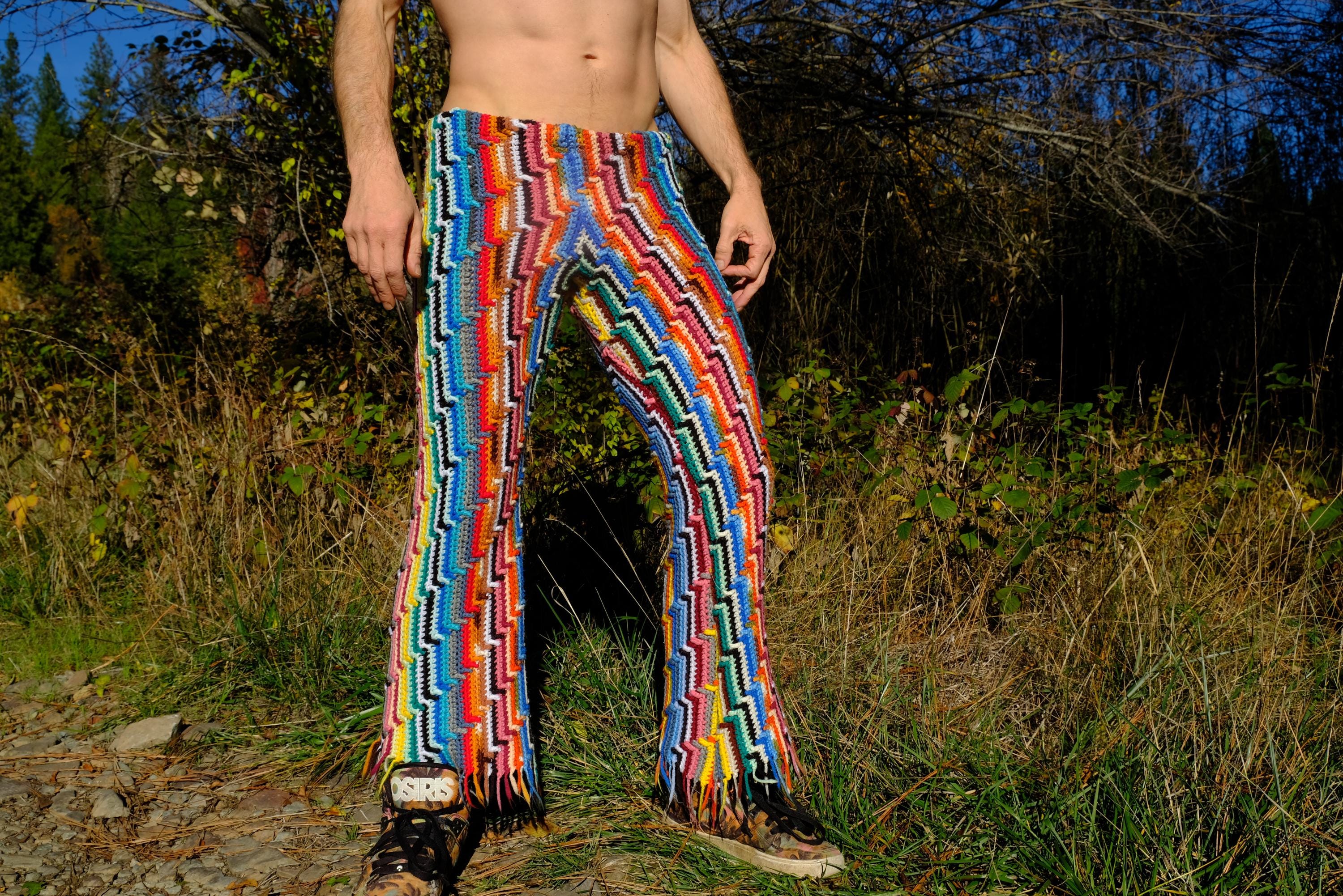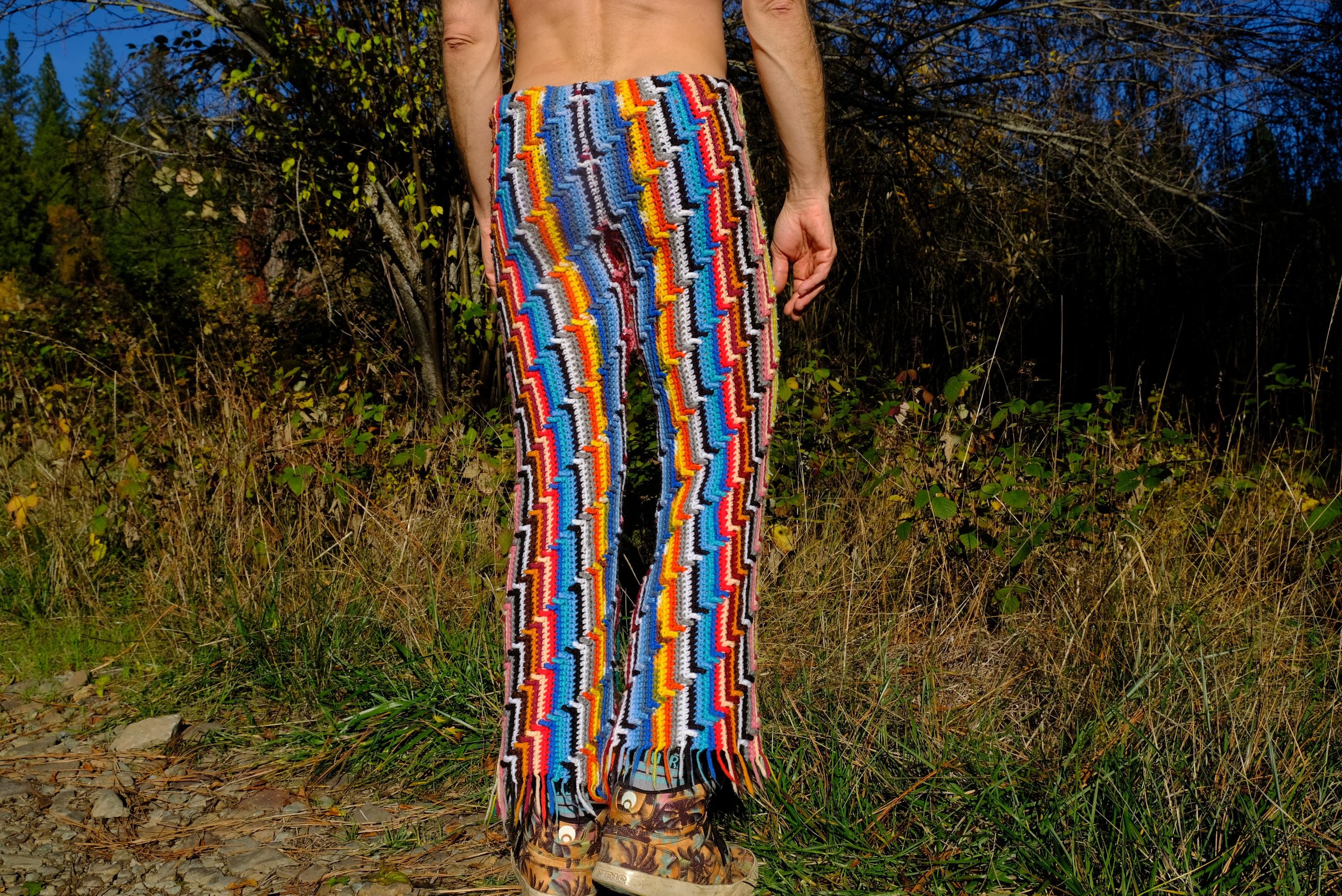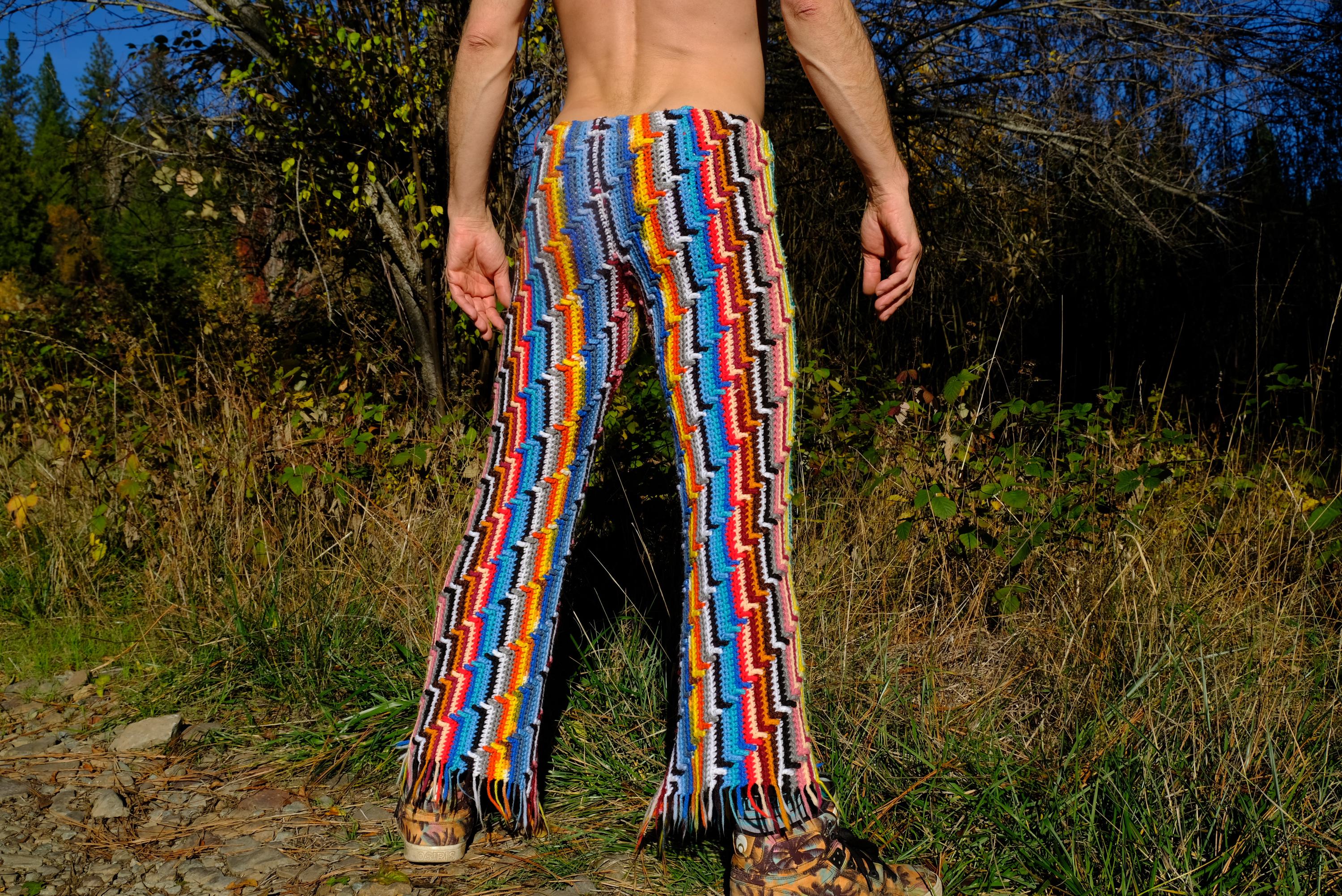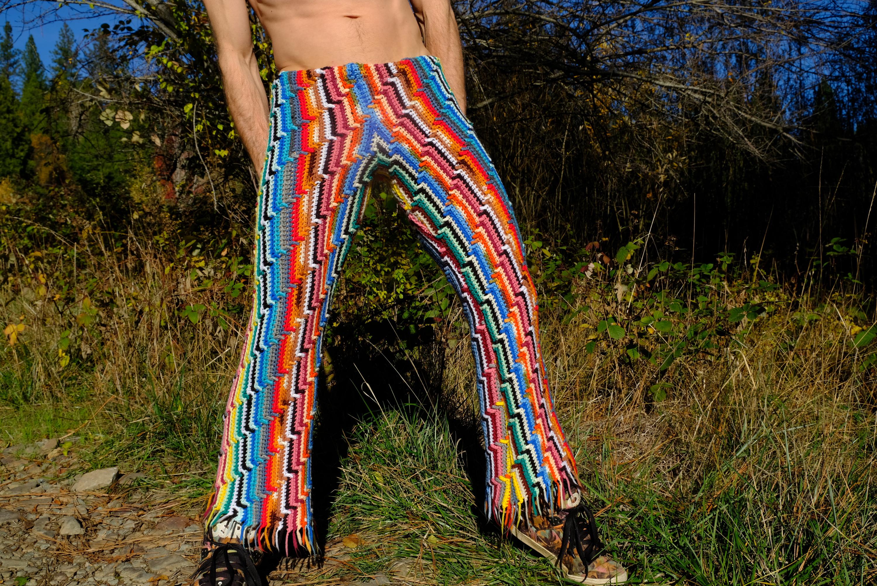 These are crochet pants with rainbow stripes. Fashioned from a vintage afghan blanket crocheted in 100% acrylic yarn.
