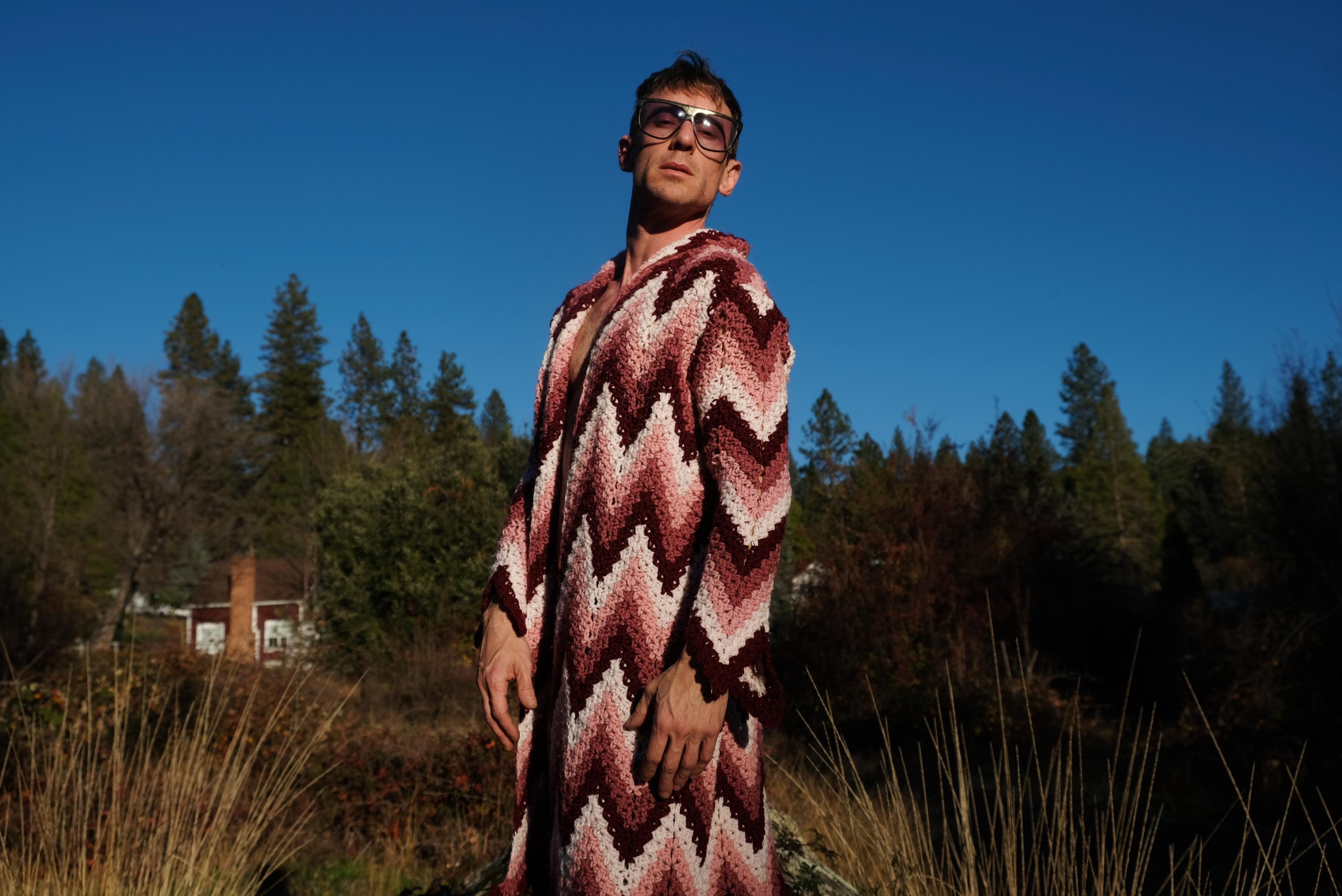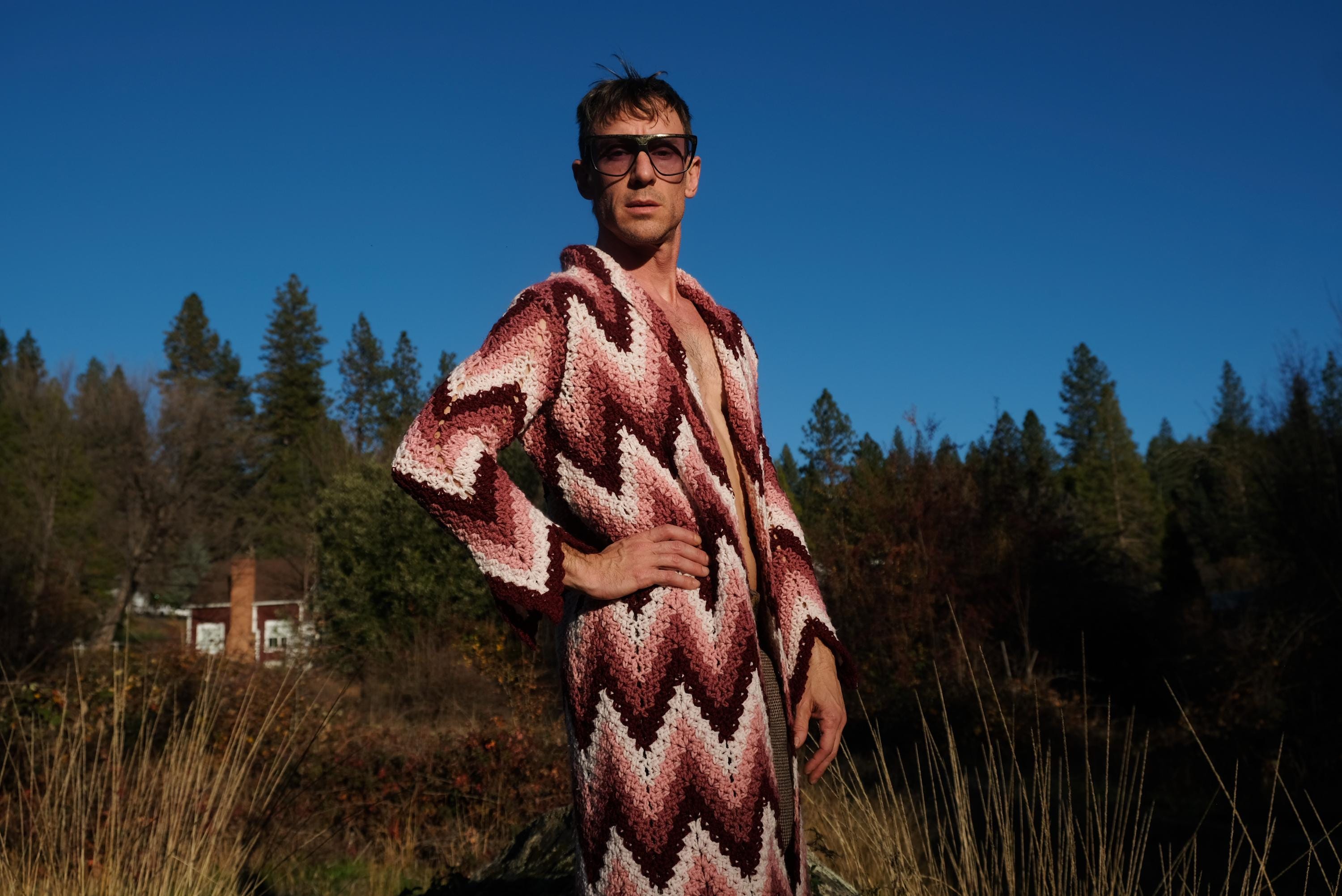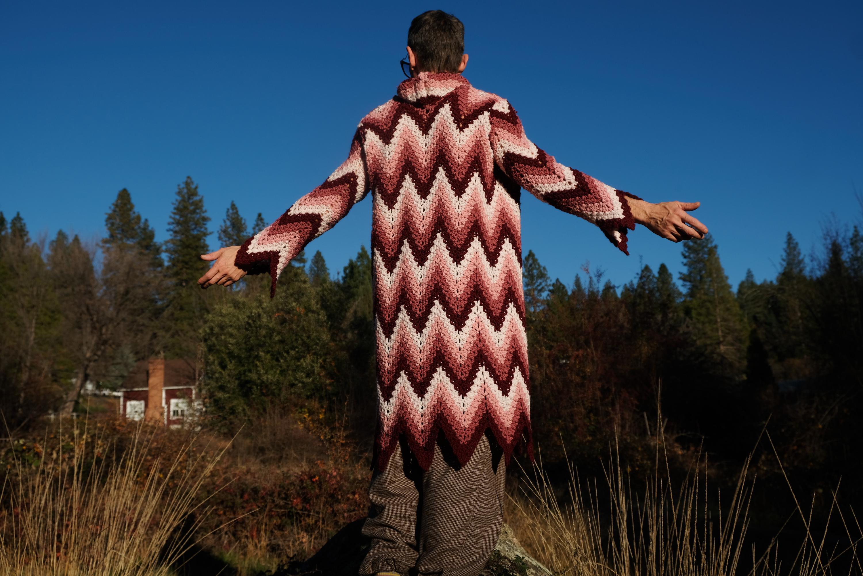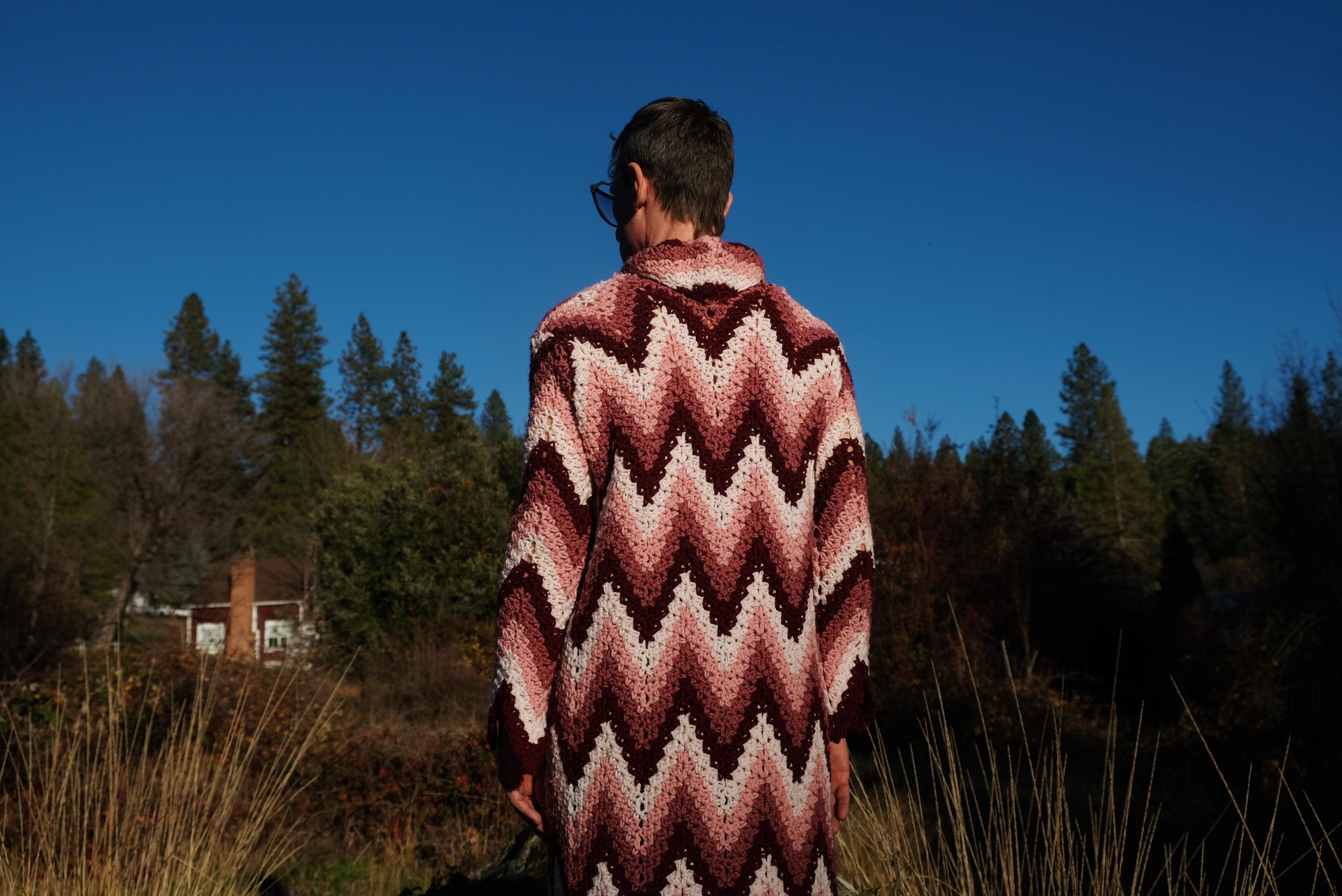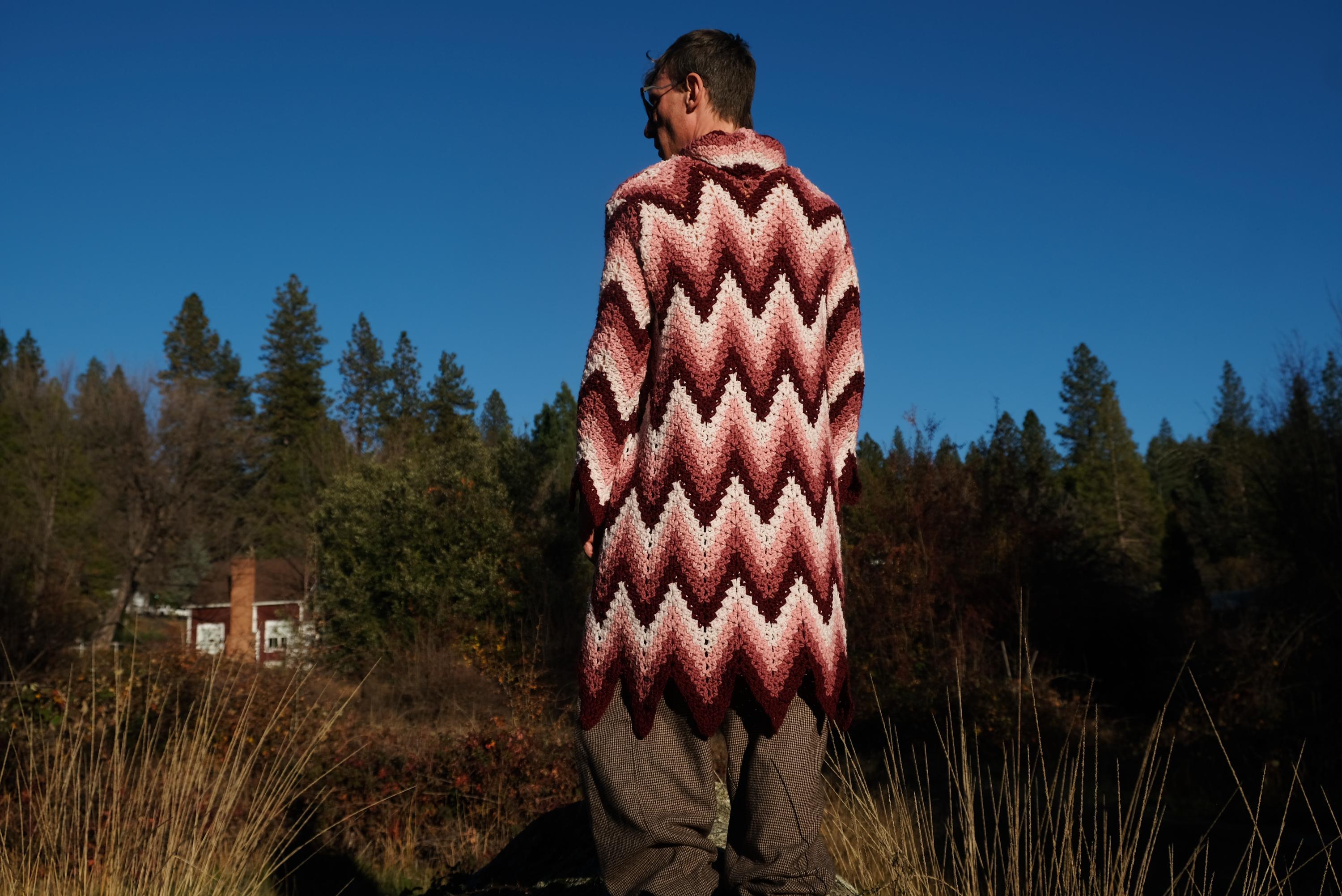 This is a crochet chevron pattern robe in a color gradient of white to burgundy. Beautifully up-cycled from an afghan blanket in 100% acrylic yarn, and hand tailored by yours truly, Lord von Schmitt.