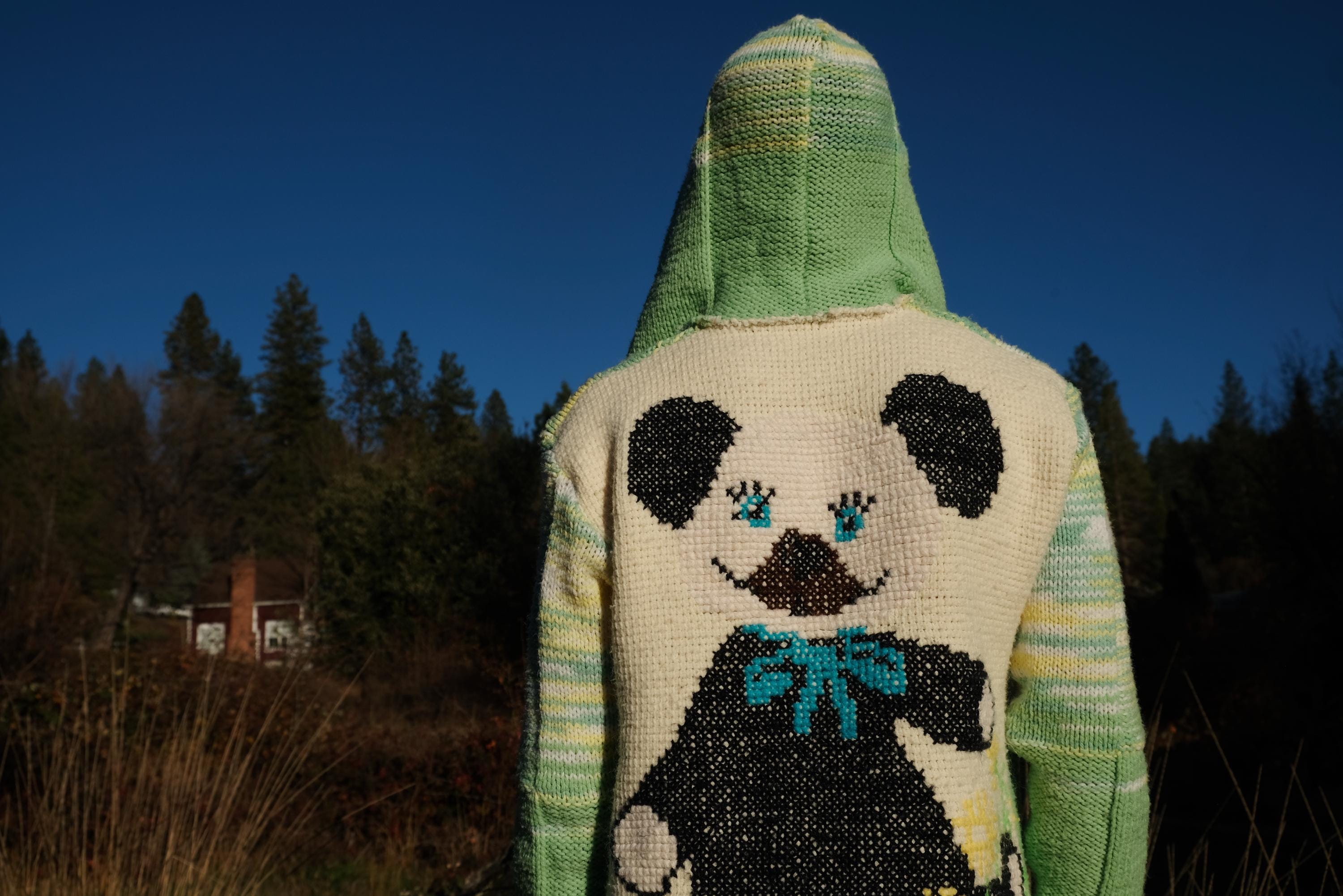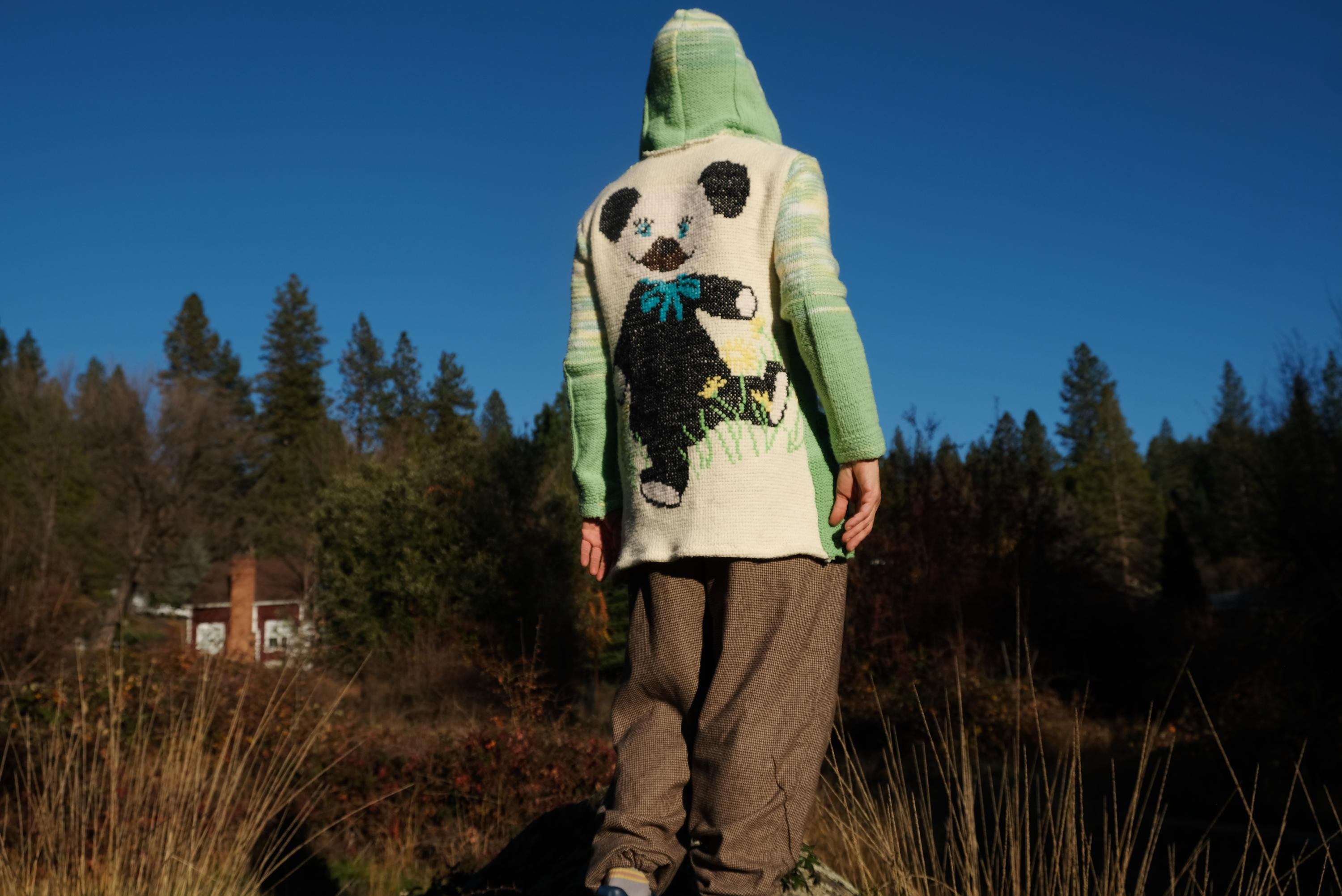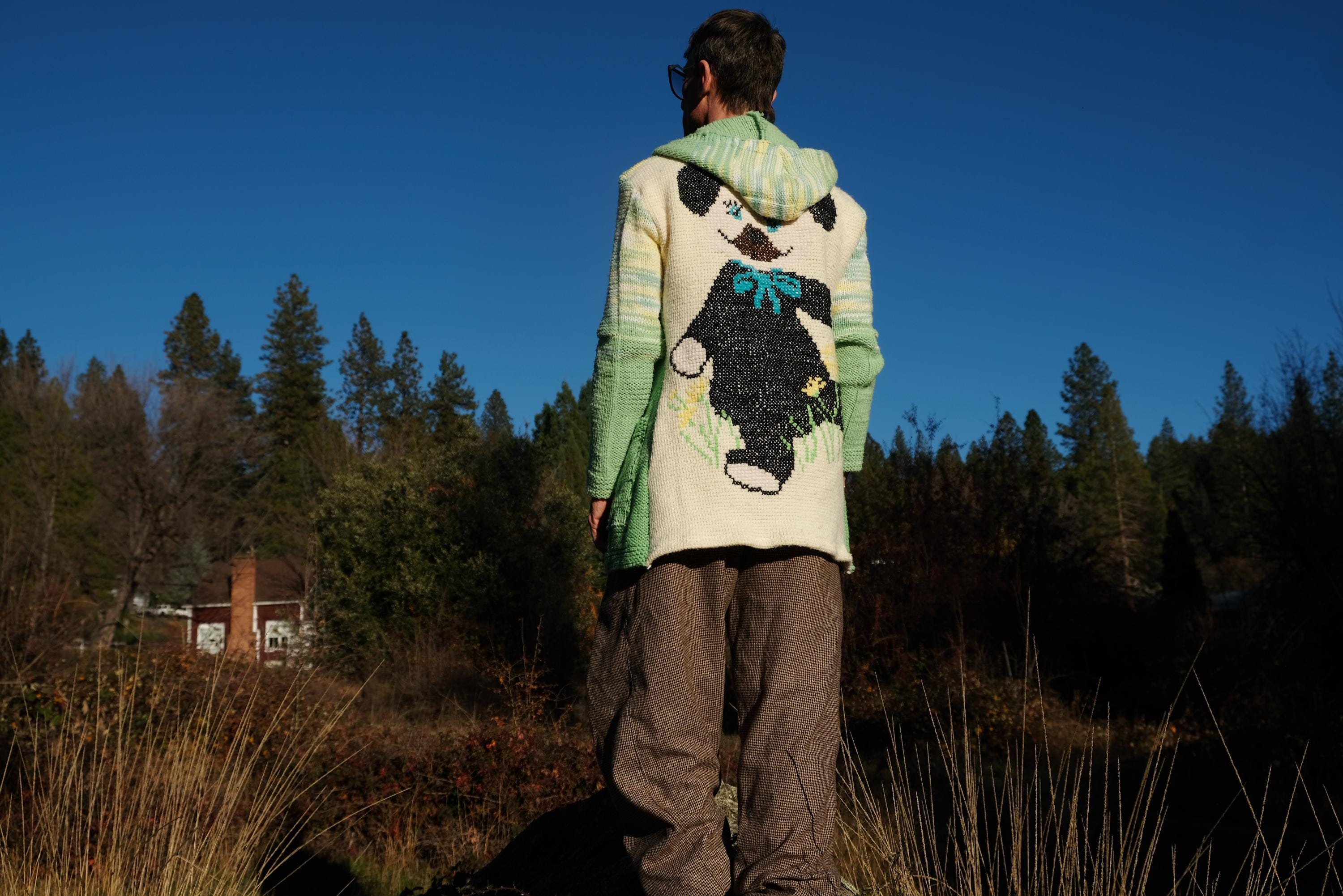 This is a knit robe with a crochet Teddy Bear motif on the back. Beautifully up-cycled from an afghan blanket in 100% acrylic yarn, and hand tailored by yours truly, Lord von Schmitt.