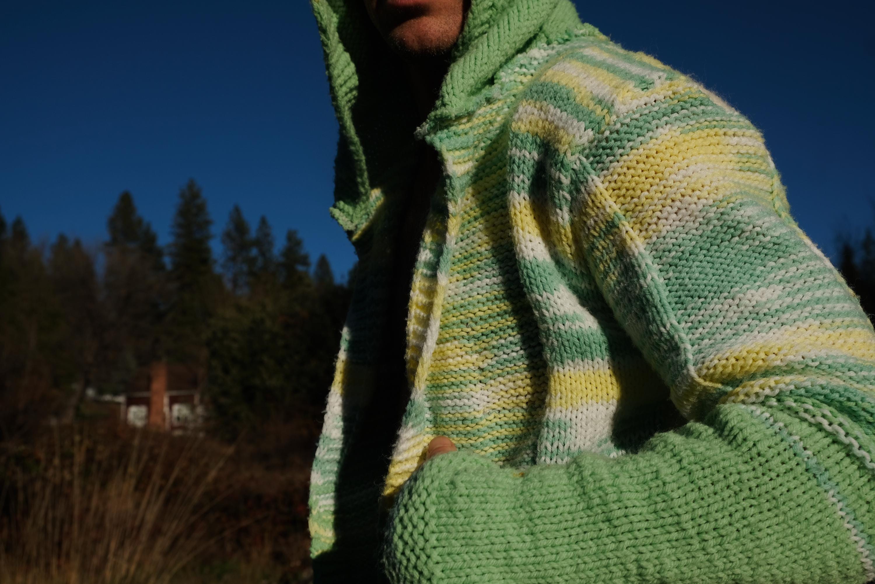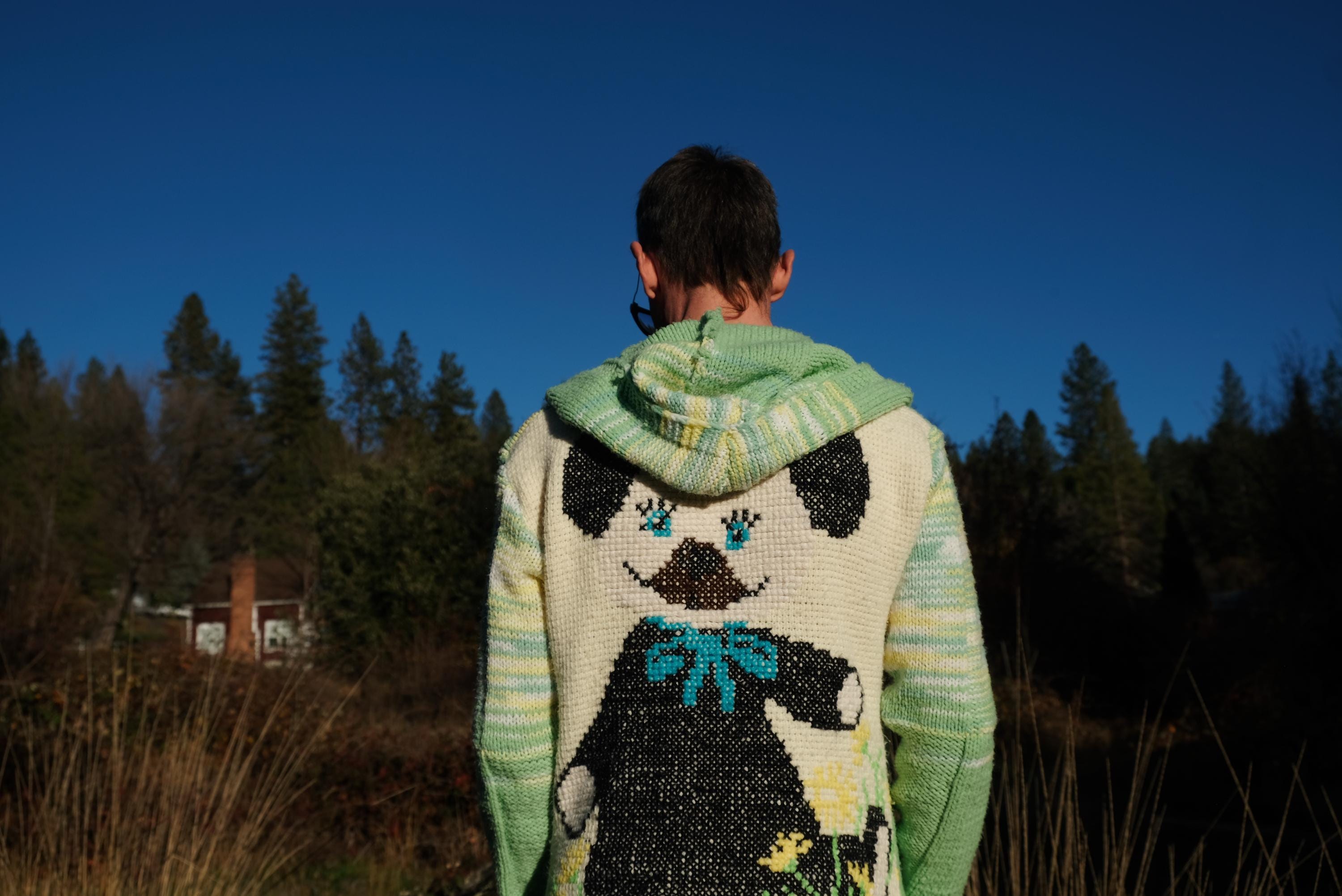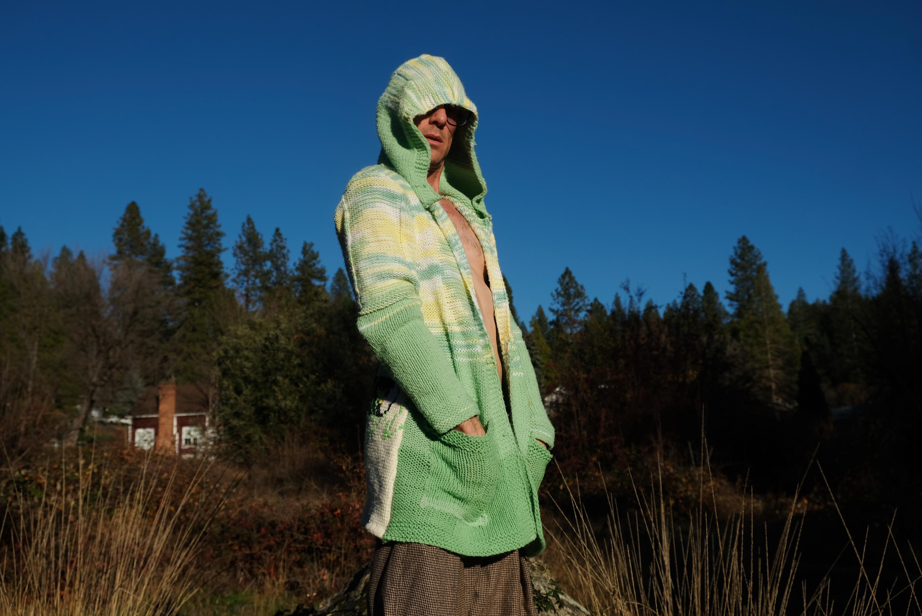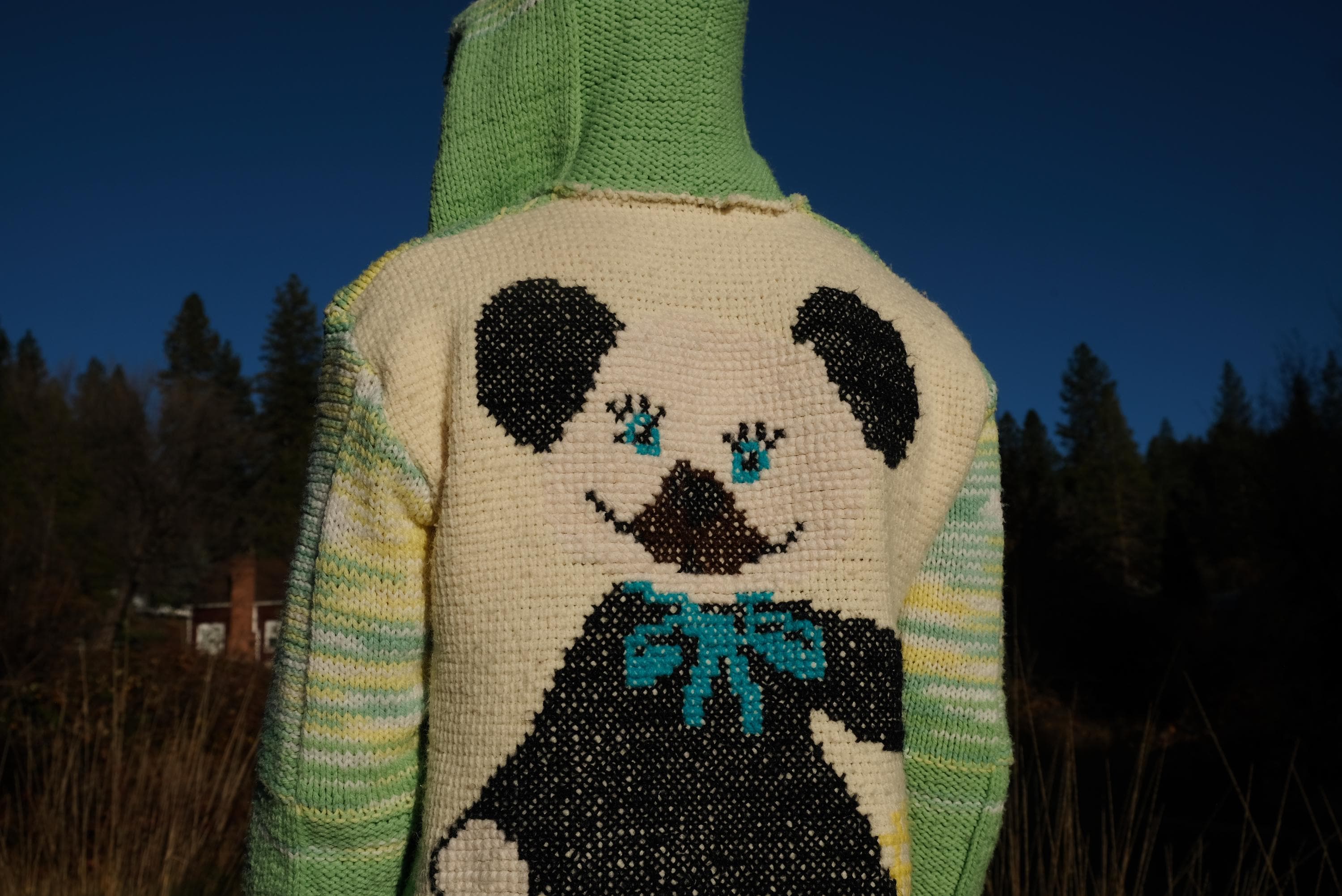 This is a knit robe with a crochet Teddy Bear motif on the back. Beautifully up-cycled from an afghan blanket in 100% acrylic yarn, and hand tailored by yours truly, Lord von Schmitt.