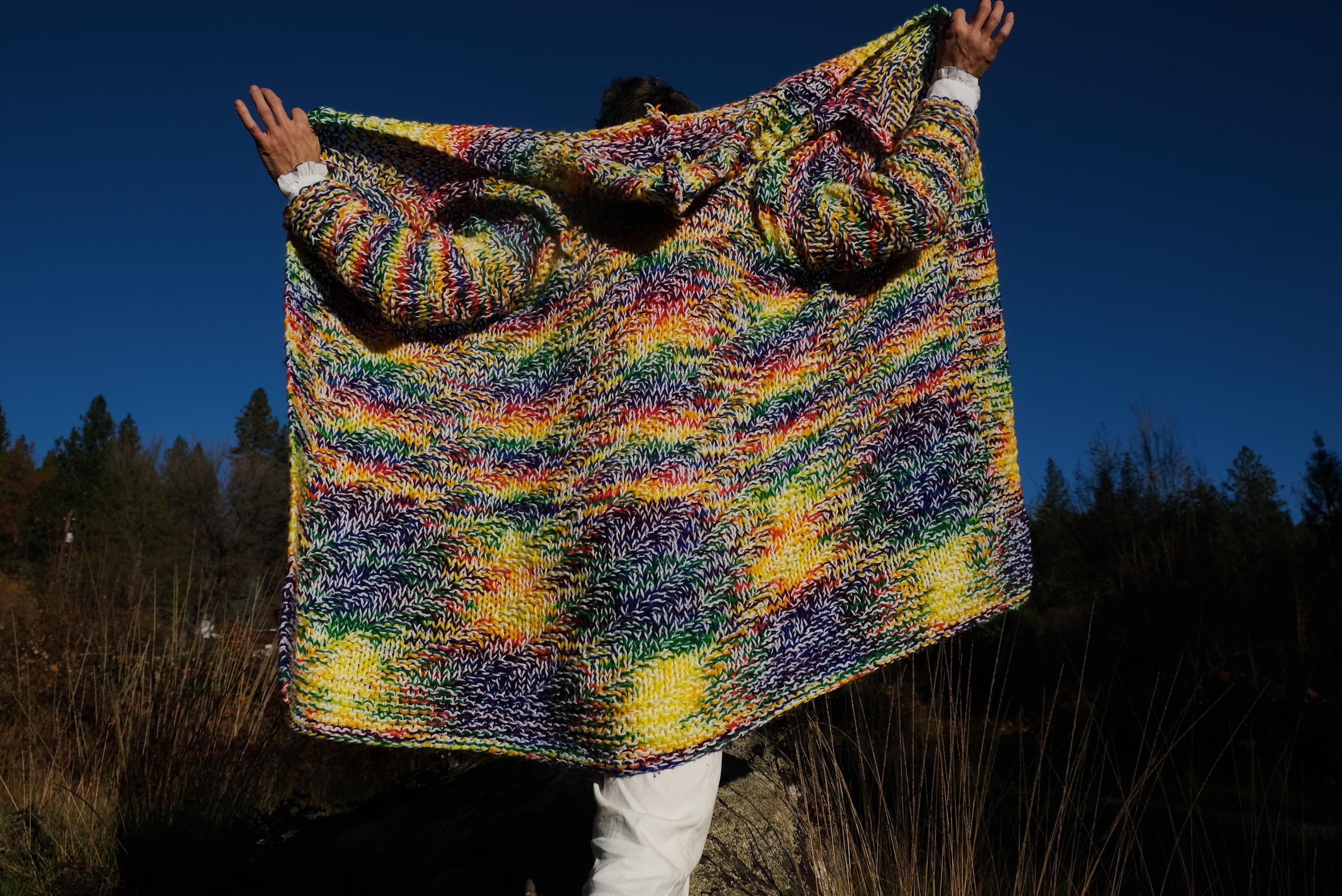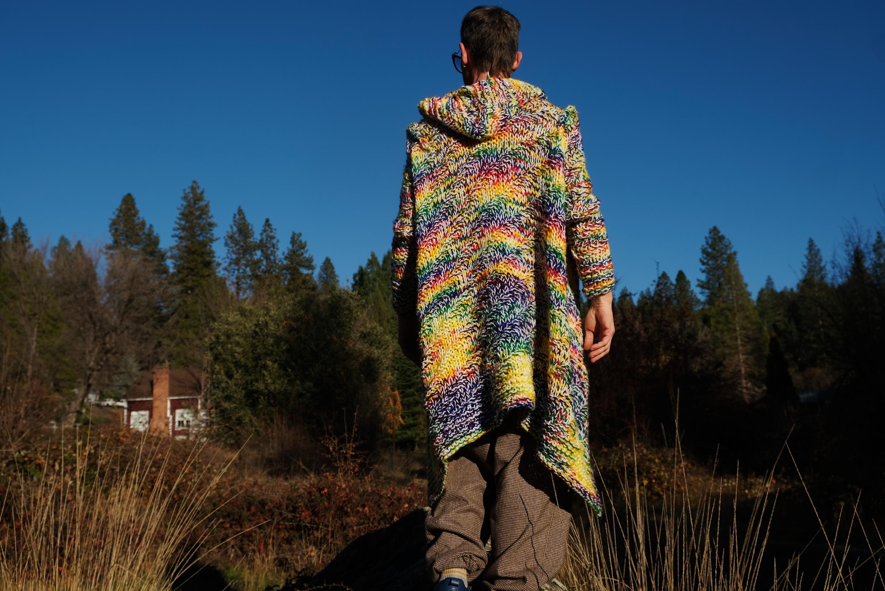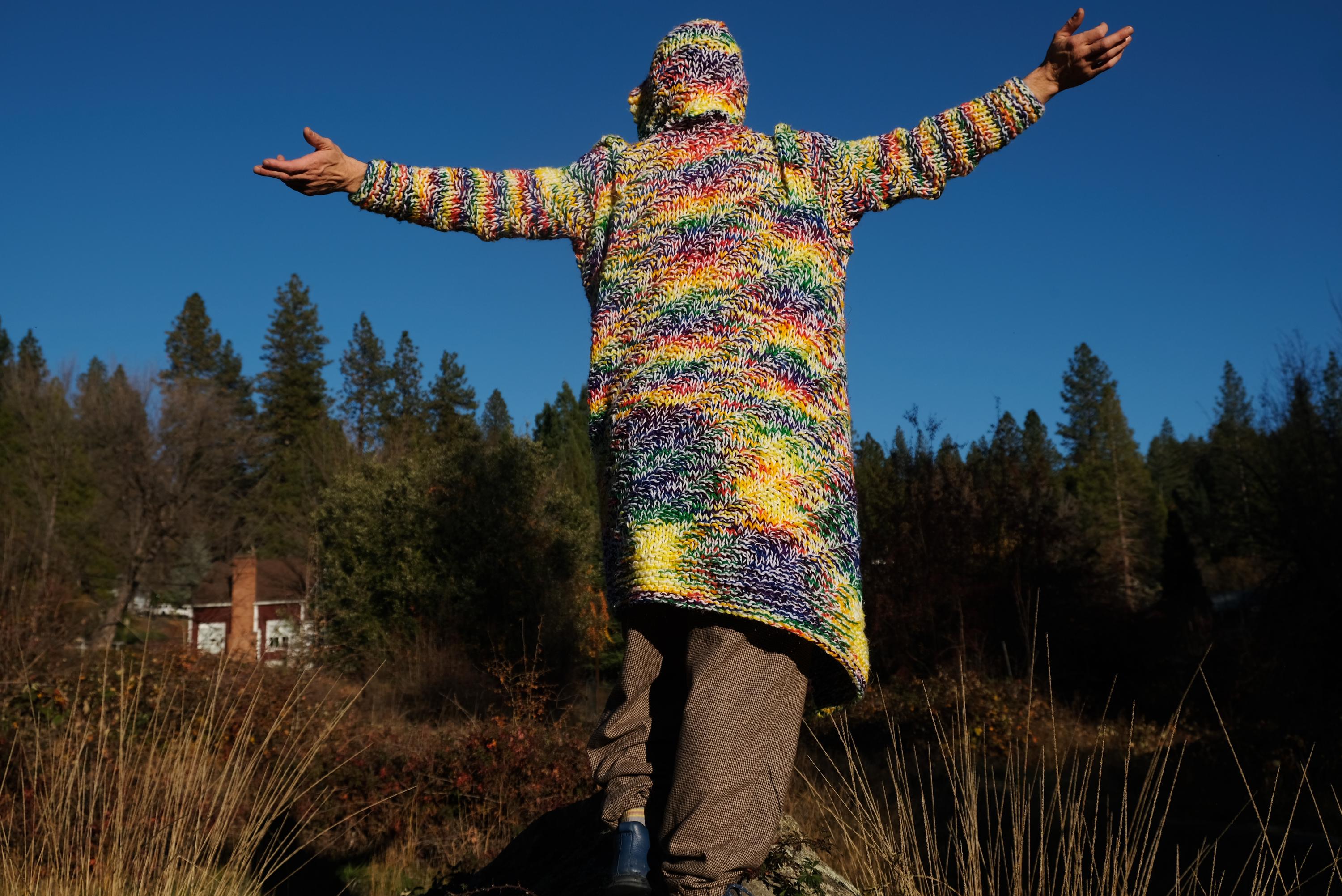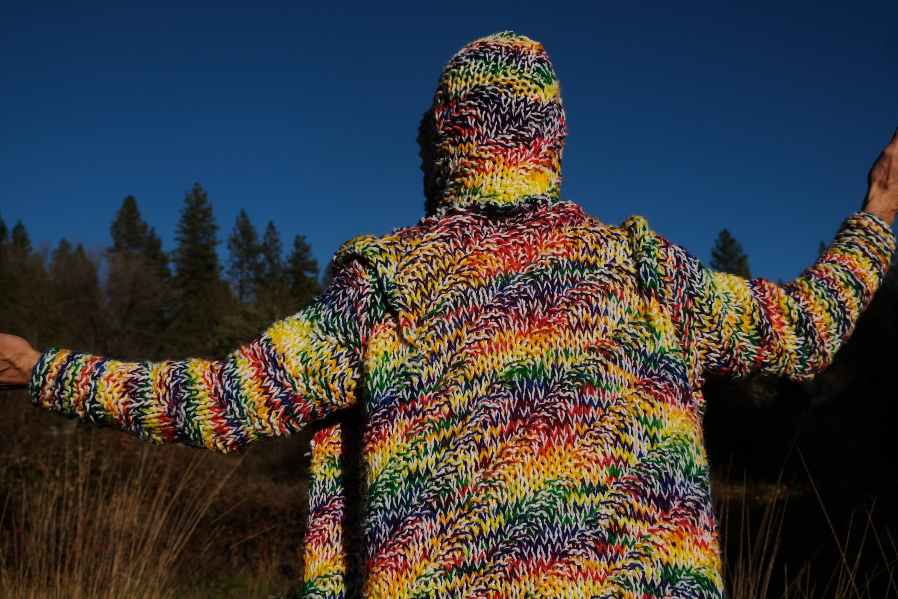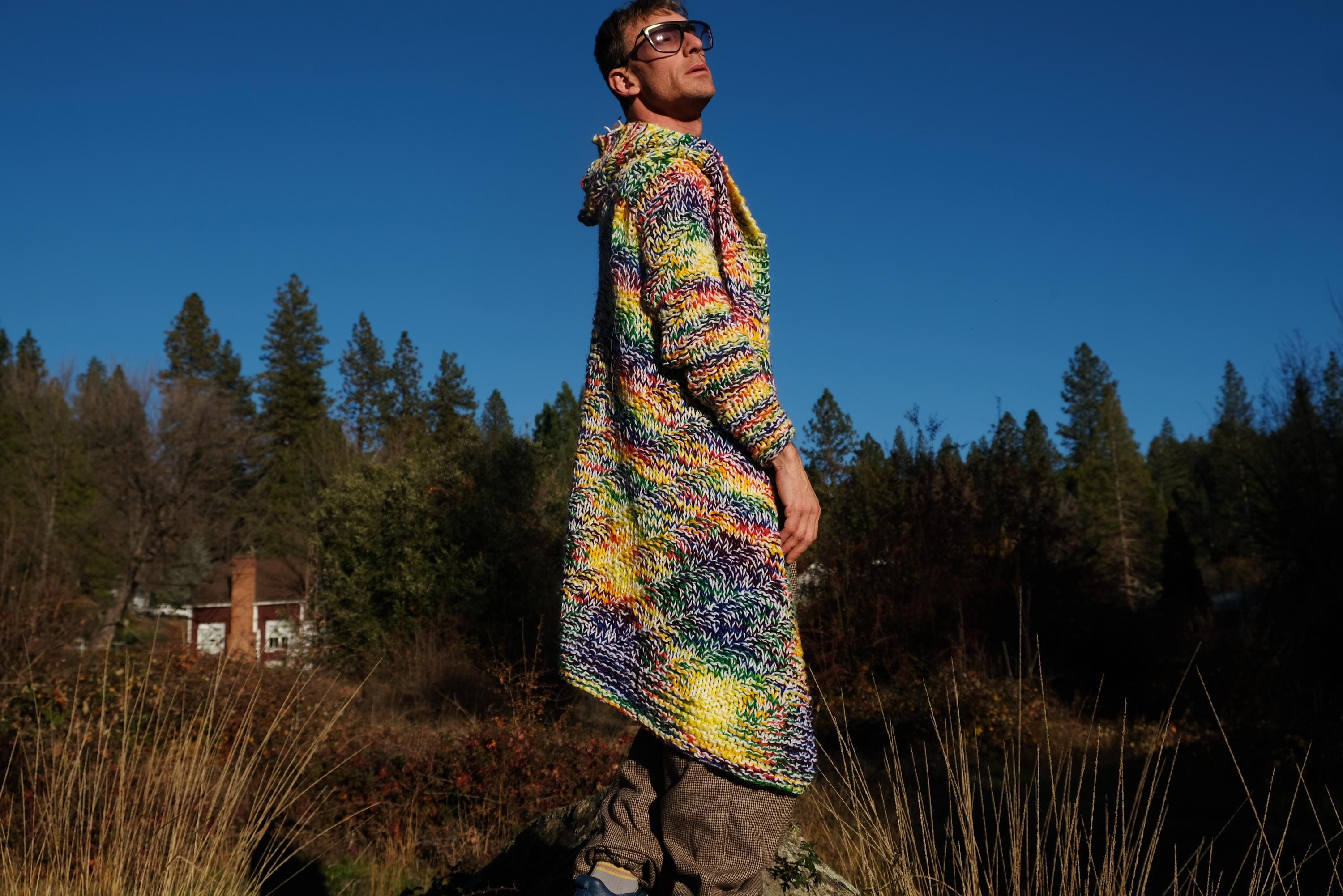 This is a chunky knit robe with a psychedelic wash of rainbow color. Beautifully up-cycled from an afghan blanket in 100% acrylic yarn, and hand tailored by yours truly, Lord von Schmitt.